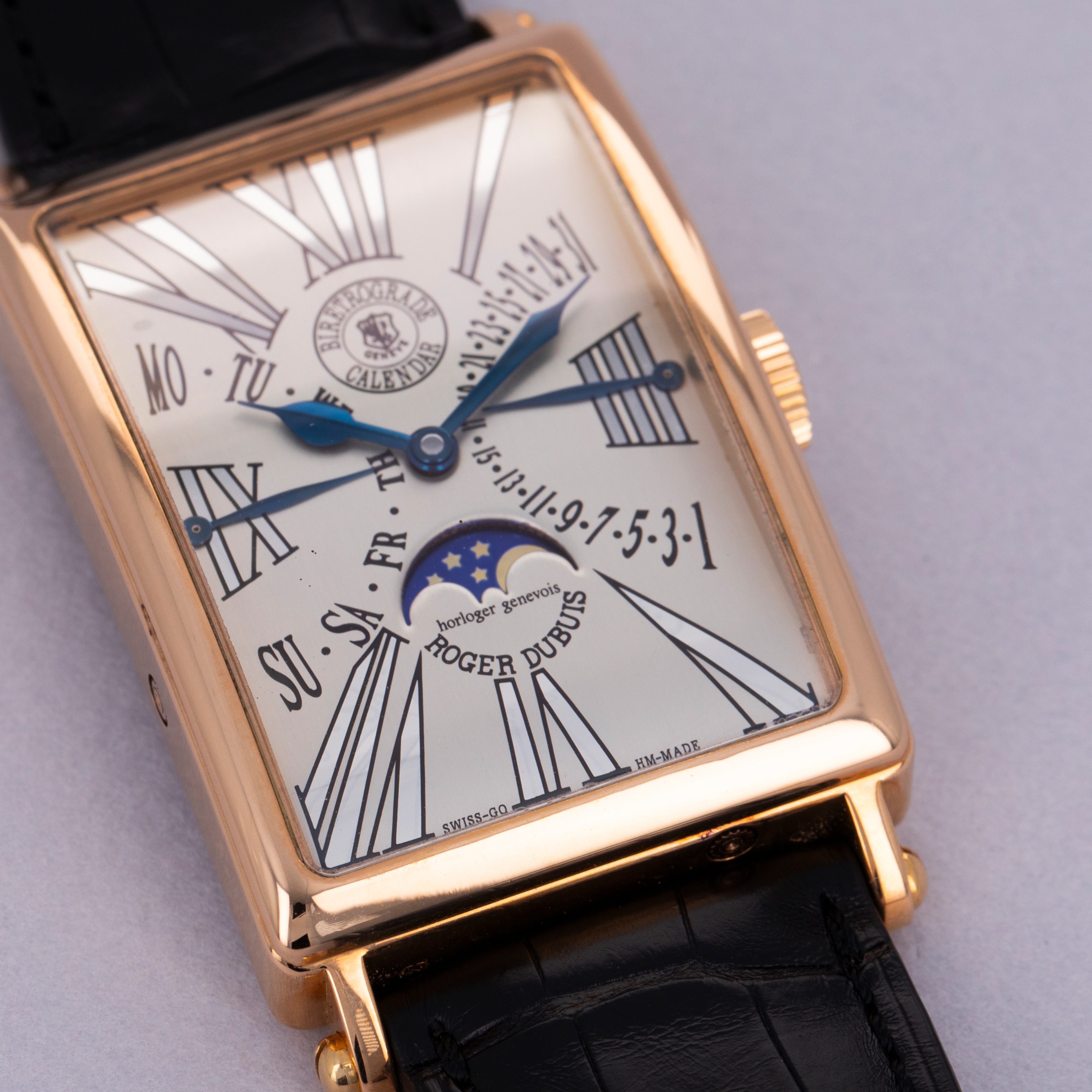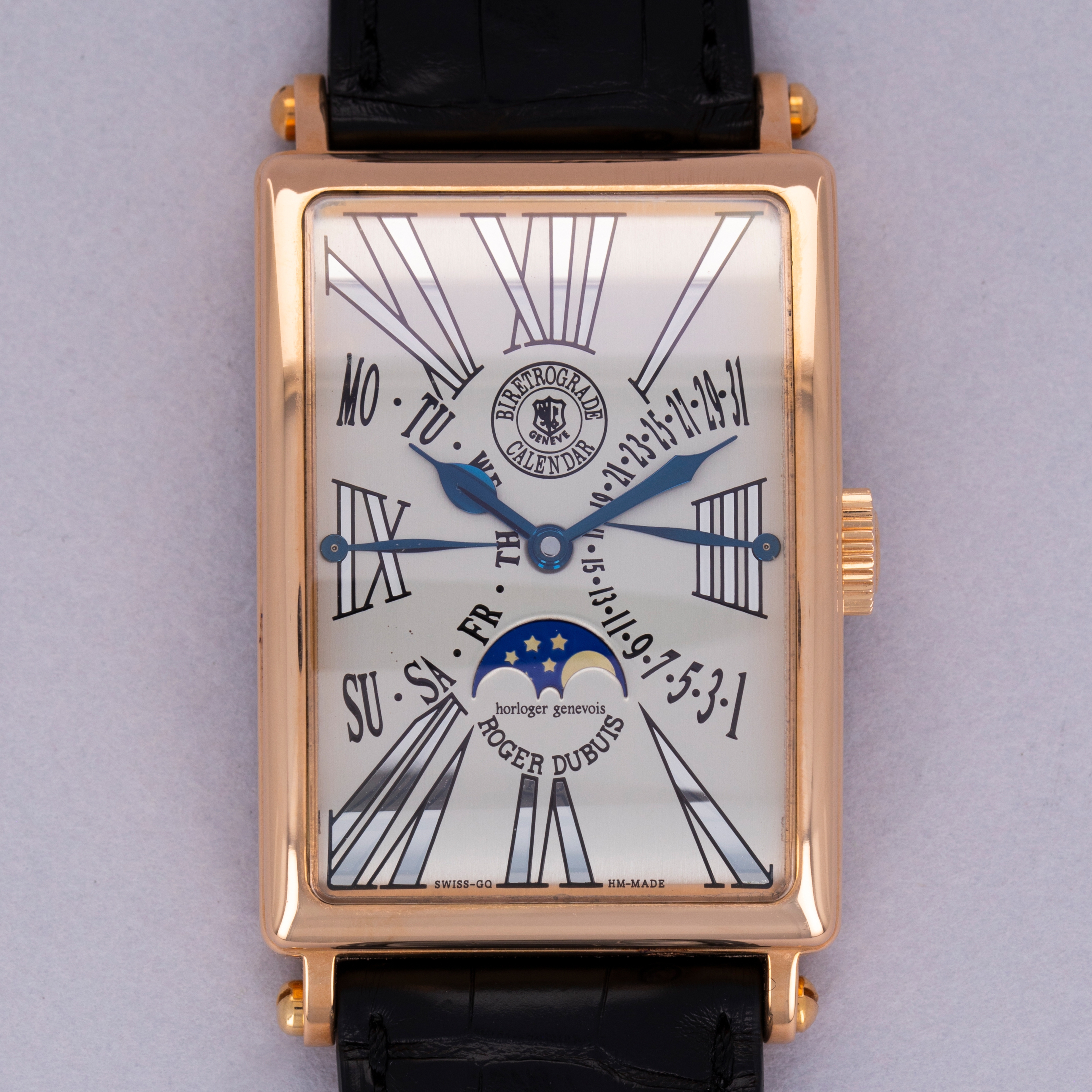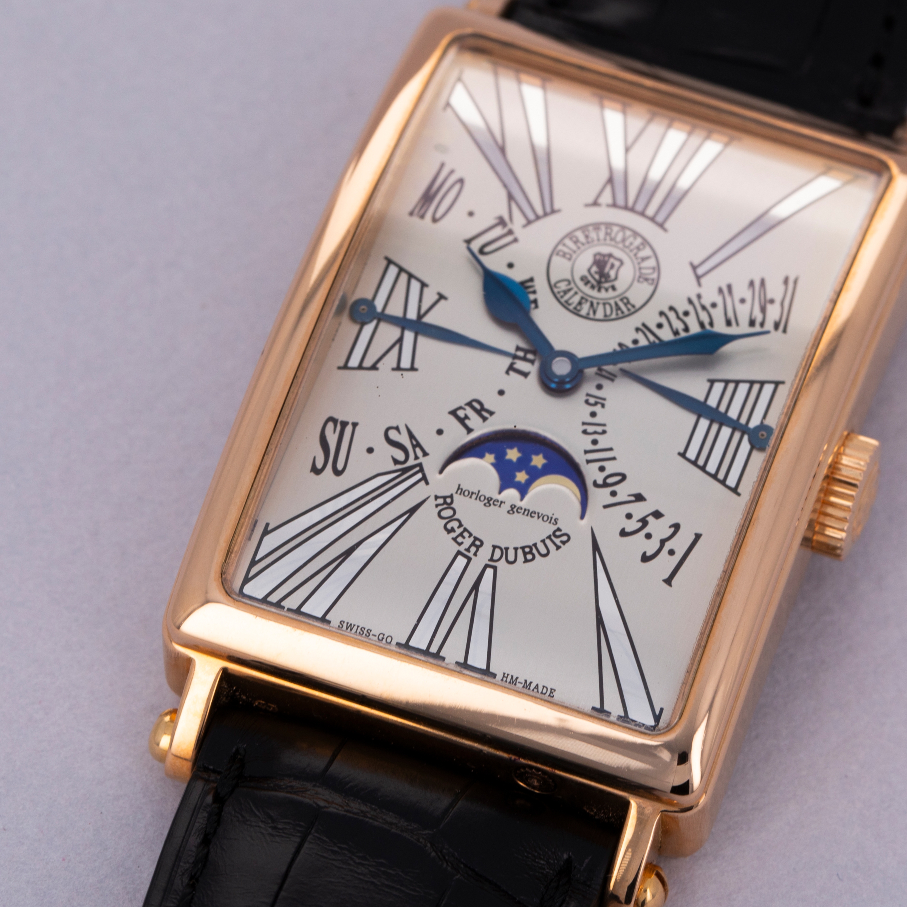 A legendary figure in the arena of independent watchmaking, Roger Dubuis learned his trade by working for several large Haute Horlogerie brands like Patek Philippe before embarking on his own endeavors. Founding his eponymous brand in 1995, Roger Dubuis’ timepieces have evolved into some of the best-regarded pieces of early high-end independent horology the market has to offer. Released in the early 2000s, the Roger Dubuis Much More Bi-Retrograde Calendar ref. M34 is a wonderful example of Dubuis’ distinctive take on horological design. Featuring a 34mm wide 18kt rose gold rectangular case with short lugs and a thin bezel with a very small step along its periphery, the ref. M34’s construction is classical yet somewhat whimsical, much like its dial design. Featuring two retrograde displays, one for the day and one for the date, and a centrally-located moonphase subdial at 6 o’clock along with an eclectic blend of exploding Roman numerals, this timepiece’s design is a melody that could only be achieved by someone with the watchmaking credentials of Roger Dubuis. Limited to 28 units and individually numbered, this is as rare a timepiece as it is stunning.
