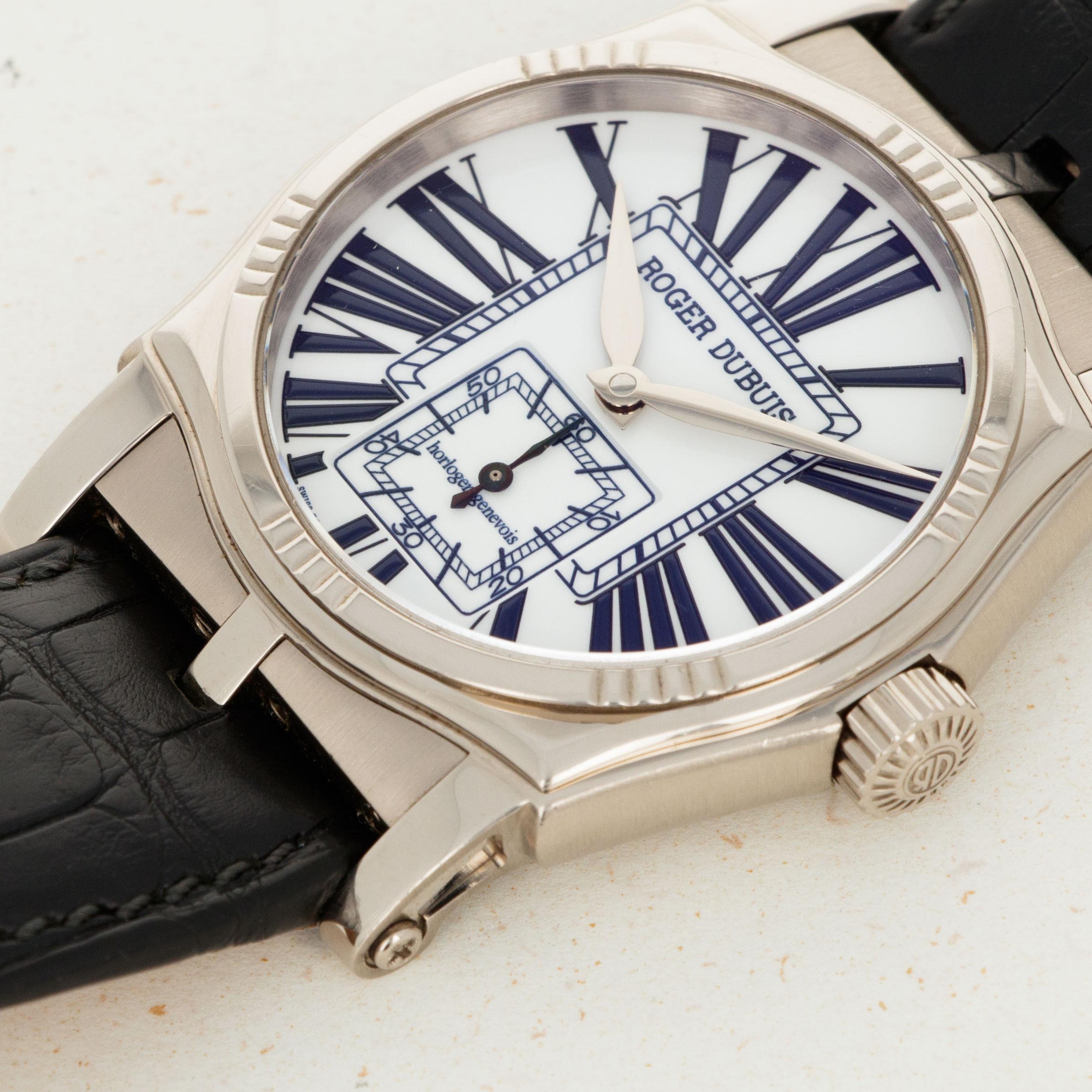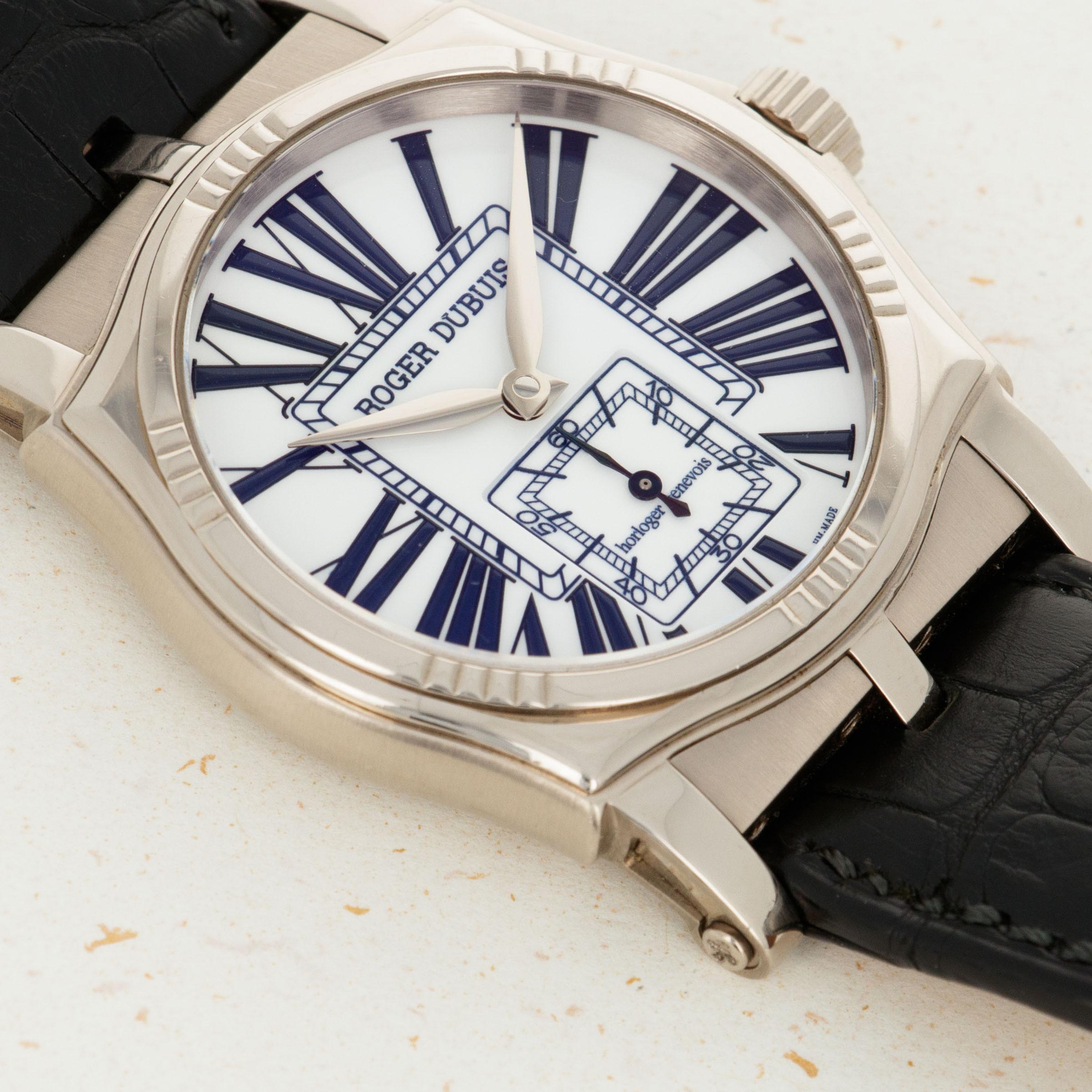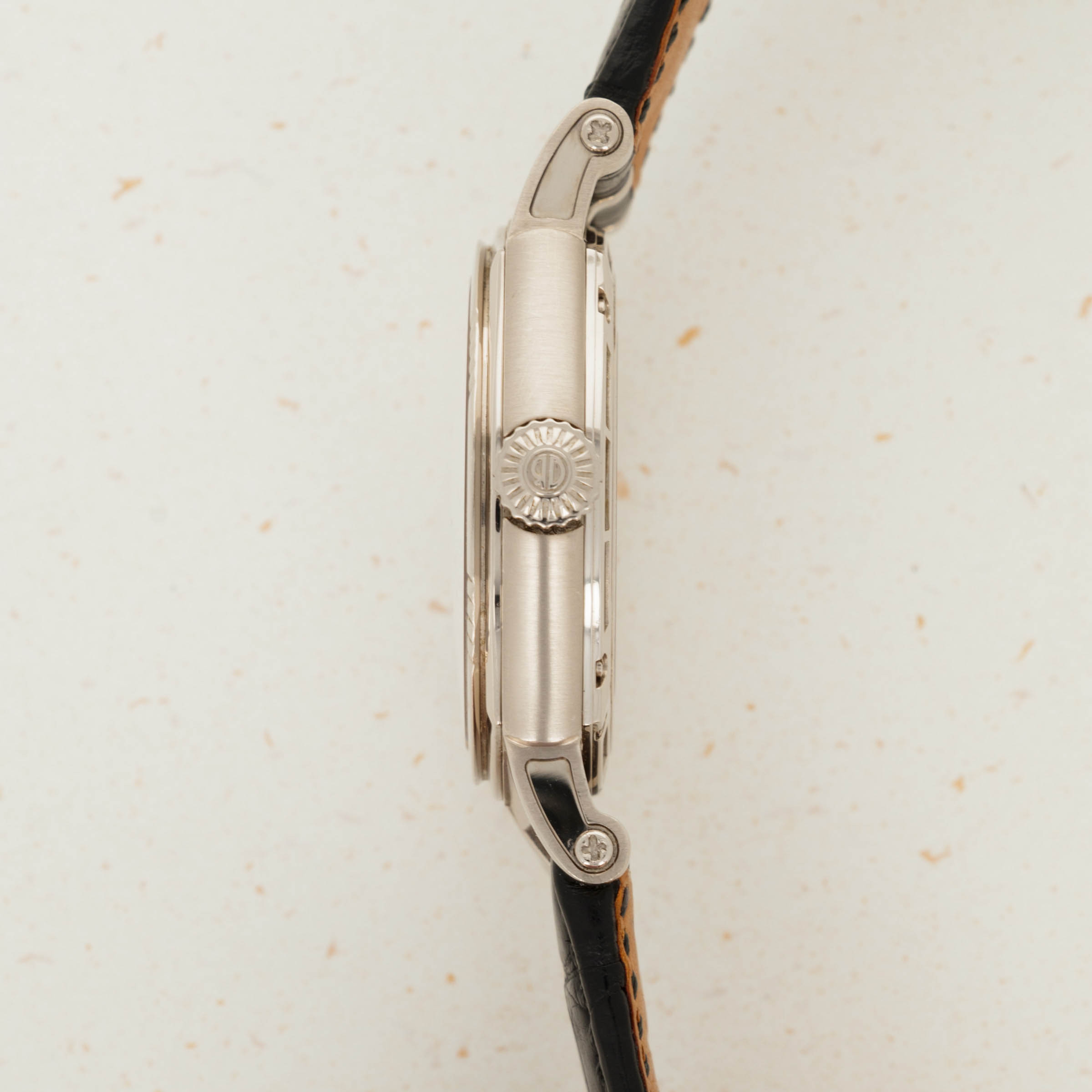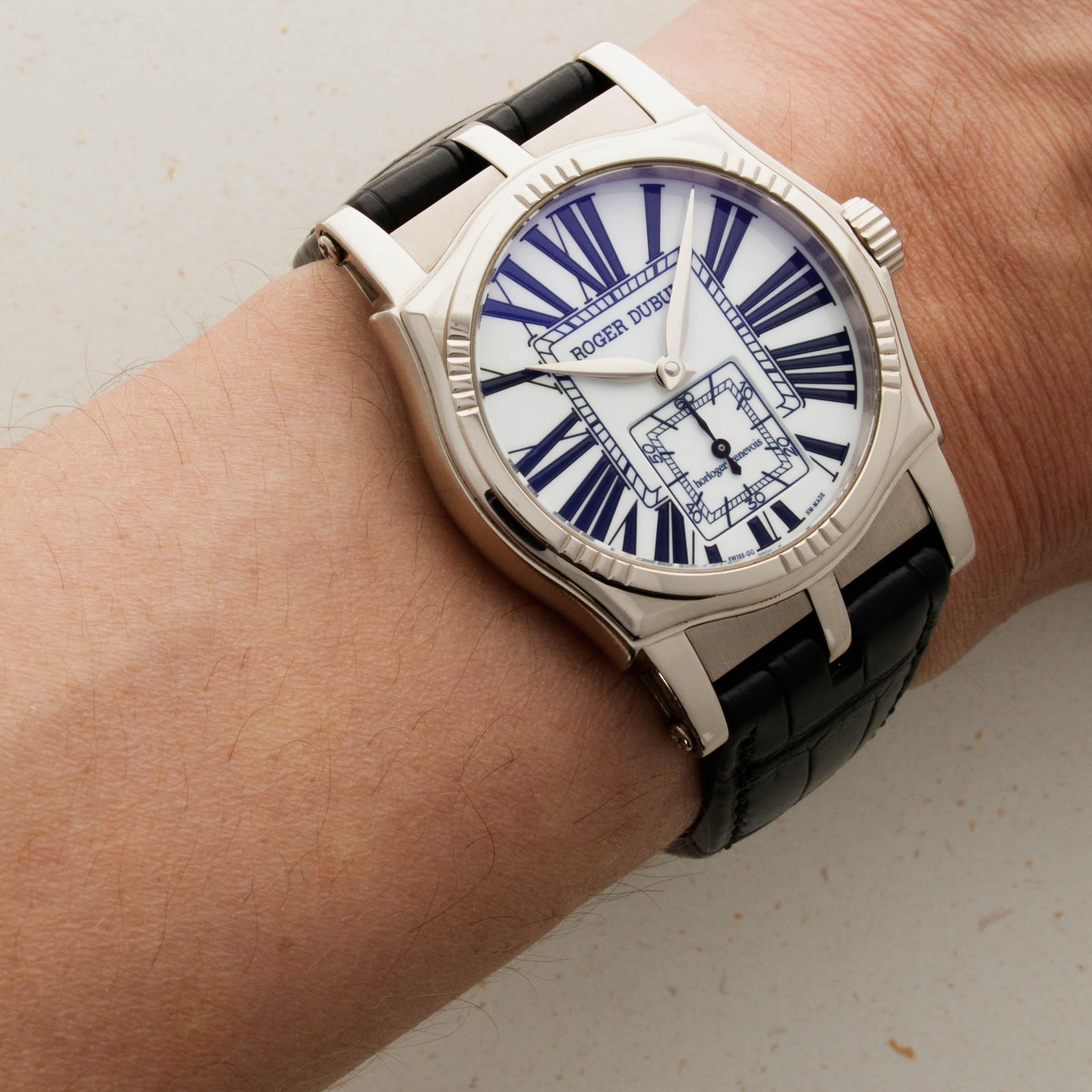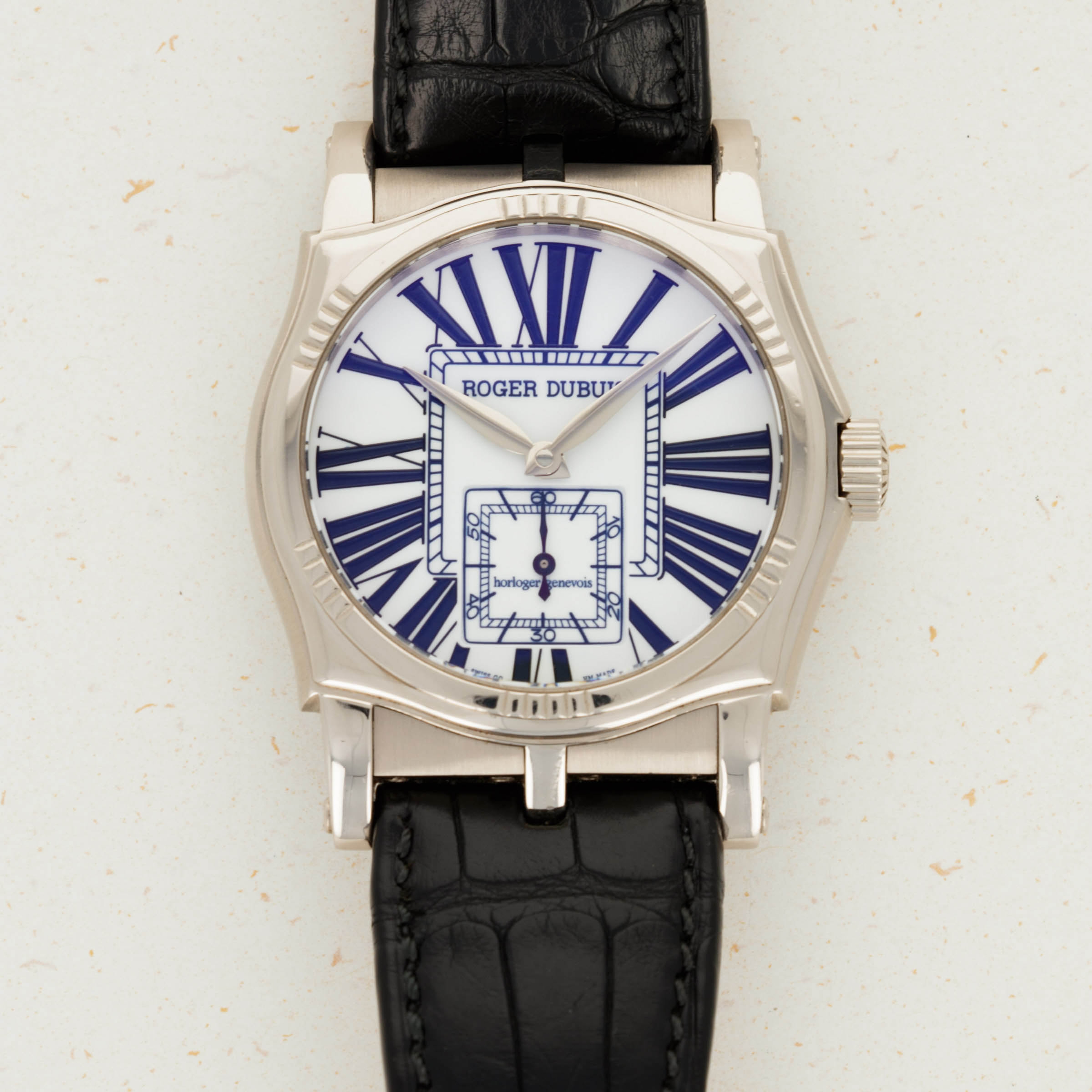 Founded in 1995, Roger Dubuis is a watchmaker that has long been renowned for its avant-garde design, fine finishing and individualistic aesthetics. The independent brand has since broken away from its more traditional roots and embraced the hyper-technical designs we see them employ today. The entire Sympathie collection, however, is a beacon of the brand’s bold stylings that successfully emblazoned them across the horological community’s psyche in the late 90s as a watchmaker with a unique sense of style and artistry. Constructed of 18k white gold, the Sympathie ref. SY40's 40mm case is a feast for the eyes. Featuring a vertical satin grain on the mid-case with a contrasting high polish on its partially-fluted bezel, lug hoods and the stepped graduation that its bezel sits upon, the Sympathie is a finely executed timepiece with appreciable attention to detail. Aside from its case, the Sympathie’s dial also stands out as a unique piece of design. Featuring large explosive Roman numeral hour markers atop its white dial with a recessed sub-seconds dial at 6 o'clock, the Sympathie's dial communicates a sense of excessive complexity, much like its 18k gold case which is, in a way, an accurate depiction of Roger Dubuis' design philosophy.