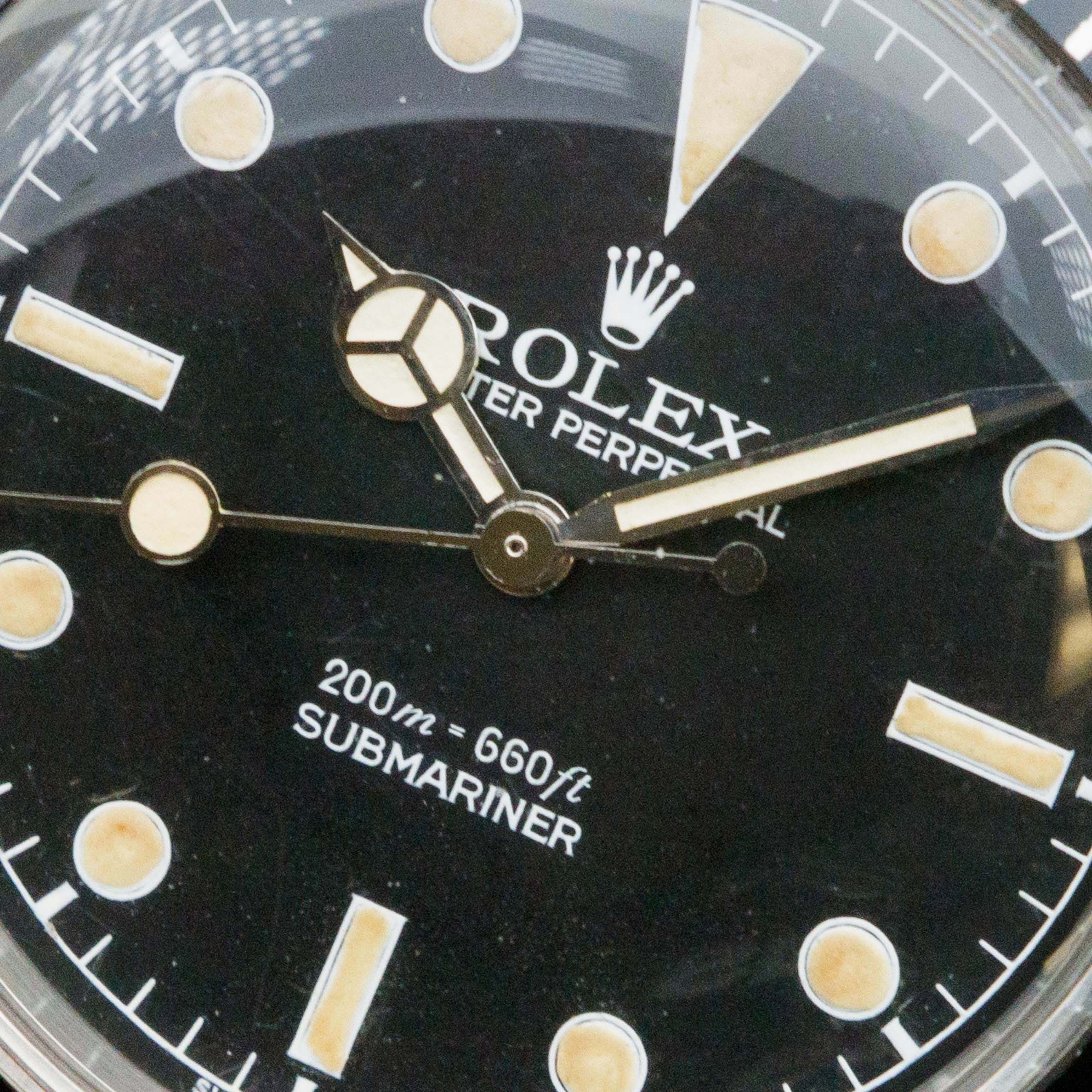 Watch is in excellent condition overall. Dial, hands and bezel are original Rolex service parts with tritium luminous. Dial and hands are mint, with creamy luminous that mathes the pearl in the bezel insert. Case is thick and mint, having previously been detailed. Bracelet has light scratches throughout, consistent with average wear. It is a model 7206 with 82 endpieces, clasp date 68.