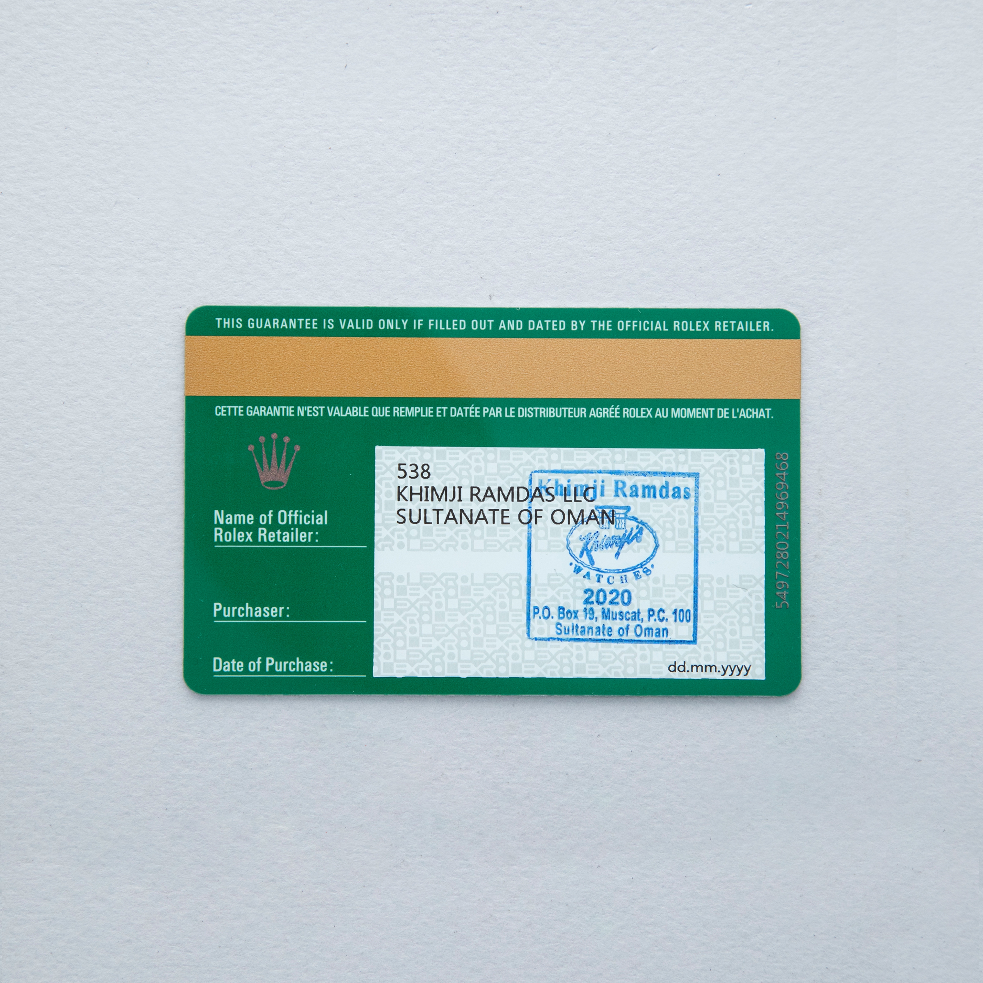 The watch is in new condition and retains all factory stickers. The bracelet is fitted with 12 links, 6 of which are removable, and fits an approximately 7 1/4” wrist. Engraving on the caseback shows a Khanjar with a royal coronet above.