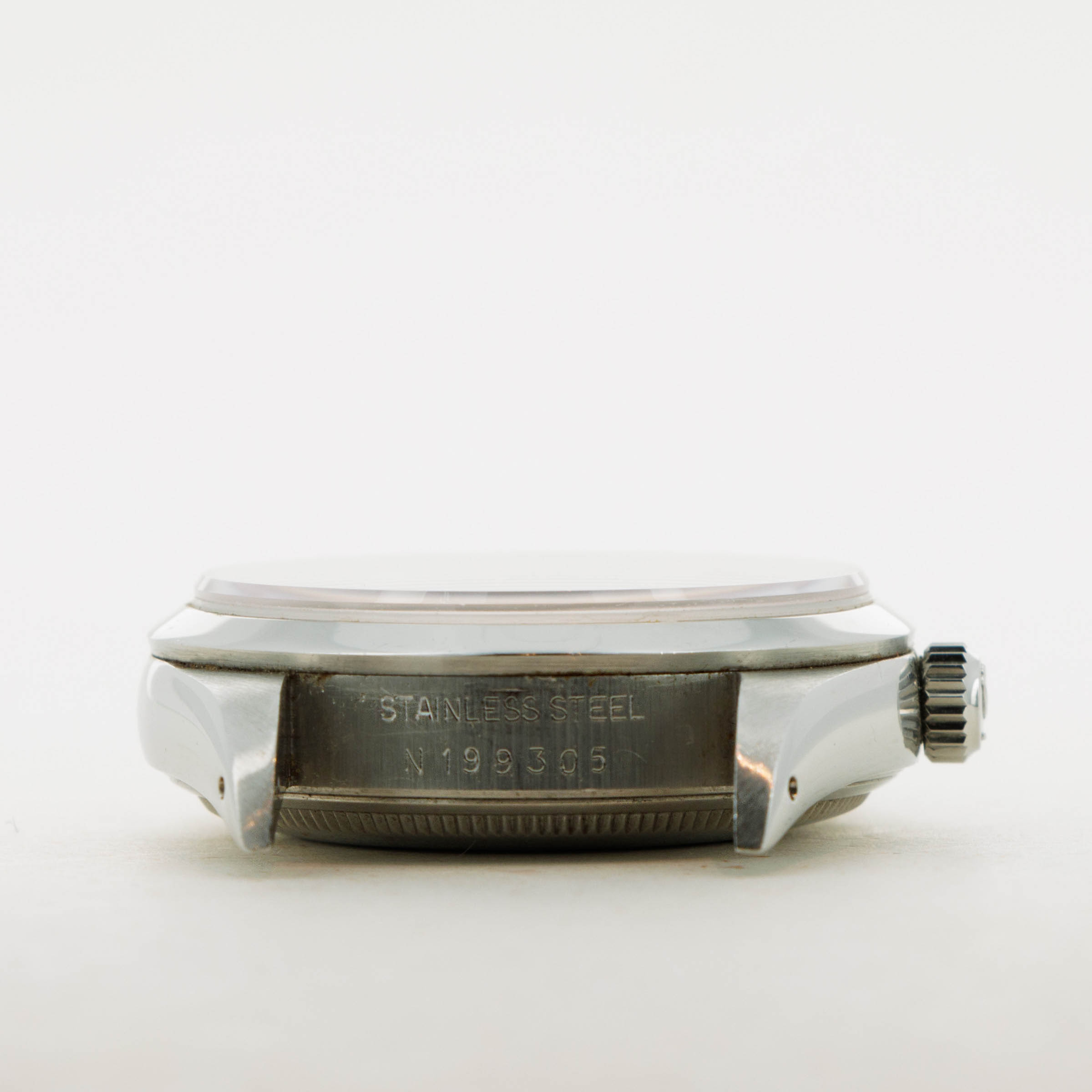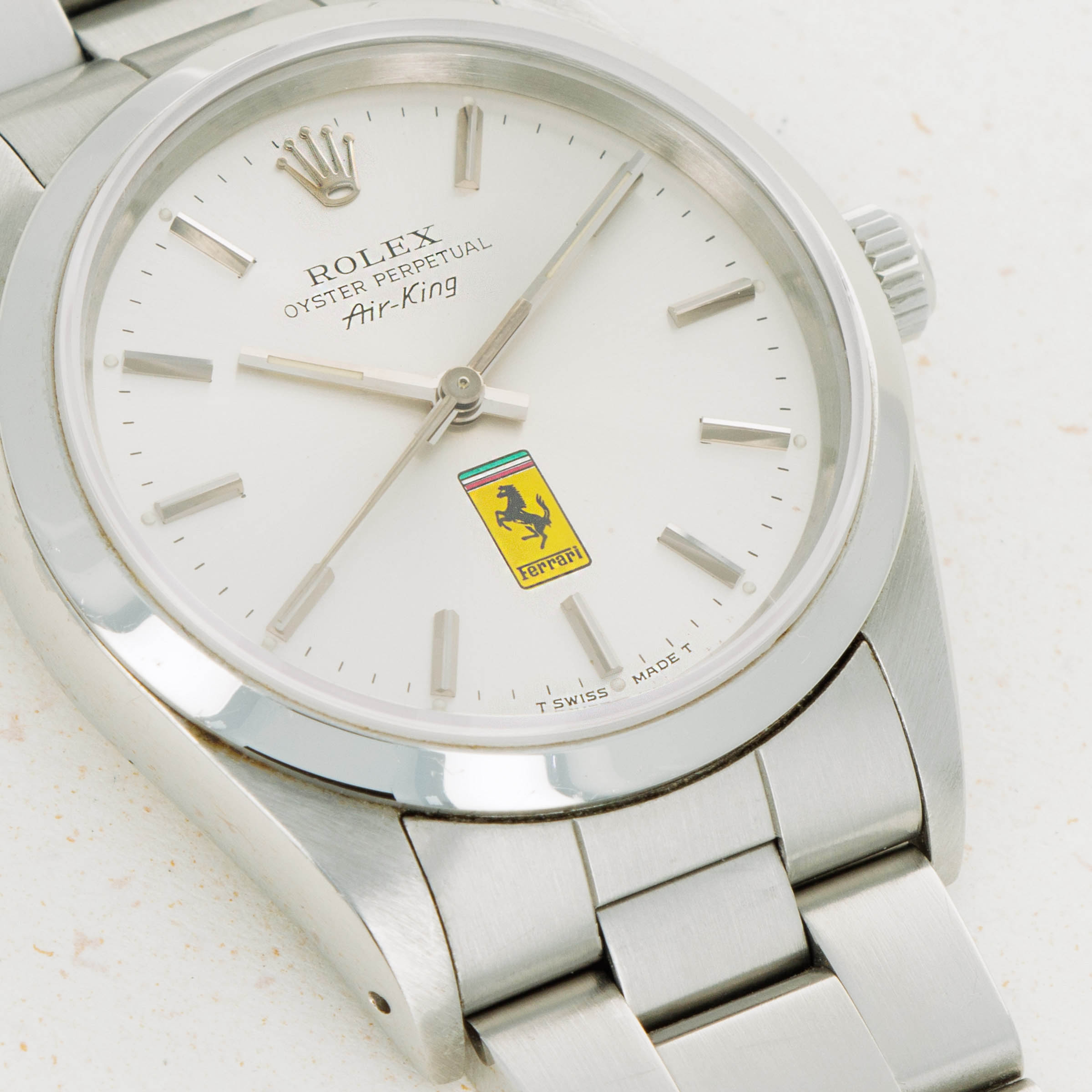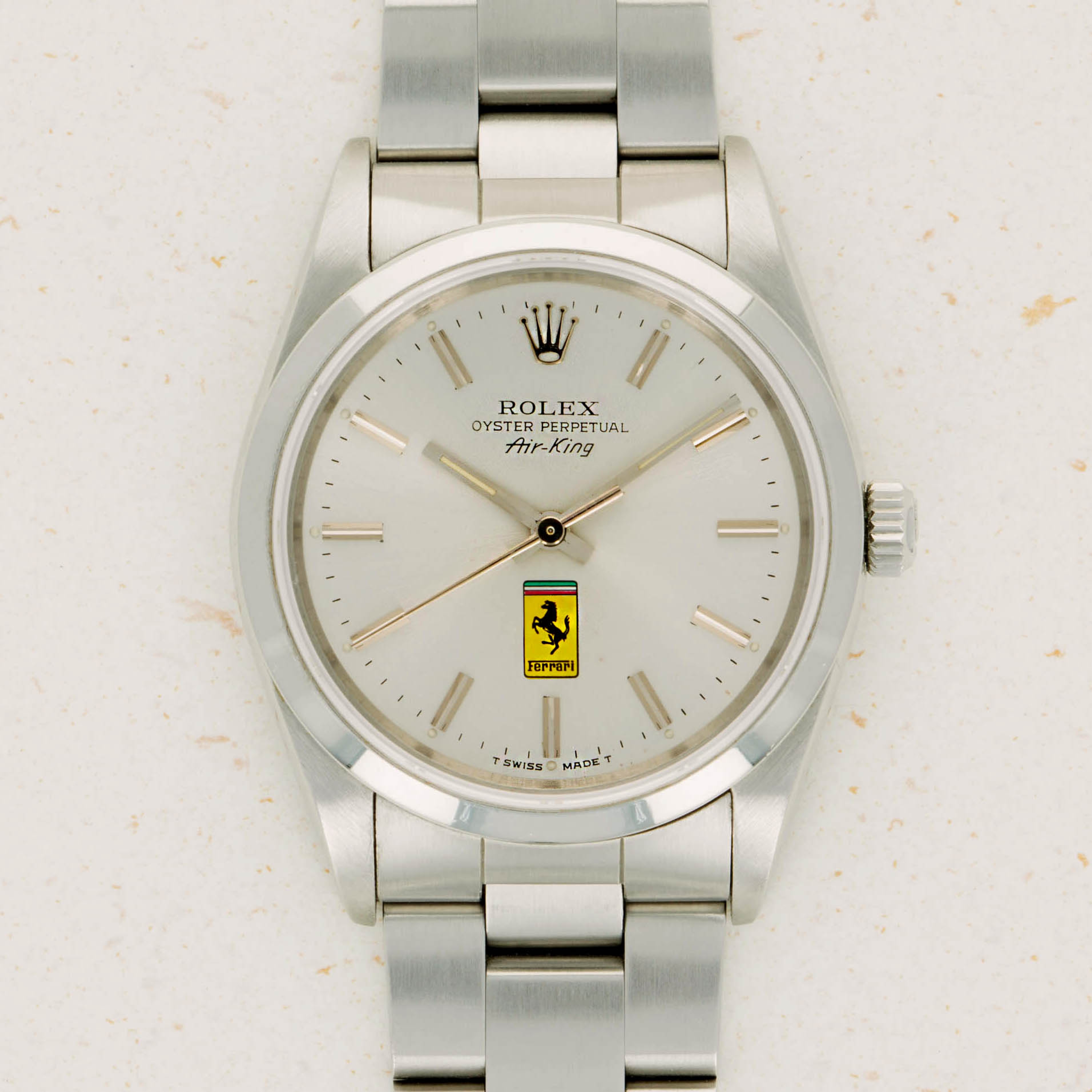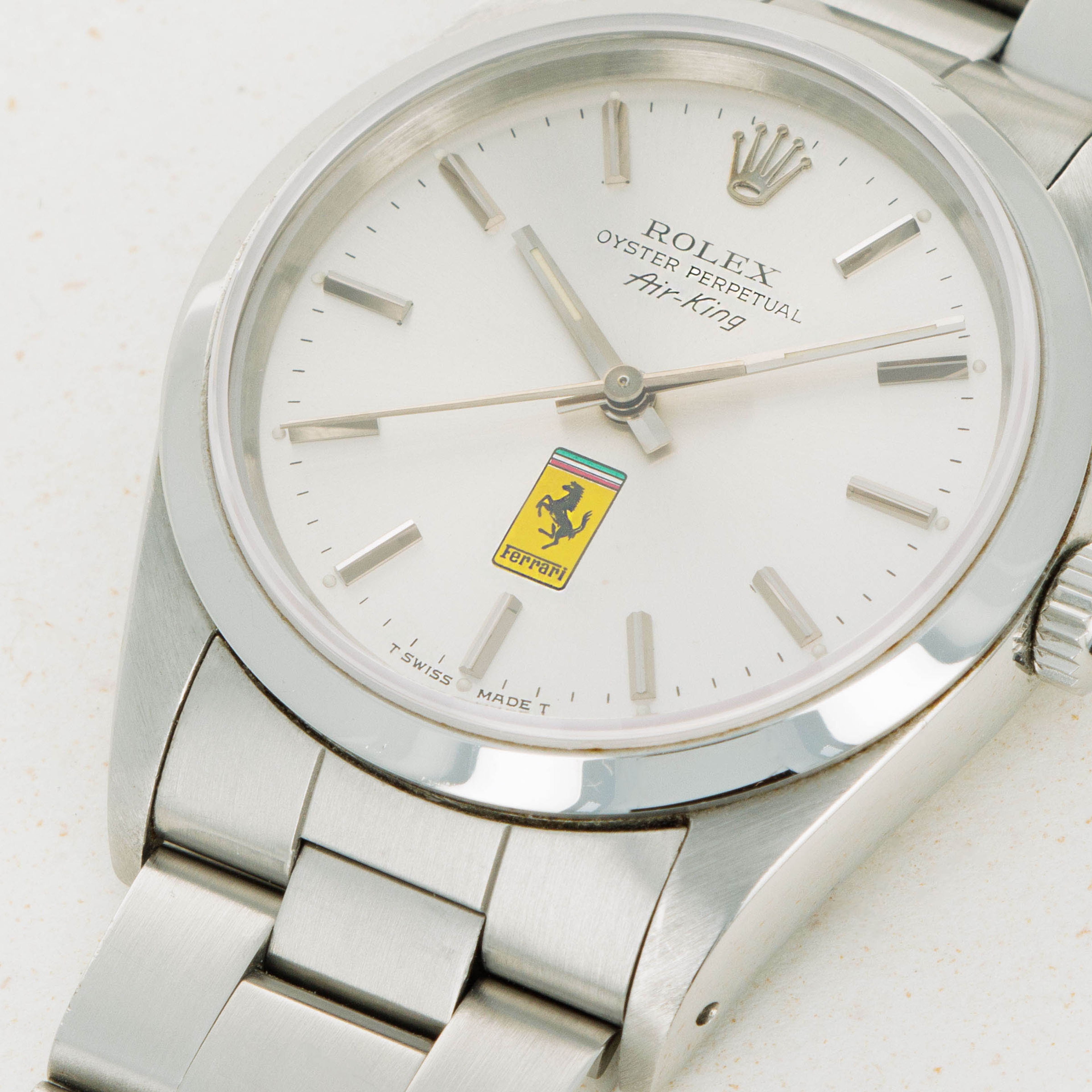 Fitted with the original silver dial that gives this Air-King an understated monochromatic aesthetic, this example's previous owner customized it with Ferrari's famously colourful logo at 6 o'clock, which, adds a bright punch of colour.