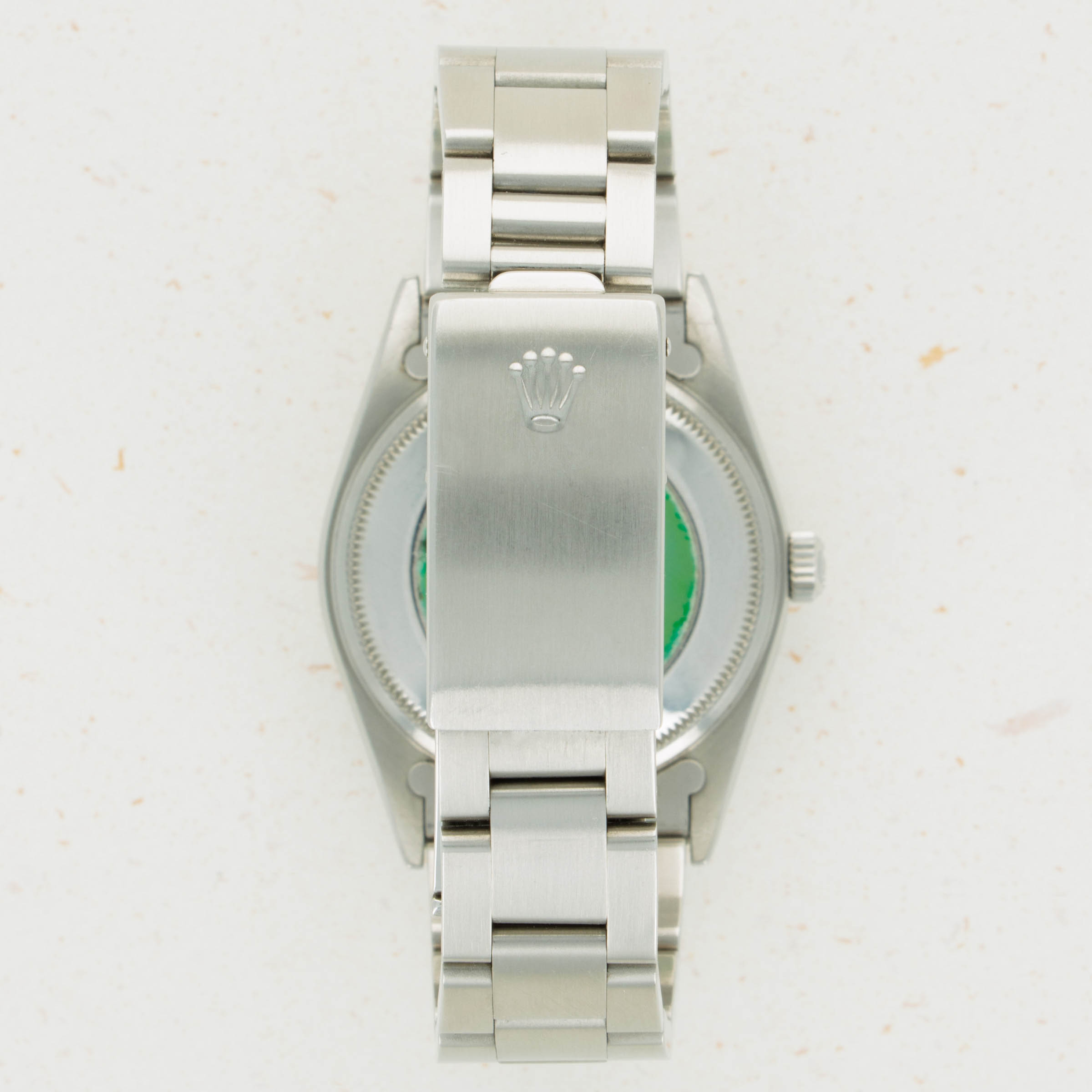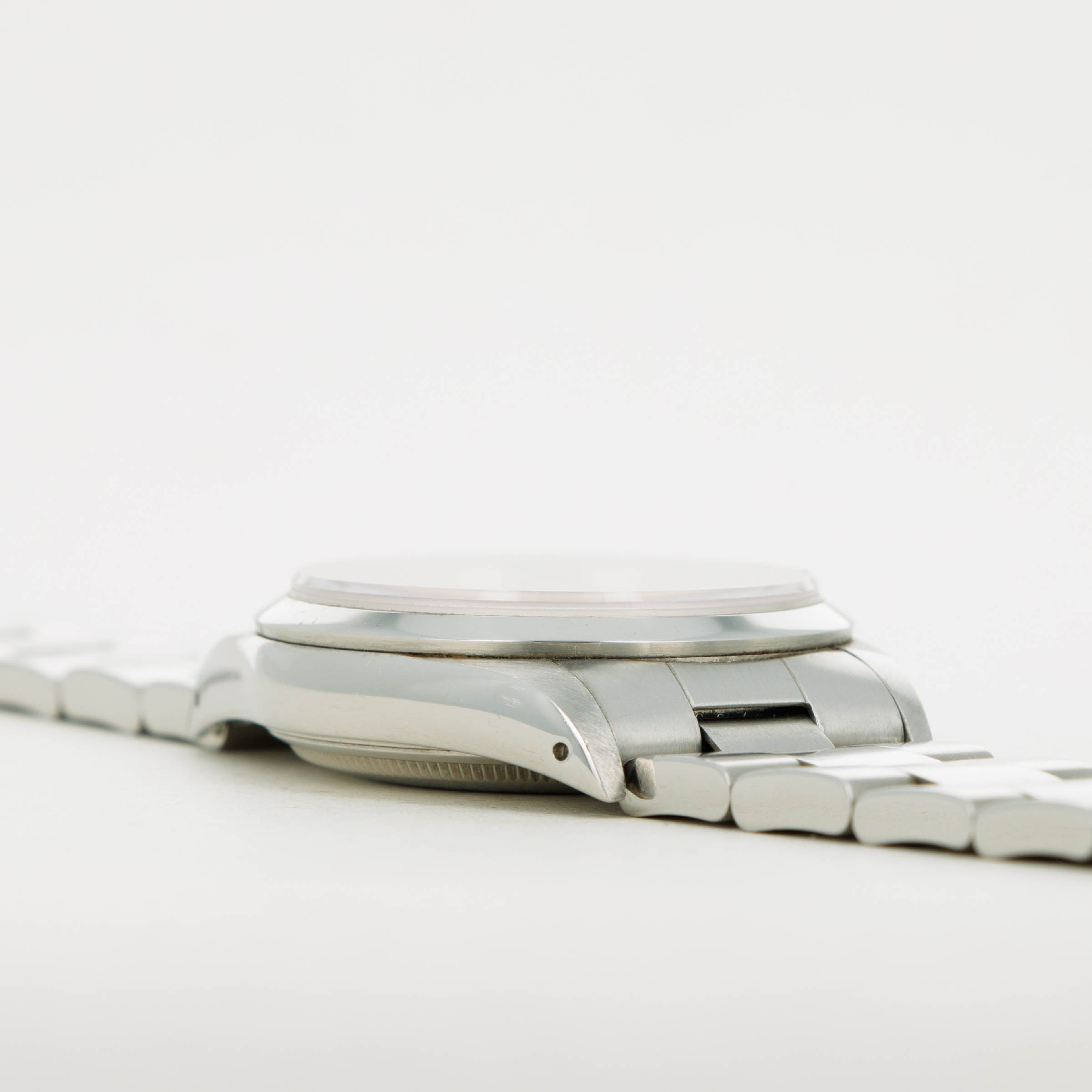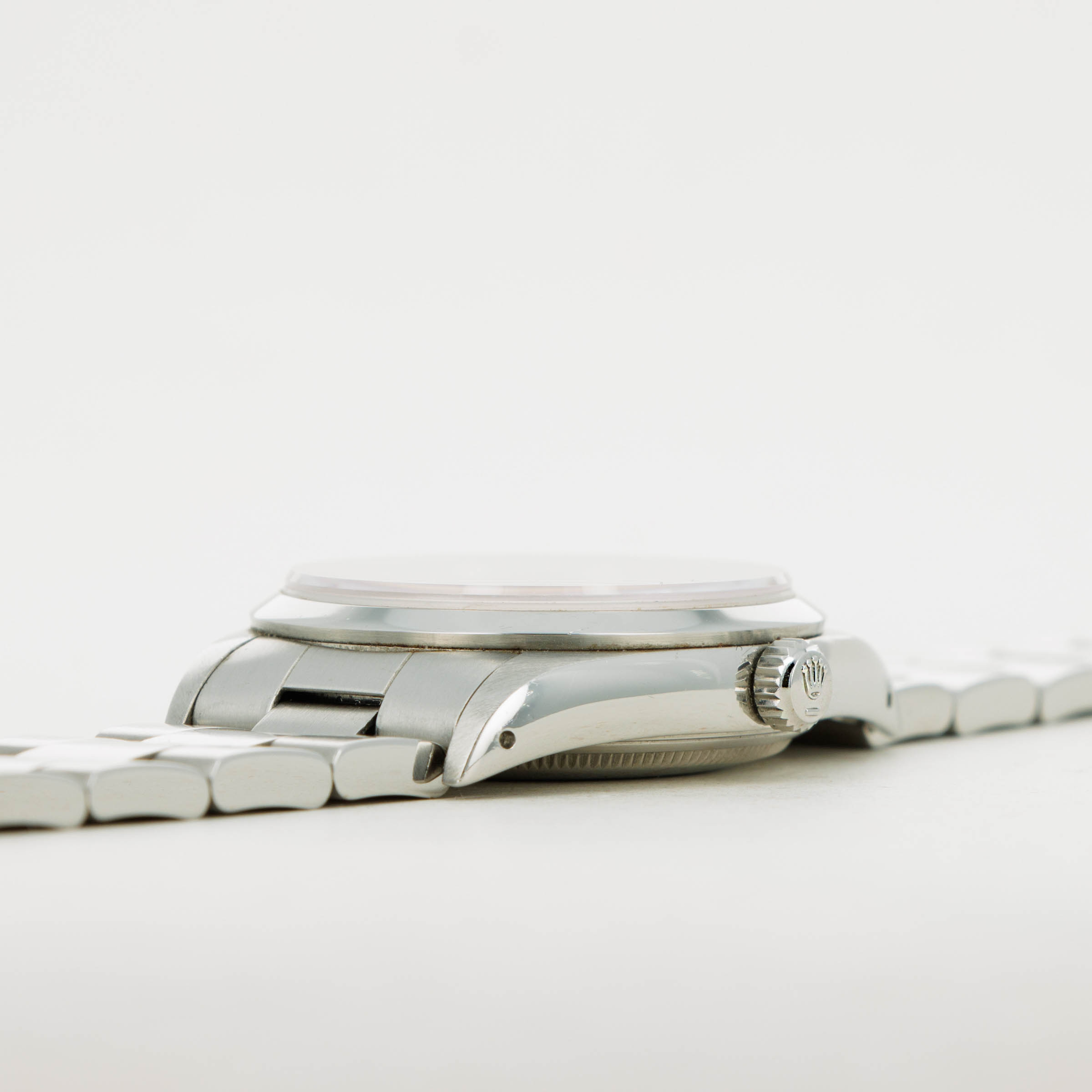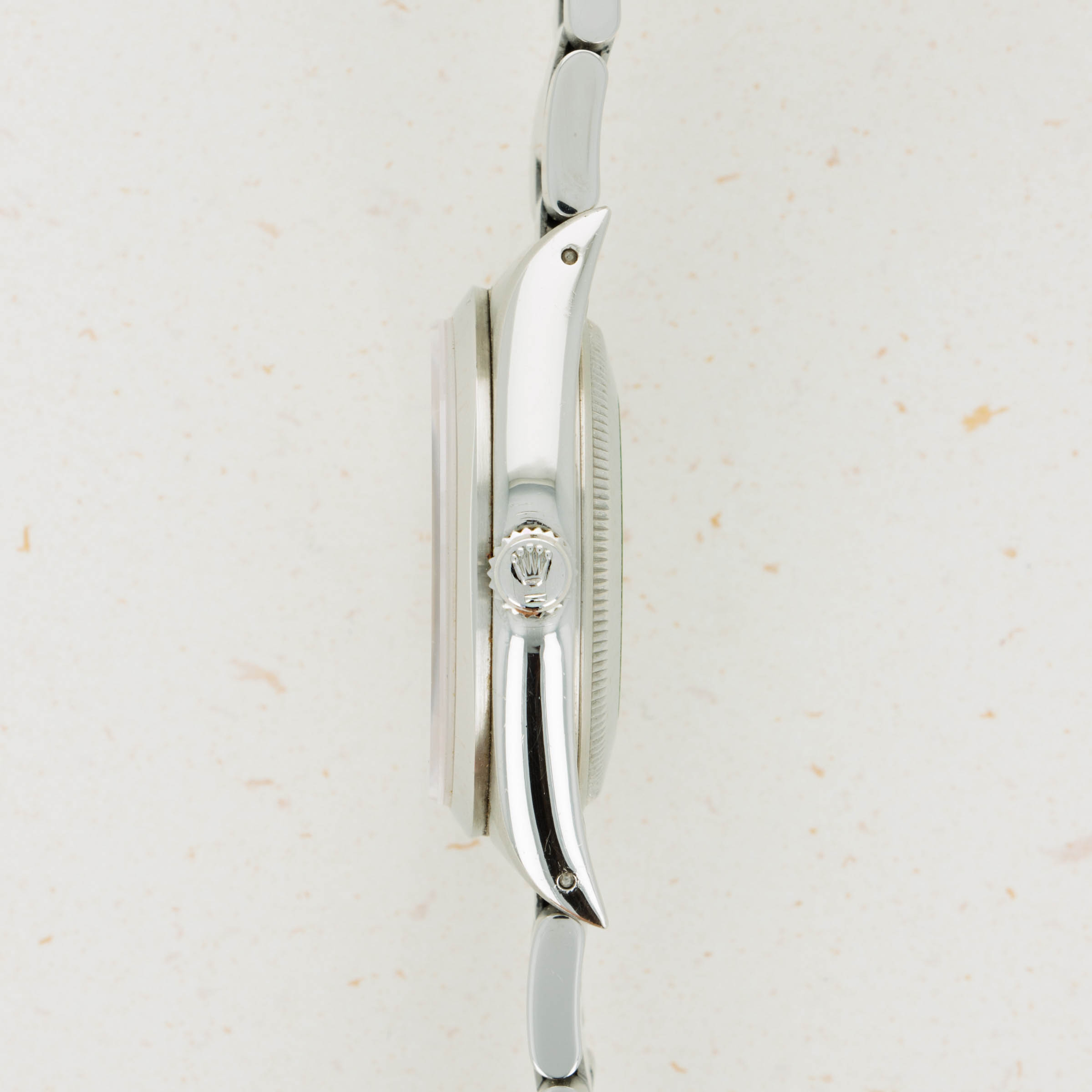 Combining a customized dial with the ref. 14000's famously understated aesthetic with its flat bezel, Oyster bracelet and silver dial, this example injects a fun and unique twist to one of Rolex's most restrained Air-King variants.