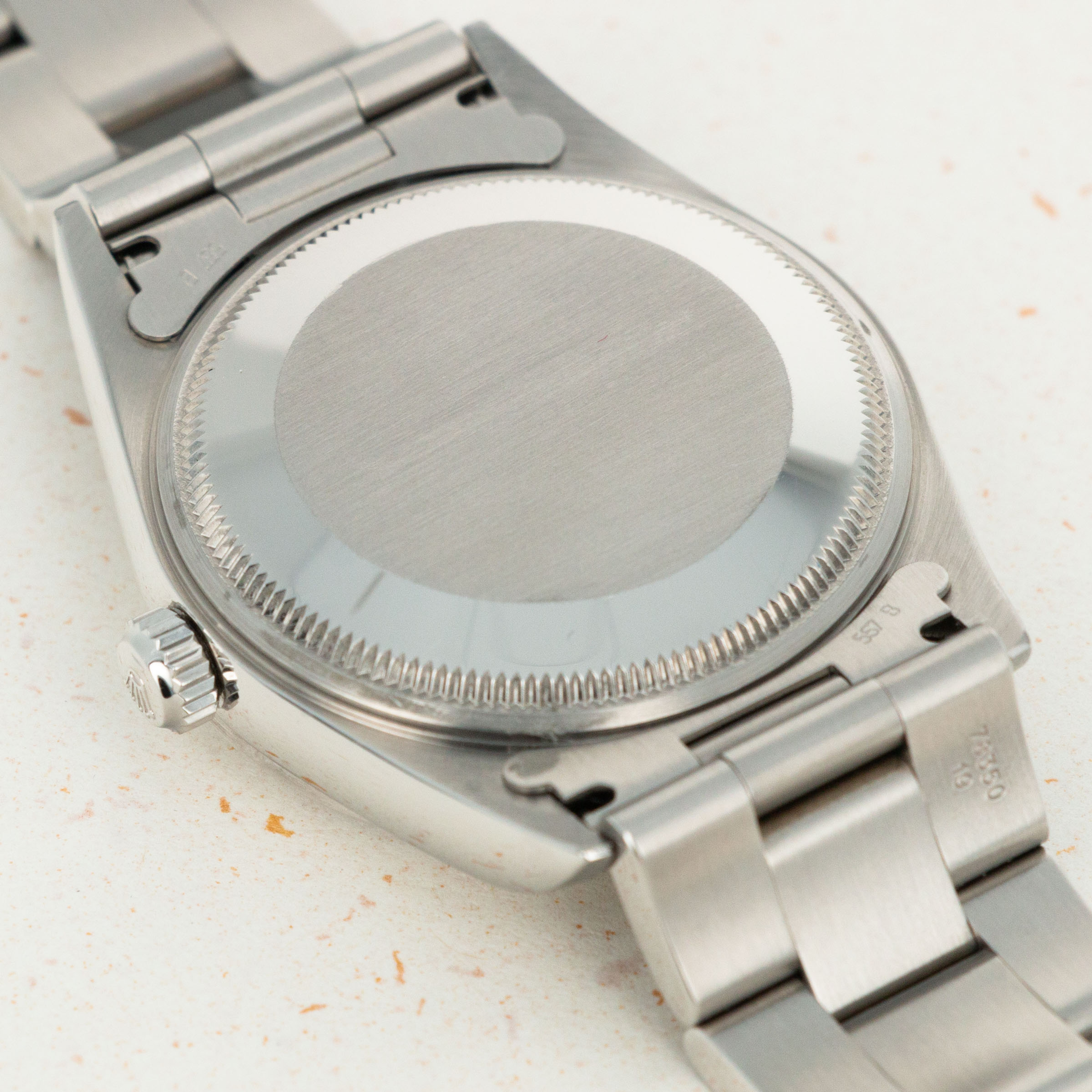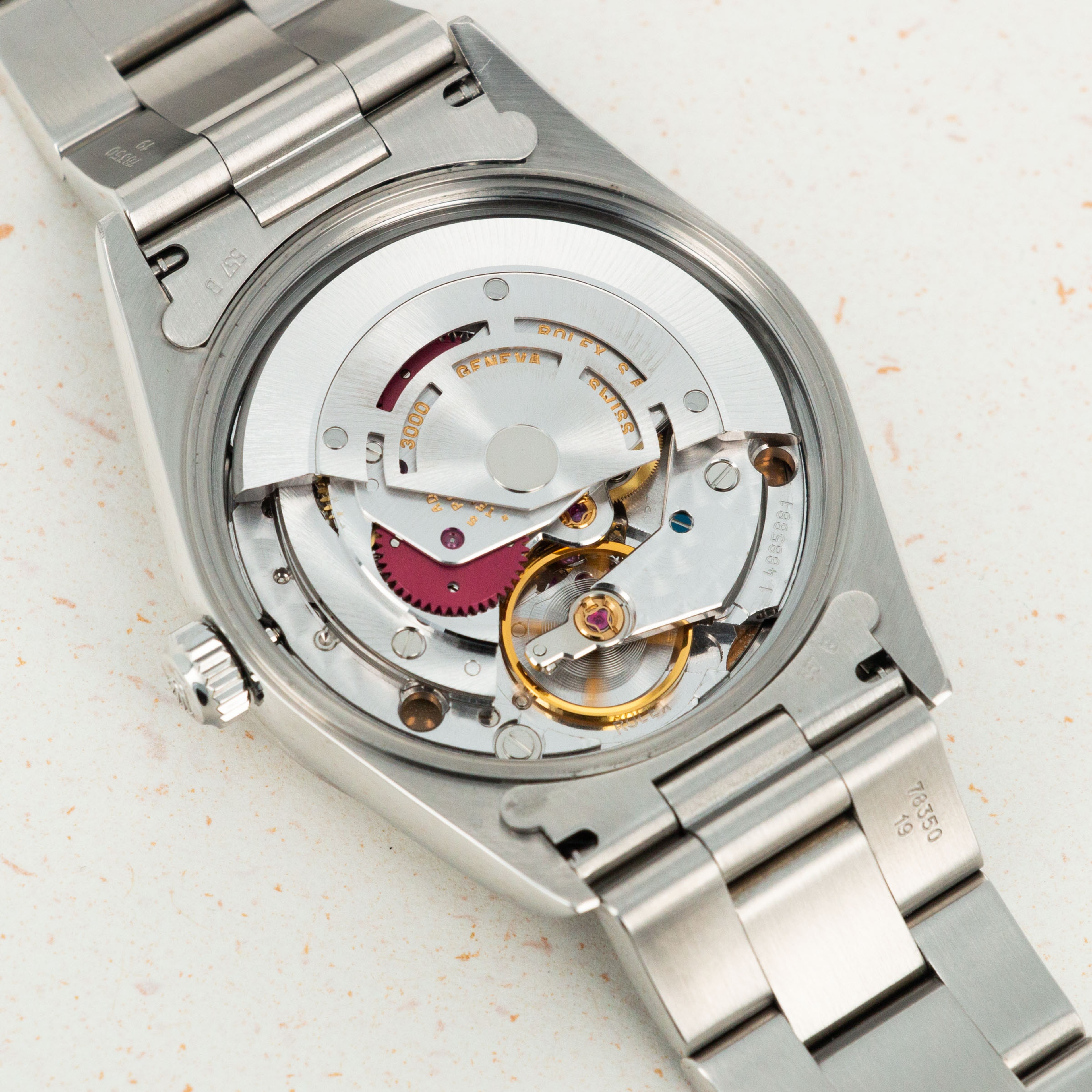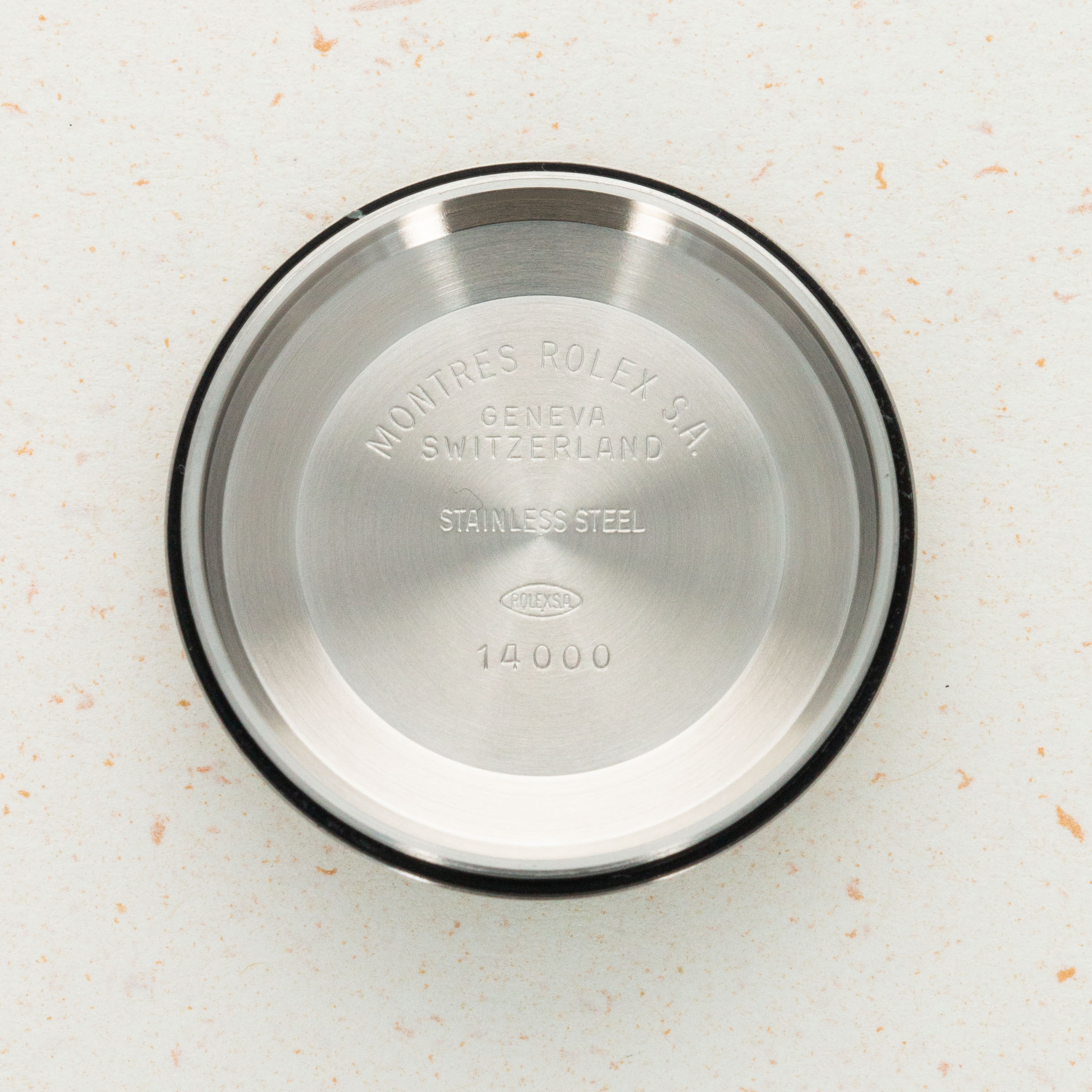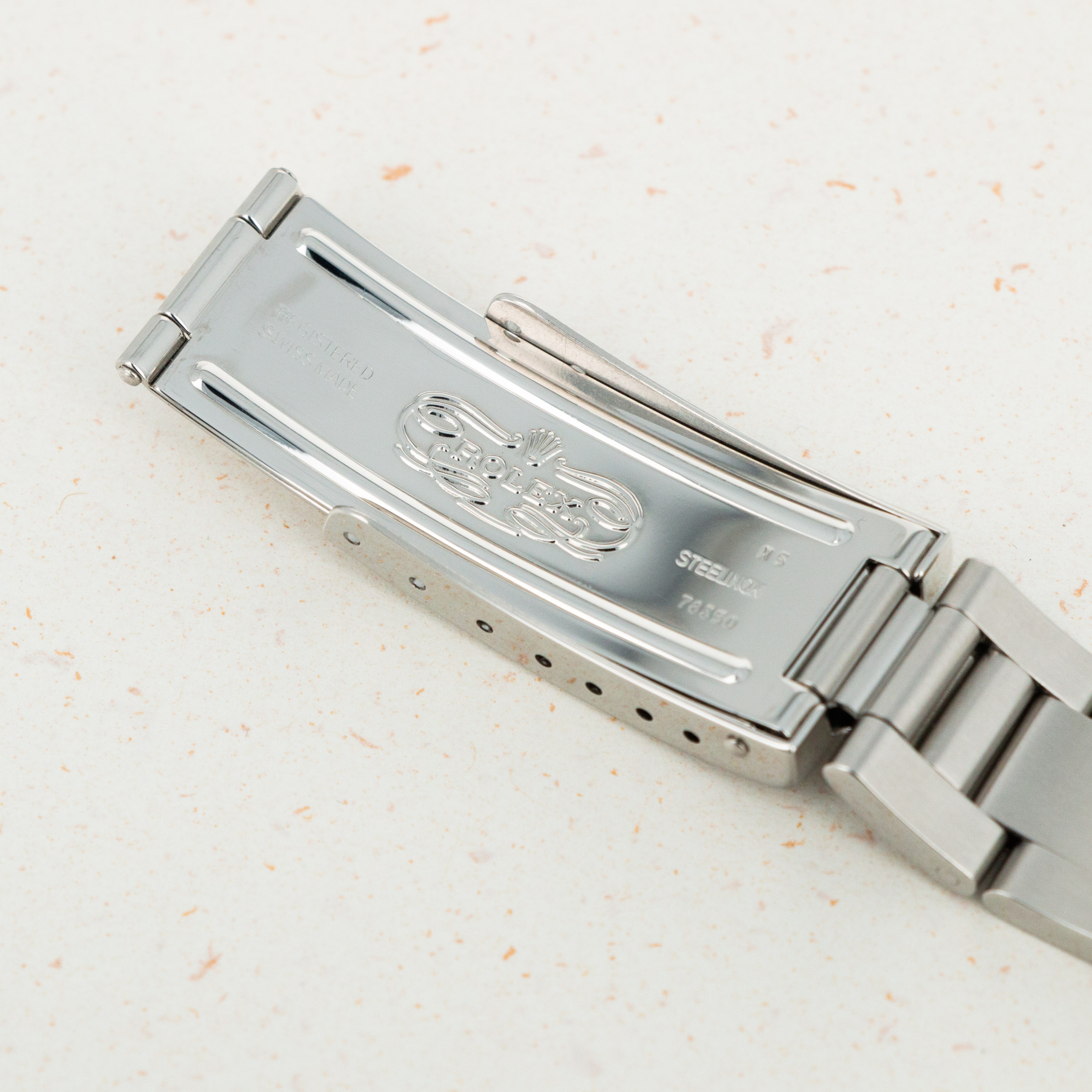 The overall condition is exceptional. The bezel and case are very sharp and show no indication of polishing. The caseback has light hairline scratches, in particular on the glossy section. The bracelet has a few needlelike abrasions on the buckle. It exhibits no signs of stretching.