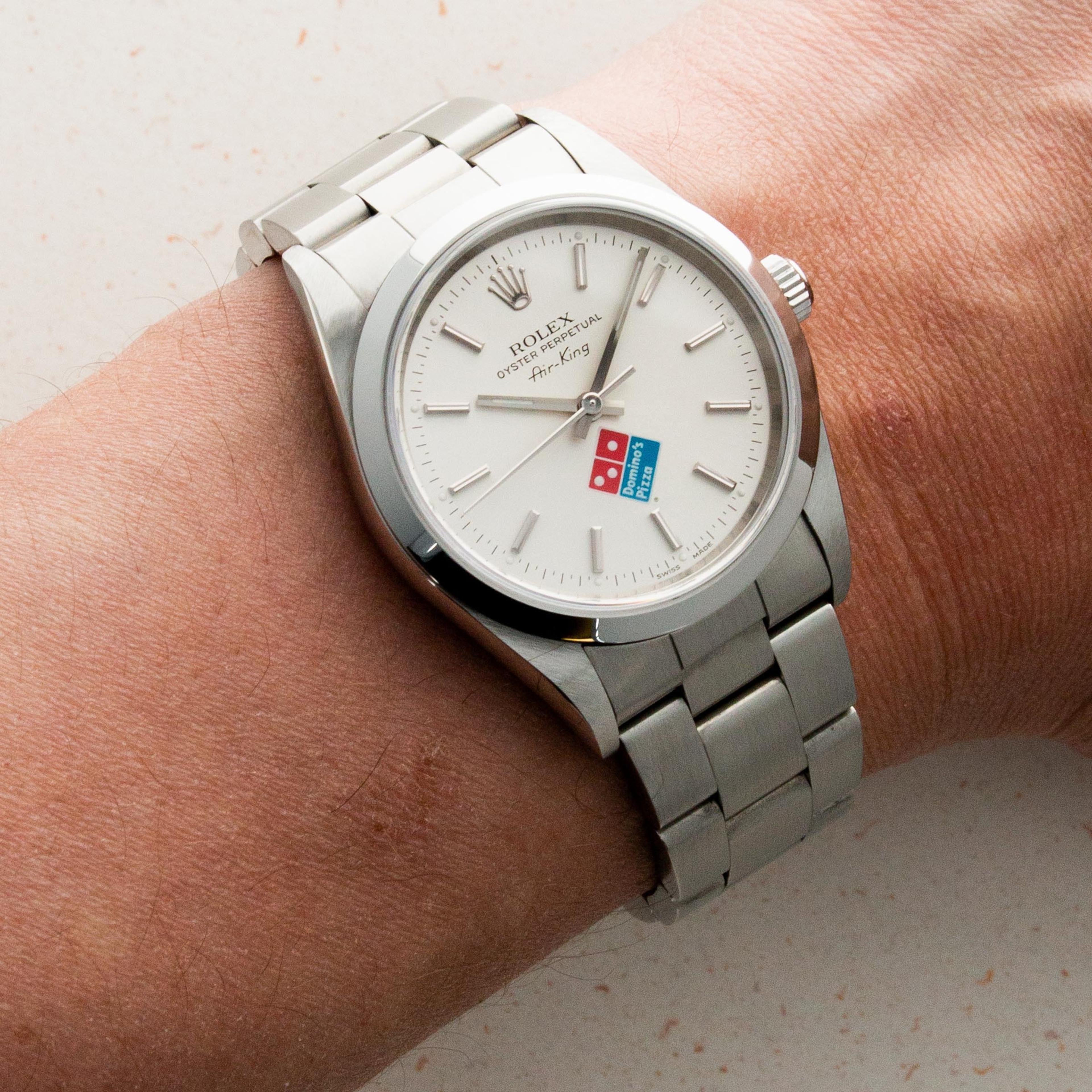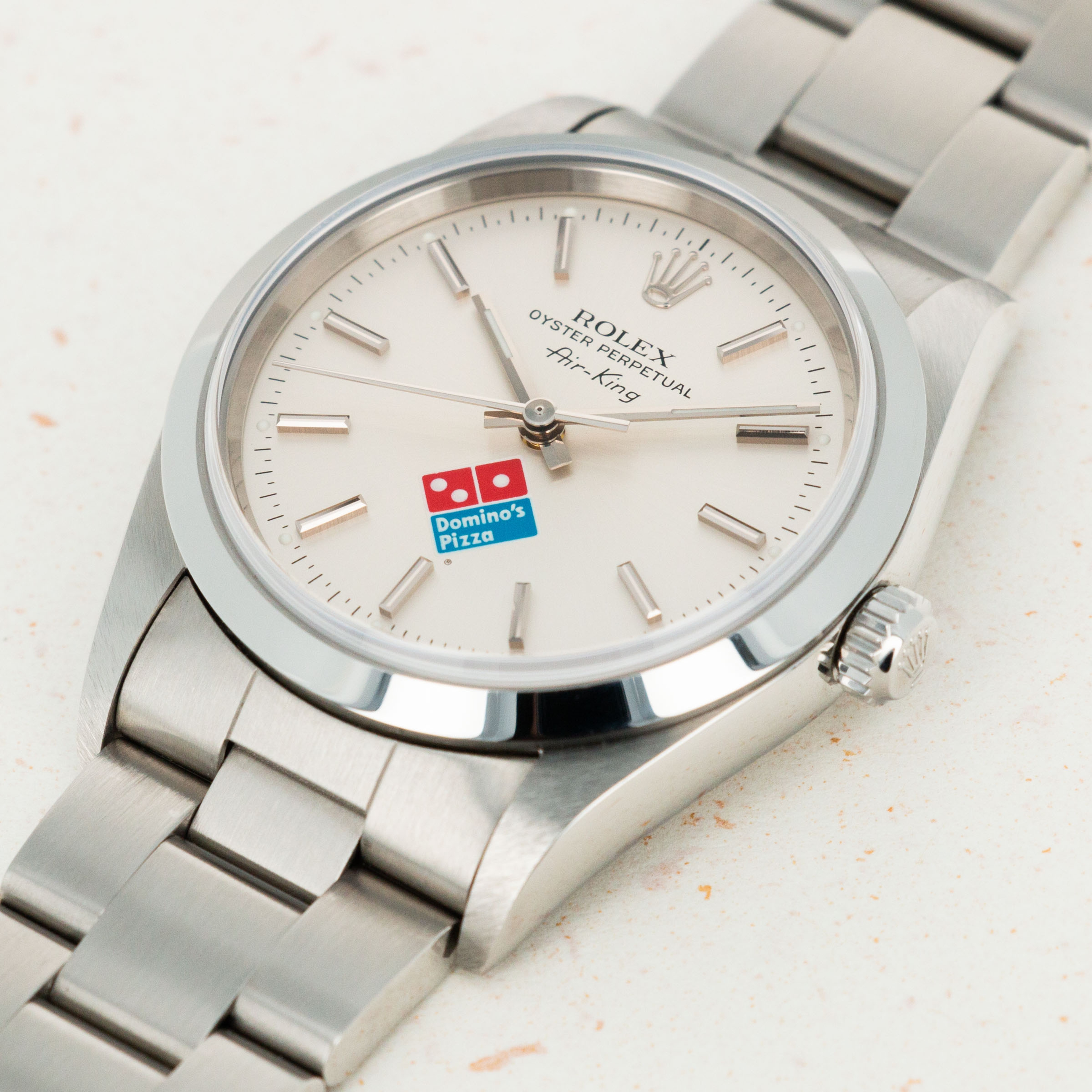 Rolex has been known to produce customized dials for corporate customers up until the early 2000s, and this may just be the most famous of them all. Given to franchisees who have exceeded certain sales targets, these fun and cheerful watches have been coveted not only by Domino's franchisees, but collectors alike. The first models ever given as awards were the reference 5500 Air-Kings in the 1970s. Whilst Rolex is still the preferred choice for award watches at Domino's, the new iterations no longer feature the red, white and blue logos on the dials.