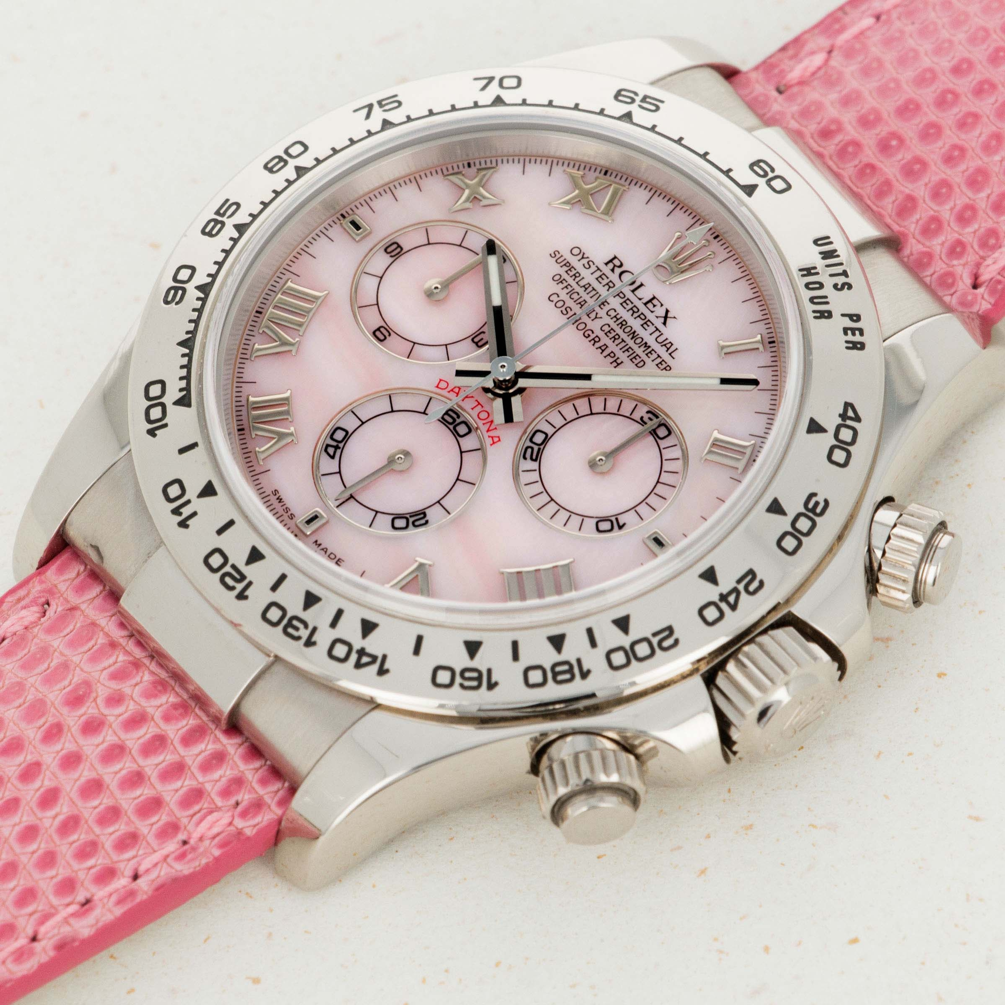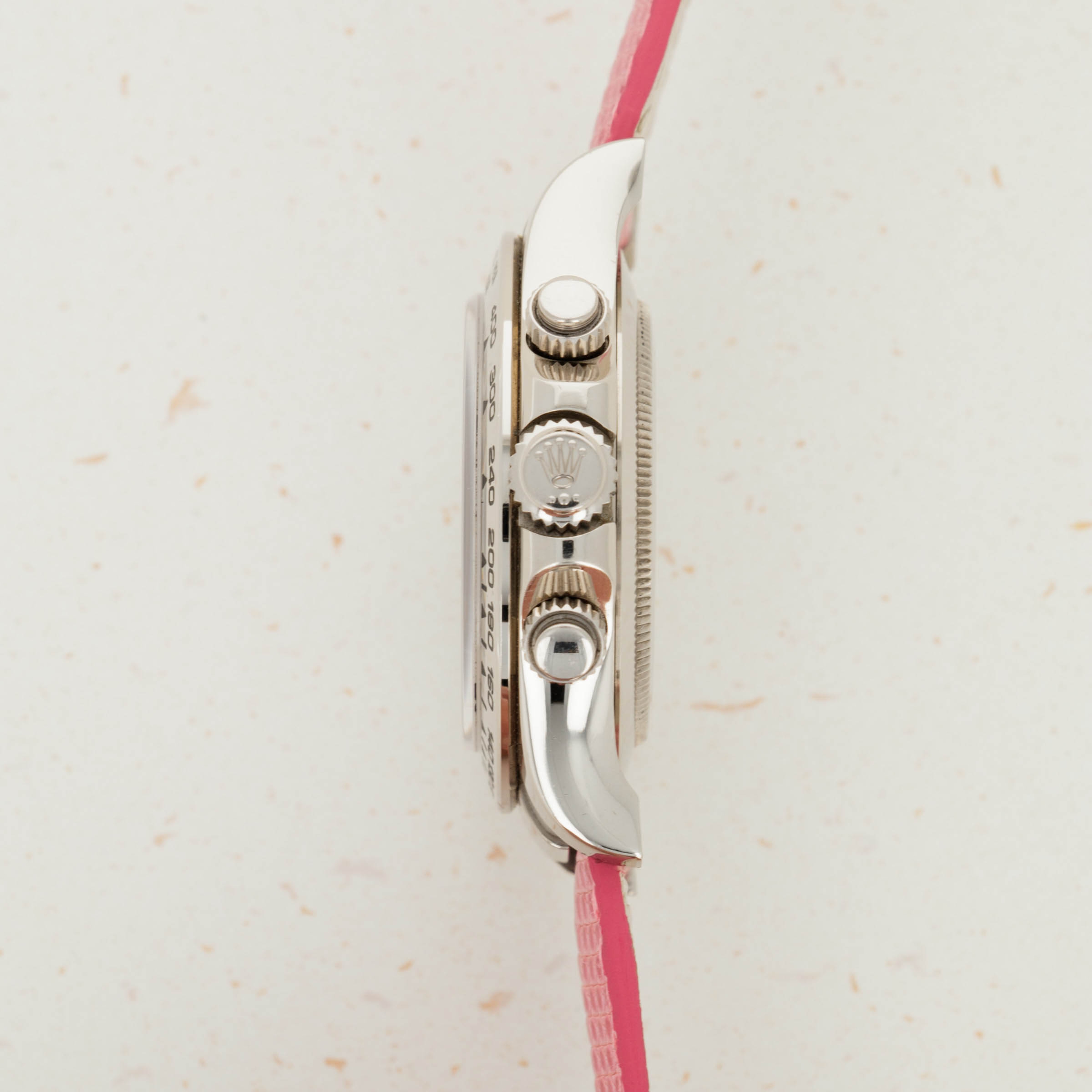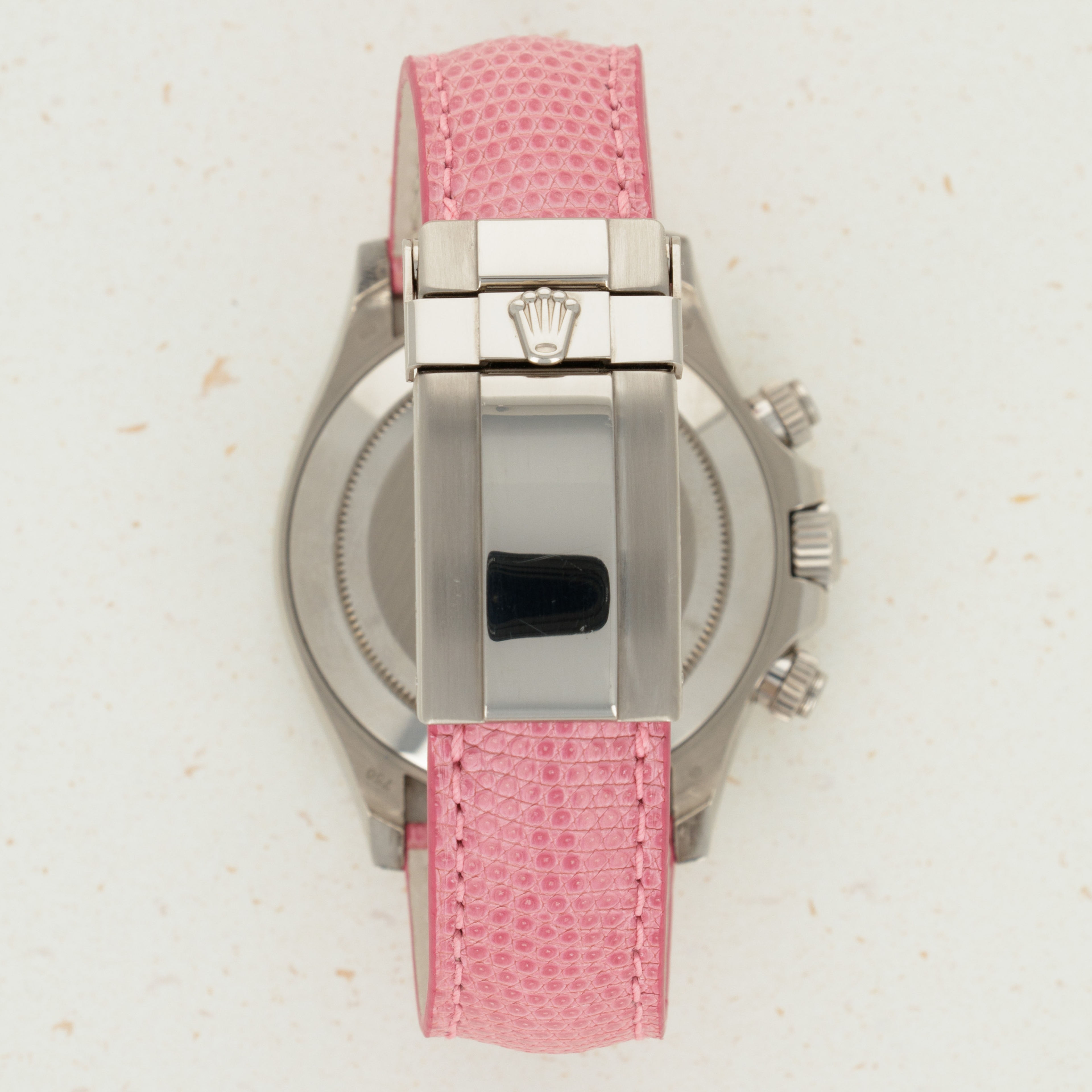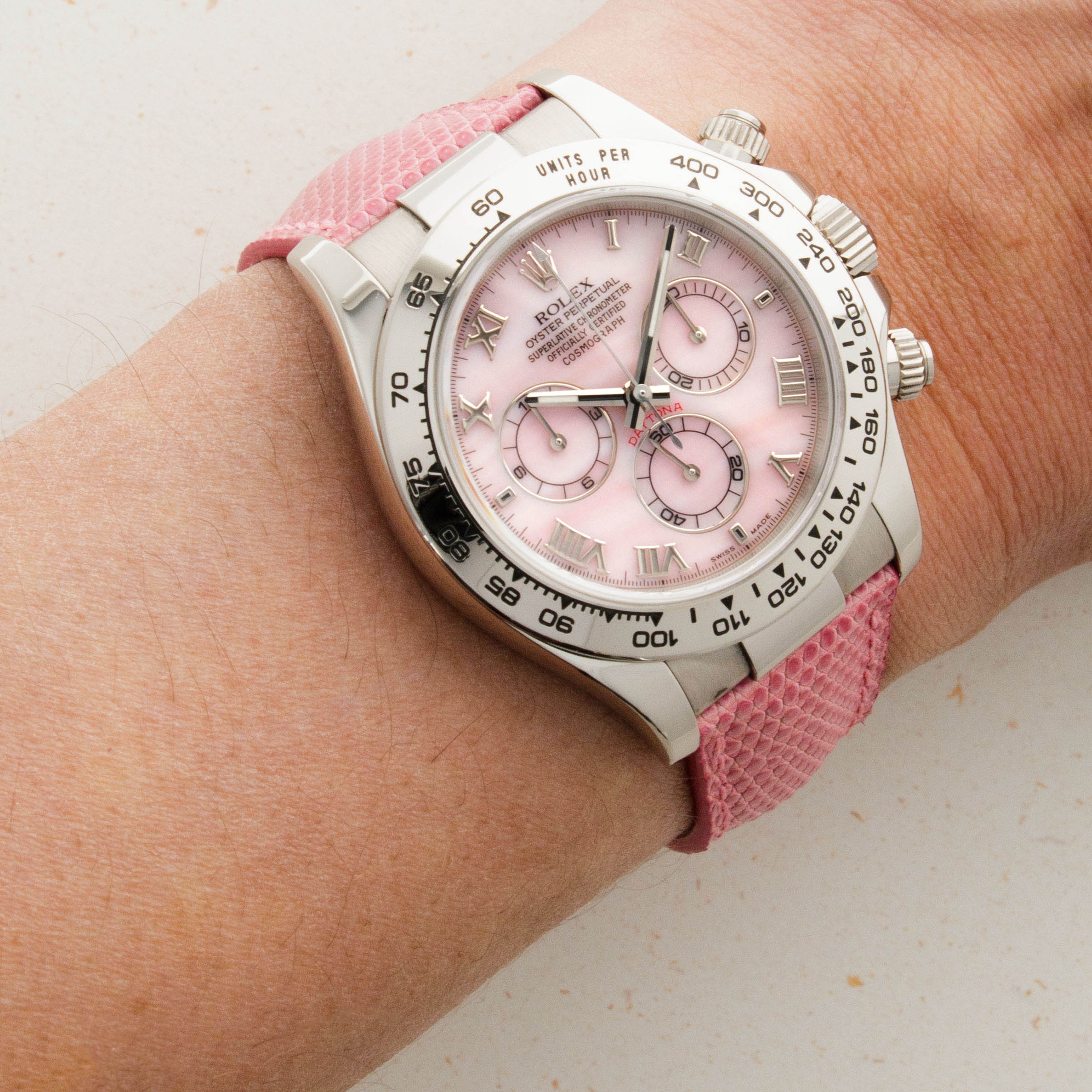 With its strap also featuring subtle differences in the depth of its pink color, this Daytona's strap perfectly matches the pink Mother of Pearl dial.
