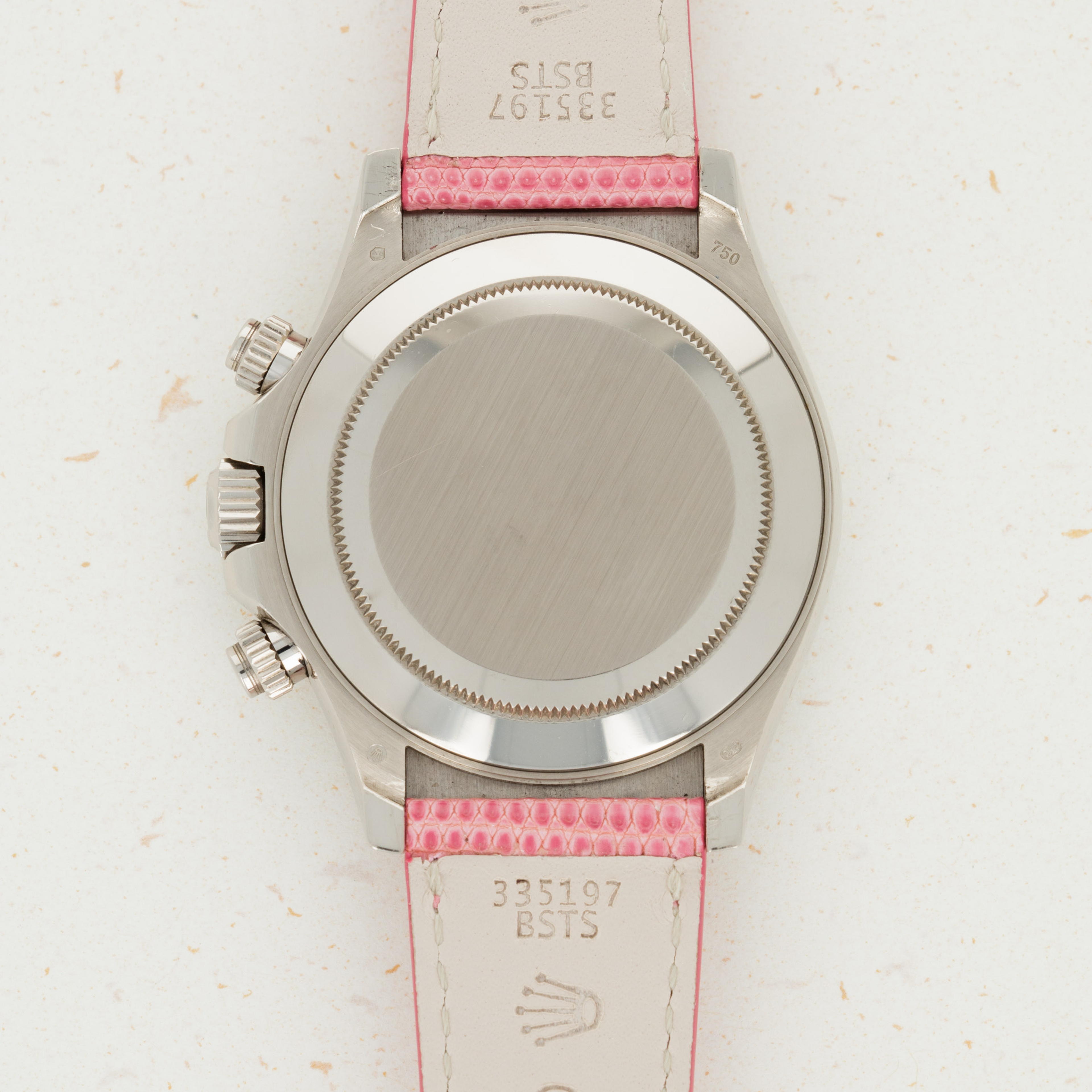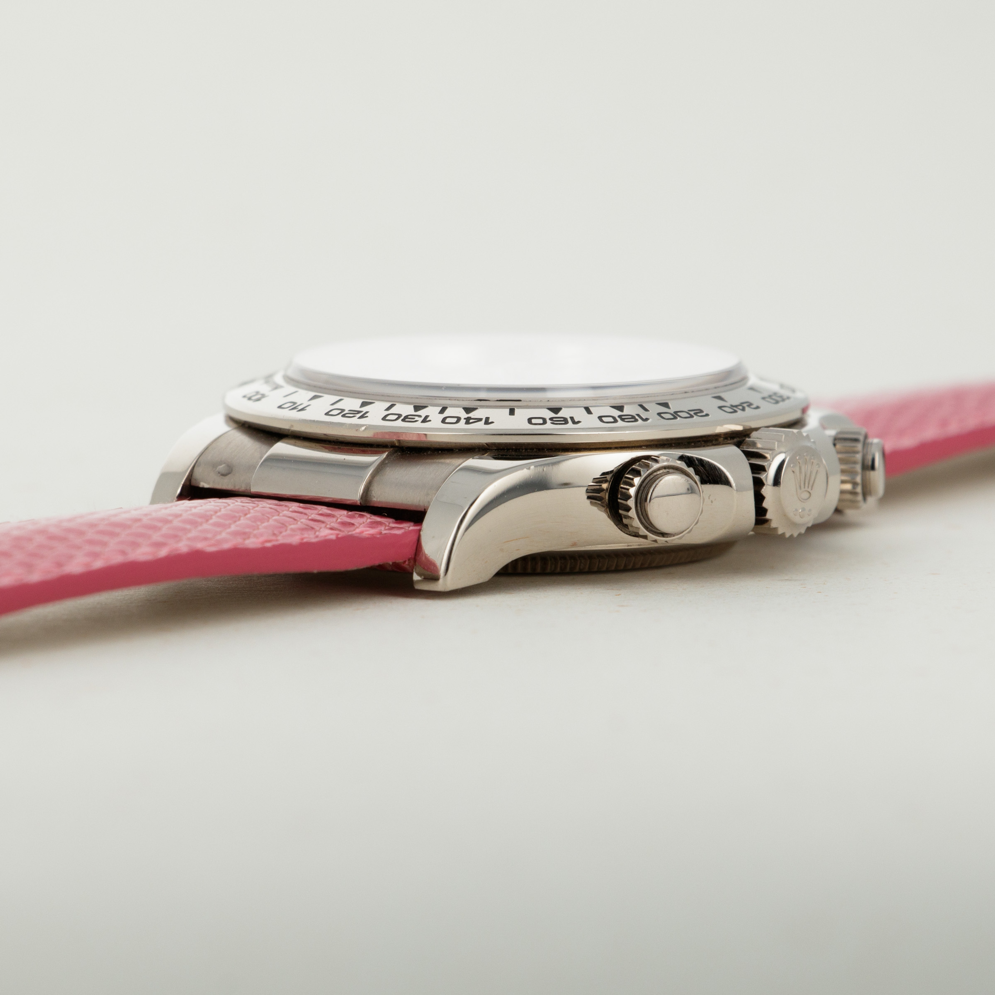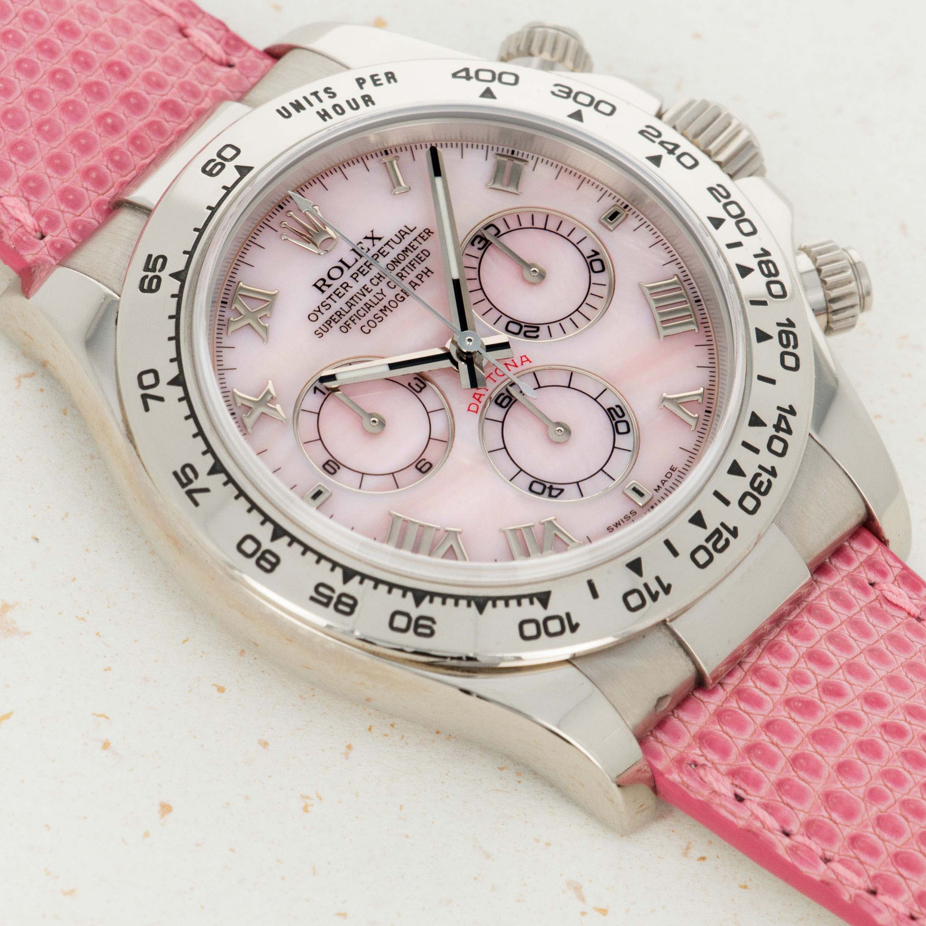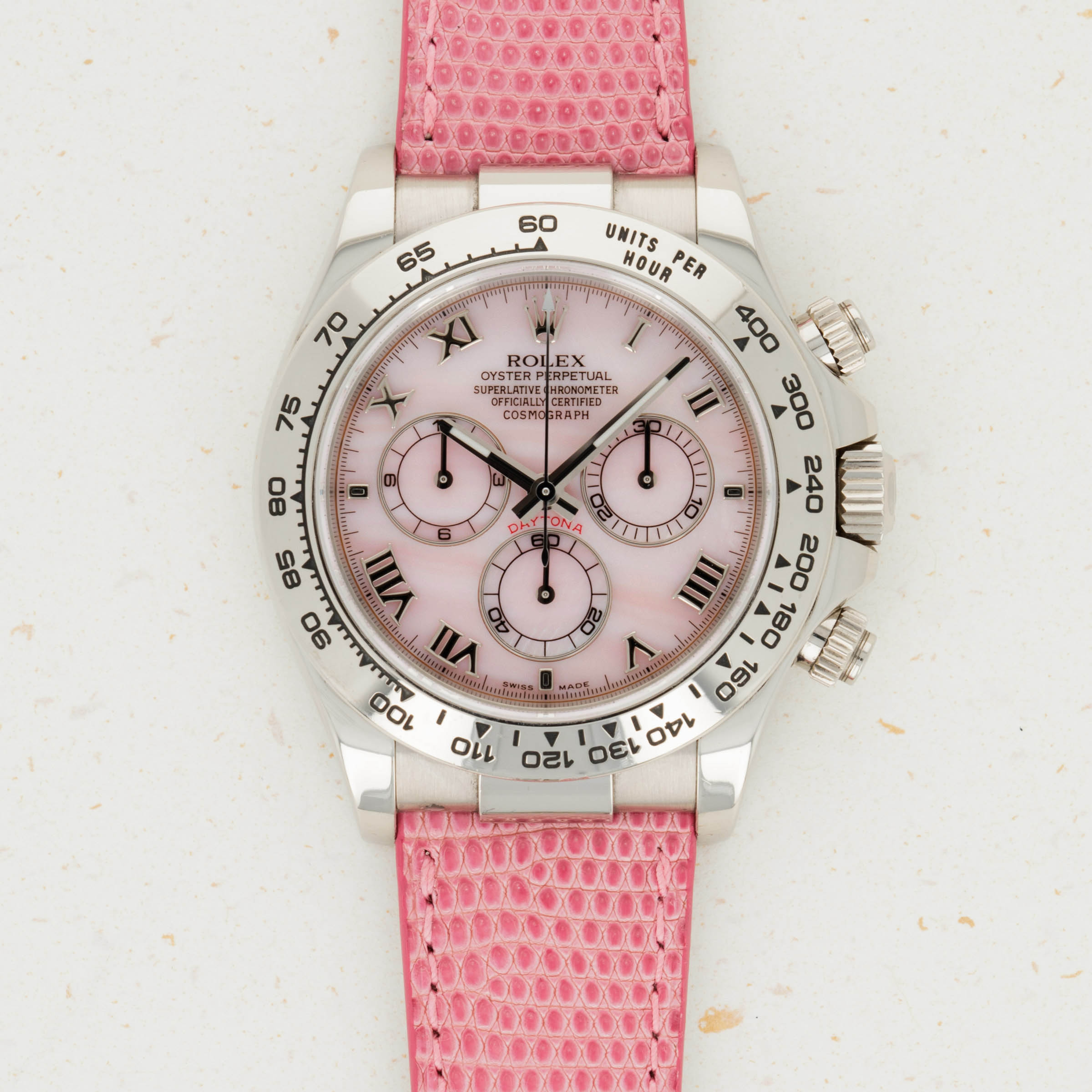 With its strap also featuring subtle differences in the depth of its pink color, this Daytona's strap perfectly matches the pink Mother of Pearl dial.