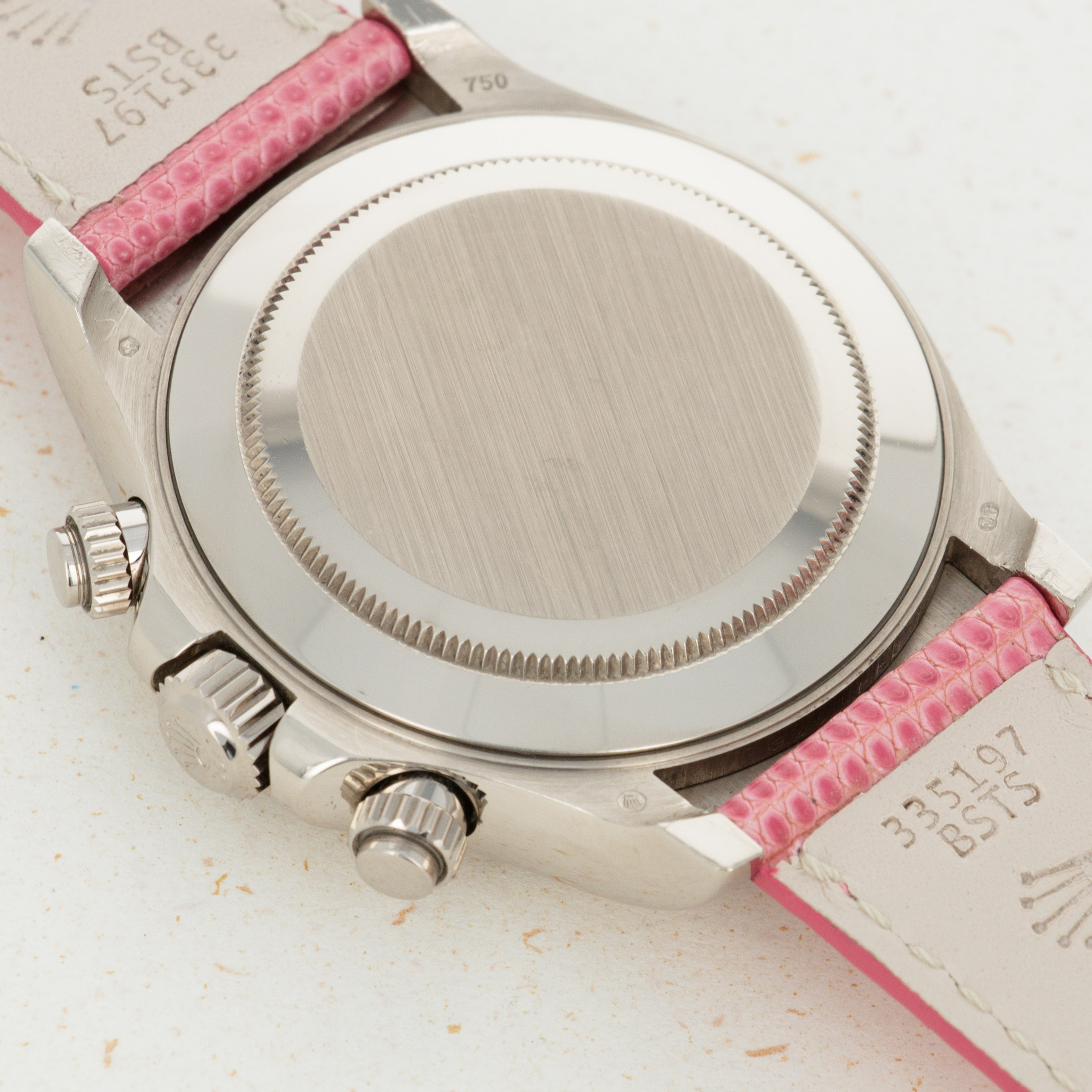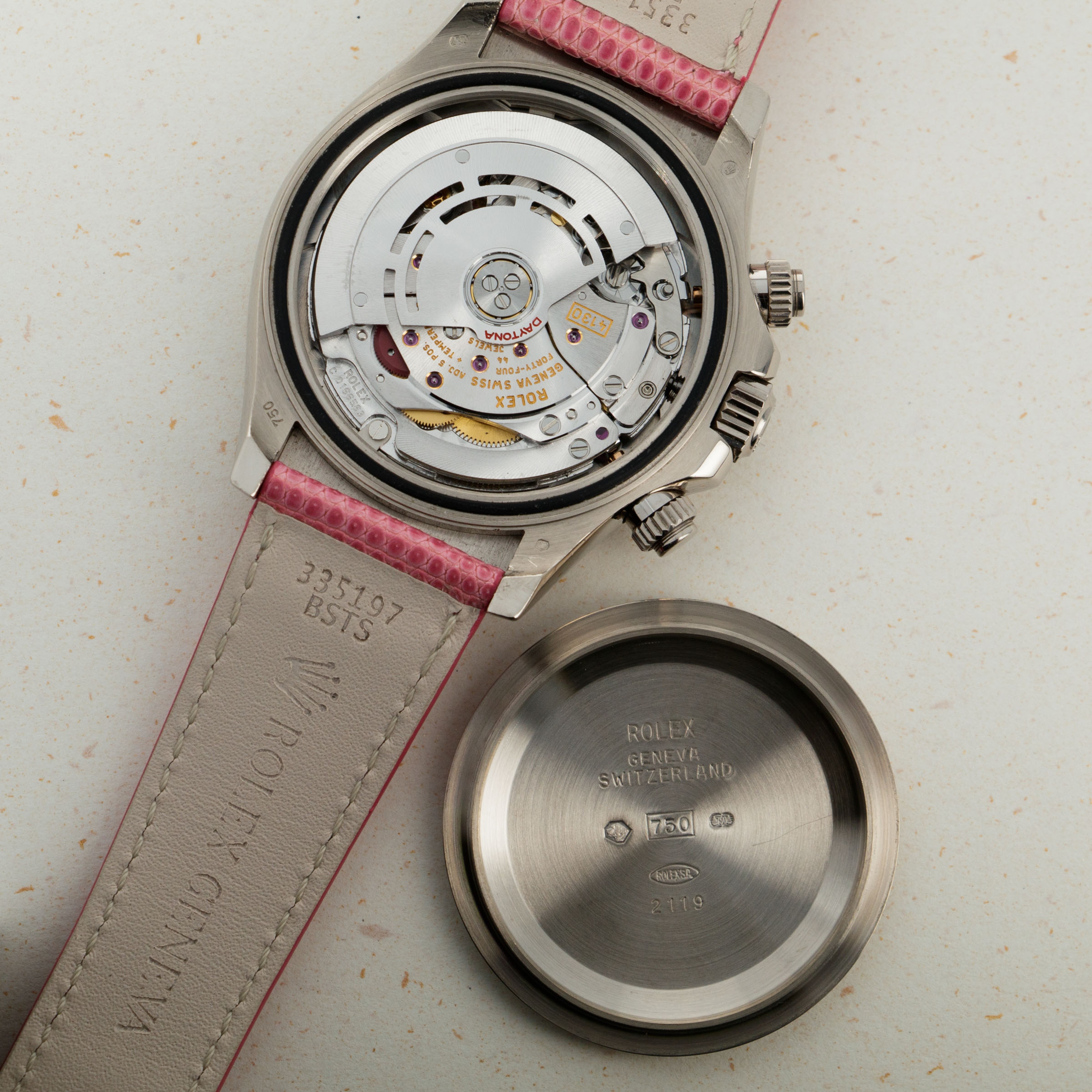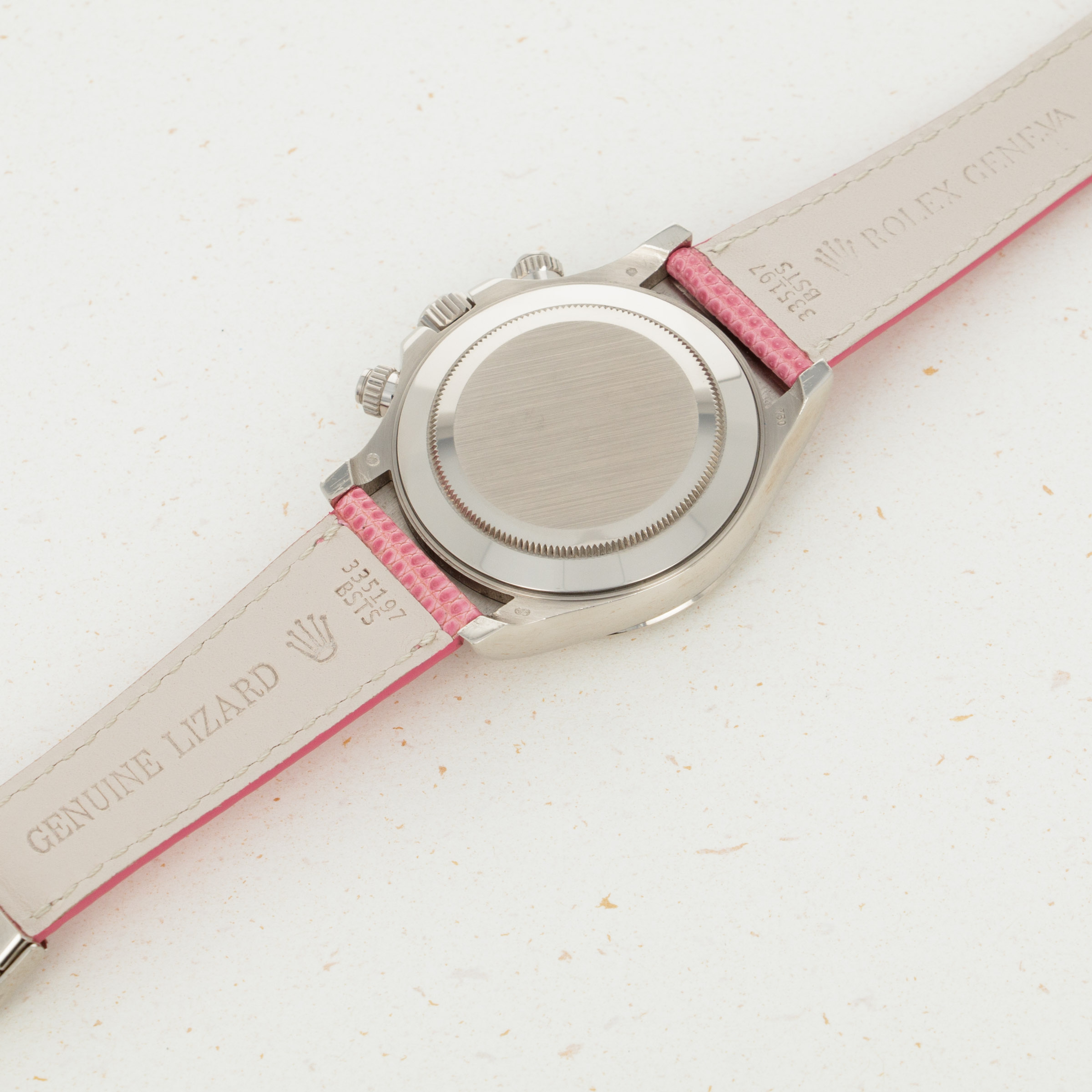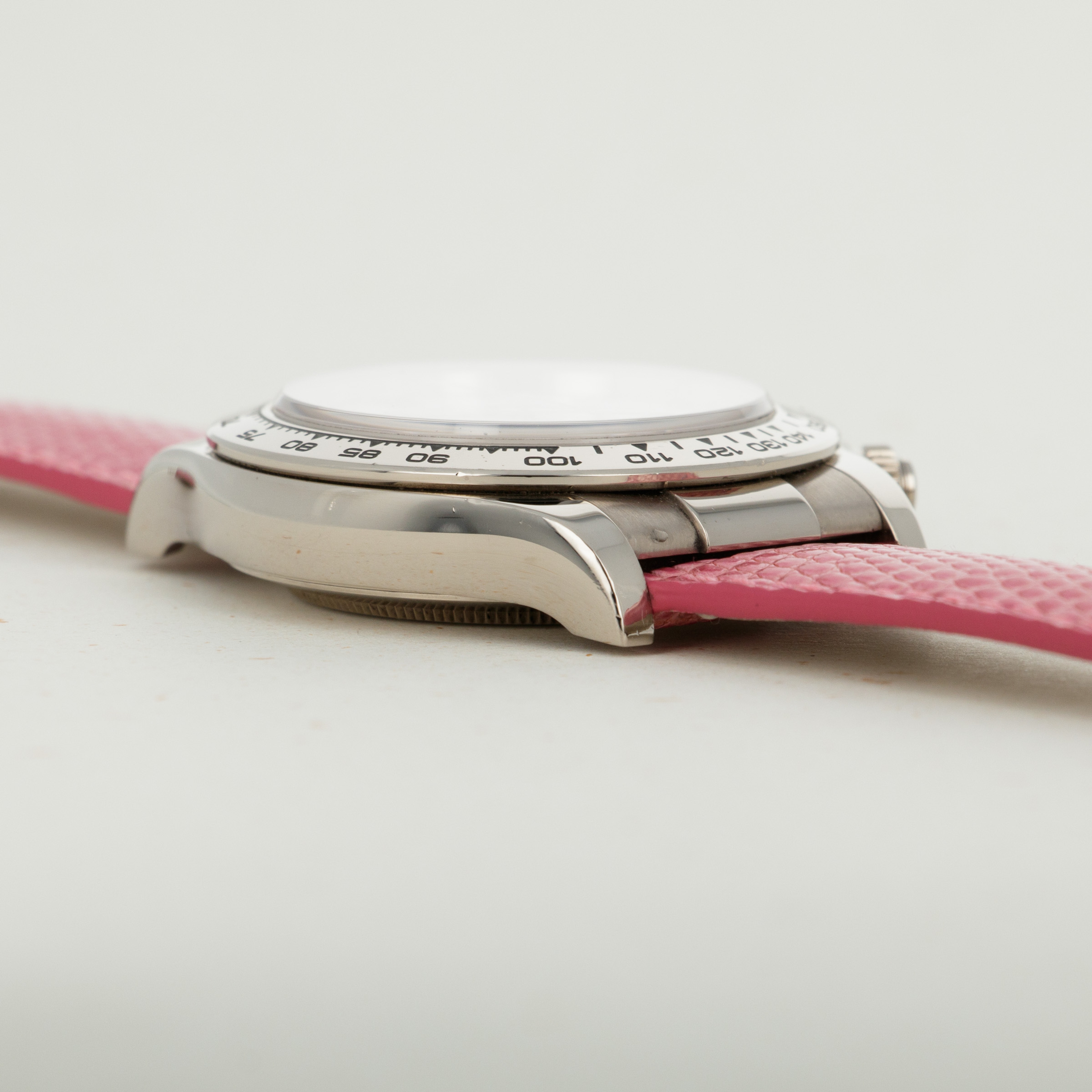 With its strap also featuring subtle differences in the depth of its pink color, this Daytona's strap perfectly matches the pink Mother of Pearl dial.
