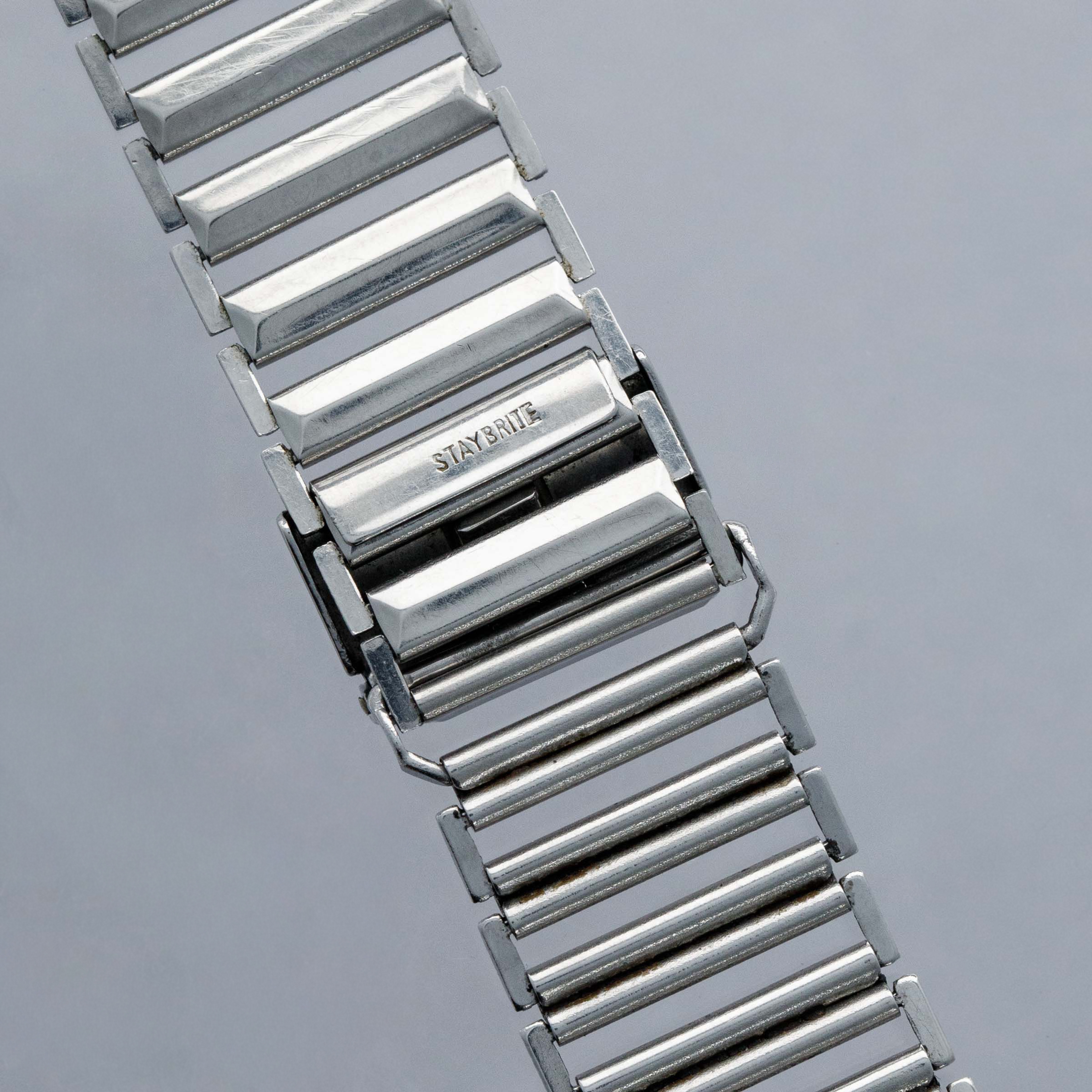 Watch is in overall excellent condition. The steel case is very good with some scratches and more noticeable nicks and marks on the bezel, as expected of a watch of this vintage. The case back shows additional scratches and nicks, and the winding crown has some surface wear. The dial is excellent, with light spotting, and the blued hands show light signs of aging. There are some scuffs on the crystal. It is fitted with a Bonklip-style bamboo bracelet in very good condition, showing some surface marks.