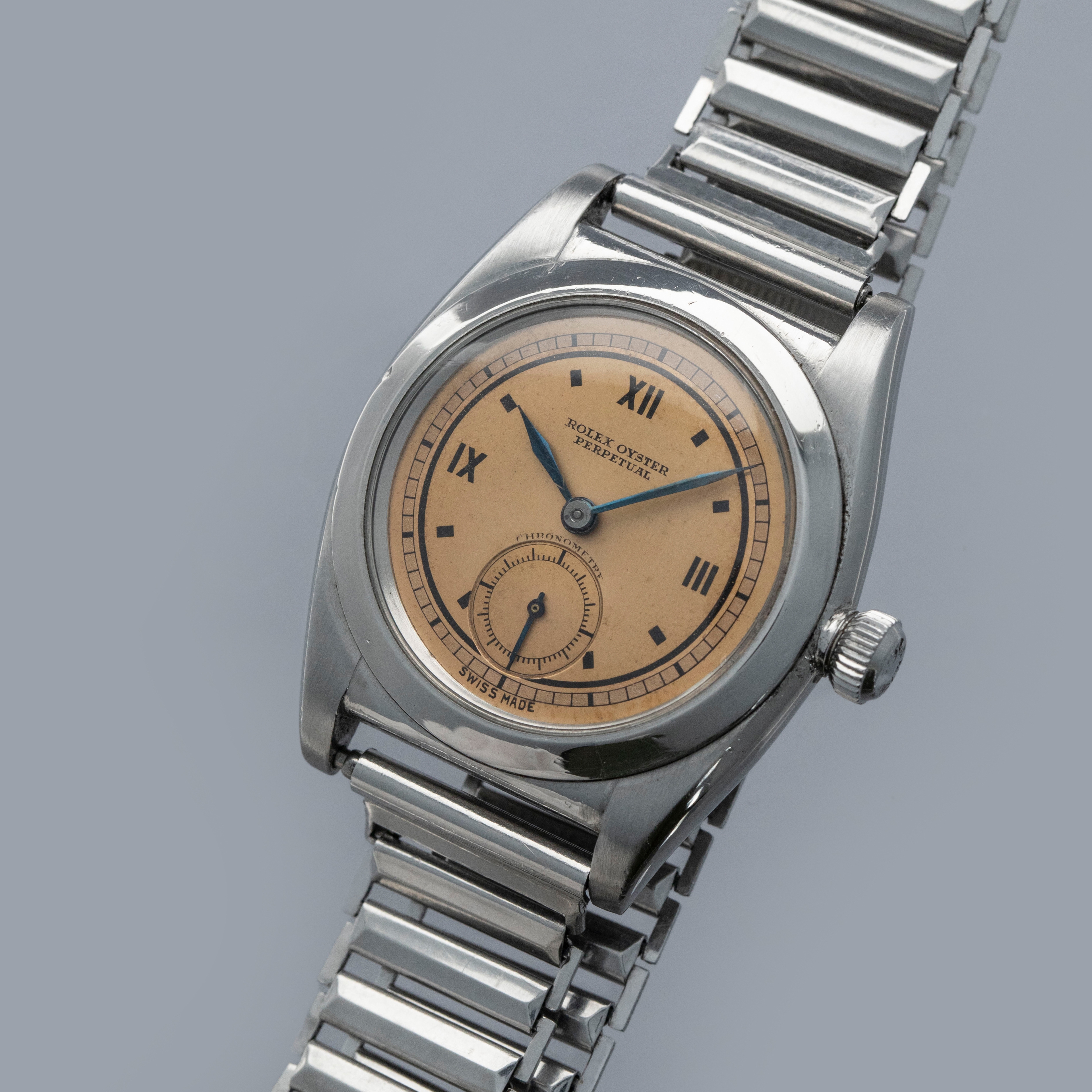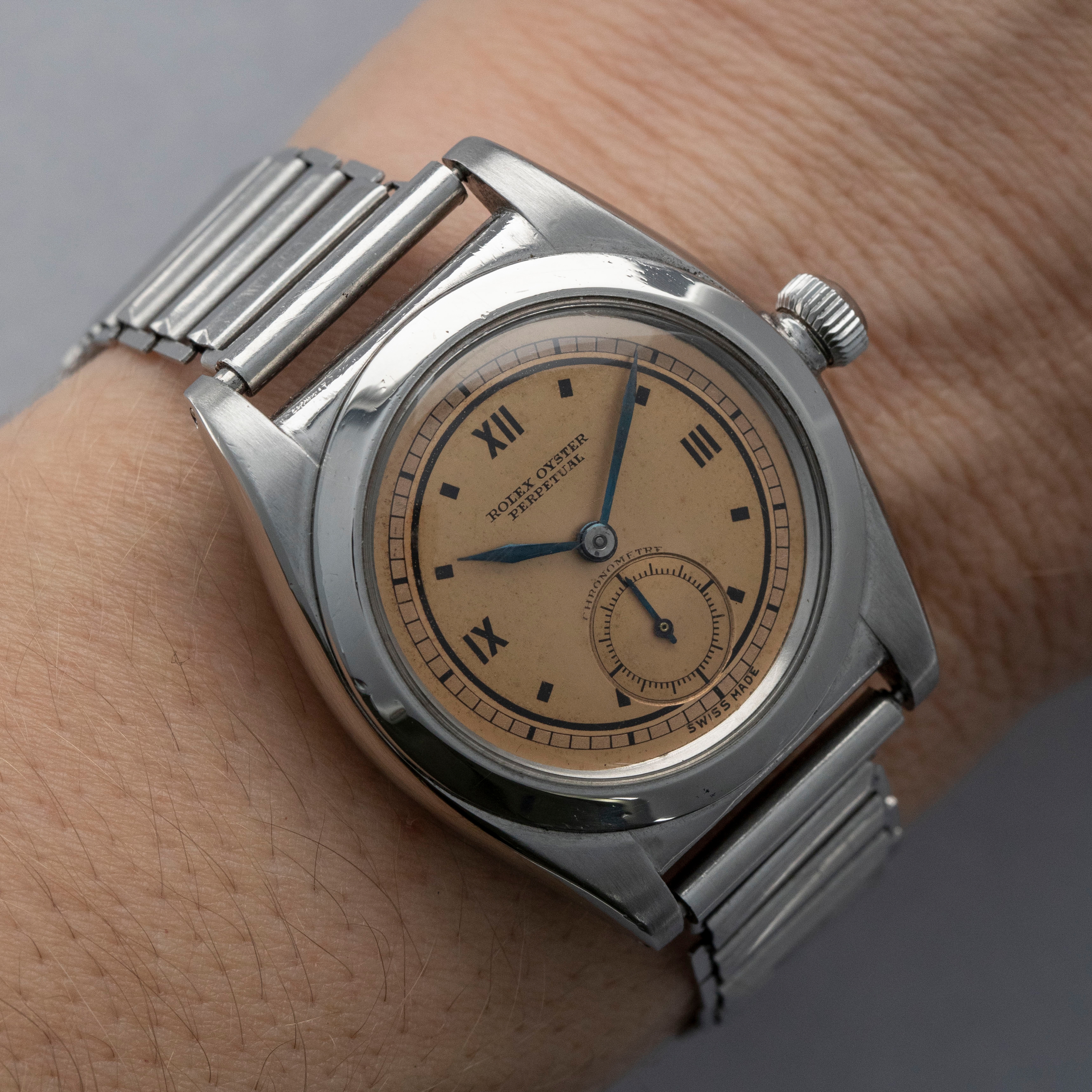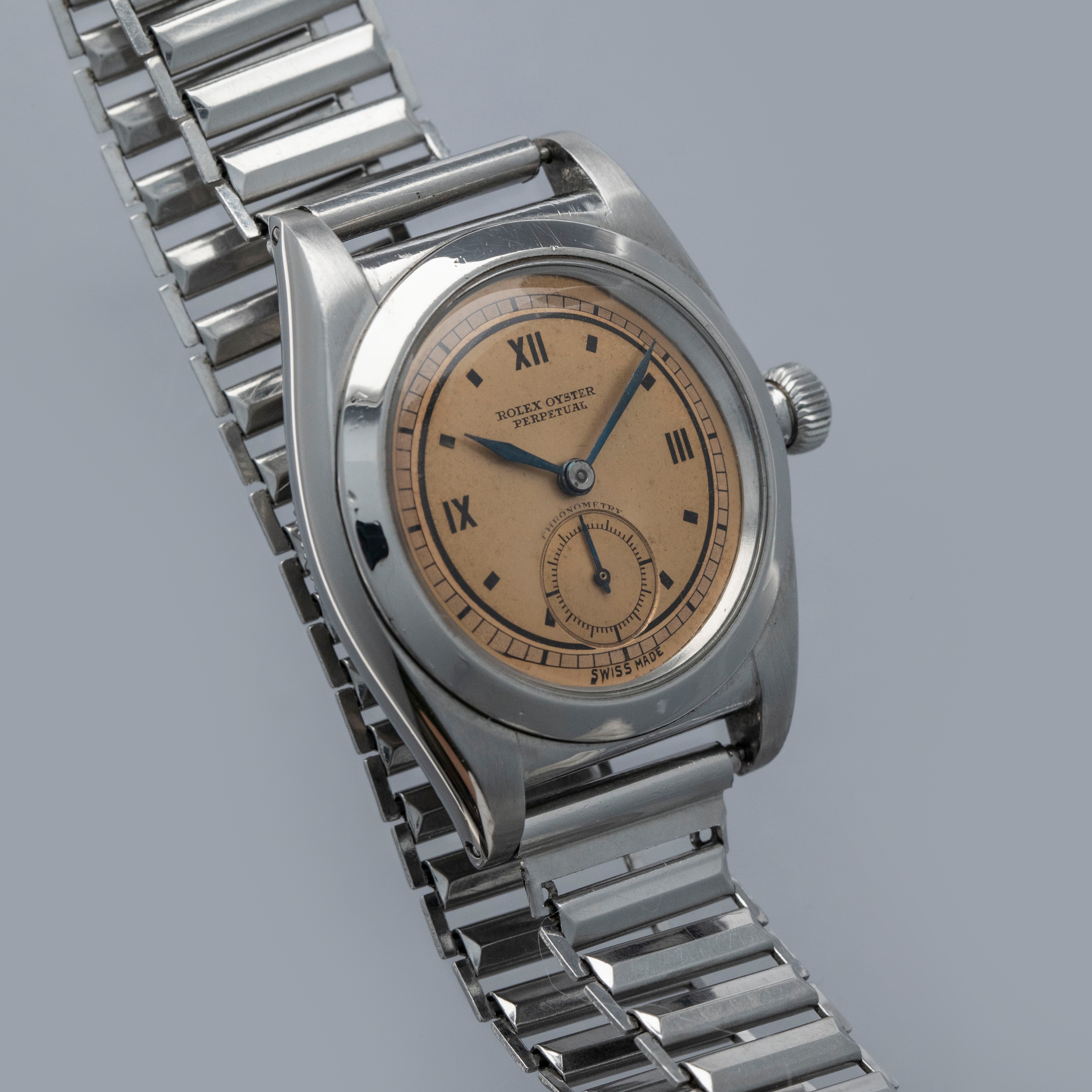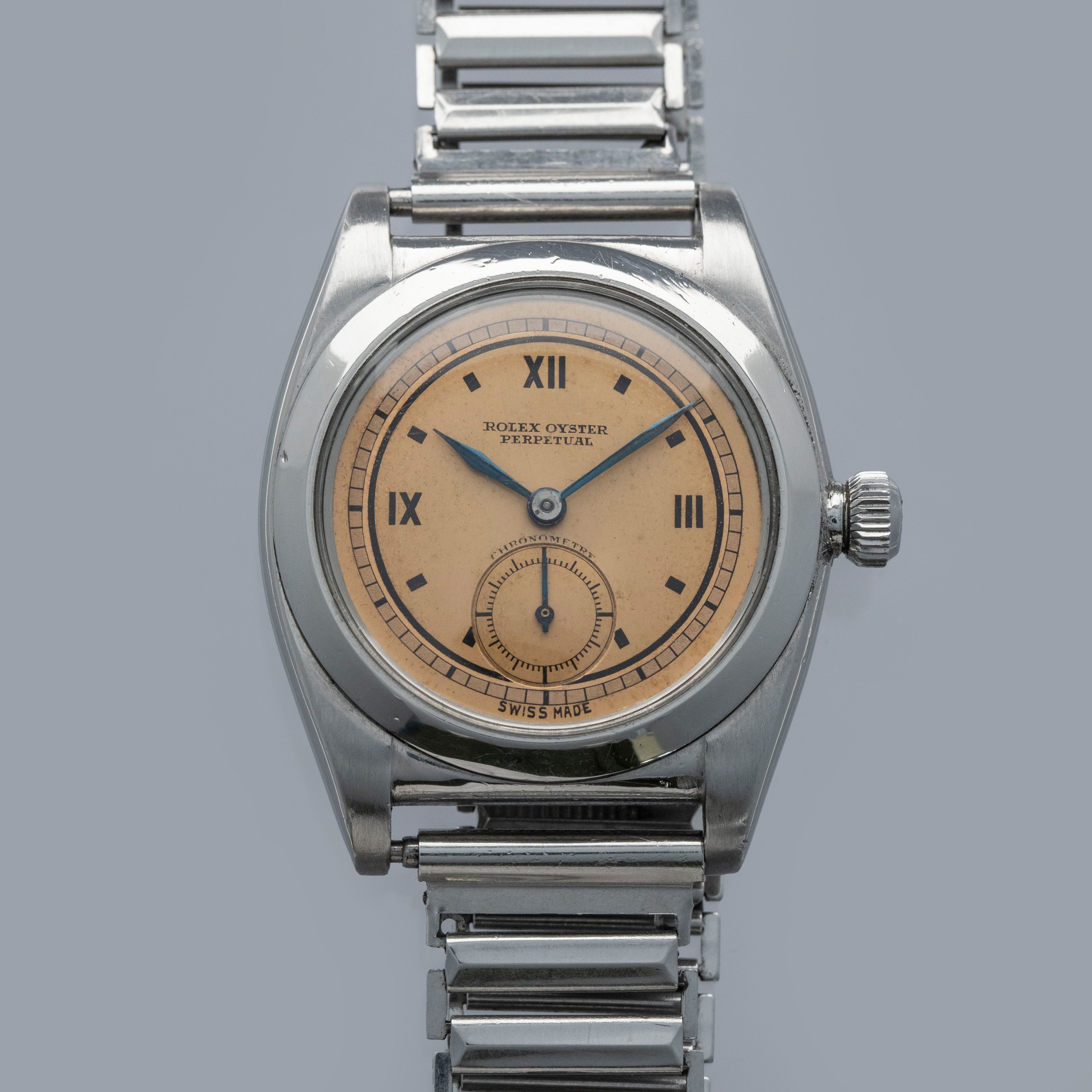 A beautifully designed watch with its understated flat bezel, bubbleback, expandable bracelet, and appealing salmon dial, this Rolex ref. 2764 will certainly make for a unique addition to any collection.