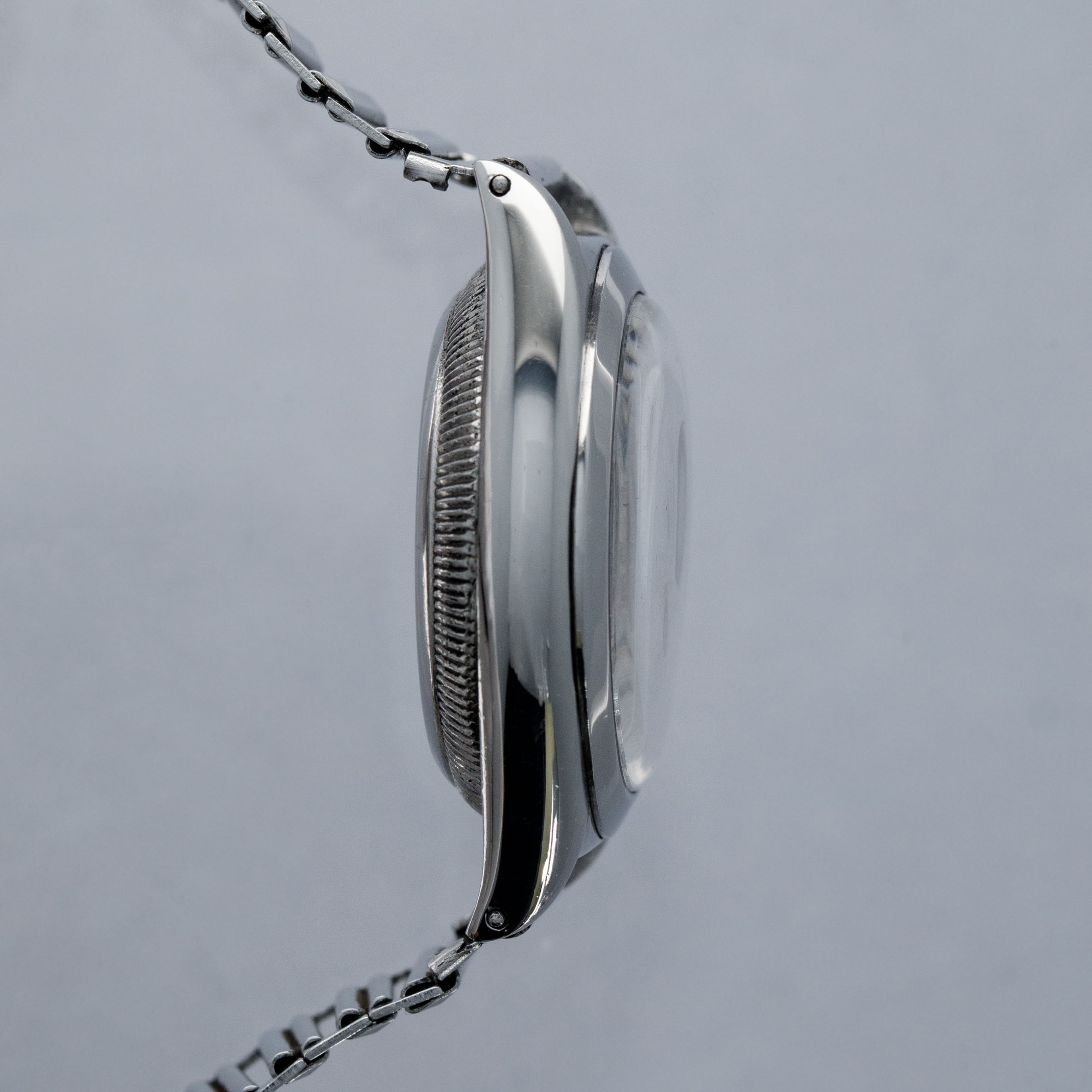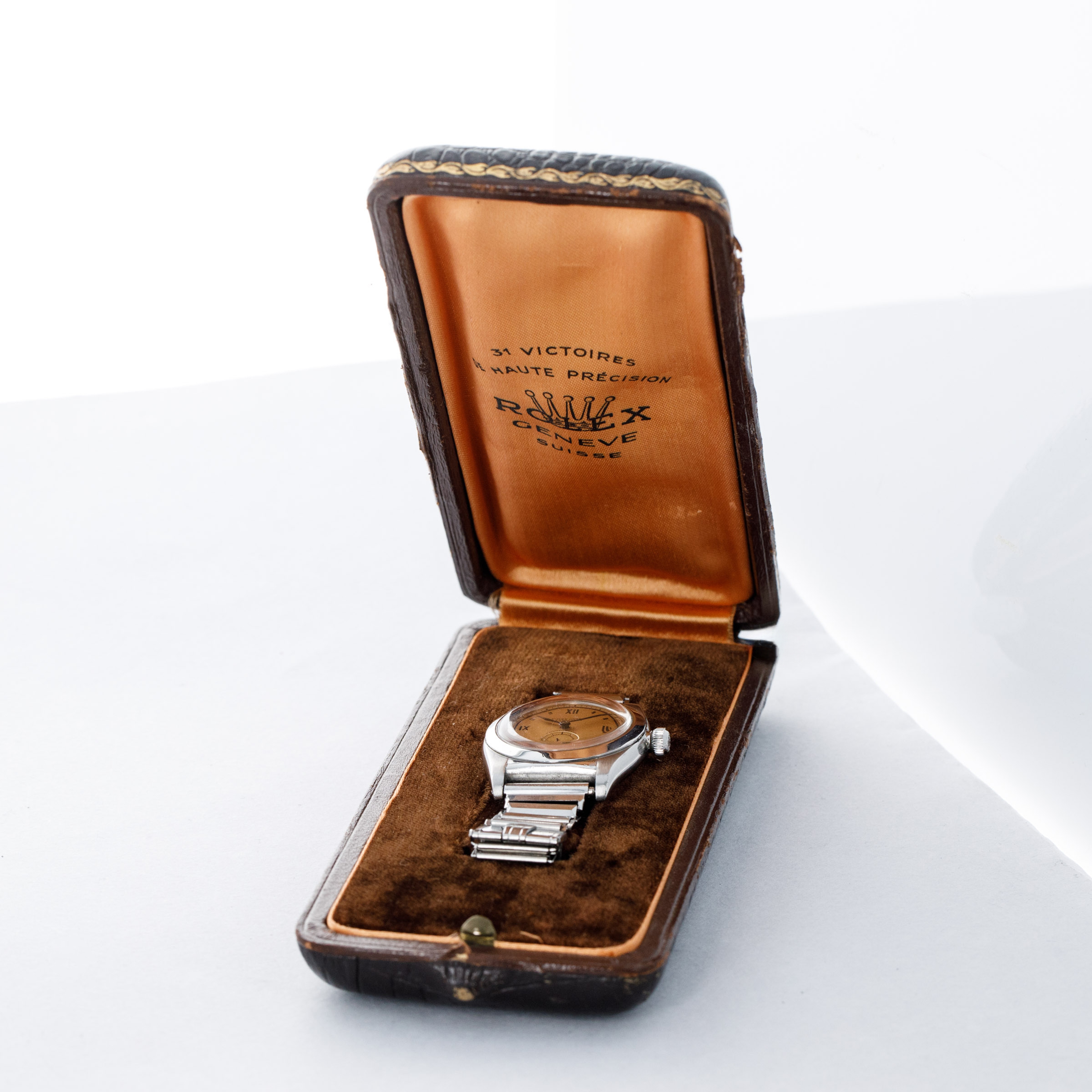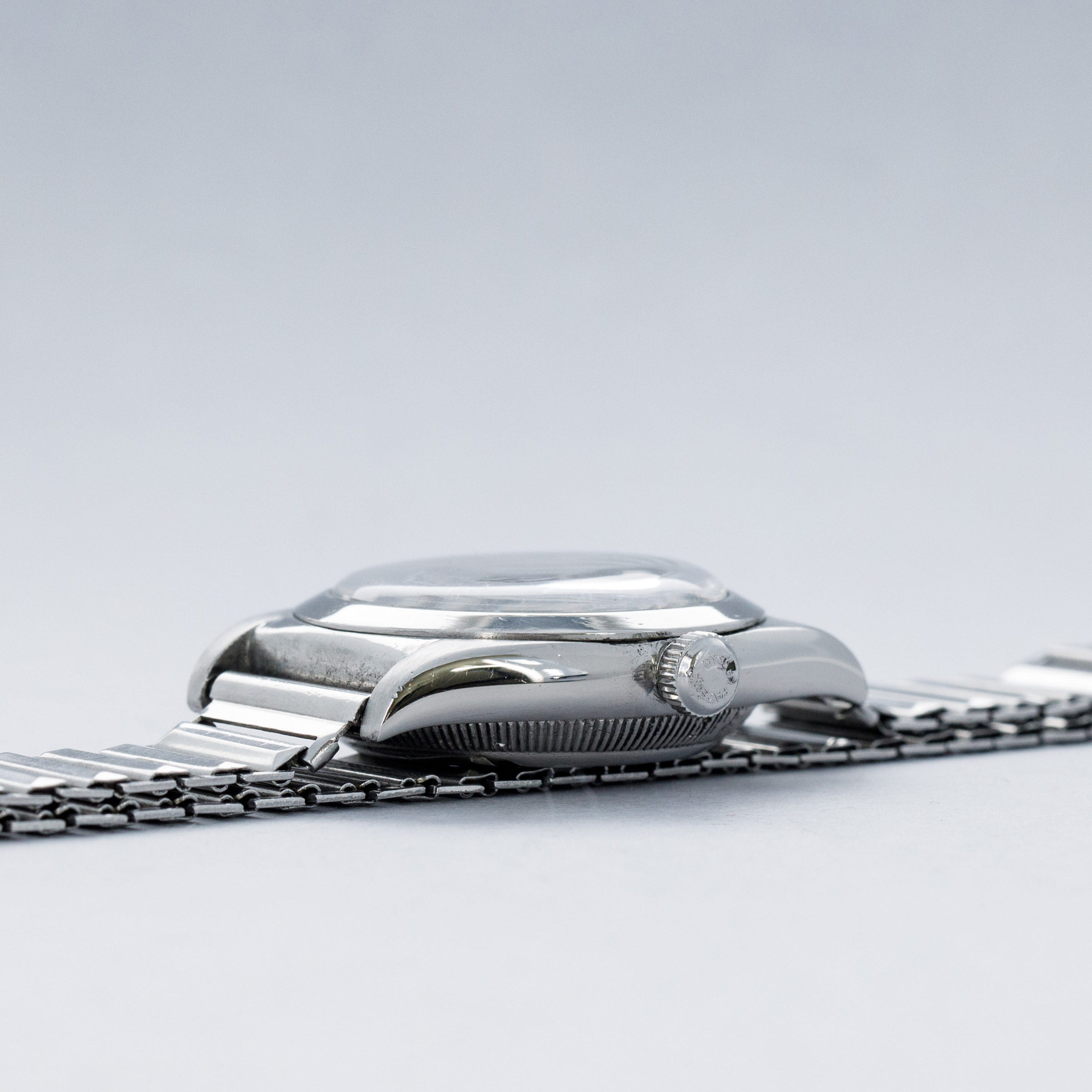 A beautifully designed watch with its understated flat bezel, bubbleback, expandable bracelet, and appealing salmon dial, this Rolex ref. 2764 will certainly make for a unique addition to any collection.
