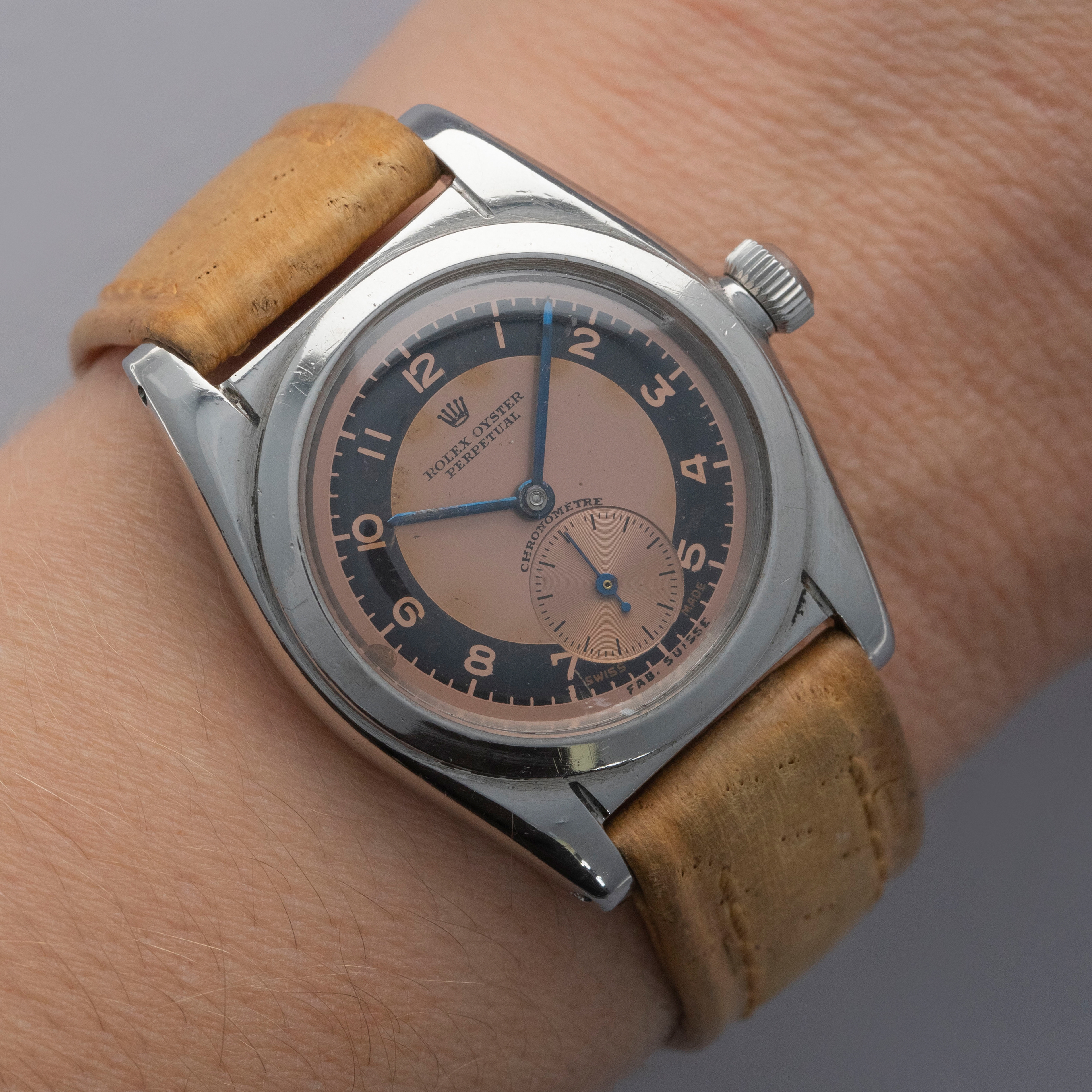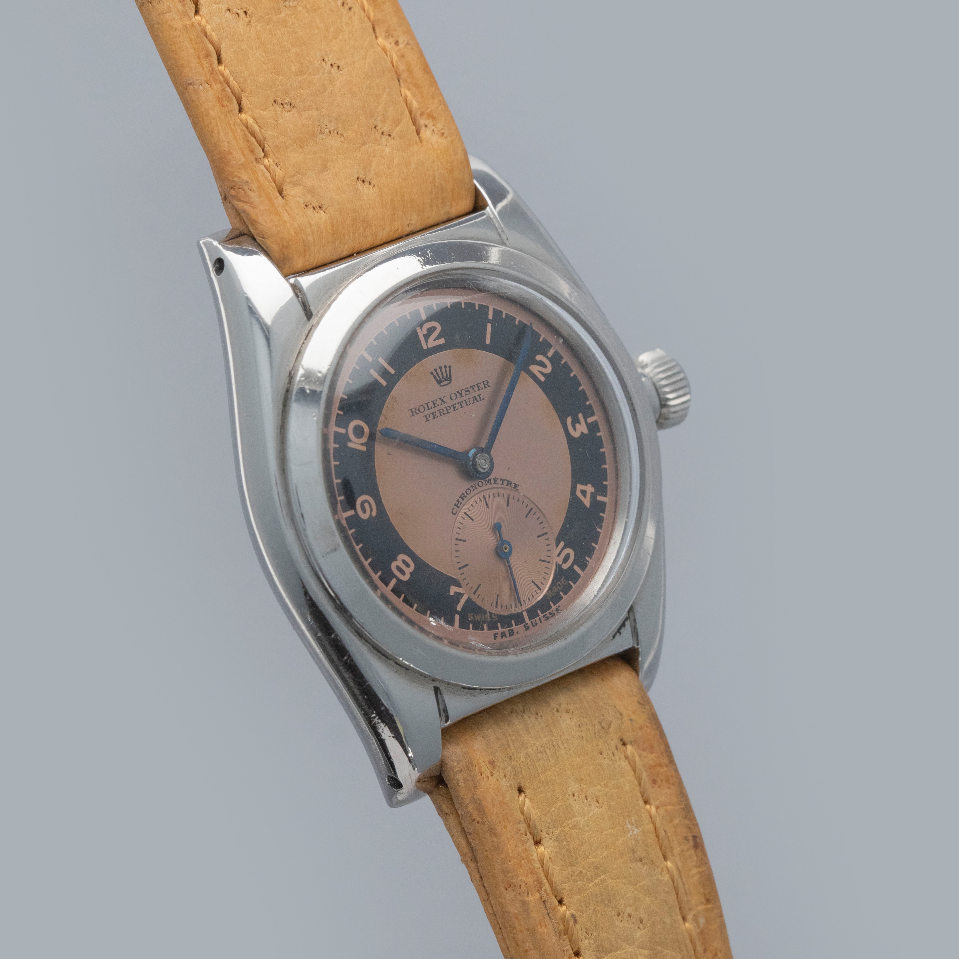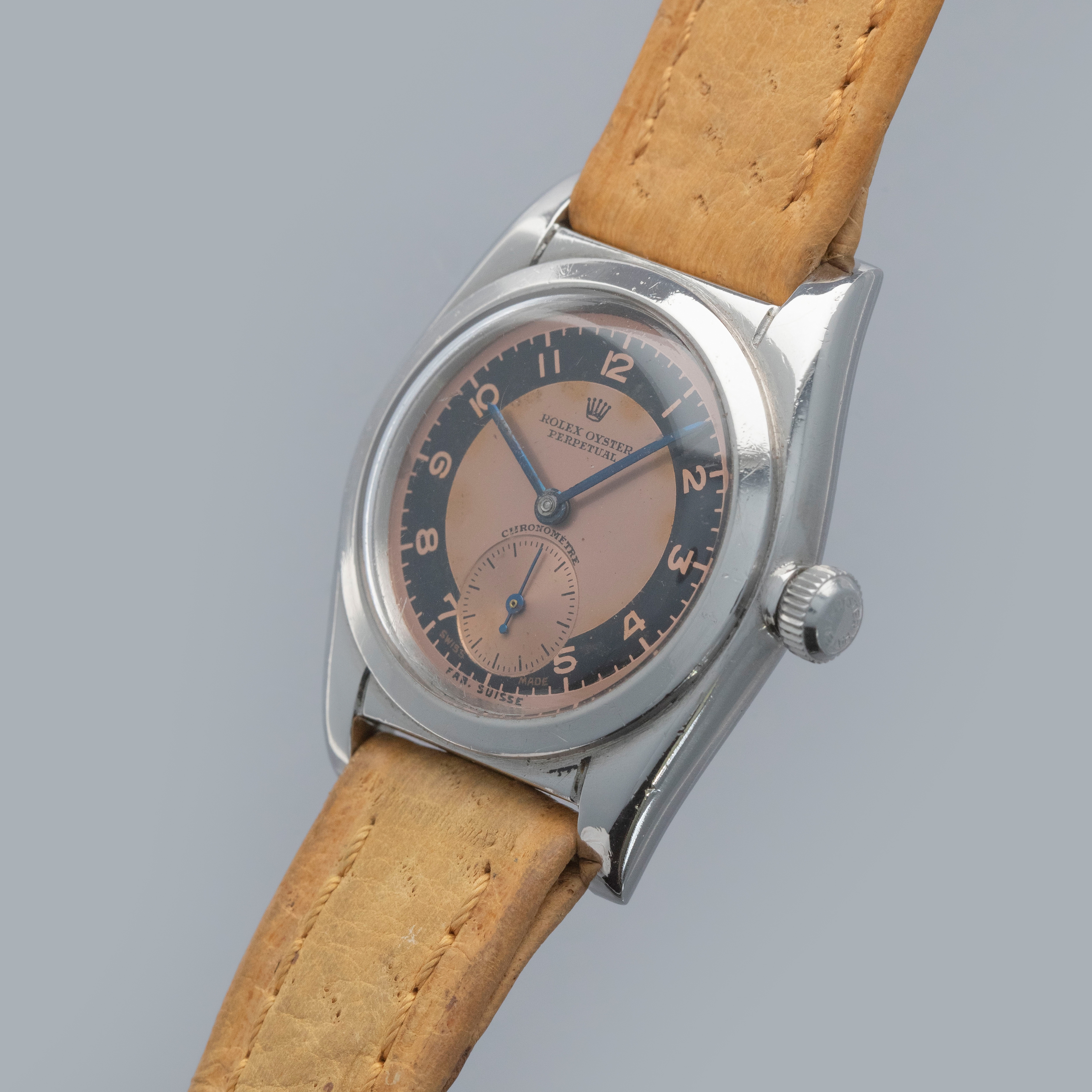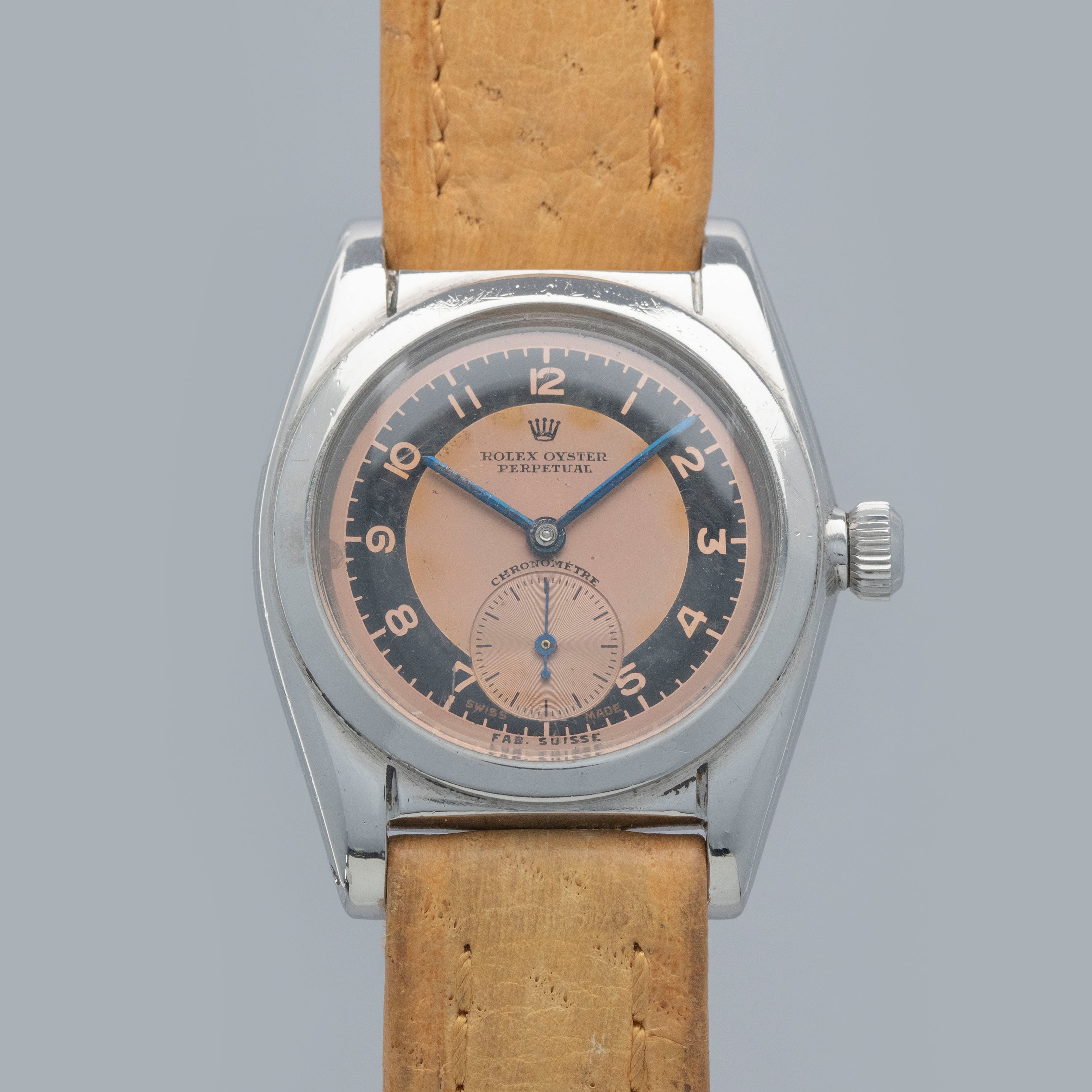 A beautifully designed watch with its understated flat bezel, retailer-engraved bubble caseback and appealing two-tone salmon and black dial, this Rolex ref. 2764 will certainly make for a unique addition to any collection.