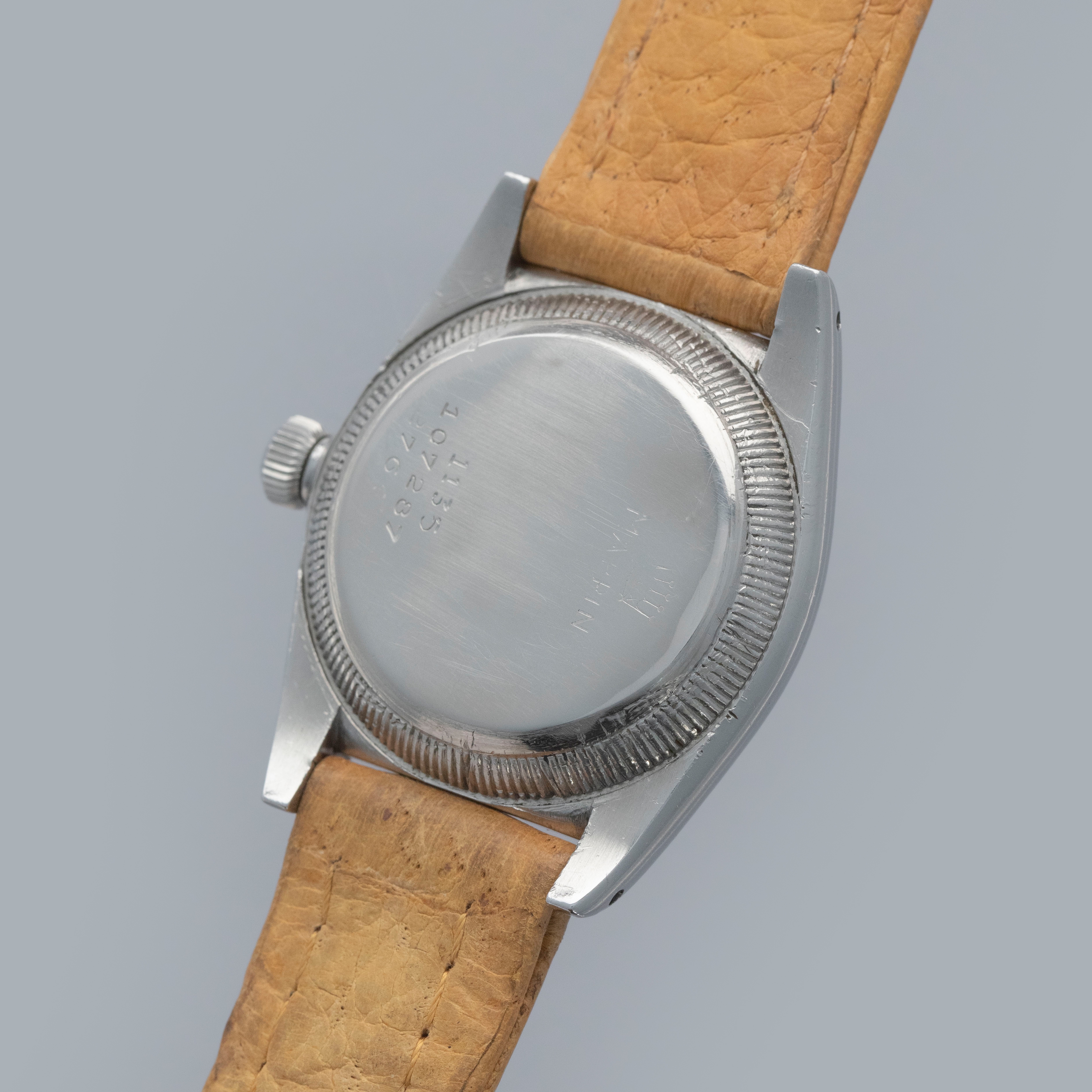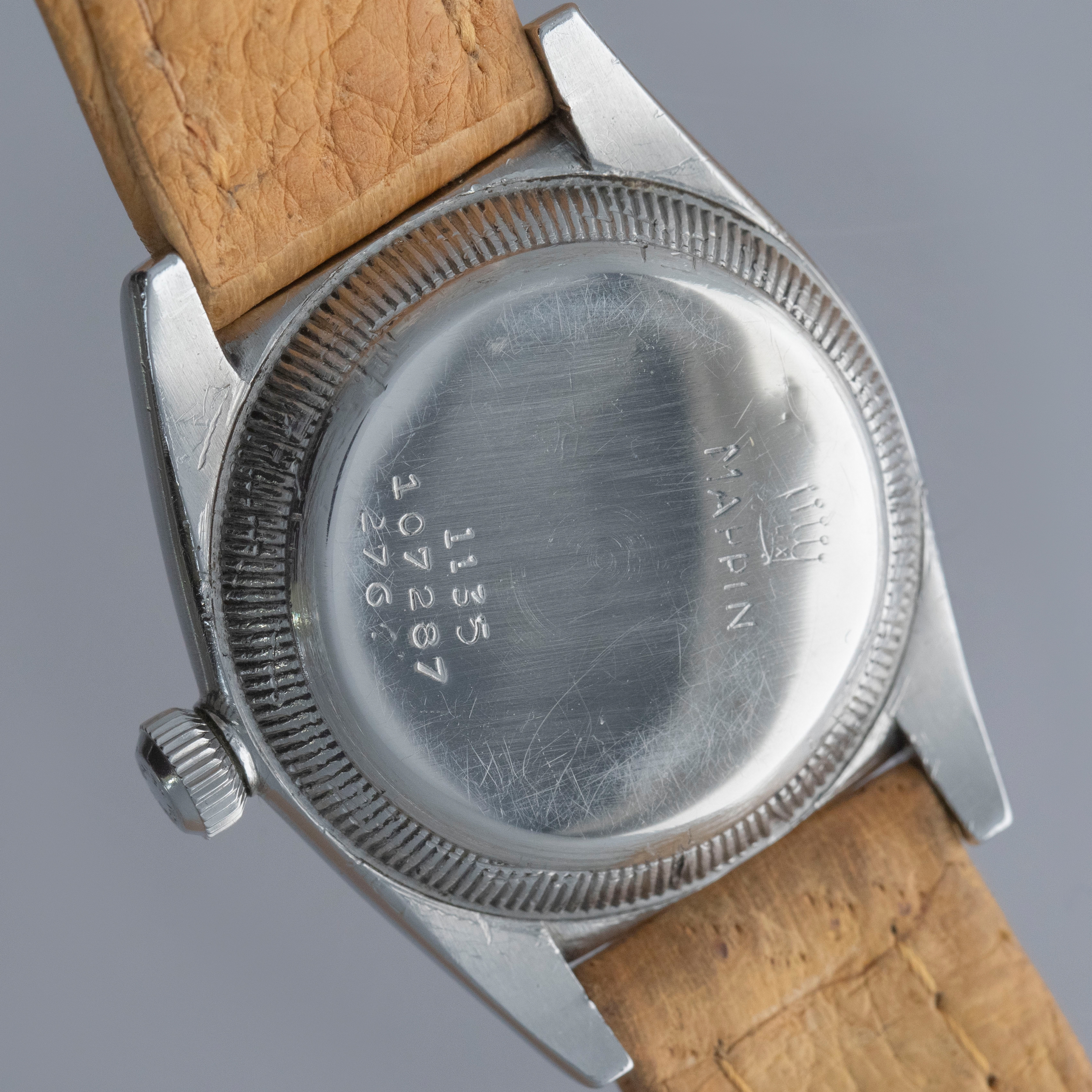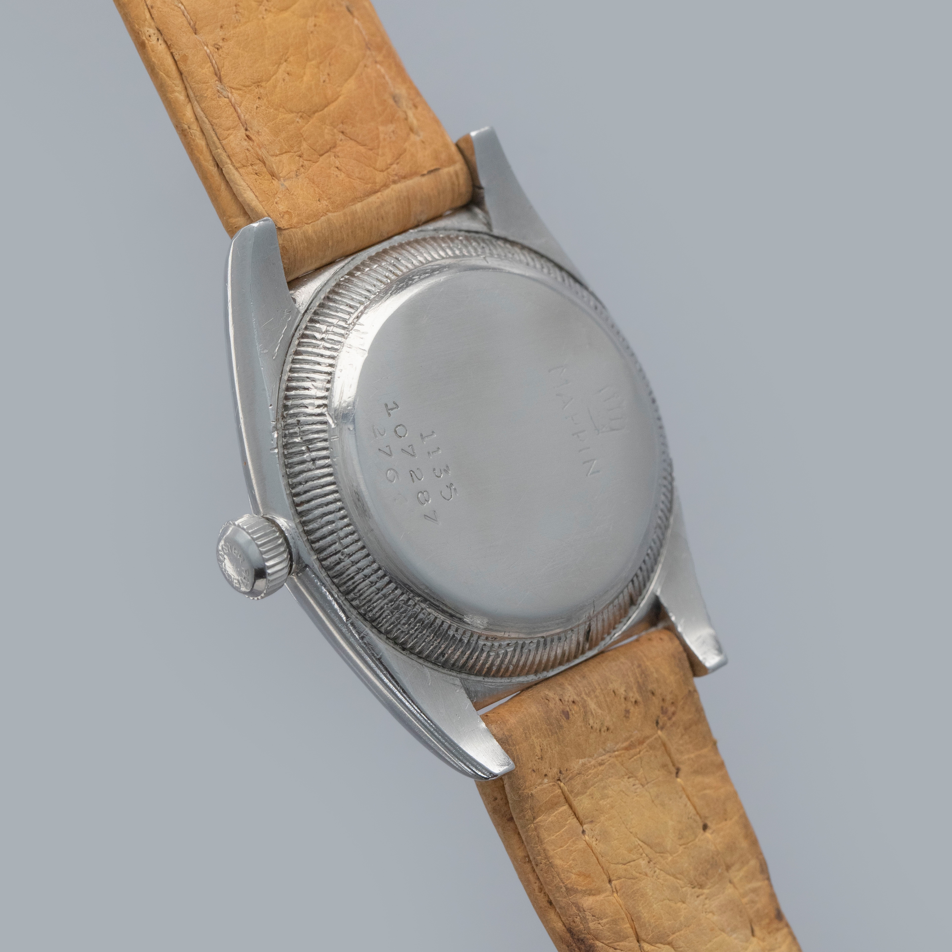 Watch is in overall very good condition. The steel case shows surface scratches and nicks, while the case back retains well-defined serial and reference stamps along with a still-legible Mappin engraving and stock number, with some wear and dings visible to the tool teeth. The watch retains its original Oyster Patent crown. The dial shows surface marks, oxidation and and some spotting in areas. The blued hands show some oxidation, and are original Rolex, but may have been changed at some point (this dial is typically seen with rose colored hands). It is fitted with a vintage Rolex leather strap and a steel Rolex pin buckle. Please note that the watch ticks at time of cataloging, but timekeeping is poor and a service is recommended.