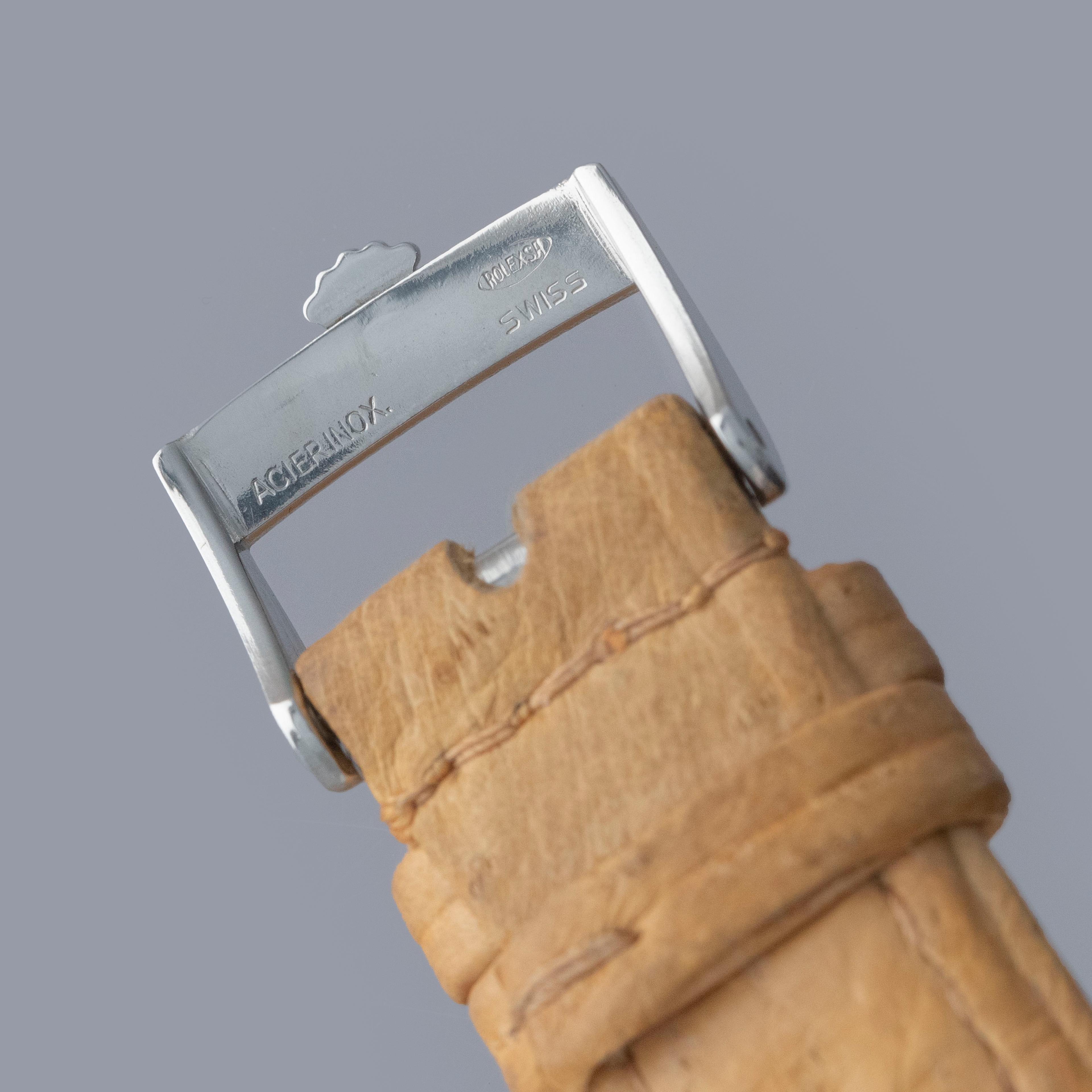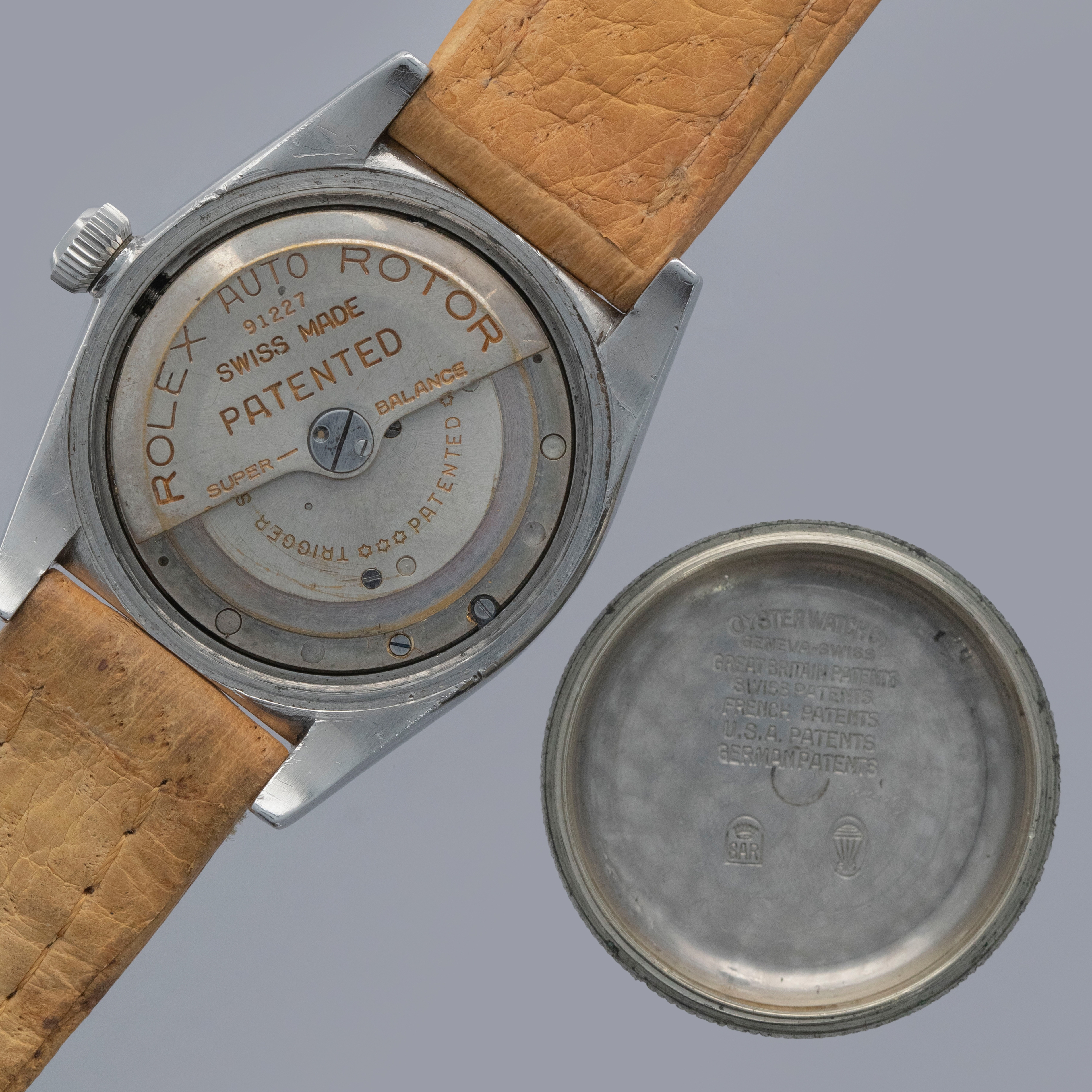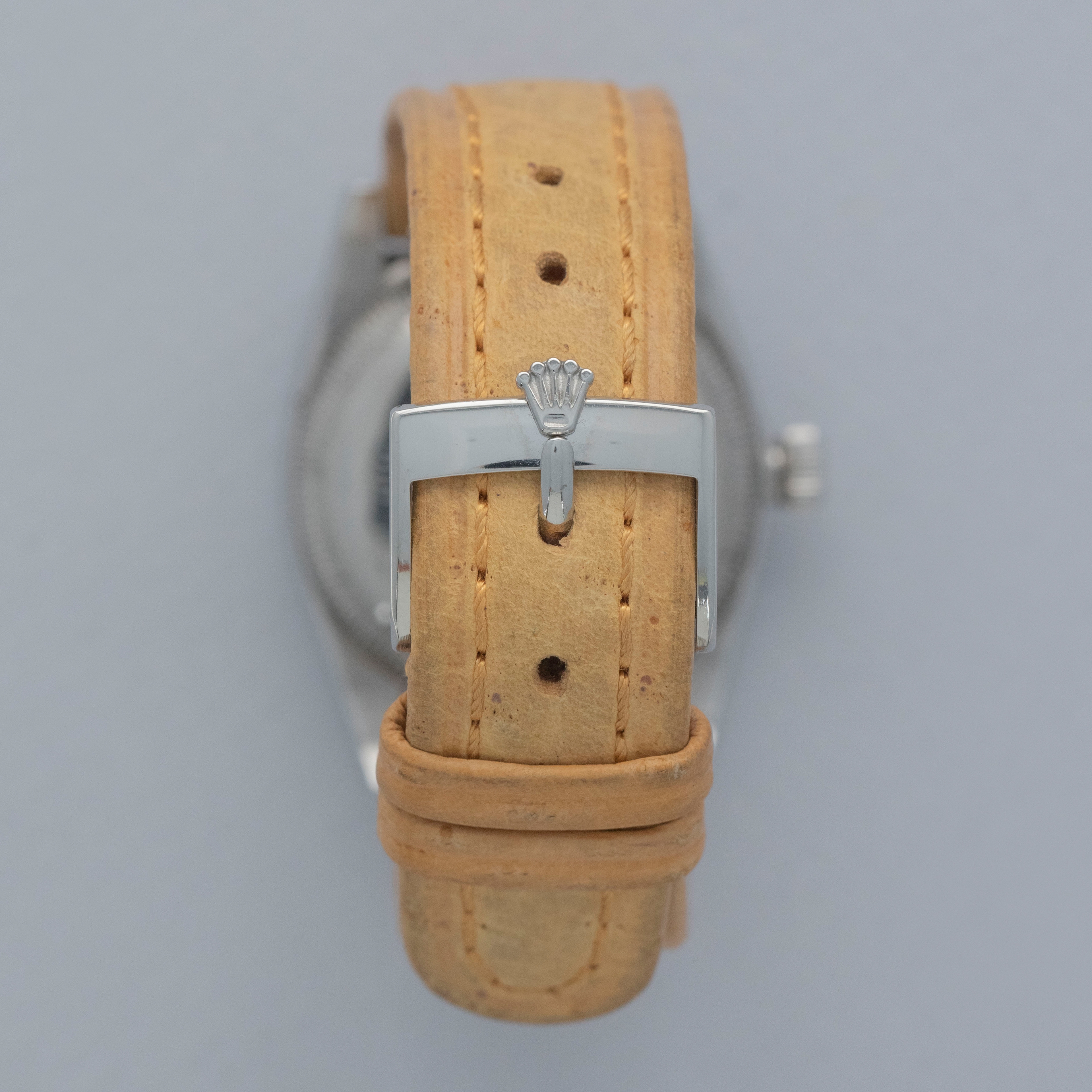 Watch is in overall very good condition. The steel case shows surface scratches and nicks, while the case back retains well-defined serial and reference stamps along with a still-legible Mappin engraving and stock number, with some wear and dings visible to the tool teeth. The watch retains its original Oyster Patent crown. The dial shows surface marks, oxidation and and some spotting in areas. The blued hands show some oxidation, and are original Rolex, but may have been changed at some point (this dial is typically seen with rose colored hands). It is fitted with a vintage Rolex leather strap and a steel Rolex pin buckle. Please note that the watch ticks at time of cataloging, but timekeeping is poor and a service is recommended.
