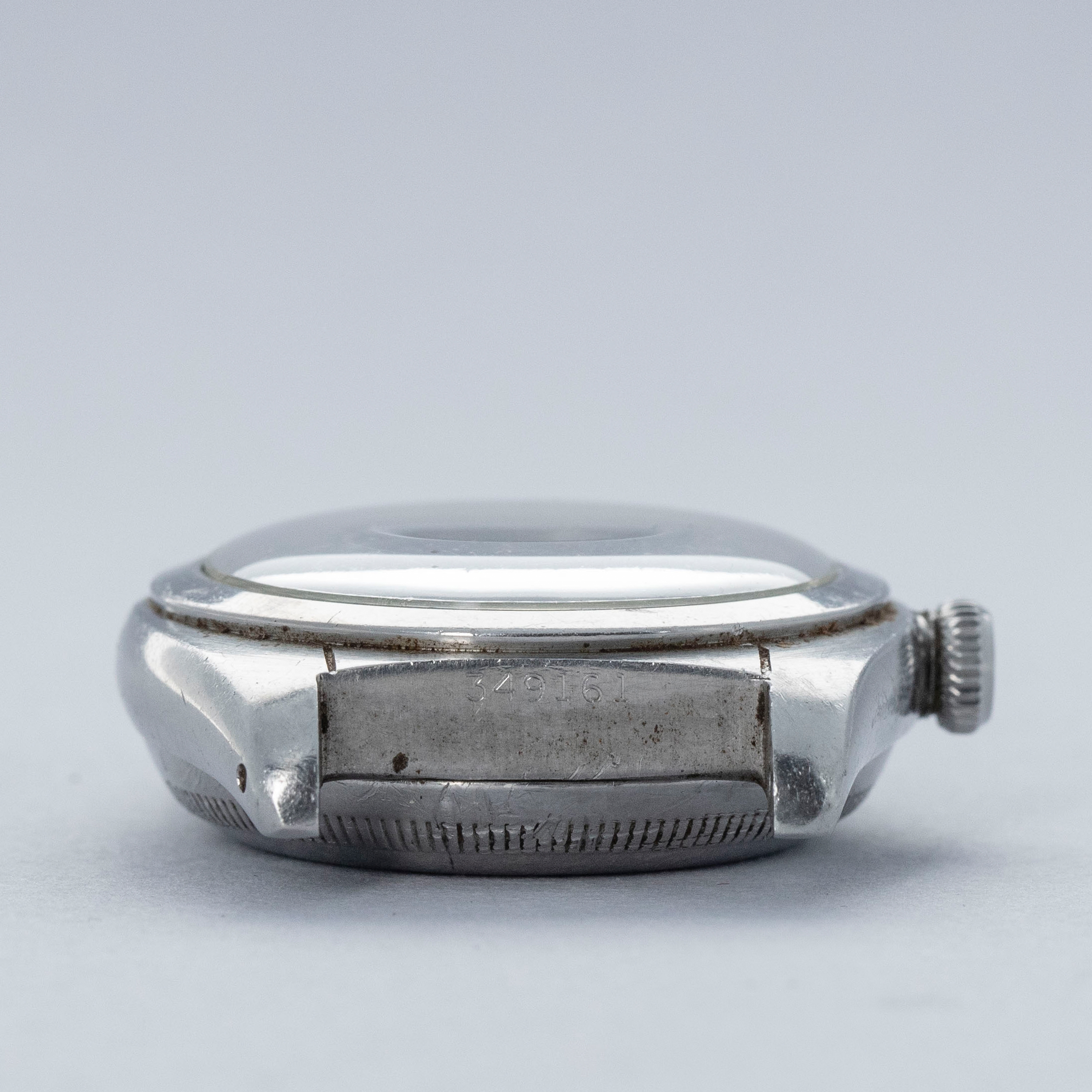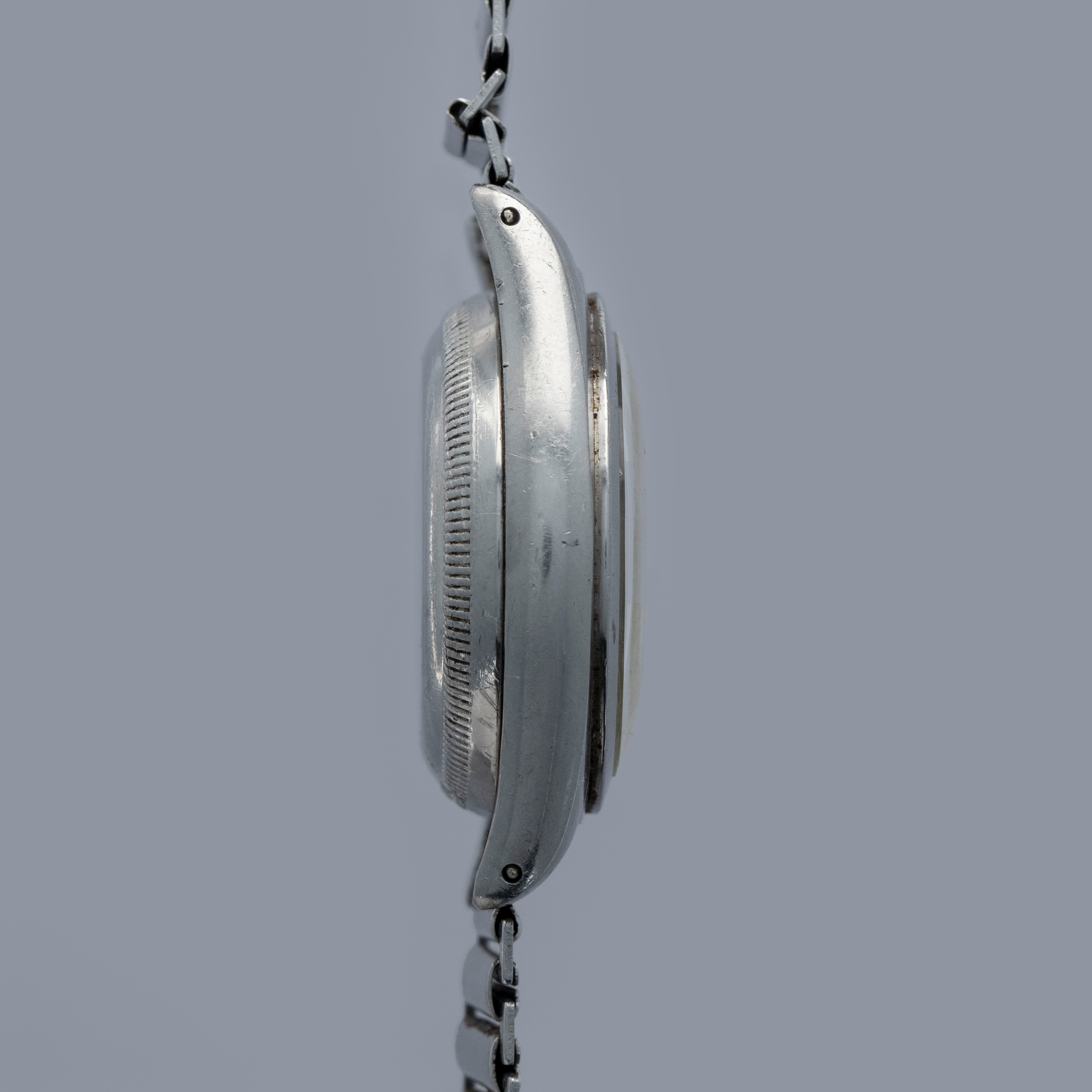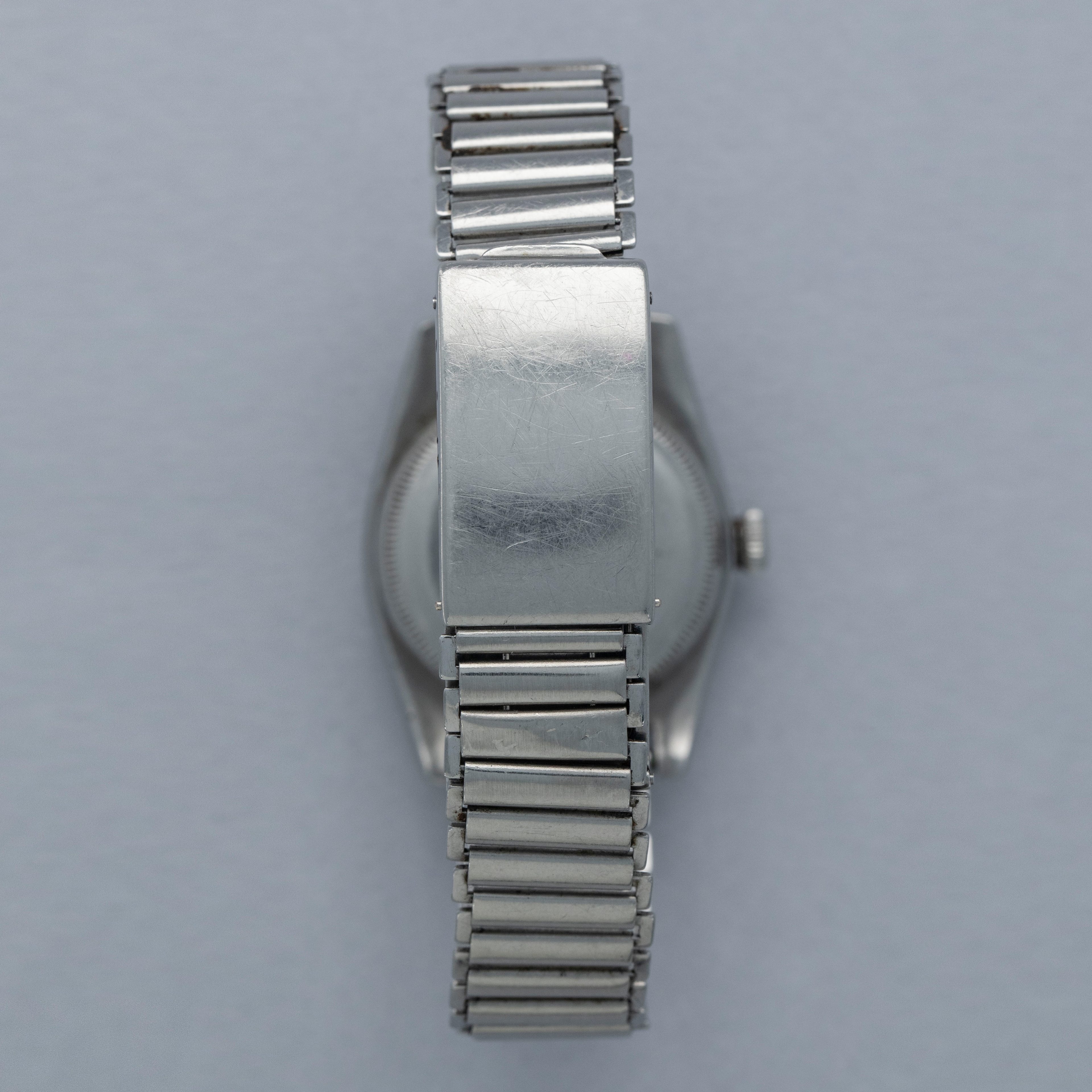 Watch is in overall excellent vintage condition. The steel case shows surface scratches and dings consistent with age, while the case back displays nicks and damage to some of the teeth and retains a well-defined stamp. Serial number between the lugs is crisp and fully legible. There is a 4 digit number lightly engraved along the edge of the caseback. The watch still features its original rare winding crown. The dial shows some surface marks but remains in excellent condition, while the hands display damage to the lume and some oxidation. It is fitted with a Bonklip-style steel bracelet showing surface scratches and some play between the links.