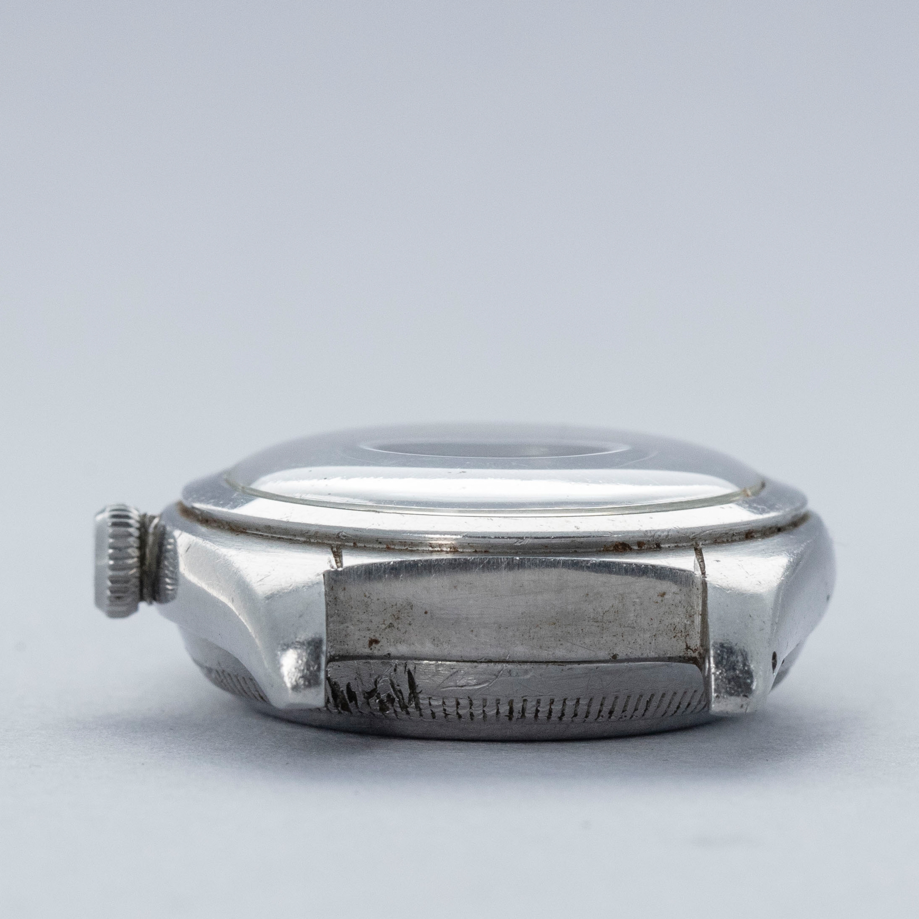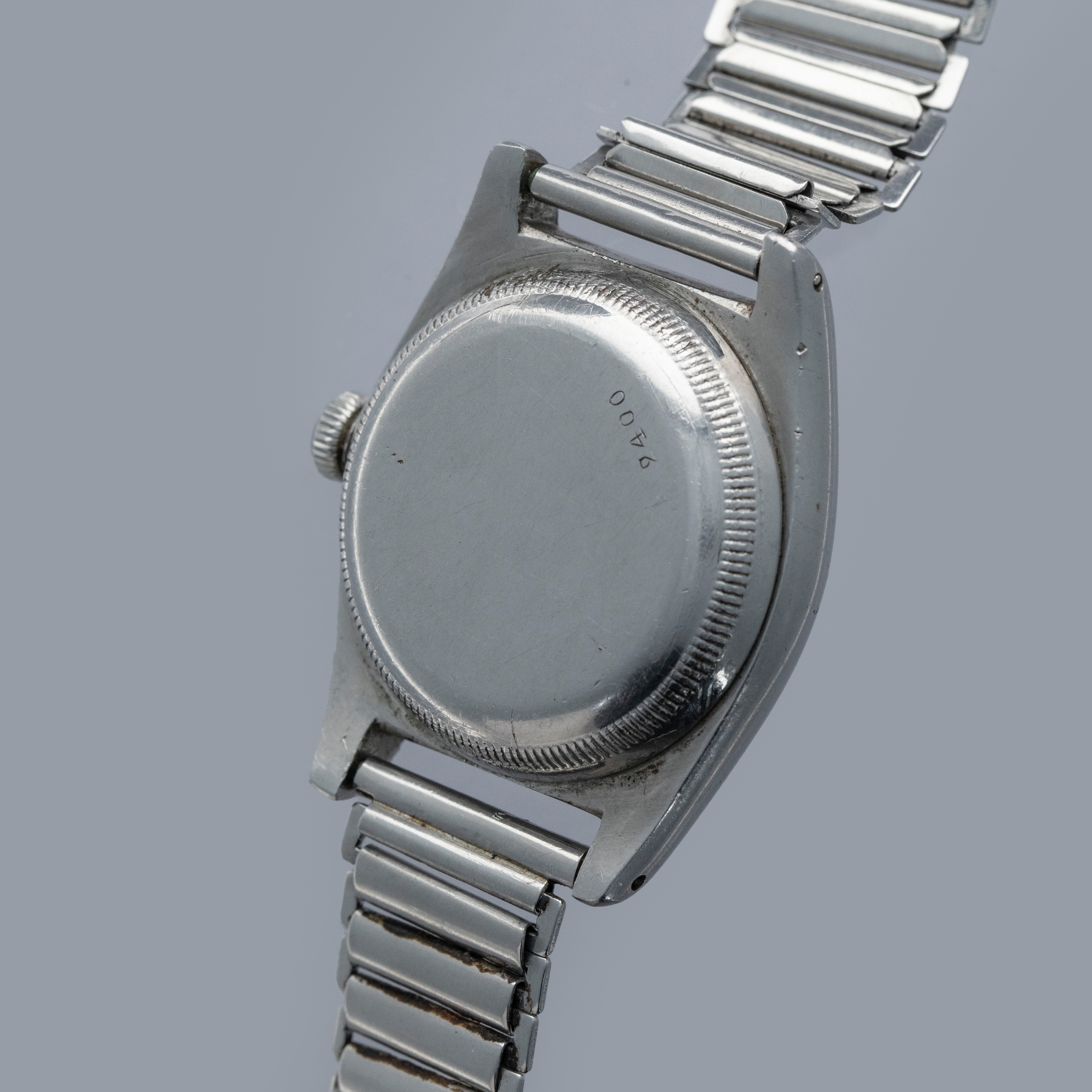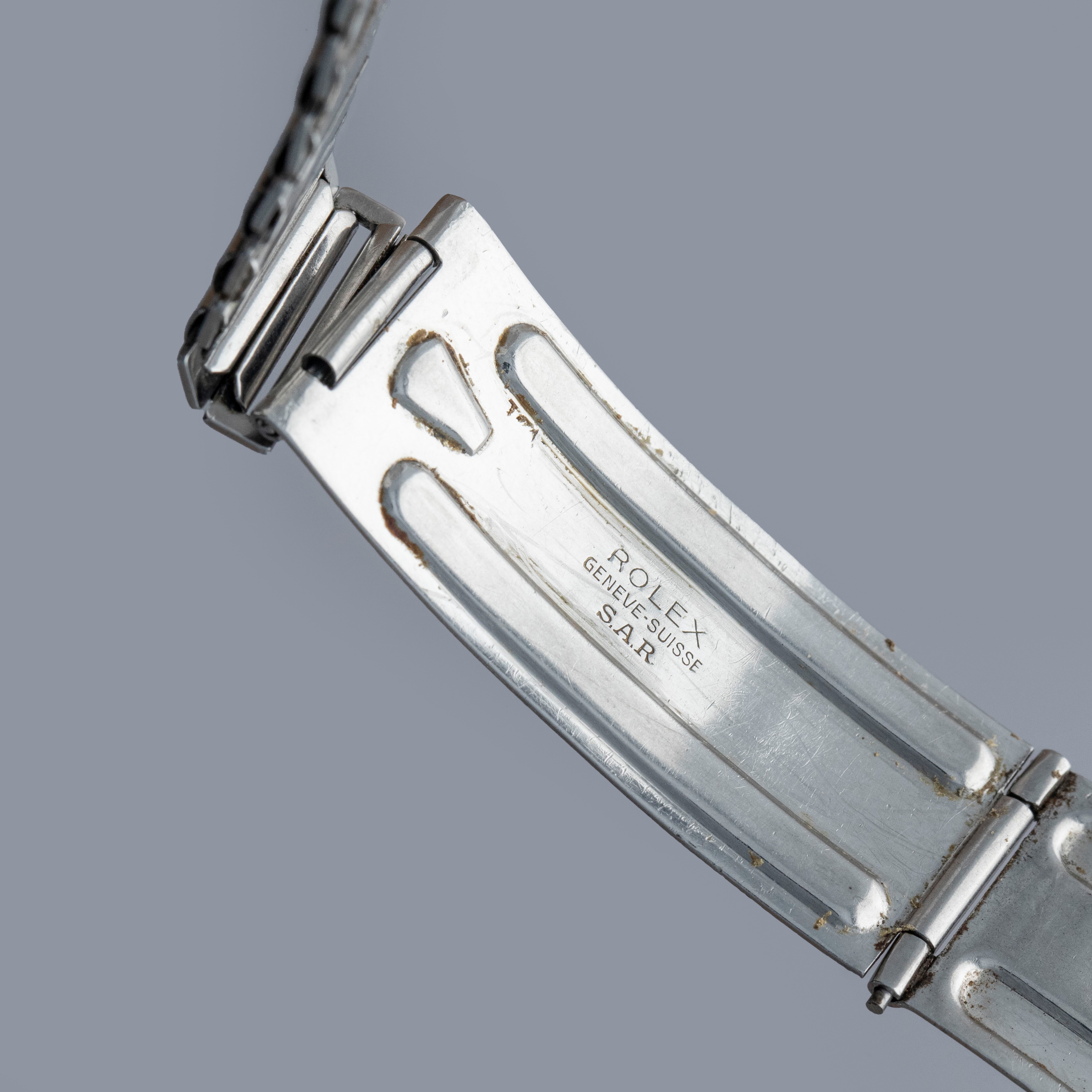 Watch is in overall excellent vintage condition. The steel case shows surface scratches and dings consistent with age, while the case back displays nicks and damage to some of the teeth and retains a well-defined stamp. Serial number between the lugs is crisp and fully legible. There is a 4 digit number lightly engraved along the edge of the caseback. The watch still features its original rare winding crown. The dial shows some surface marks but remains in excellent condition, while the hands display damage to the lume and some oxidation. It is fitted with a Bonklip-style steel bracelet showing surface scratches and some play between the links.
