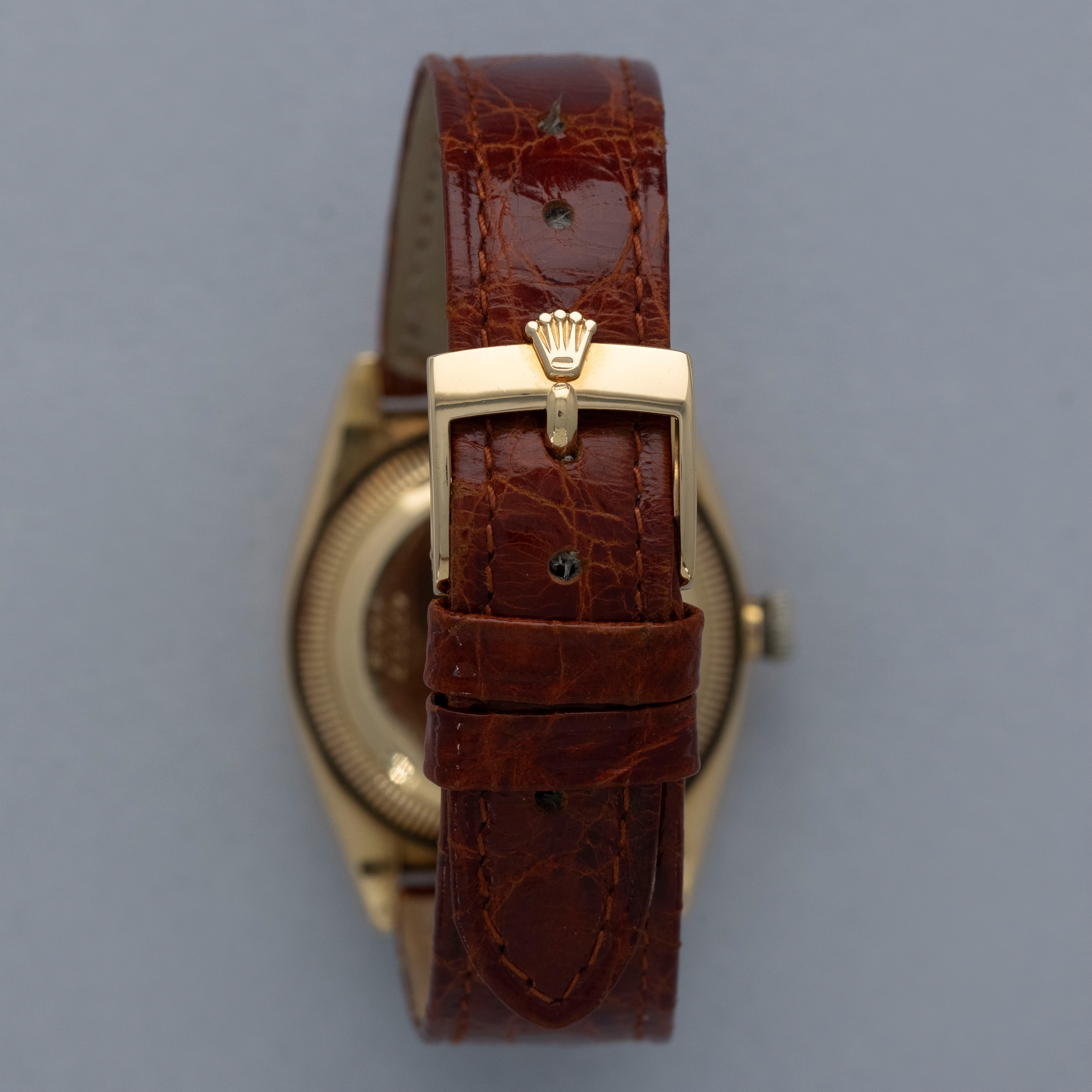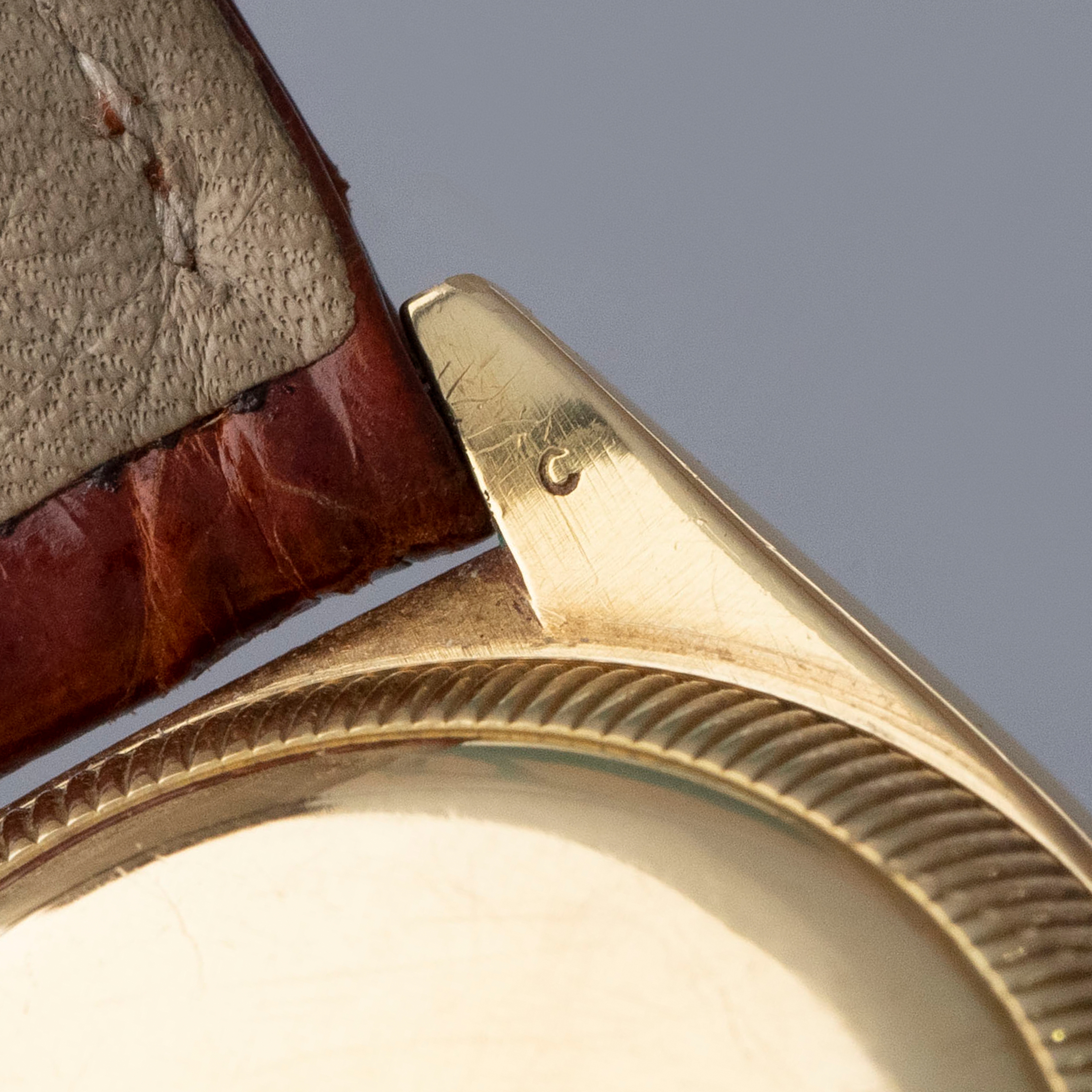 Watch is in overall very good condition. The yellow gold case shows numerous surface scratches and small nicks consistent with age, with a still-legible stamp visible on the rear of the top left lug. The case back retains well-defined reference and serial number stamps. The original winding crown remains present, though much of the finish has worn away. The dial shows marks and degradation across the surface, with the lume having aged to a very dark hue. The blued hour and minute hands appear to have been relumed, while the gold-toned seconds hand shows light spotting. It is fitted with an alligator strap and a gold-plated Rolex pin buckle. Please note that the watch ticks at time of cataloging, but timekeeping is poor and a service is recommended.