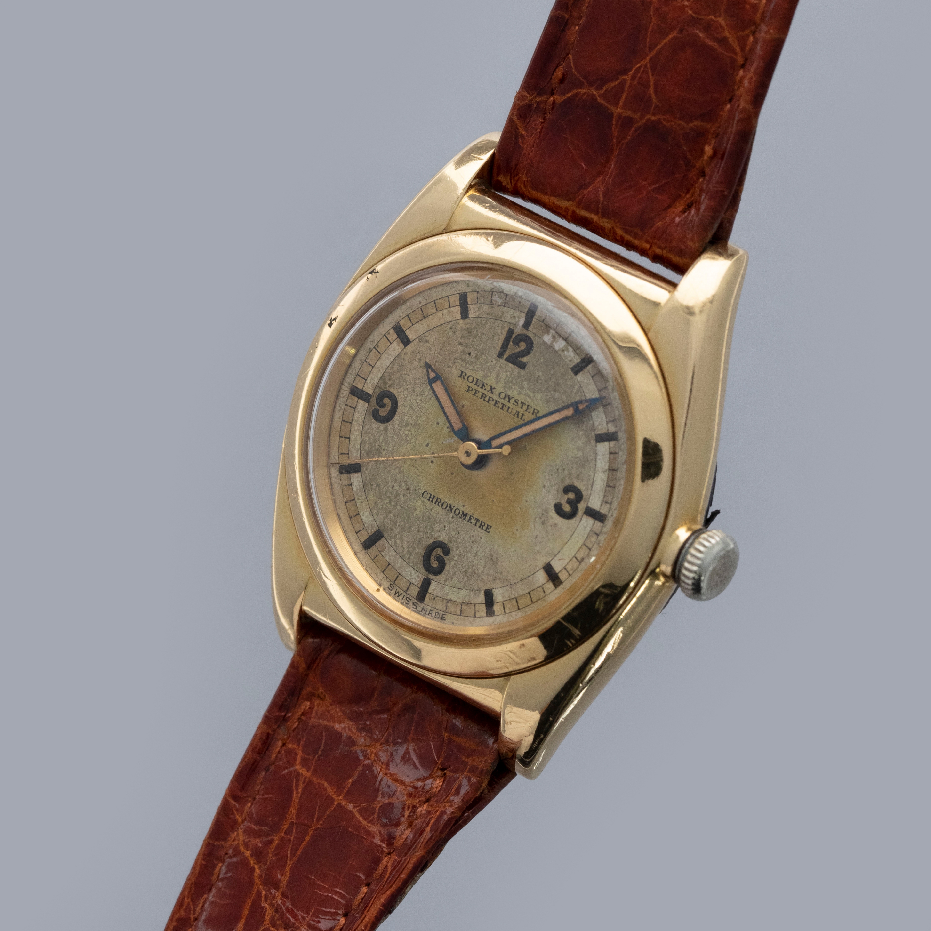 Featuring a stunningly well-aged silver dial that has turned champagne over the decades, this example's radium quarter Arabic dial is a wonderful reminder of where watchmaking was in the 1930s and 1940s.