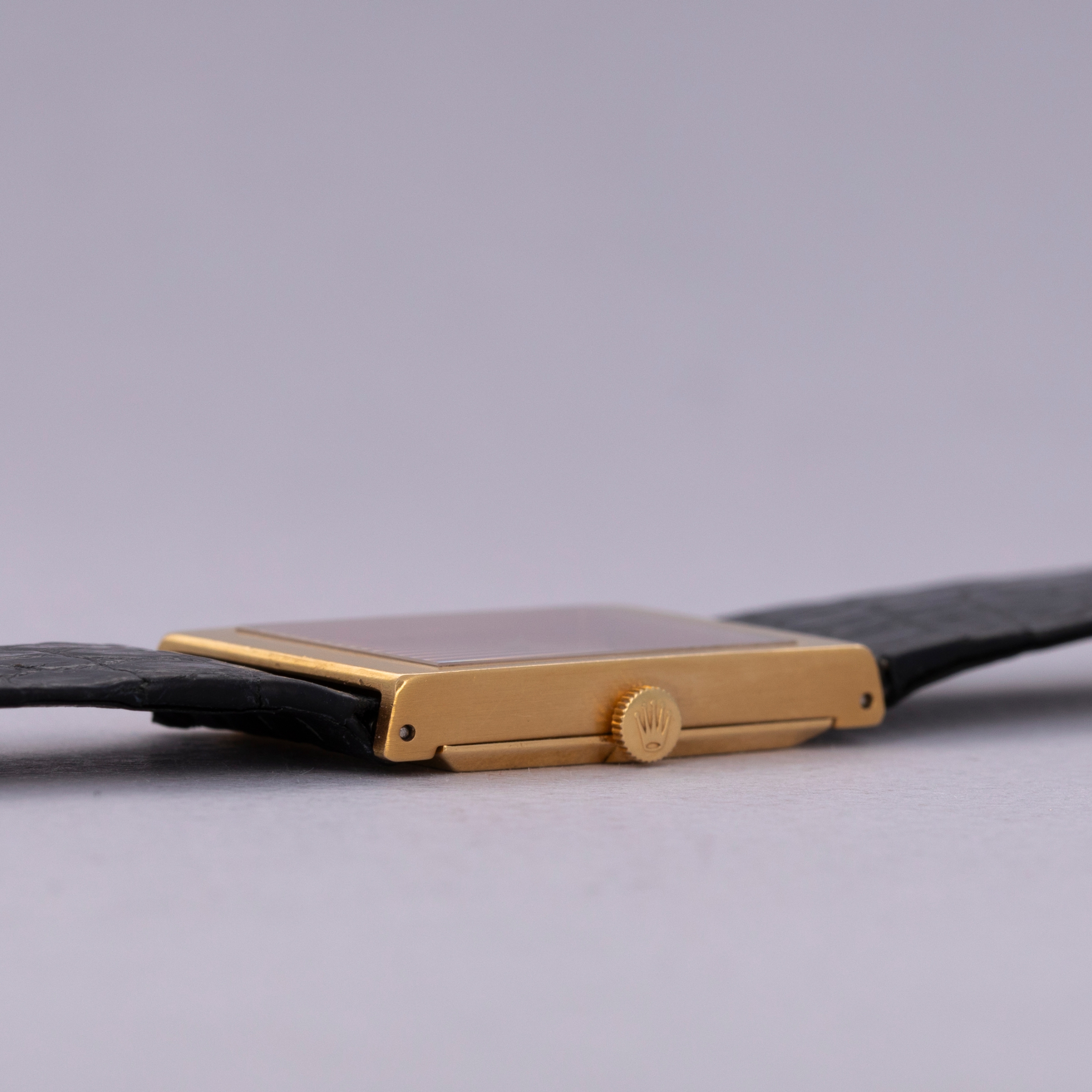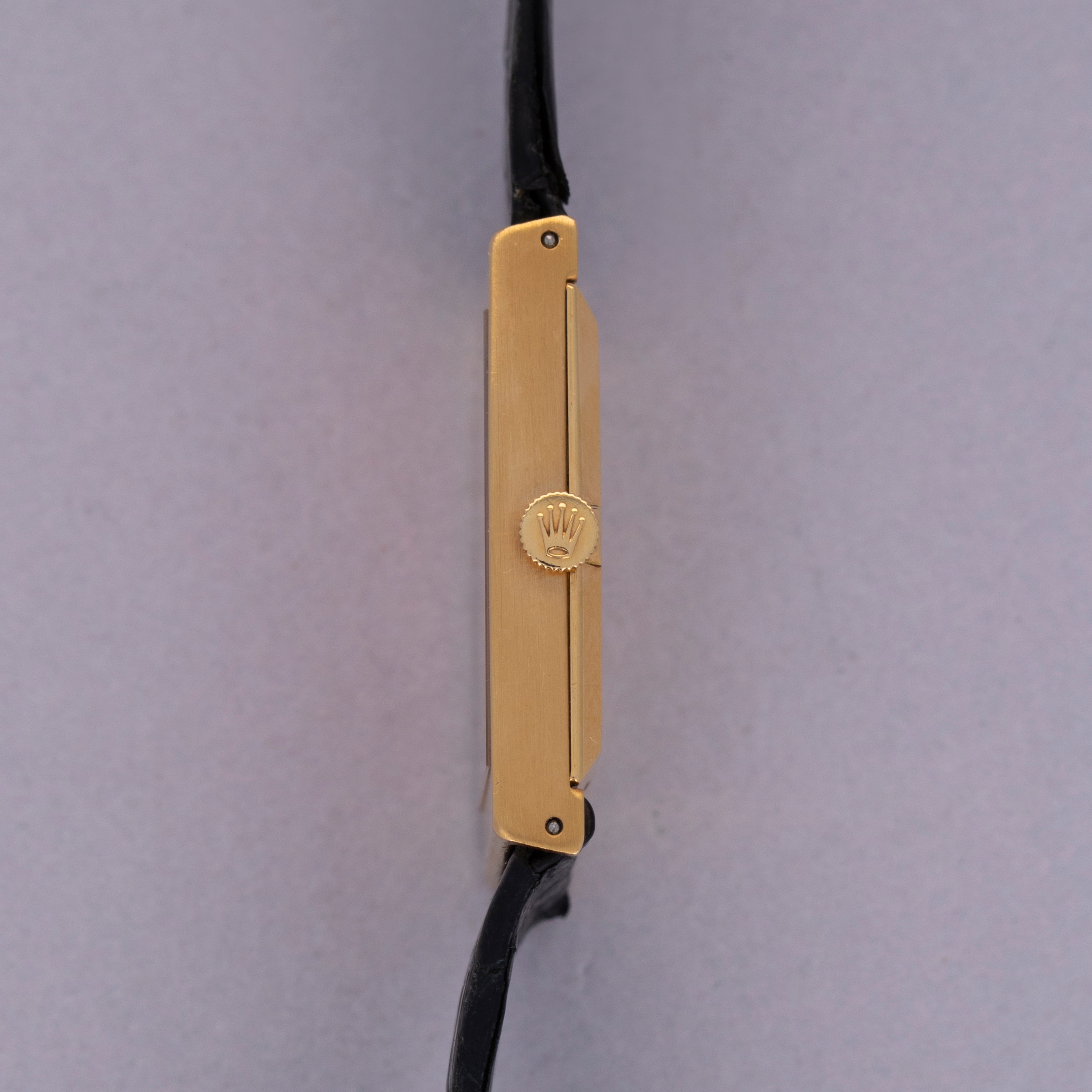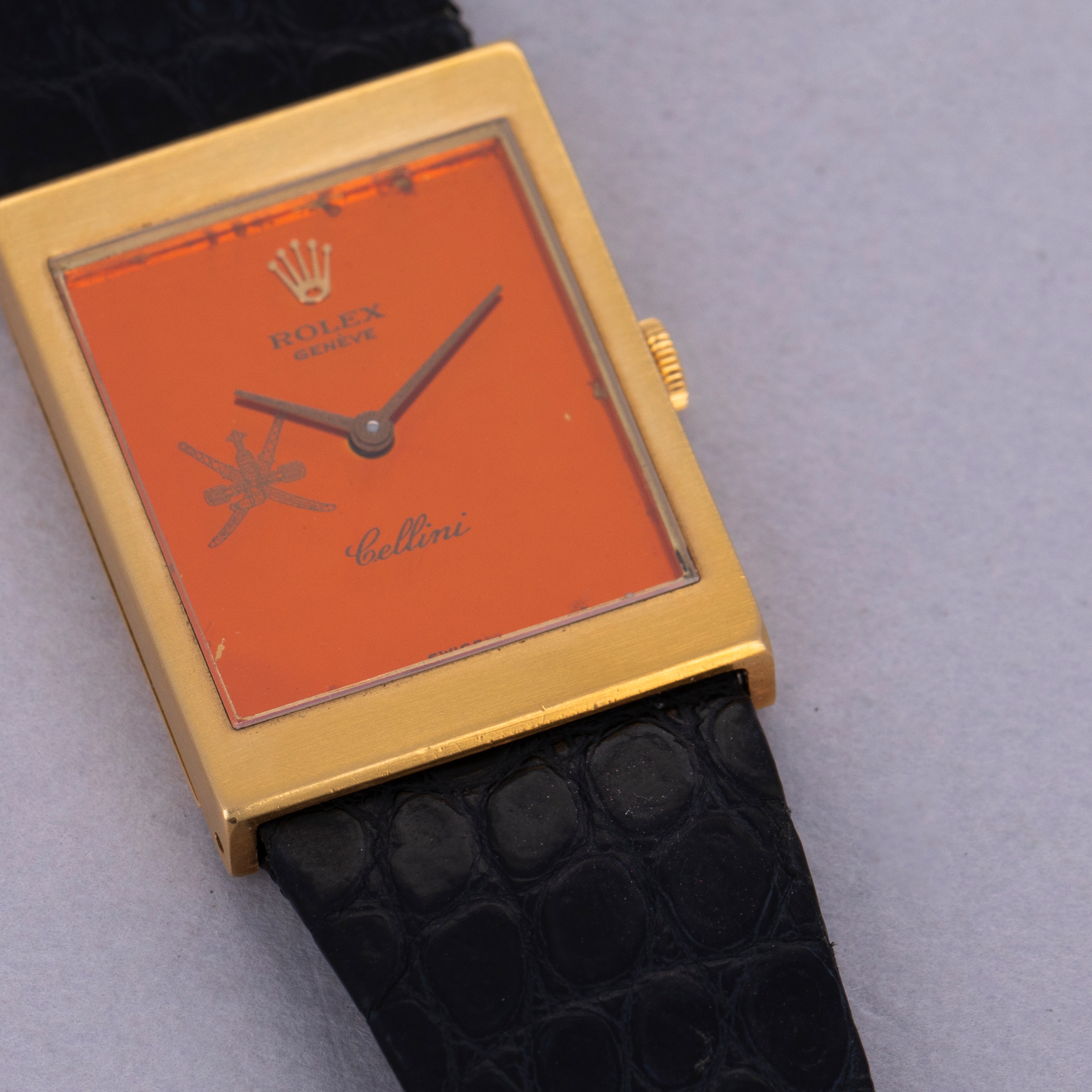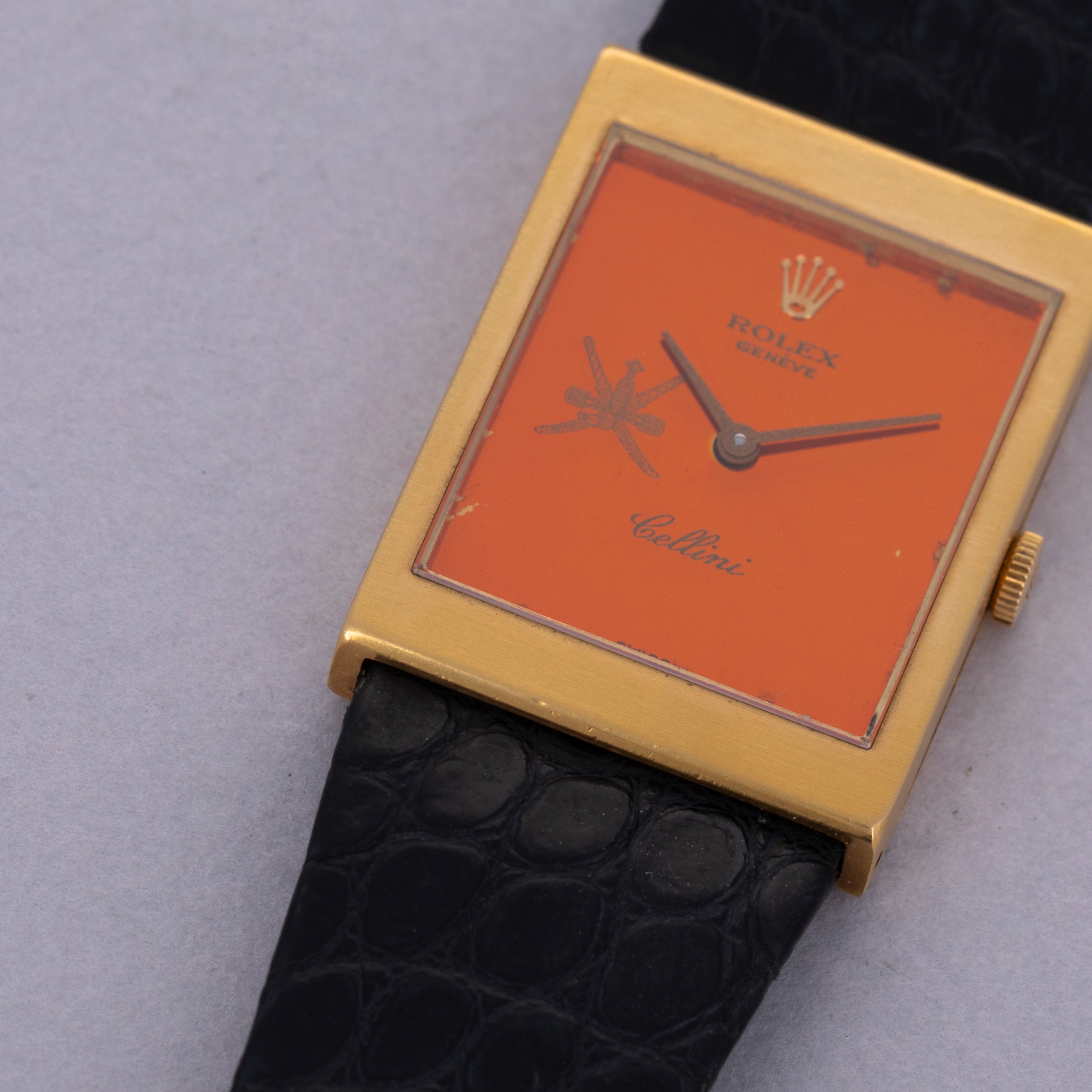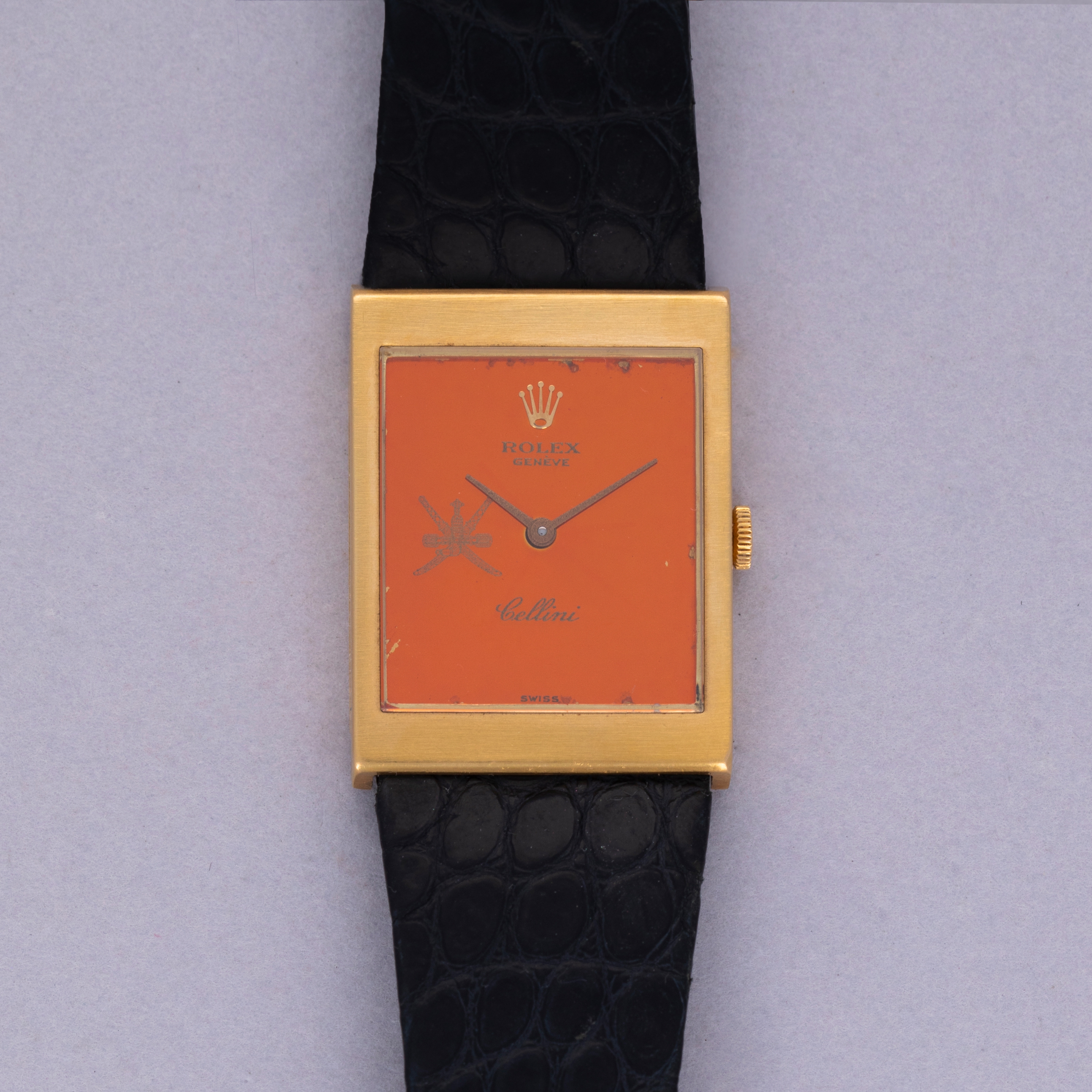 Launched in 1968 and stemming from Rolex’s acceptance of the idea that some of their customers would like to own a second watch, the Rolex Cellini collection is perhaps one of the brand’s most widely varied collections, with round leather strapped dress watches to oval shaped watches and tonneau-shaped pieces on integrated bracelets to rectangular-shaped dress watches like the Cellini ref. 4014 that we have here. Featuring an 18kt yellow gold rectangular case, the ref. 4014 is an unusual timepiece given Rolex’s typically reserved design language and the ref. 4014’s aesthetic similarity to watches like the Tank. Featuring a metallic finish dial in orange, this particular example lacks any hour markers or dial furniture that could be used to tell the time besides its applied Rolex coronet at 12 o’clock. However, marking it as a special piece indeed, this example does feature the Khanjar dagger at 9 o’clock, which designates this watch as belonging to the Sultanate of Oman after it was special ordered from Rolex by the Omani Royal Family to then be gifted or kept in the Royal Family’s collection.