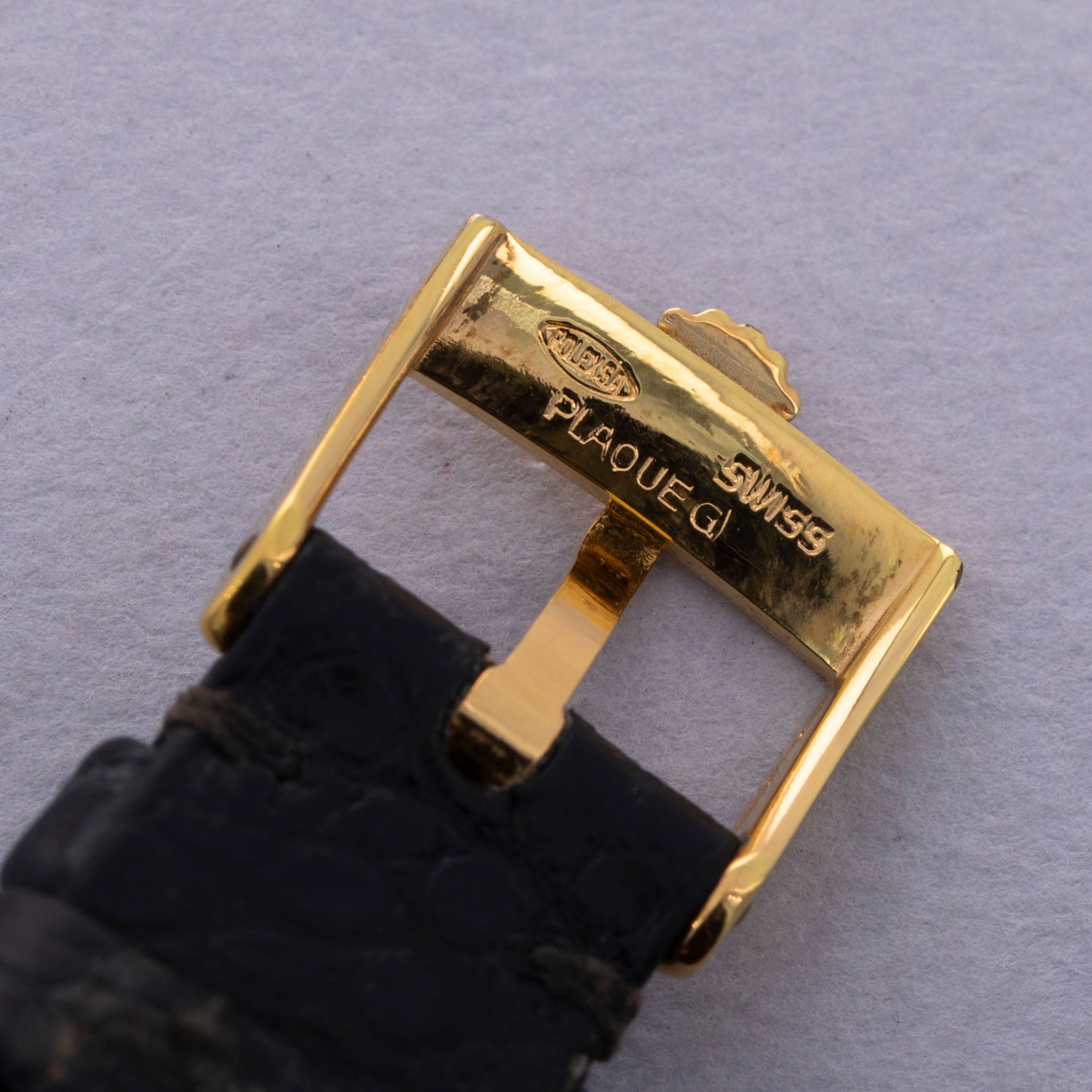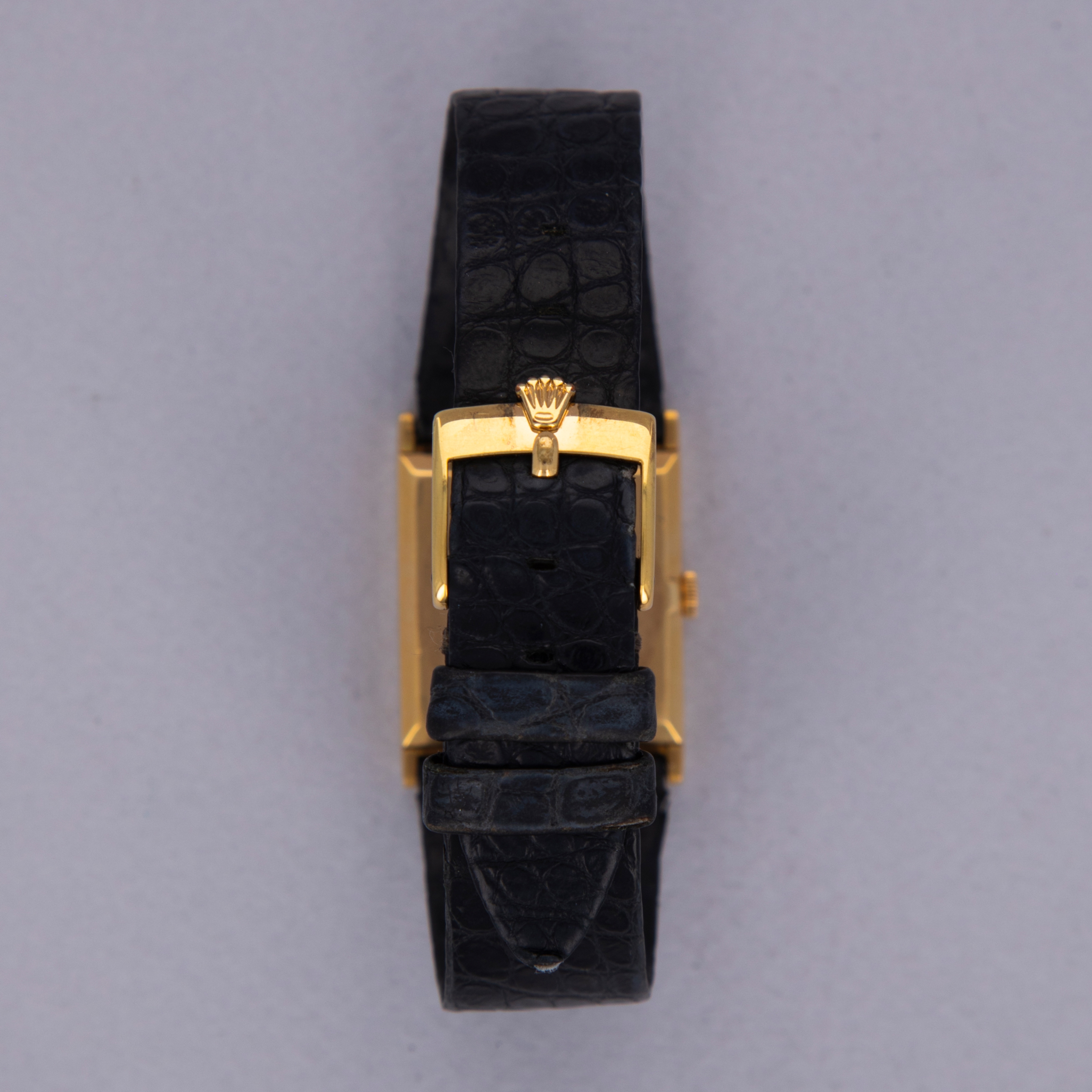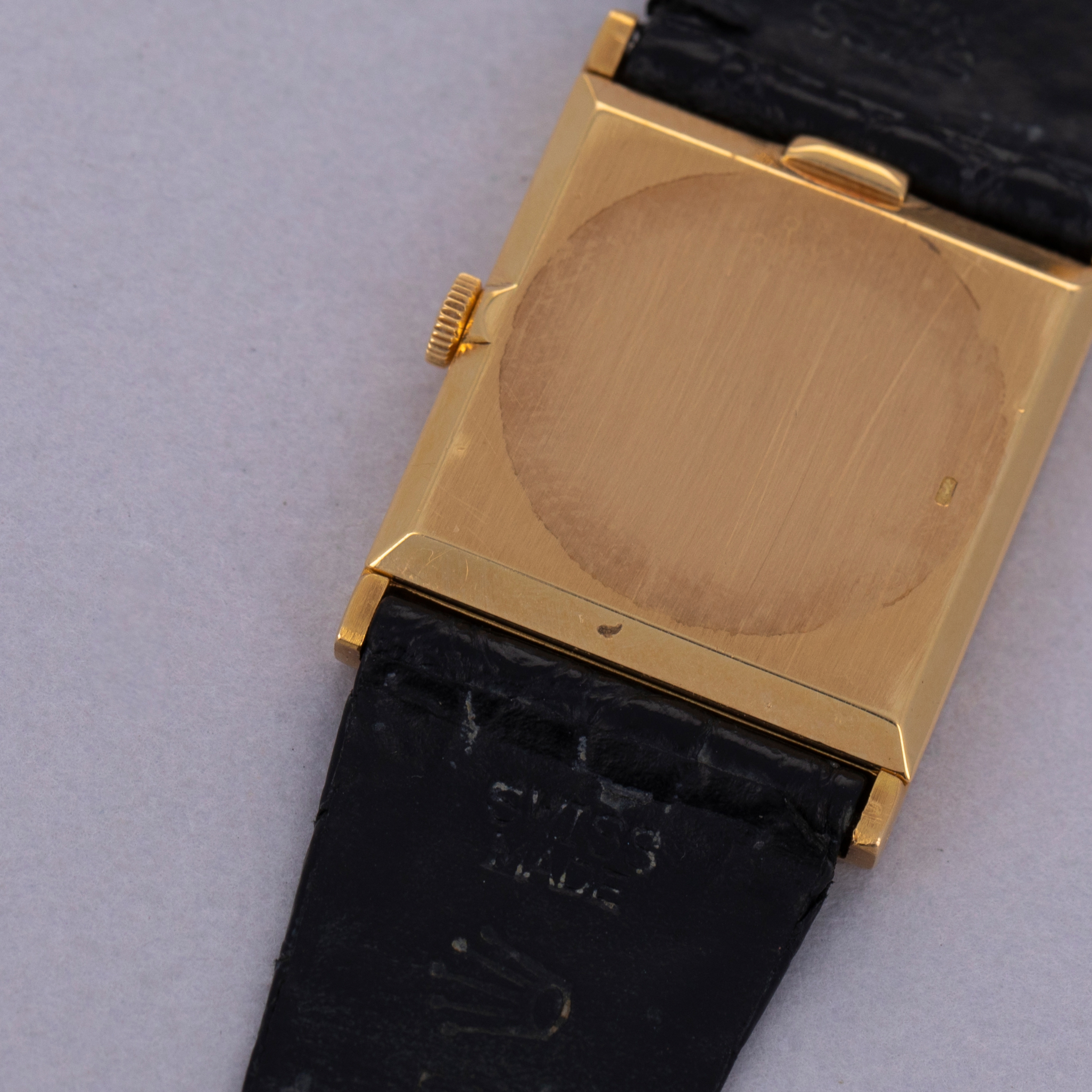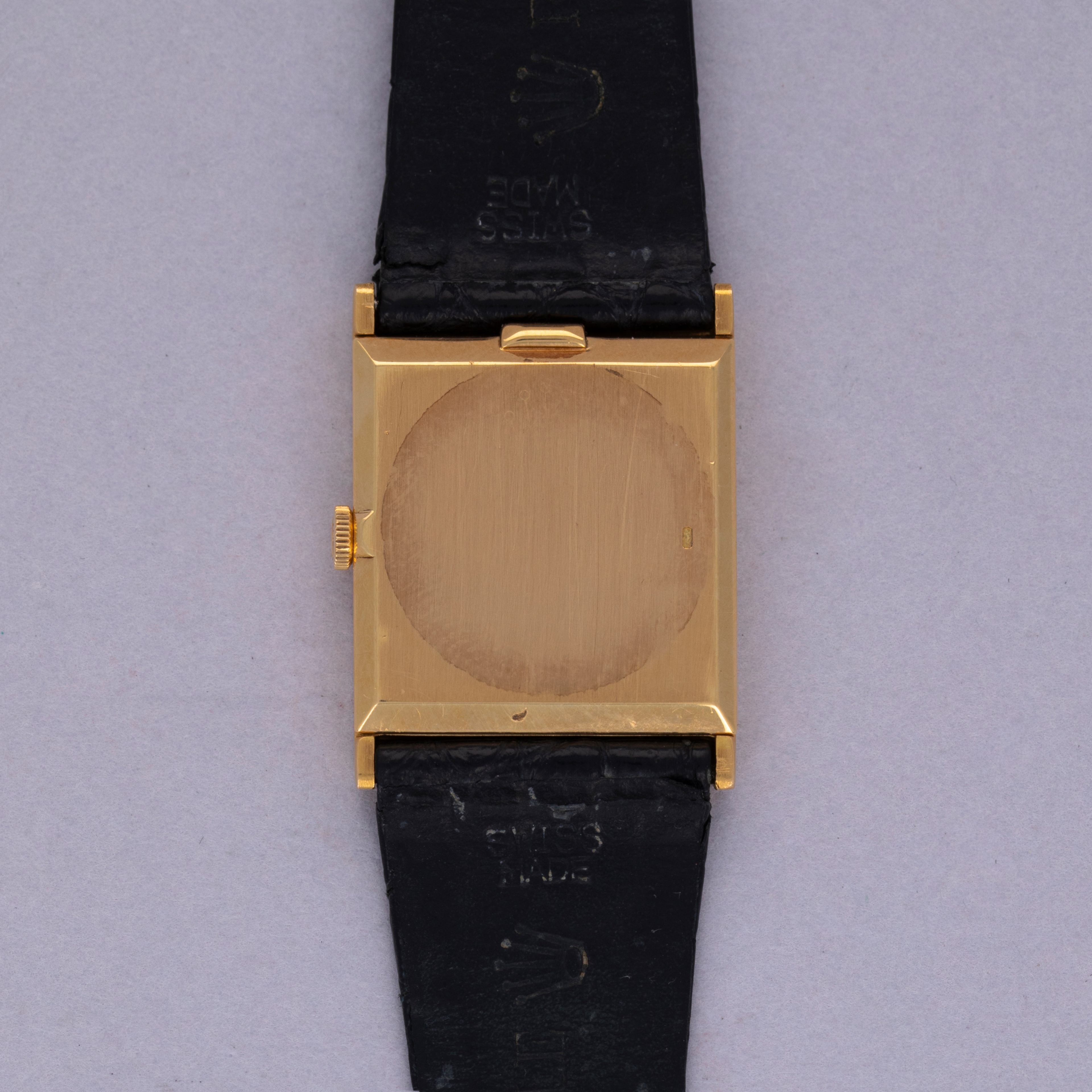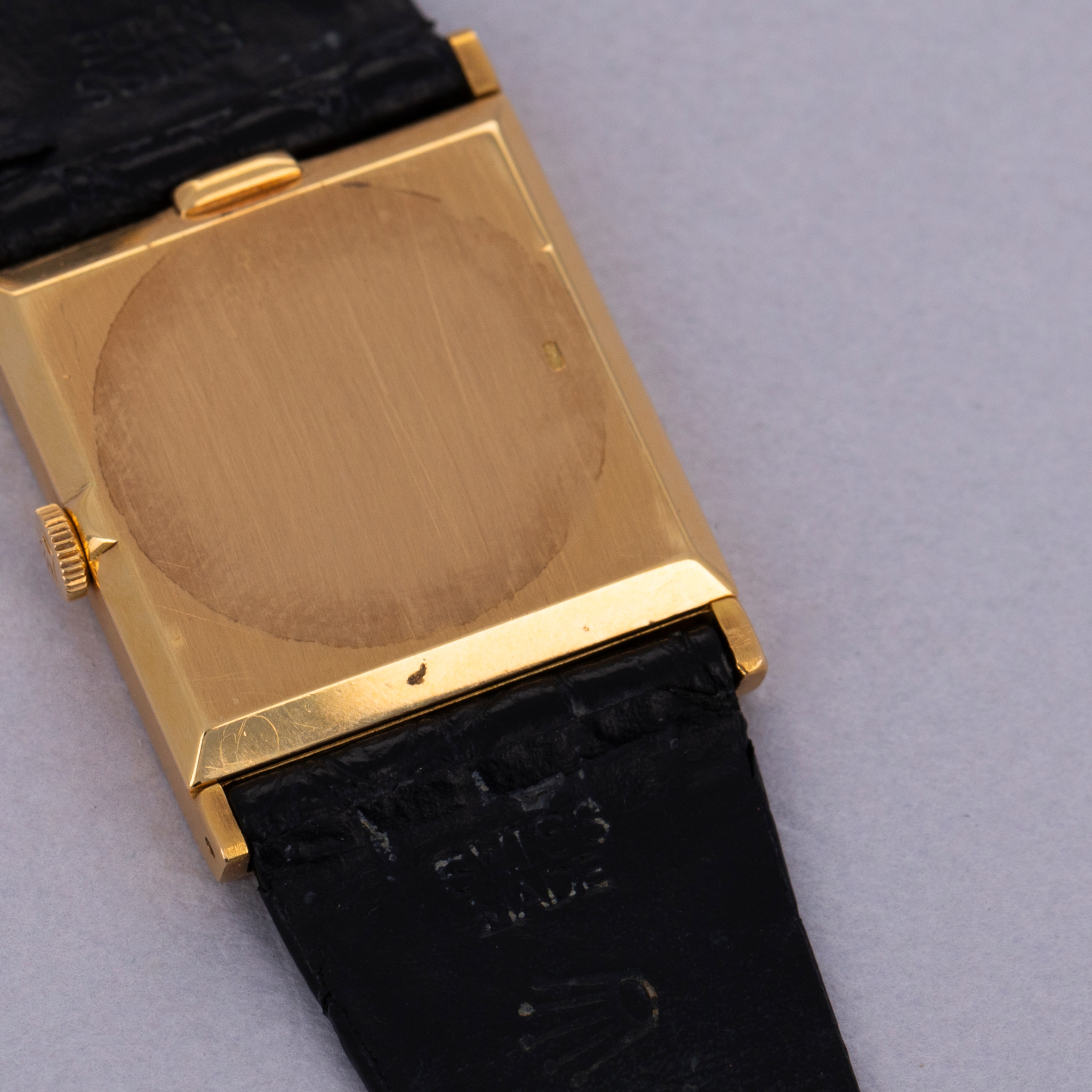 Launched in 1968 and stemming from Rolex’s acceptance of the idea that some of their customers would like to own a second watch, the Rolex Cellini collection is perhaps one of the brand’s most widely varied collections, with round leather strapped dress watches to oval shaped watches and tonneau-shaped pieces on integrated bracelets to rectangular-shaped dress watches like the Cellini ref. 4014 that we have here. Featuring an 18kt yellow gold rectangular case, the ref. 4014 is an unusual timepiece given Rolex’s typically reserved design language and the ref. 4014’s aesthetic similarity to watches like the Tank. Featuring a metallic finish dial in orange, this particular example lacks any hour markers or dial furniture that could be used to tell the time besides its applied Rolex coronet at 12 o’clock. However, marking it as a special piece indeed, this example does feature the Khanjar dagger at 9 o’clock, which designates this watch as belonging to the Sultanate of Oman after it was special ordered from Rolex by the Omani Royal Family to then be gifted or kept in the Royal Family’s collection.