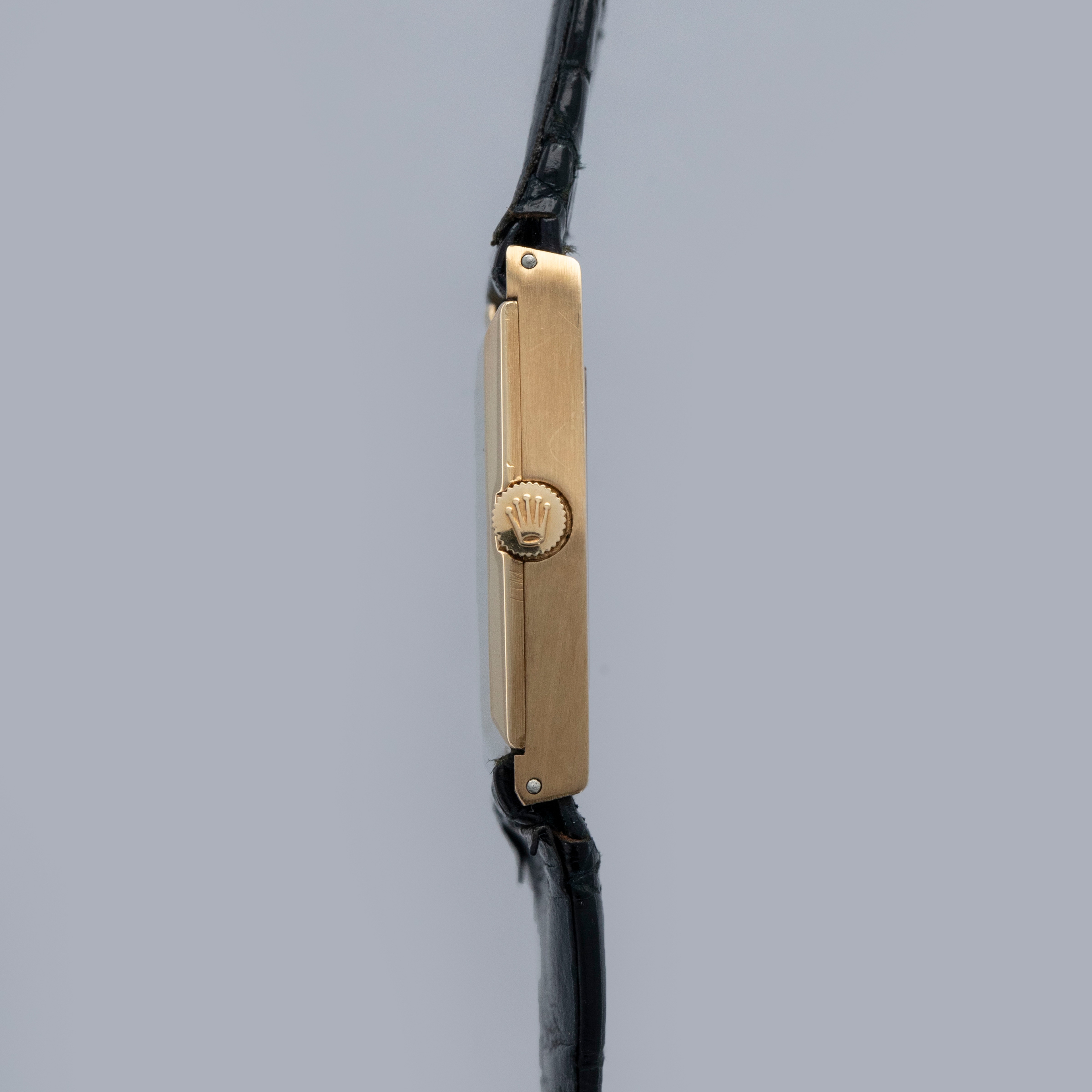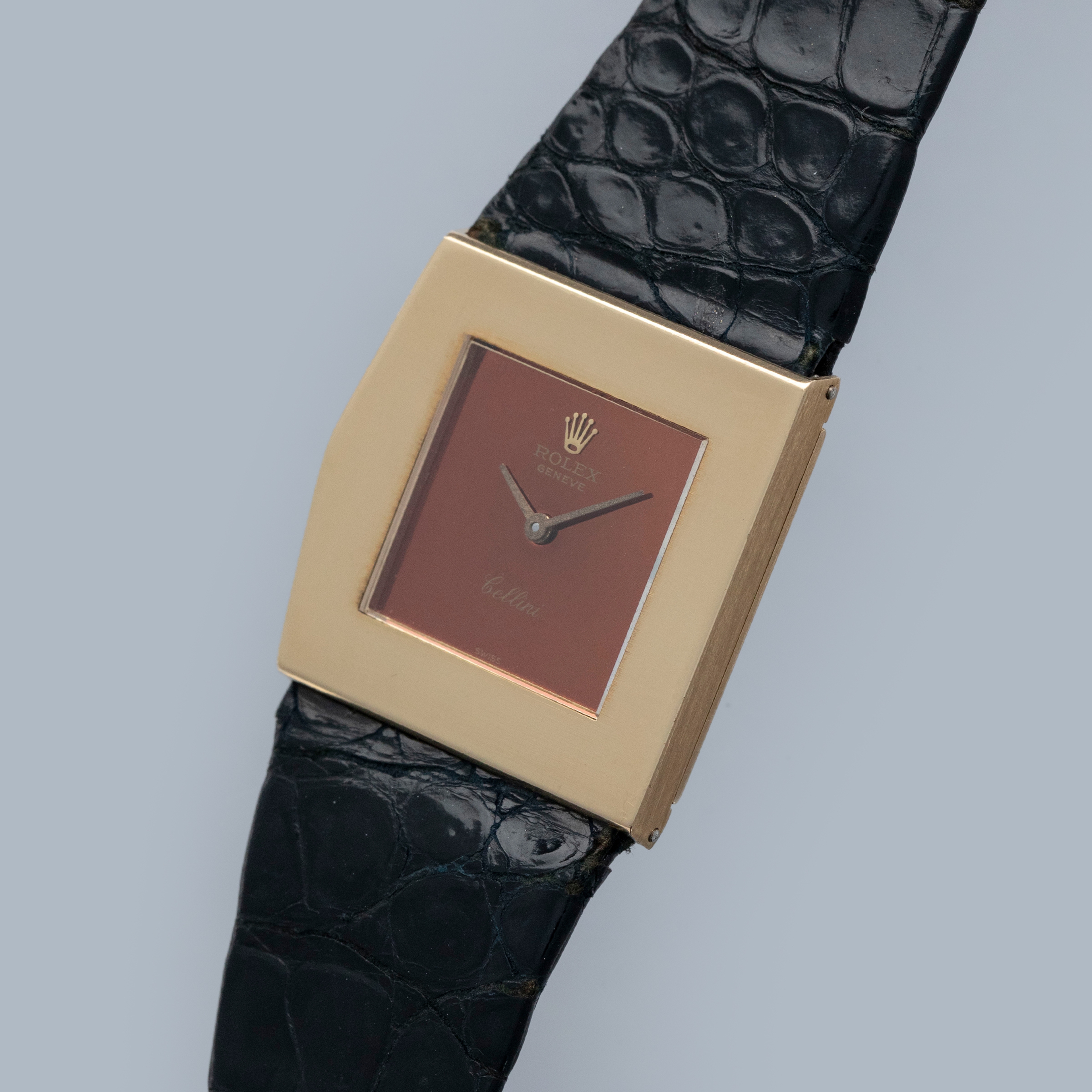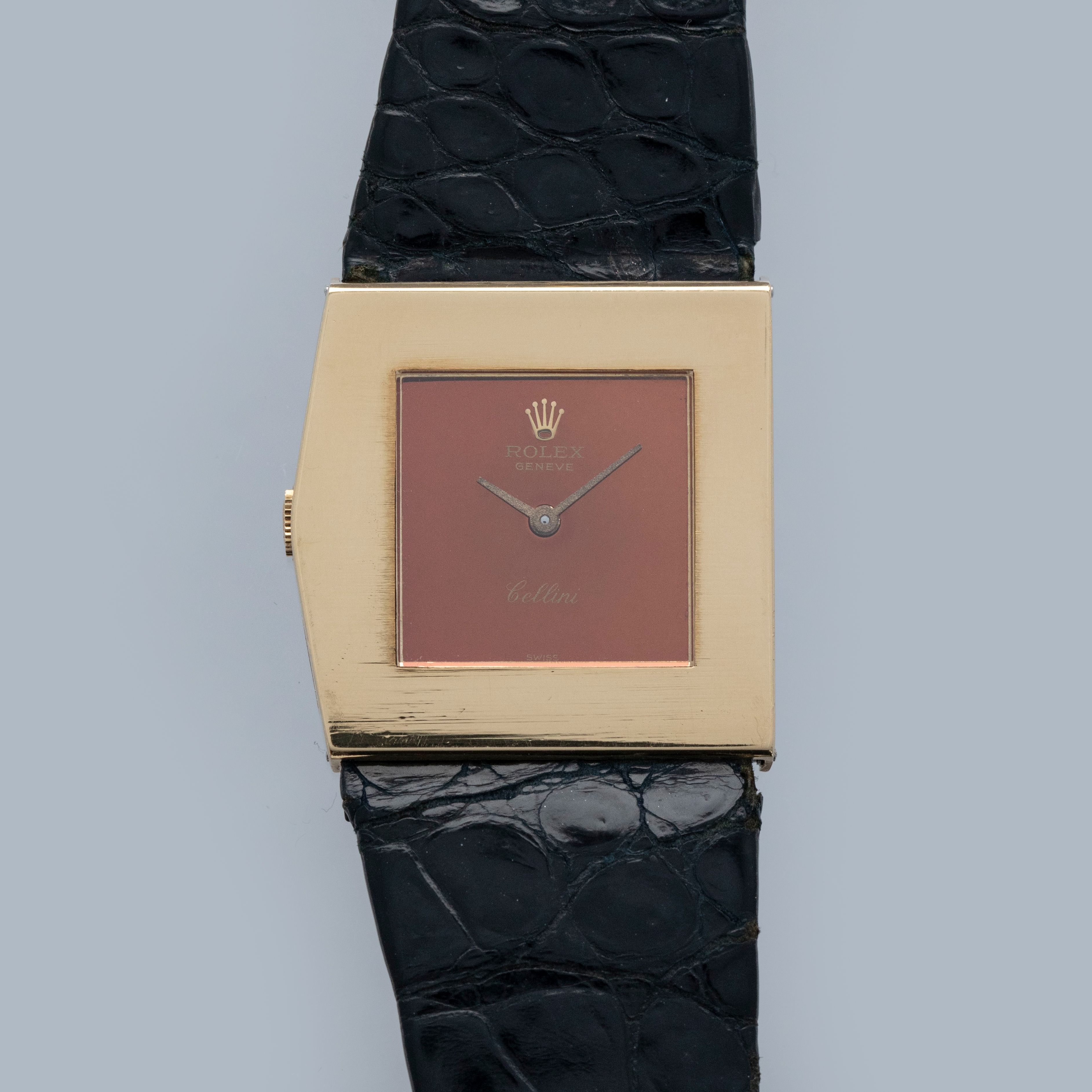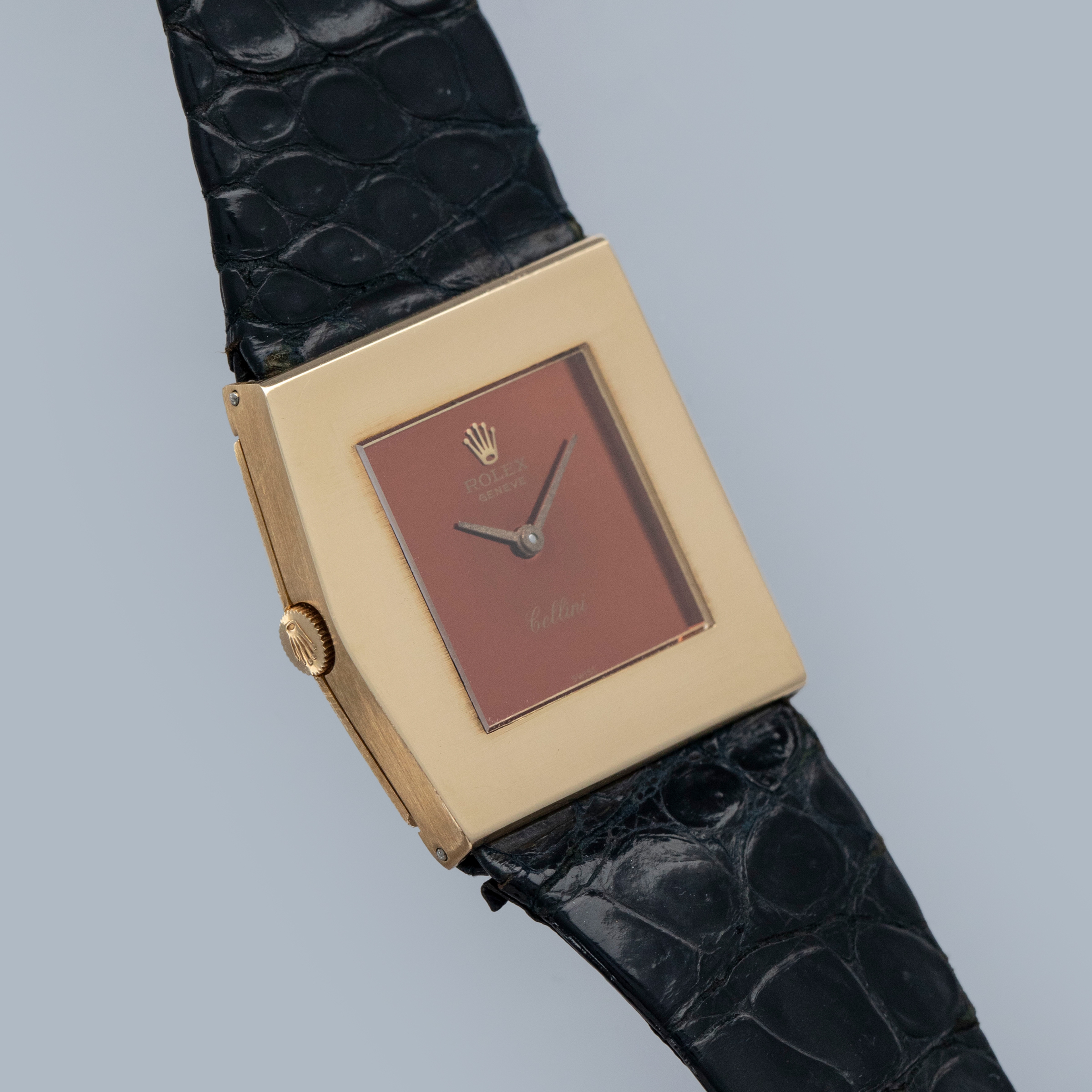 The watch is in overall very good condition. The yellow gold case has lost most of its horizontal-brushed finish, with traces still visible in places and a couple of nicks on the front. The case back retains a legible hallmark, but both the coronet and serial number are no longer visible due to wear. The original burgundy metallic dial is in excellent condition, with minor signs of ageing at the outer edge. The watch is fitted with an original Rolex black crocodile strap with a gold-plated buckle, both in excellent condition. Please note that the watch ticks at time of cataloging, but timekeeping is poor and a service is recommended.