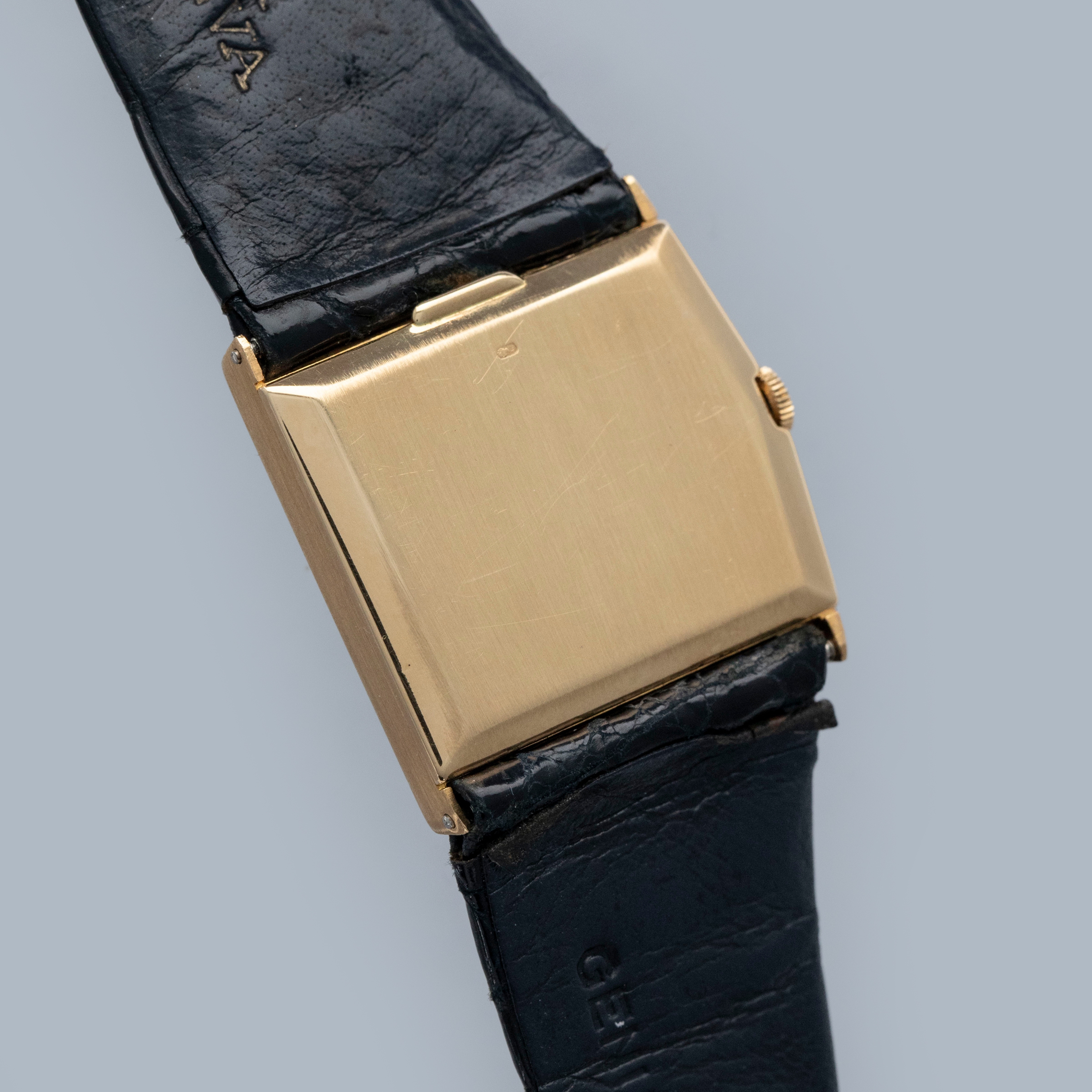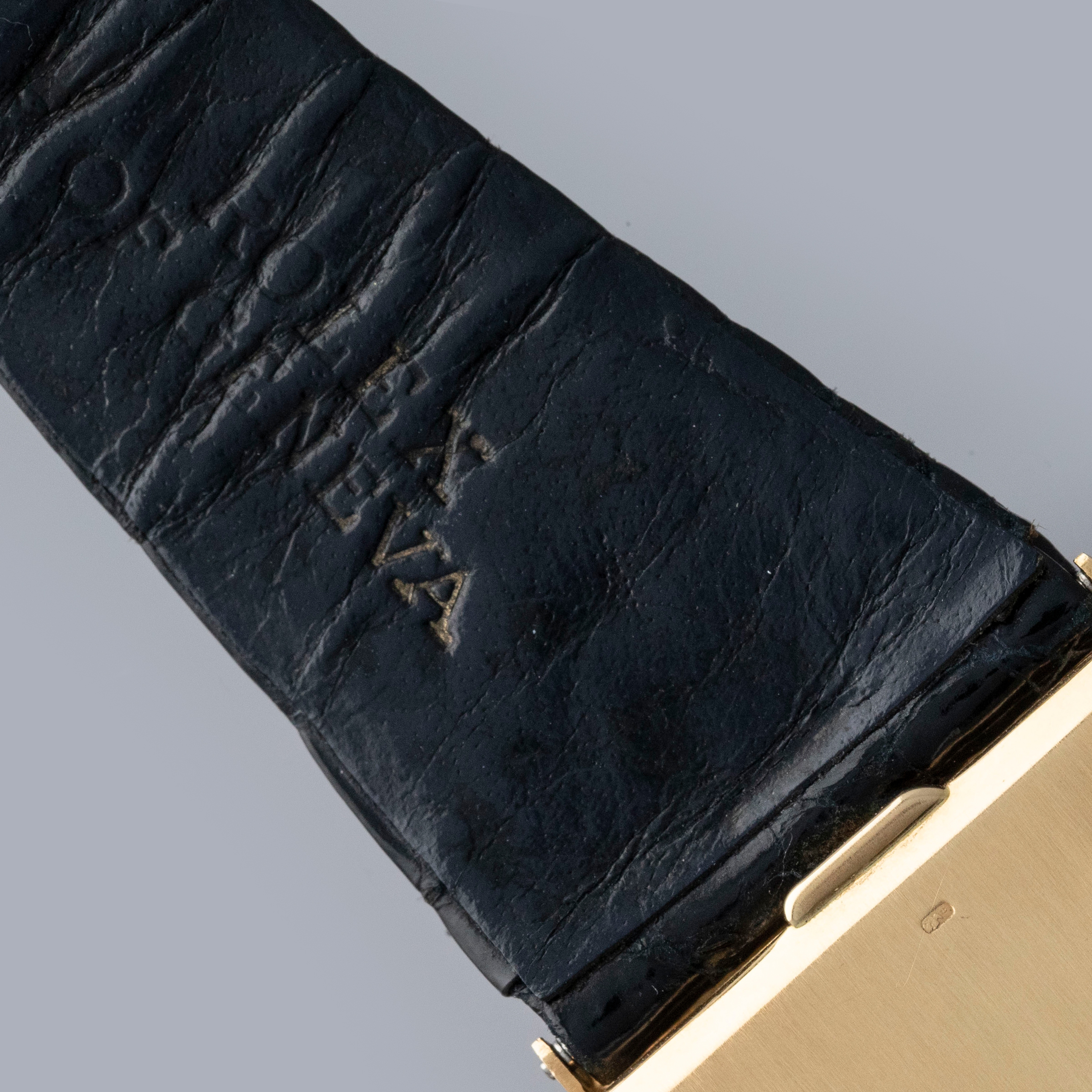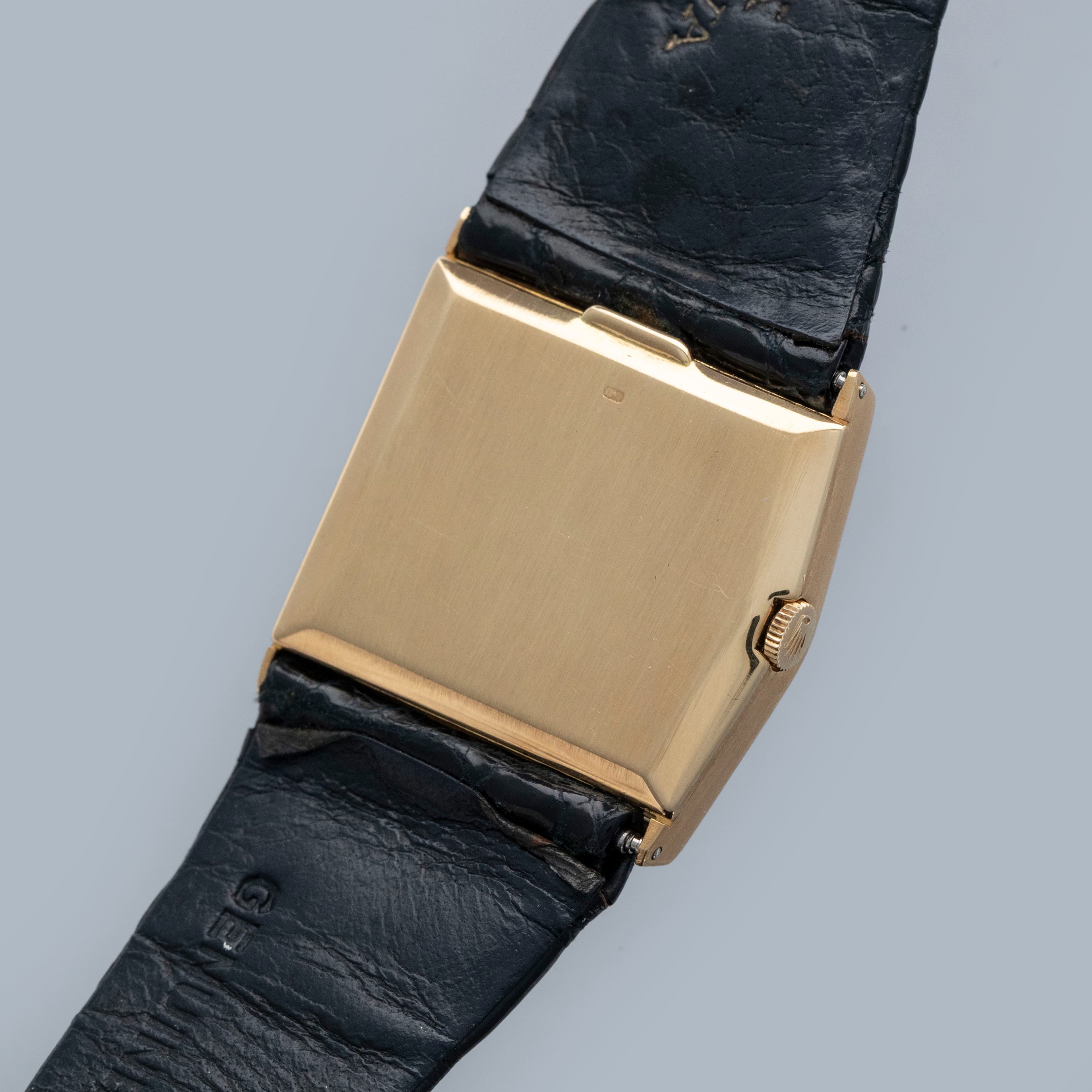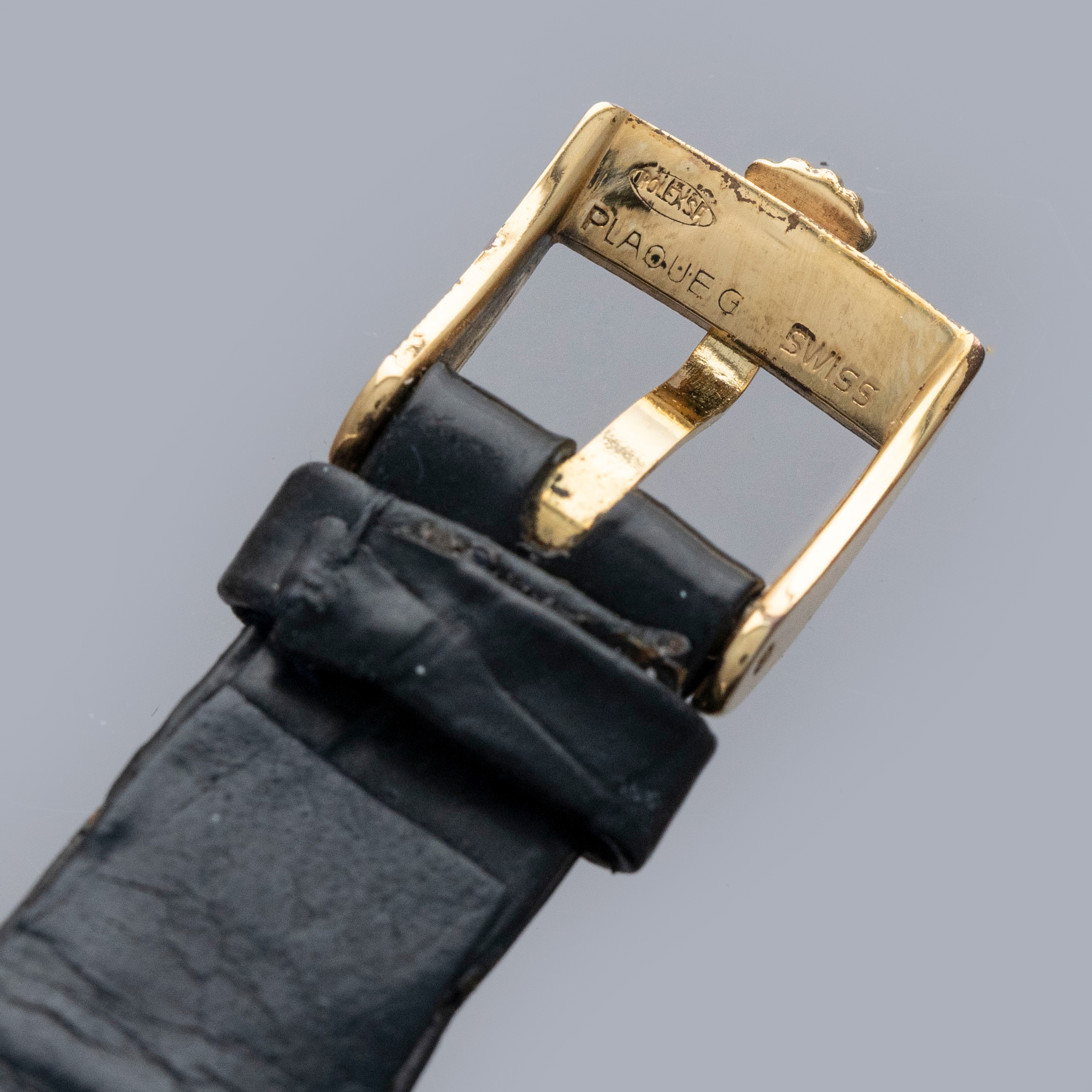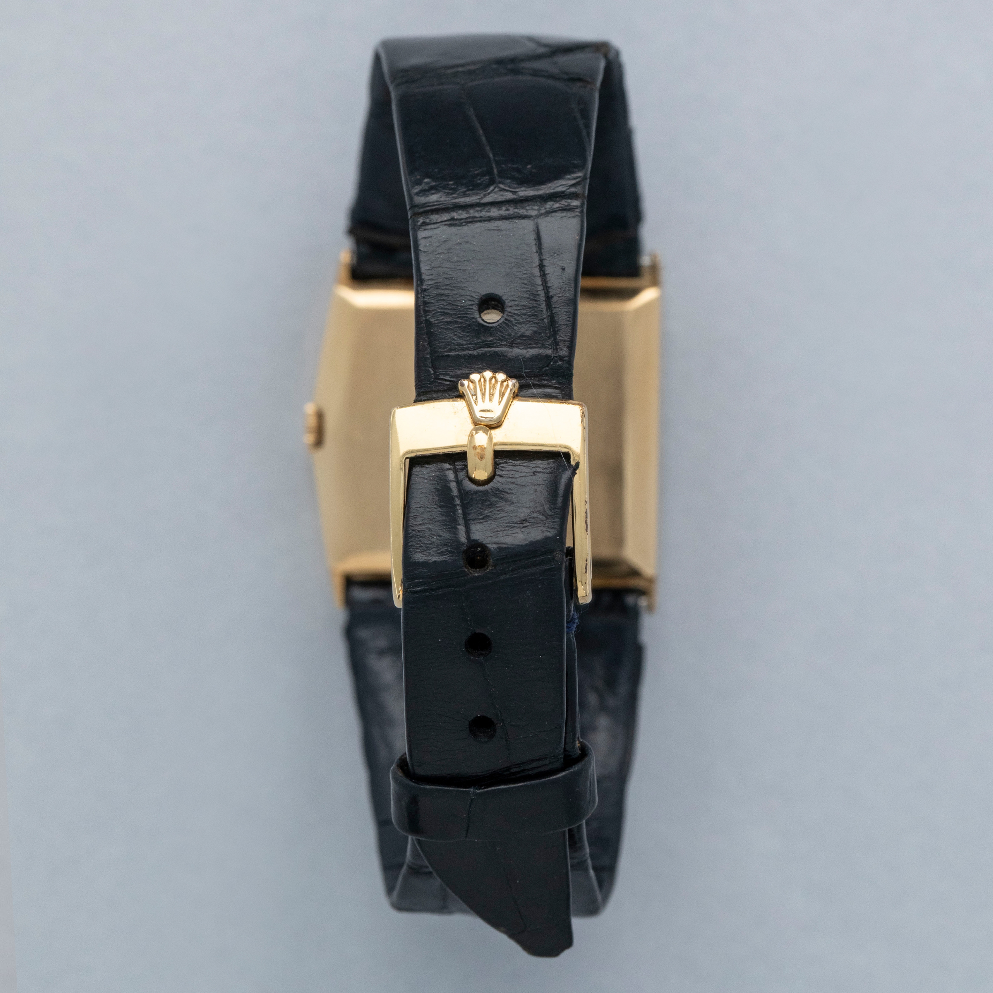 The watch is in overall very good condition. The yellow gold case has lost most of its horizontal-brushed finish, with traces still visible in places and a couple of nicks on the front. The case back retains a legible hallmark, but both the coronet and serial number are no longer visible due to wear. The original burgundy metallic dial is in excellent condition, with minor signs of ageing at the outer edge. The watch is fitted with an original Rolex black crocodile strap with a gold-plated buckle, both in excellent condition. Please note that the watch ticks at time of cataloging, but timekeeping is poor and a service is recommended.