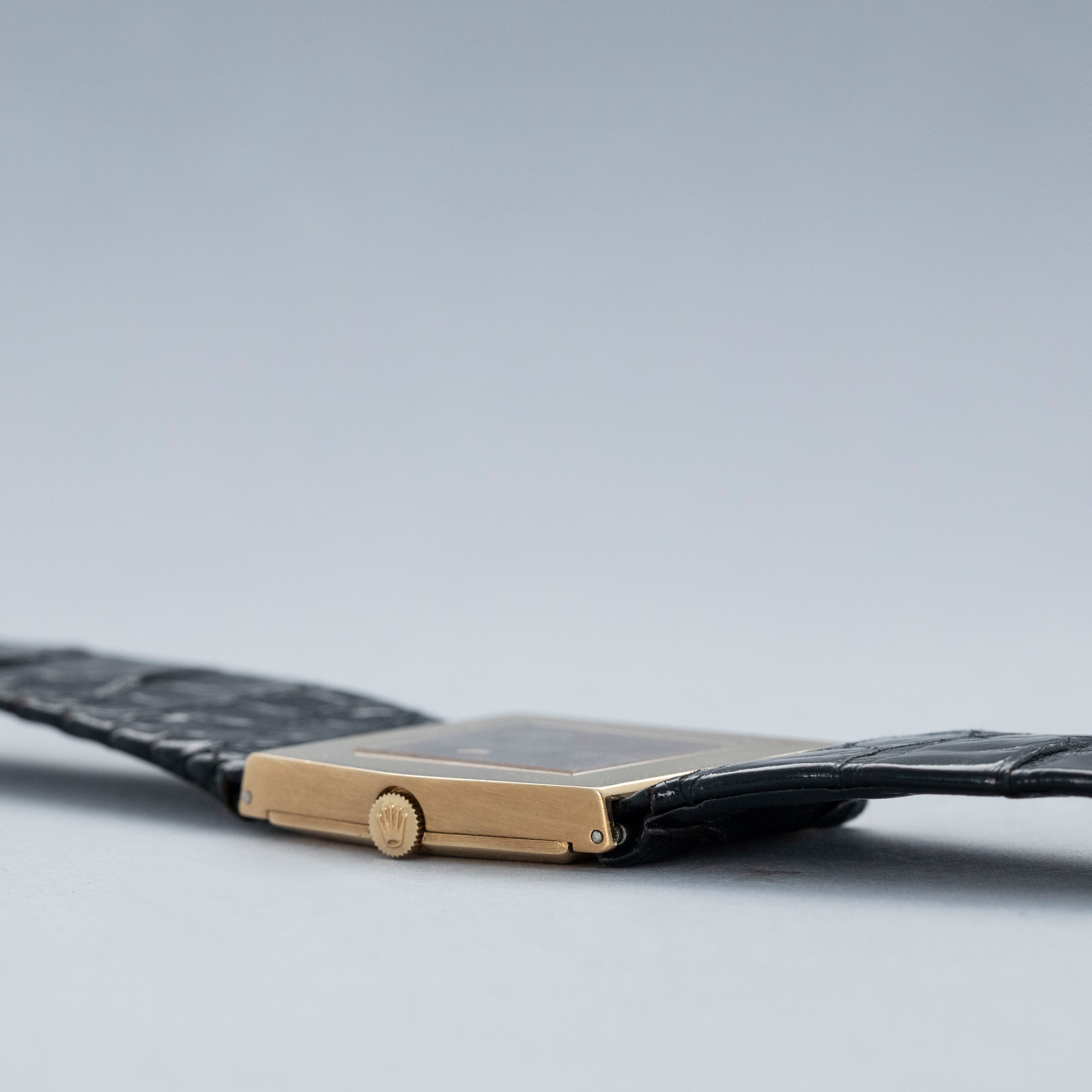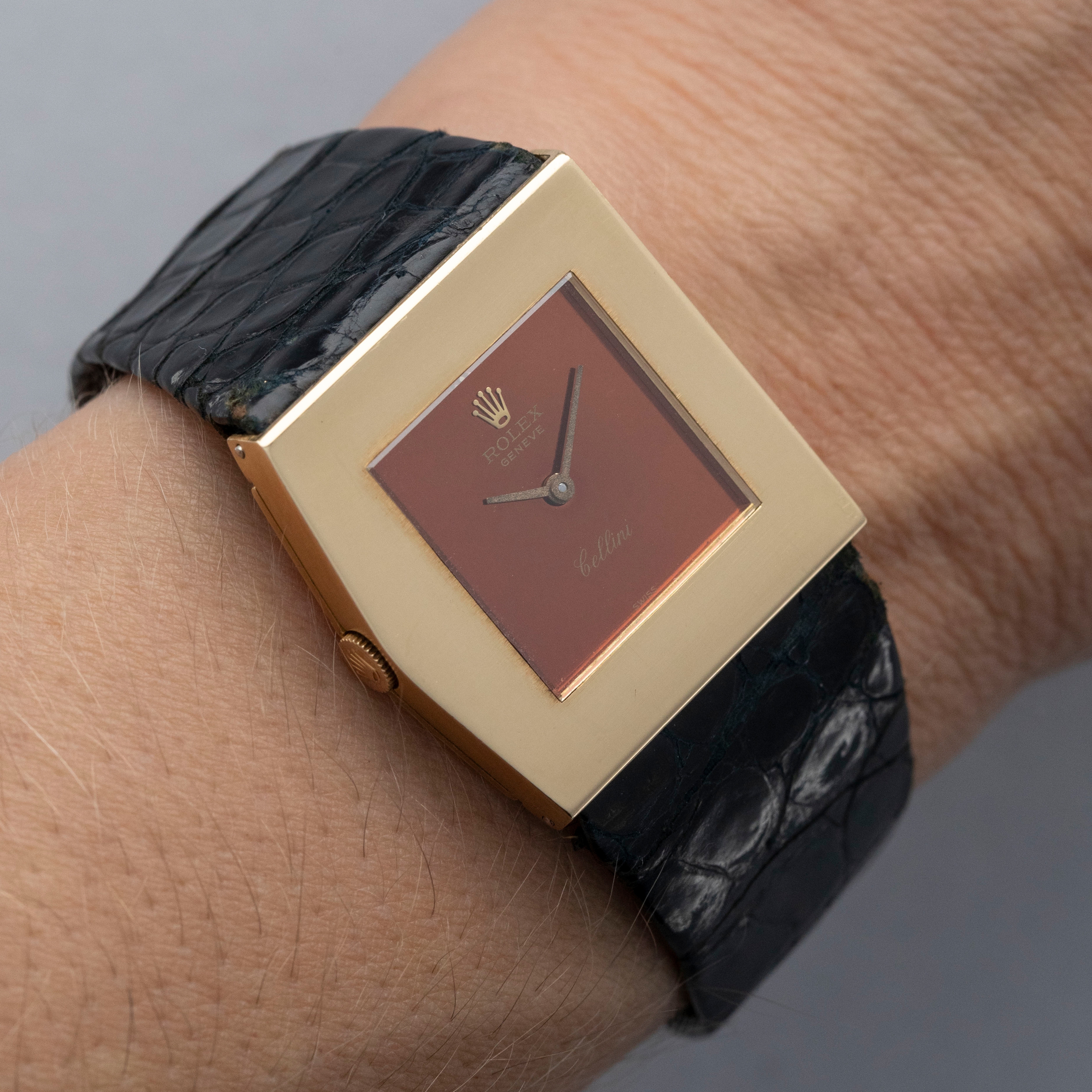 Stemming from Rolex’s acceptance of the idea that some of their customers would like to own a second watch, the Rolex Cellini collection is perhaps one of the brands most widely varied collections, with round leather strapped dress watches to oval shaped pieces of distilled excellence and even integrated bracelet watches like the King Midas, the collection is varied and rich with diversity. Launched in the 1960s, Rolex approached a young Gerald Genta to design a gold watch fit for royalty. Inspired by Athens’ Parthenon temple, Genta designed the King Midas with an asymmetrical pentagon-shaped case with a left-handed crown arrangement, for the first time in Rolex’s history, with a minimalist integrated bracelet. Named after King Midas, whose touch could turn anything to gold, the King Midas was an exclusive timepiece that weighed double that of a Day-Date, Rolex’s flagship and most exclusive collection. Taking elements of King Midas’ story and implementing them into the watch itself, Genta showcased his ability to create a unique watch unlike anything else. With its pentagonal case reflecting the Parthenon’s roof, the left-sided crown inspired by King Midas’ left hand’s golden touch and minimalist dial serving to accentuate the rest of the design, the King Midas is perhaps one of Rolex’s most unique watches ever. Offered as a dressier member of the King Midas collection, the burgundy dial ref. 4017 that we have here swaps the King Midas’ integrated bracelet for a leather strap, making it a much more toned-down watch, but more aligned with the popular dress watch aesthetic of the time.