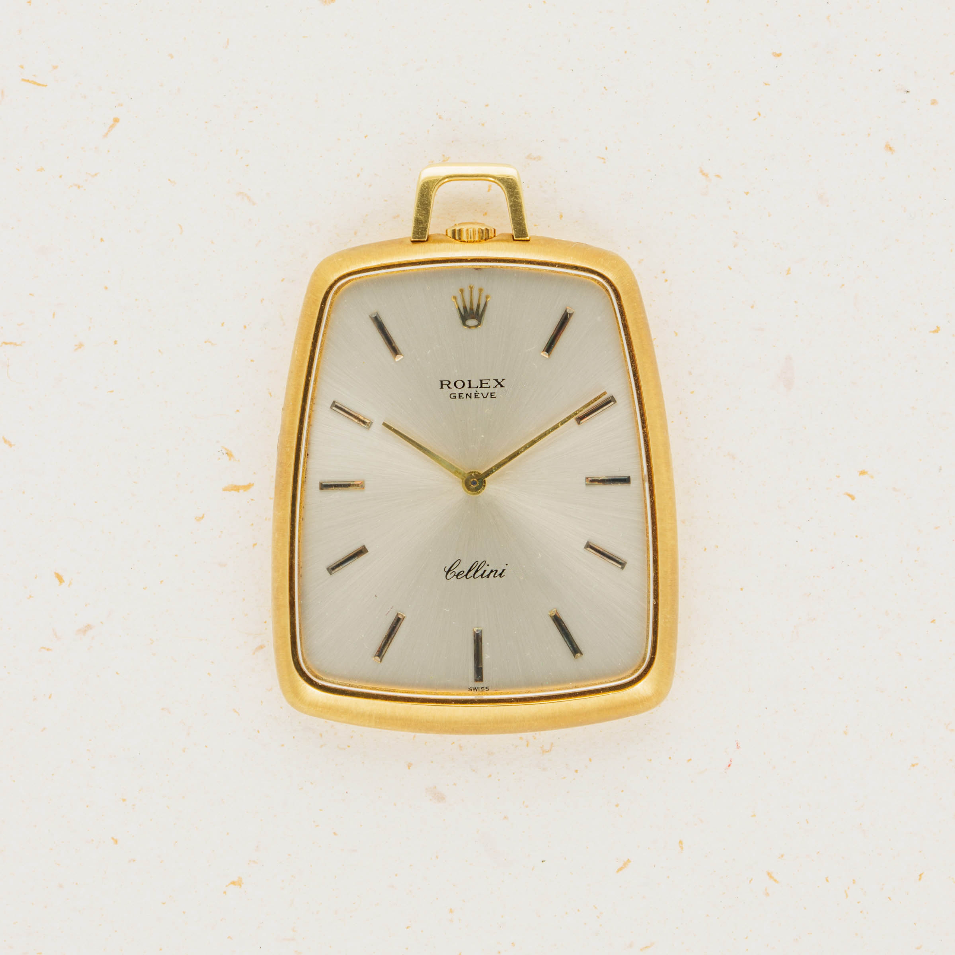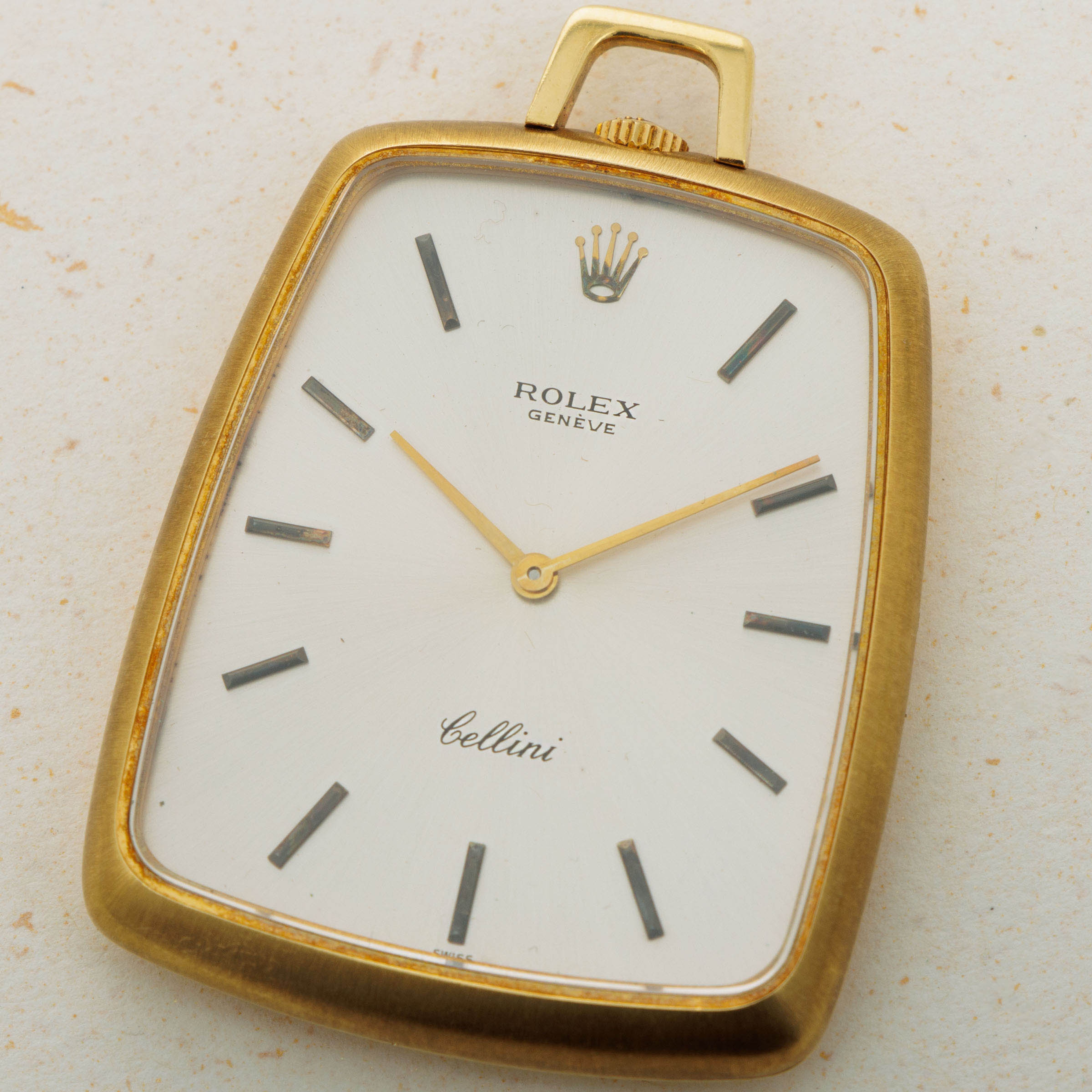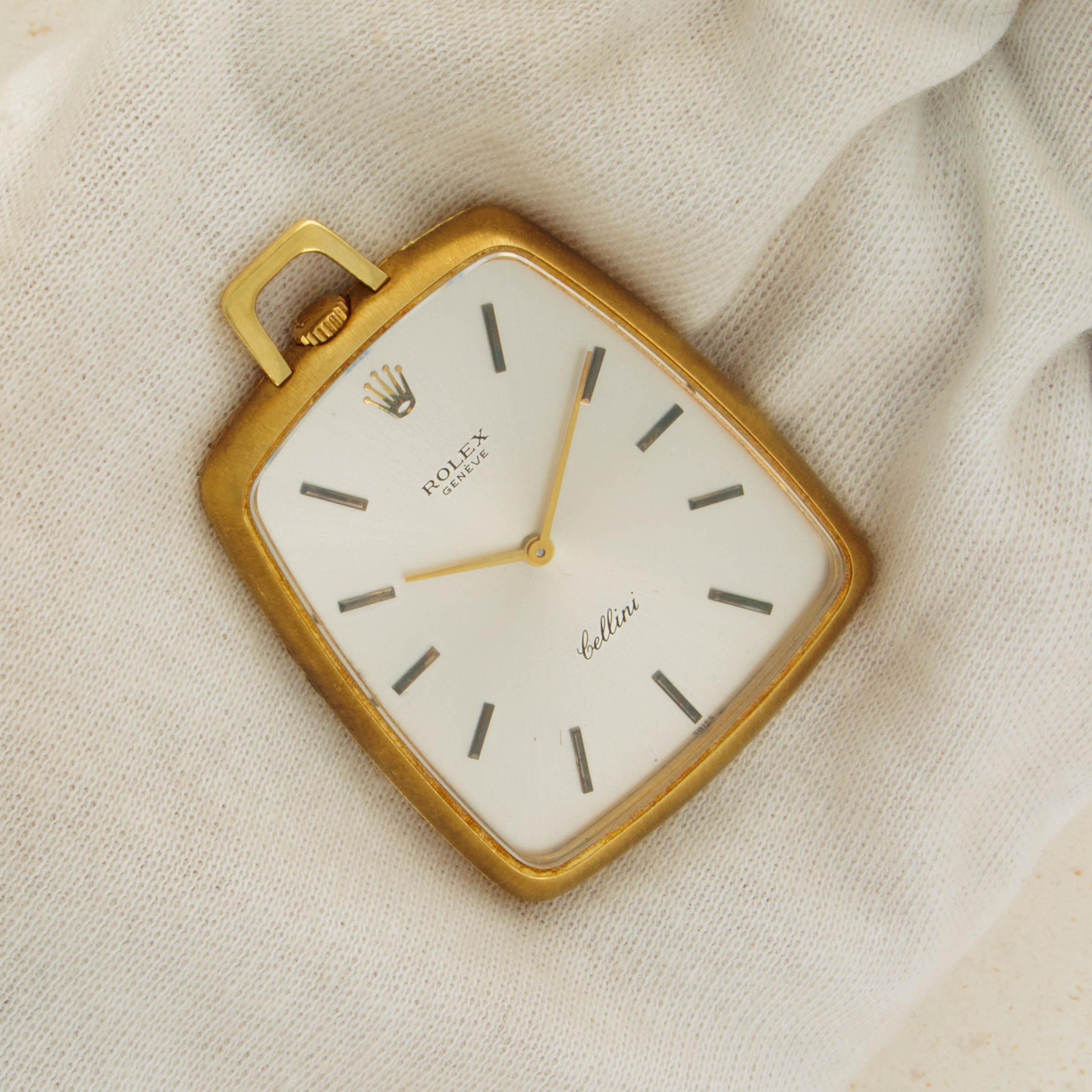 While they might be best-known for their impeccably-made tool watches and variety of luxurious dress watches, Rolex have a history of making other timepieces too, namely pocket watches like the Cellini ref. 3728 that we have here. Launched as part of the Cellini collection, which was itself a collection created to offer Rolex’s customers with a style of watch that Rolex had not offered, the ref. 3728 is an understated pocket watch that breaks away from Rolex’s typical design language. Thin with a clean silver dial and an interesting shape whereby its base is wider than its top, the ref. 3728 is a timepiece that challenges Rolex’s typical design language. Made of 18kt yellow gold that has accumulated a rich patina throughout, this example is as fine a ref. 3728 as you could ever hope to find.