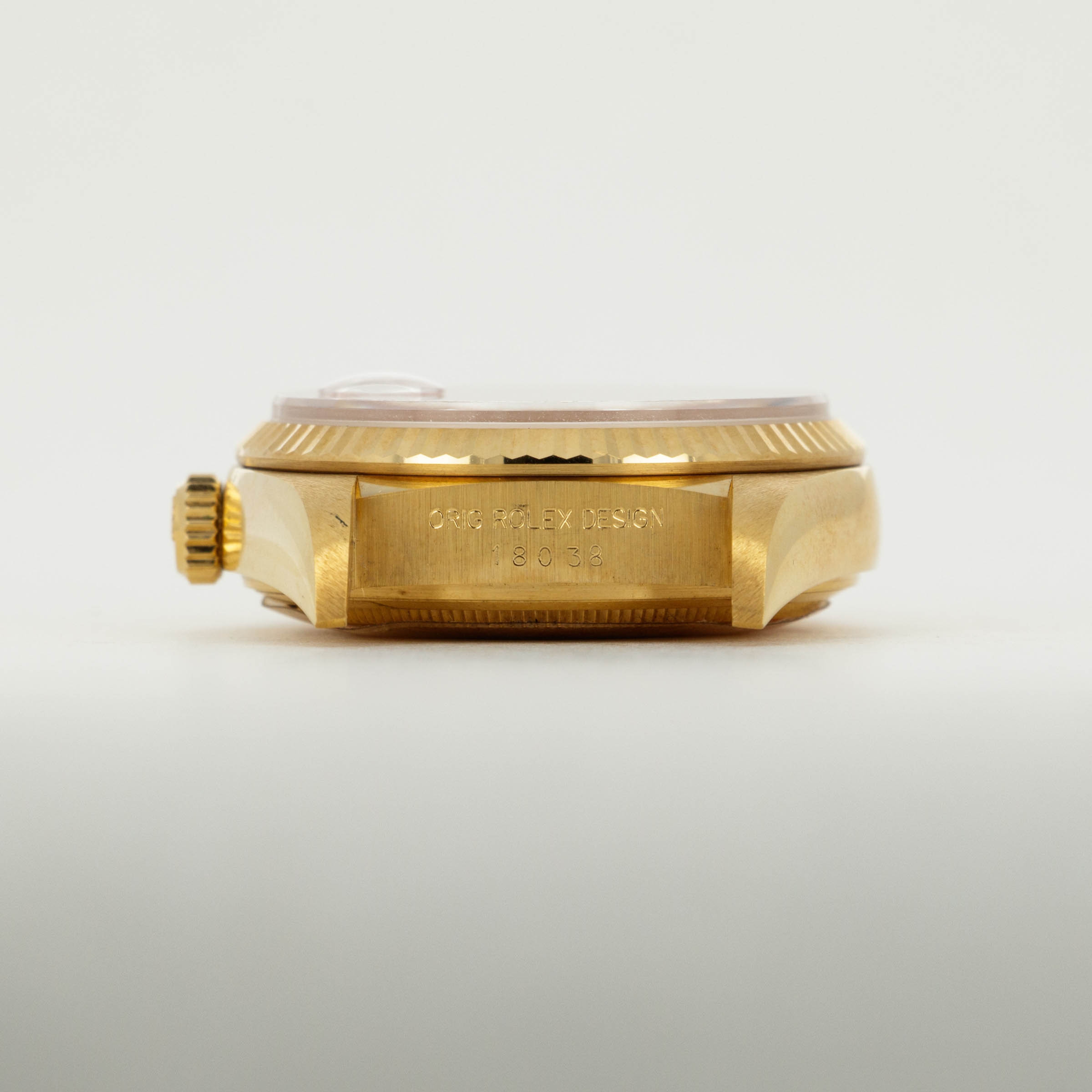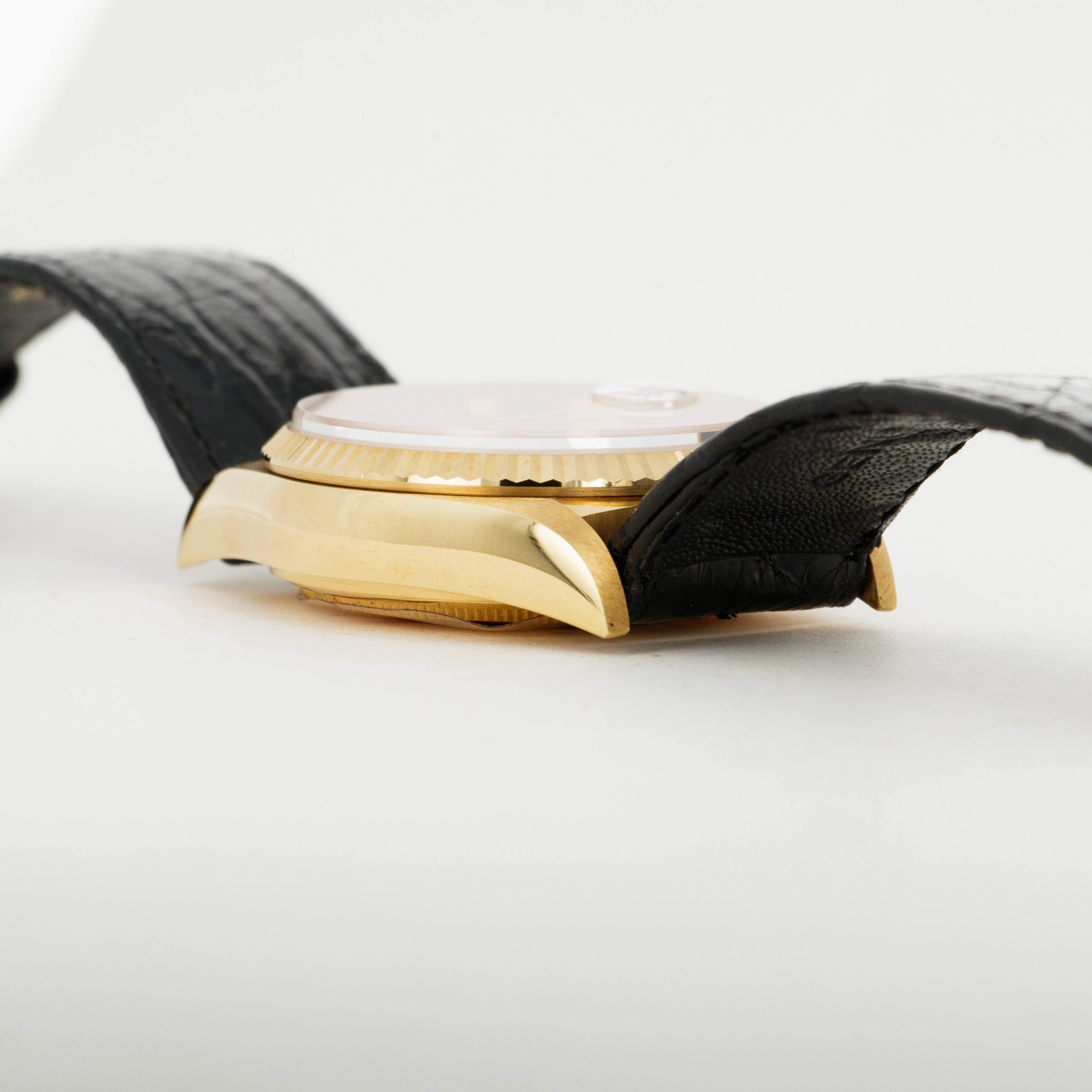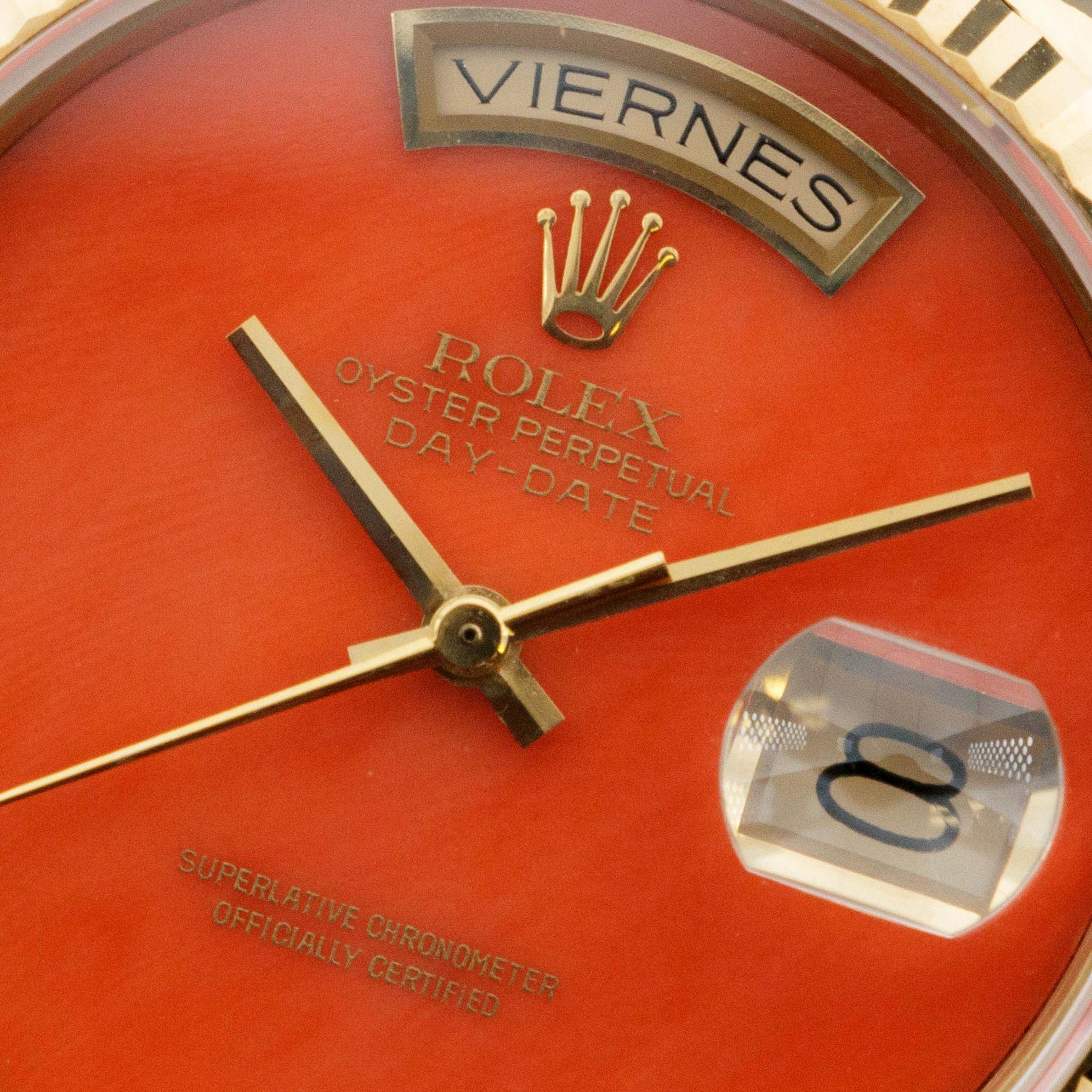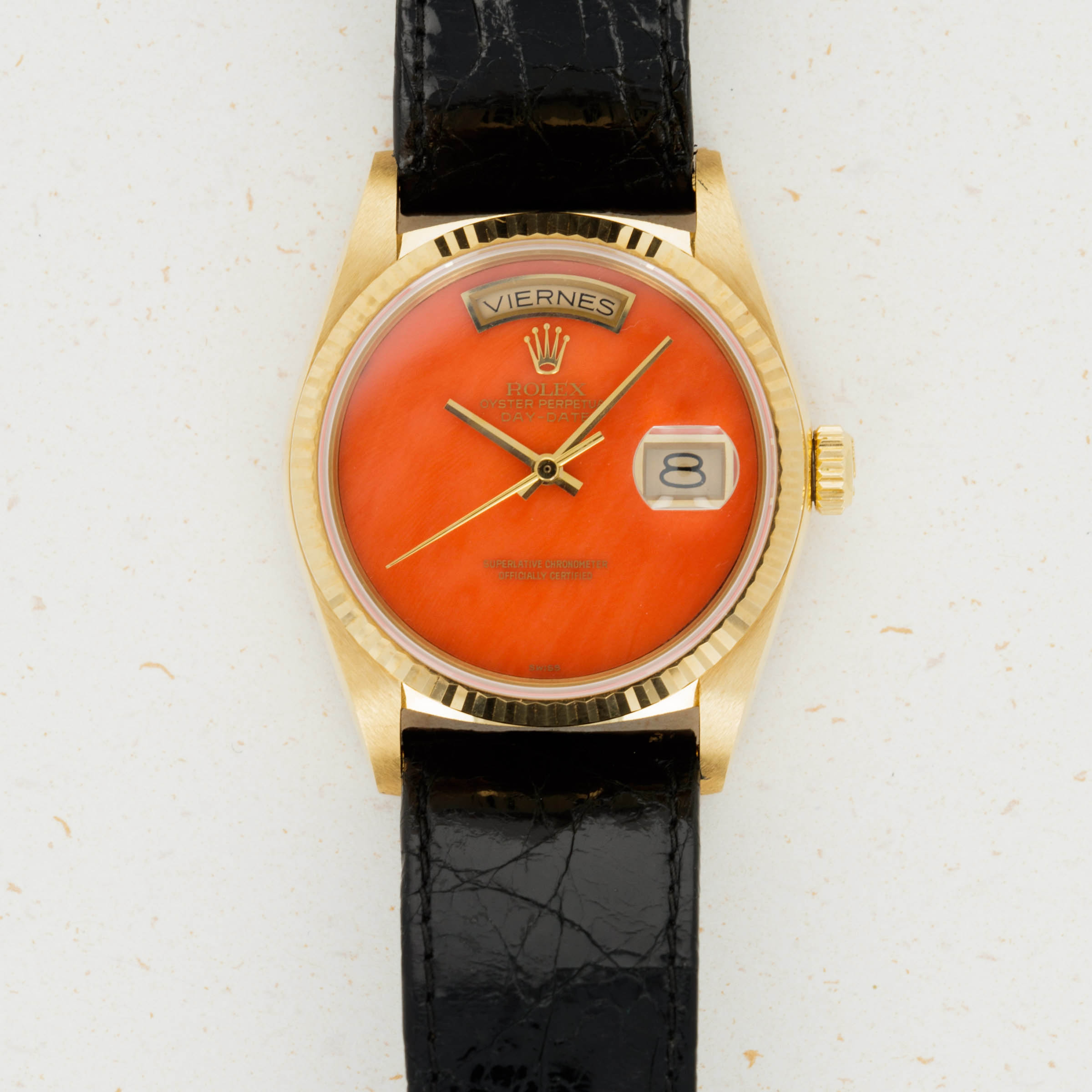 A legendary timepiece with an unrivaled history, the Rolex Day-Date has earned its place as "The Ultimate Watch of Prestige" from its decades on the wrists of the world's most influential people. Released in 1956, the Day-Date quickly became synonymous with luxury, prestige, and exclusivity thanks to being the watch of choice for the world's athletes, visionaries, and world leaders alike. Only ever constructed of precious metals, the Day-Date's aesthetic is that of sheer elegance and grace. With its timeless style and inescapable impact on horology, the Day-Date stands as a vivid reminder of just how successful Rolex has been in realizing that very mission. This particular example features a coral dial and is in unused condition. In the pantheon of Day-Date dial types, the coral dial stands alone as the king of the stone dials. Exceedingly difficult to produce due to the large diameter required to fit a men's watch, the dials have been long discontinued, and many of the examples that have survived unfortunately have cracks or other damage. A coral dial is rare in its own right, but this example represents the first we've ever seen where the text on the dial is applied in gold, as opposed to the usual black printing. A true rarity in exceptional condition.