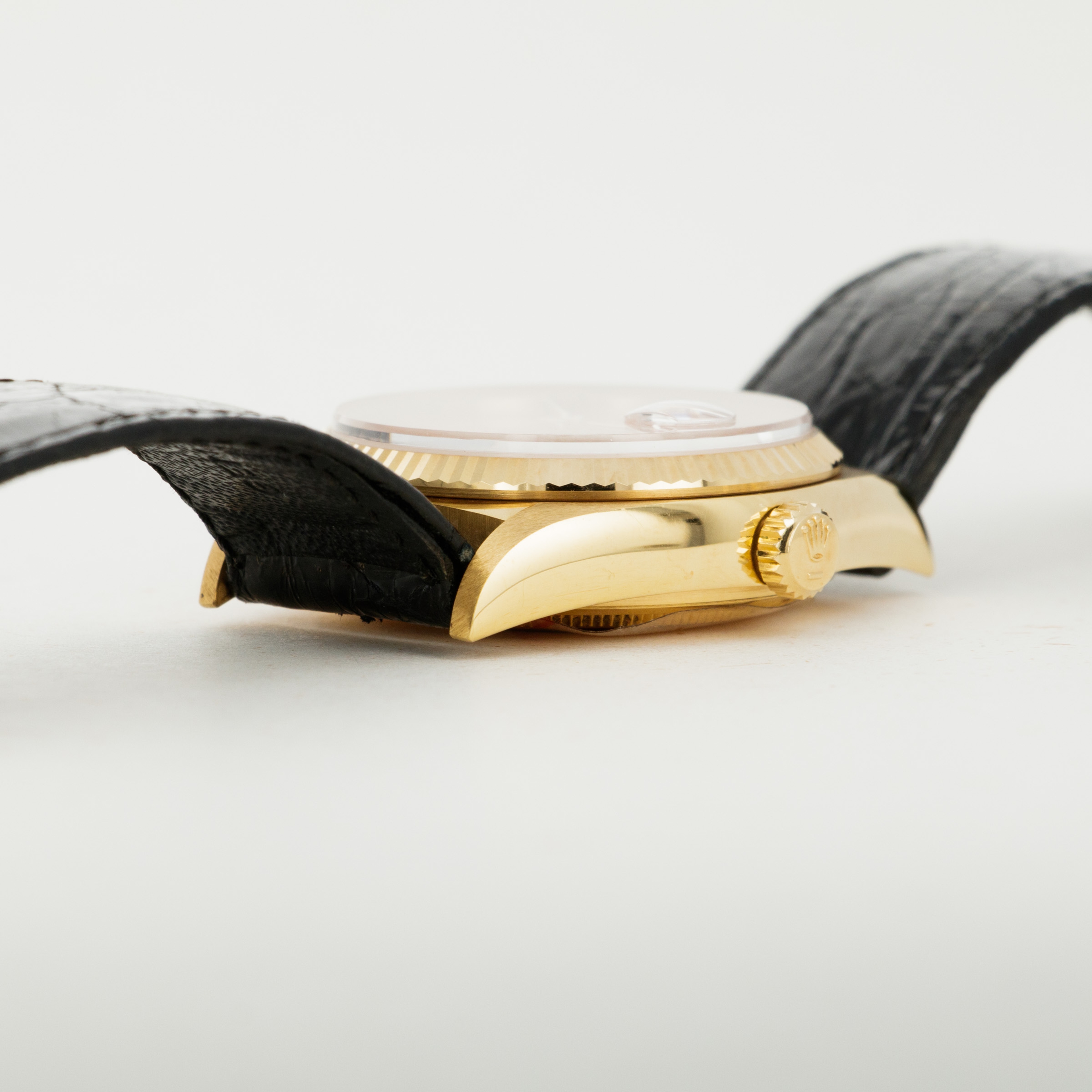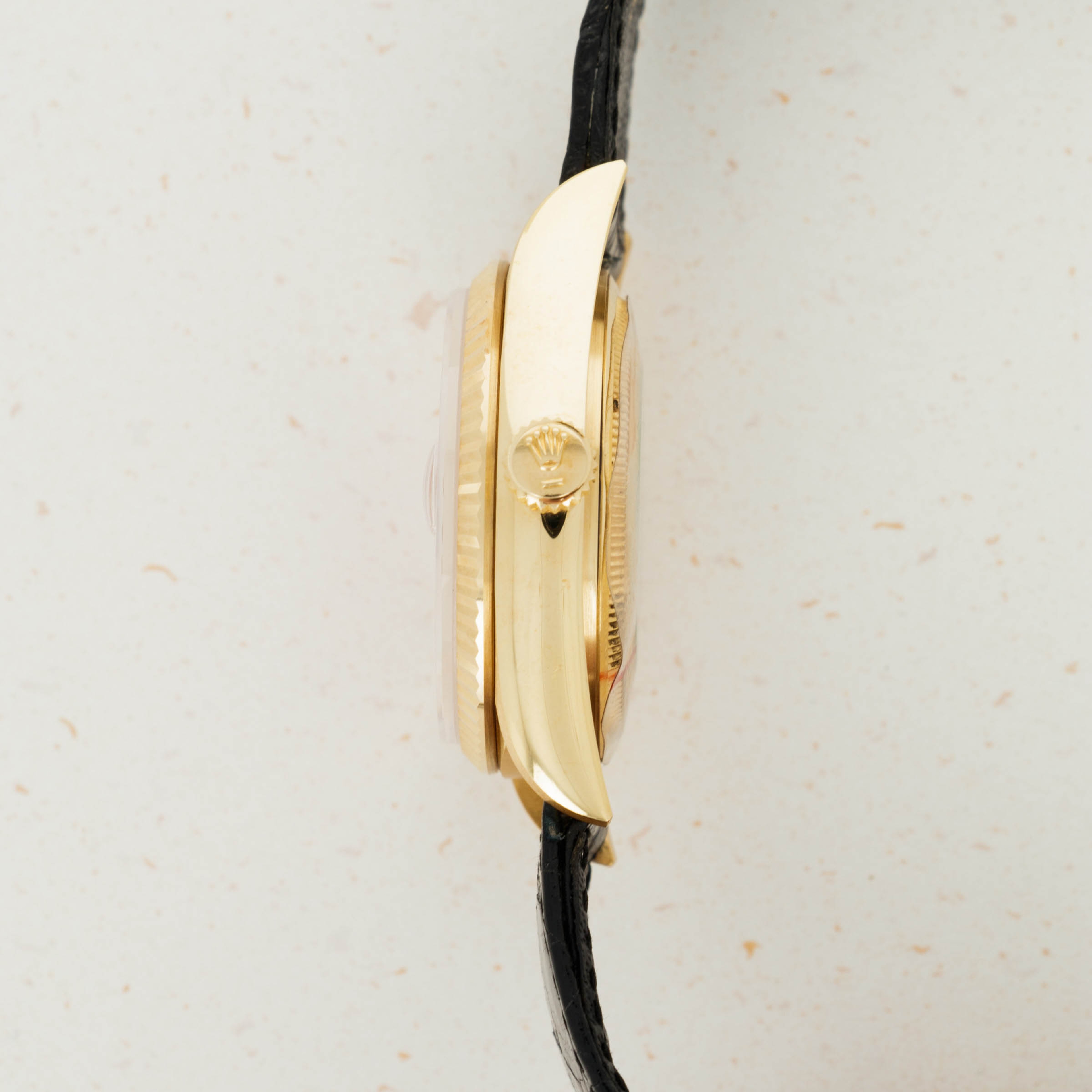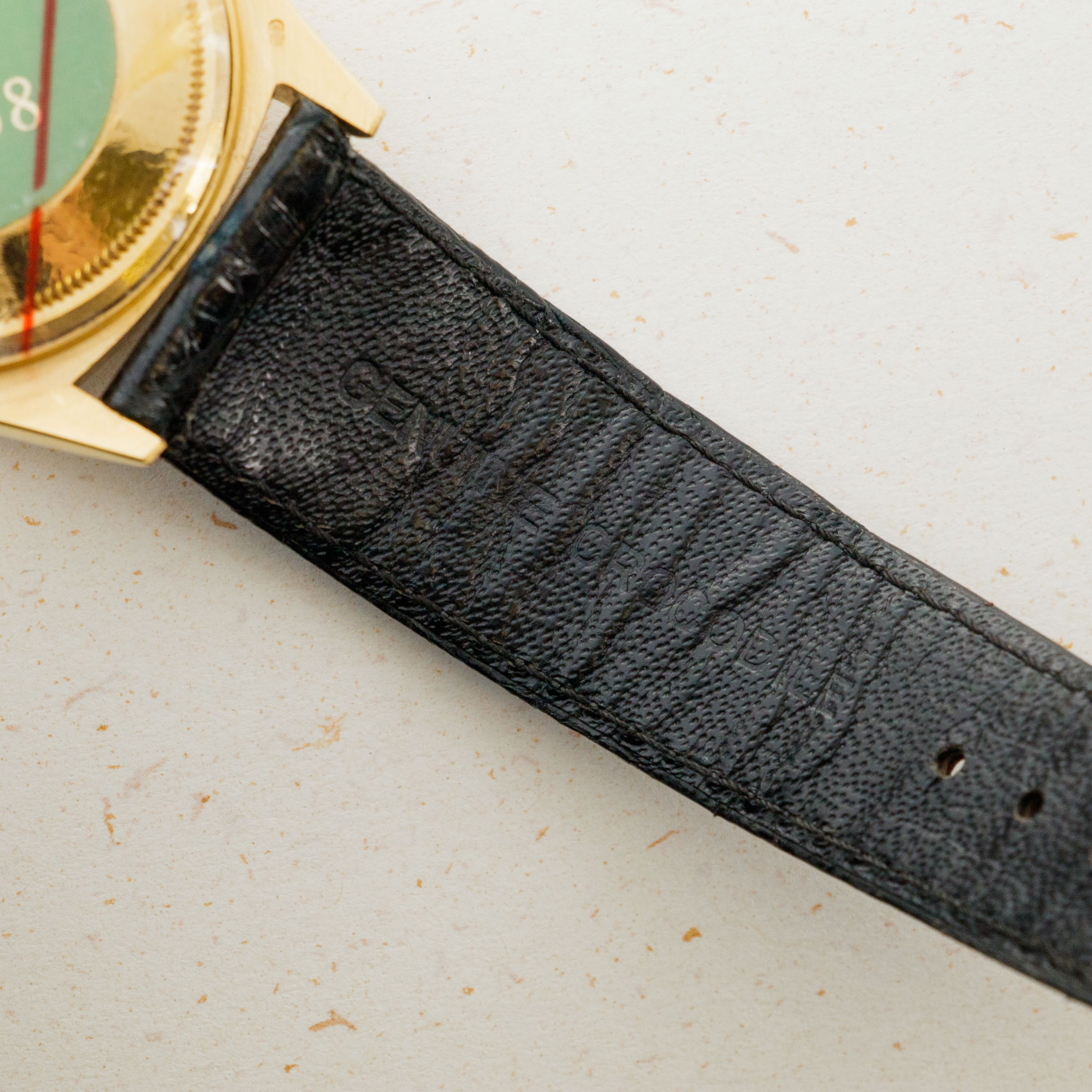 A legendary timepiece with an unrivaled history, the Rolex Day-Date has earned its place as "The Ultimate Watch of Prestige" from its decades on the wrists of the world's most influential people. Released in 1956, the Day-Date quickly became synonymous with luxury, prestige, and exclusivity thanks to being the watch of choice for the world's athletes, visionaries, and world leaders alike. Only ever constructed of precious metals, the Day-Date's aesthetic is that of sheer elegance and grace. With its timeless style and inescapable impact on horology, the Day-Date stands as a vivid reminder of just how successful Rolex has been in realizing that very mission. This particular example features a coral dial and is in unused condition. In the pantheon of Day-Date dial types, the coral dial stands alone as the king of the stone dials. Exceedingly difficult to produce due to the large diameter required to fit a men's watch, the dials have been long discontinued, and many of the examples that have survived unfortunately have cracks or other damage. A coral dial is rare in its own right, but this example represents the first we've ever seen where the text on the dial is applied in gold, as opposed to the usual black printing. A true rarity in exceptional condition.