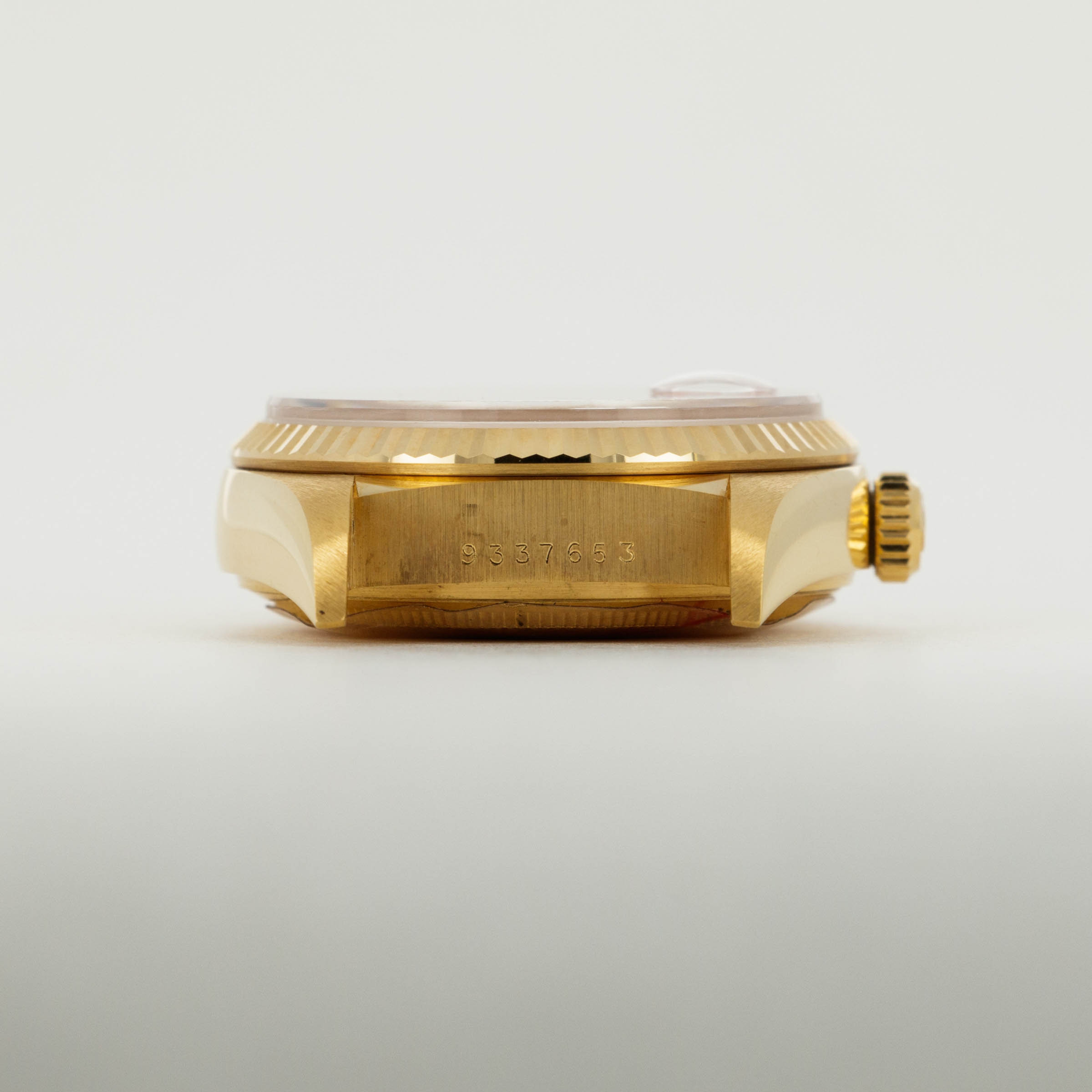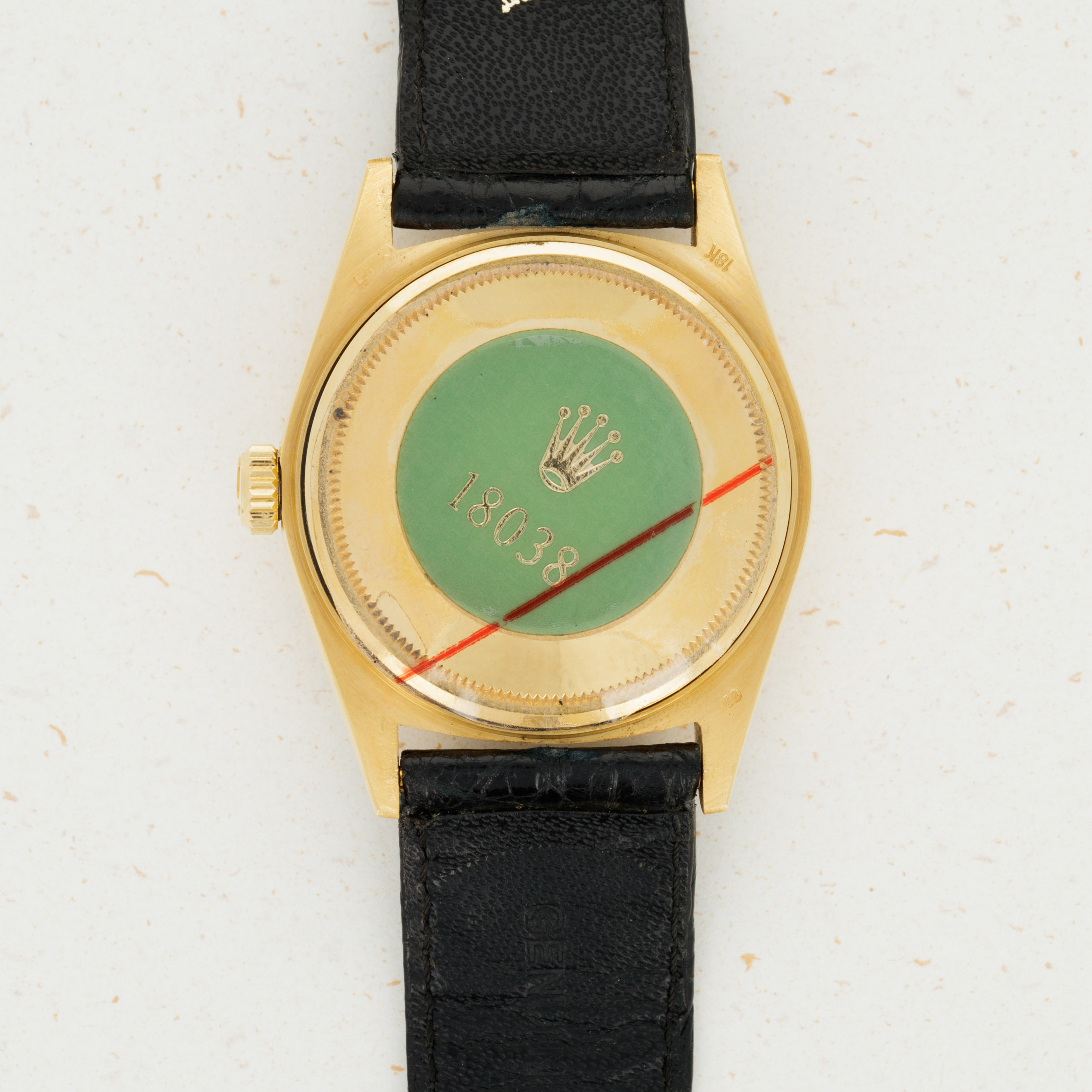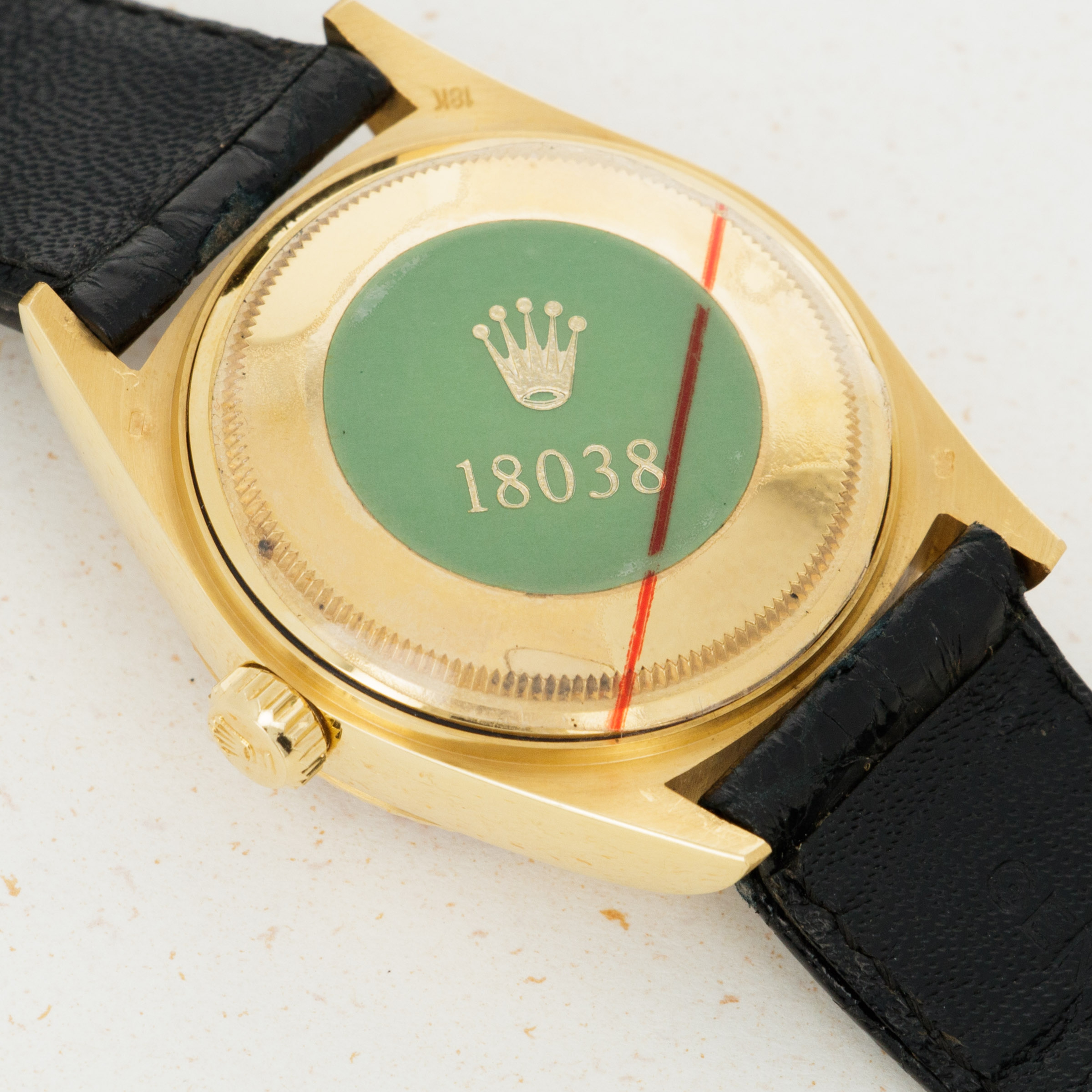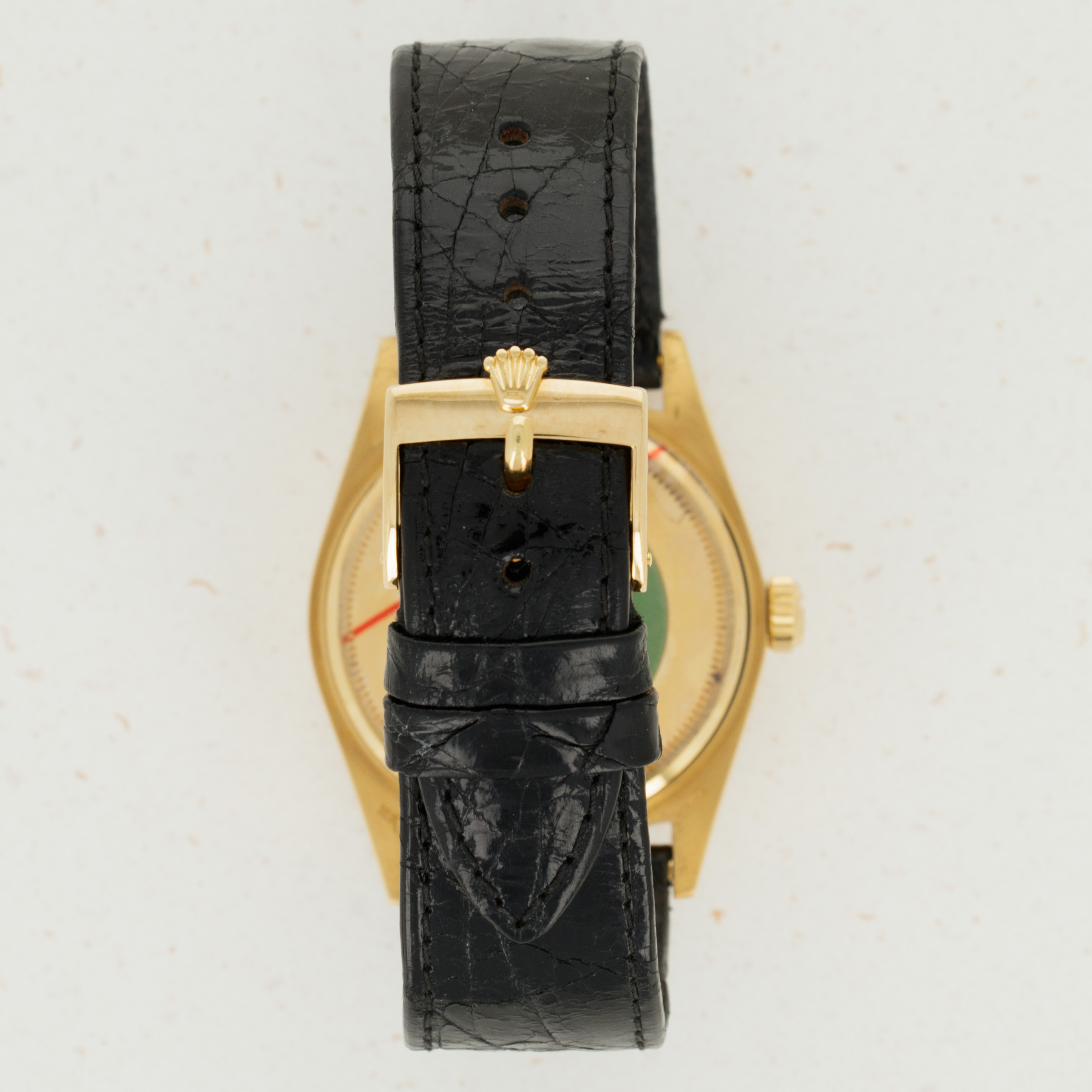A legendary timepiece with an unrivaled history, the Rolex Day-Date has earned its place as "The Ultimate Watch of Prestige" from its decades on the wrists of the world's most influential people. Released in 1956, the Day-Date quickly became synonymous with luxury, prestige, and exclusivity thanks to being the watch of choice for the world's athletes, visionaries, and world leaders alike. Only ever constructed of precious metals, the Day-Date's aesthetic is that of sheer elegance and grace. With its timeless style and inescapable impact on horology, the Day-Date stands as a vivid reminder of just how successful Rolex has been in realizing that very mission. This particular example features a coral dial and is in unused condition. In the pantheon of Day-Date dial types, the coral dial stands alone as the king of the stone dials. Exceedingly difficult to produce due to the large diameter required to fit a men's watch, the dials have been long discontinued, and many of the examples that have survived unfortunately have cracks or other damage. A coral dial is rare in its own right, but this example represents the first we've ever seen where the text on the dial is applied in gold, as opposed to the usual black printing. A true rarity in exceptional condition.