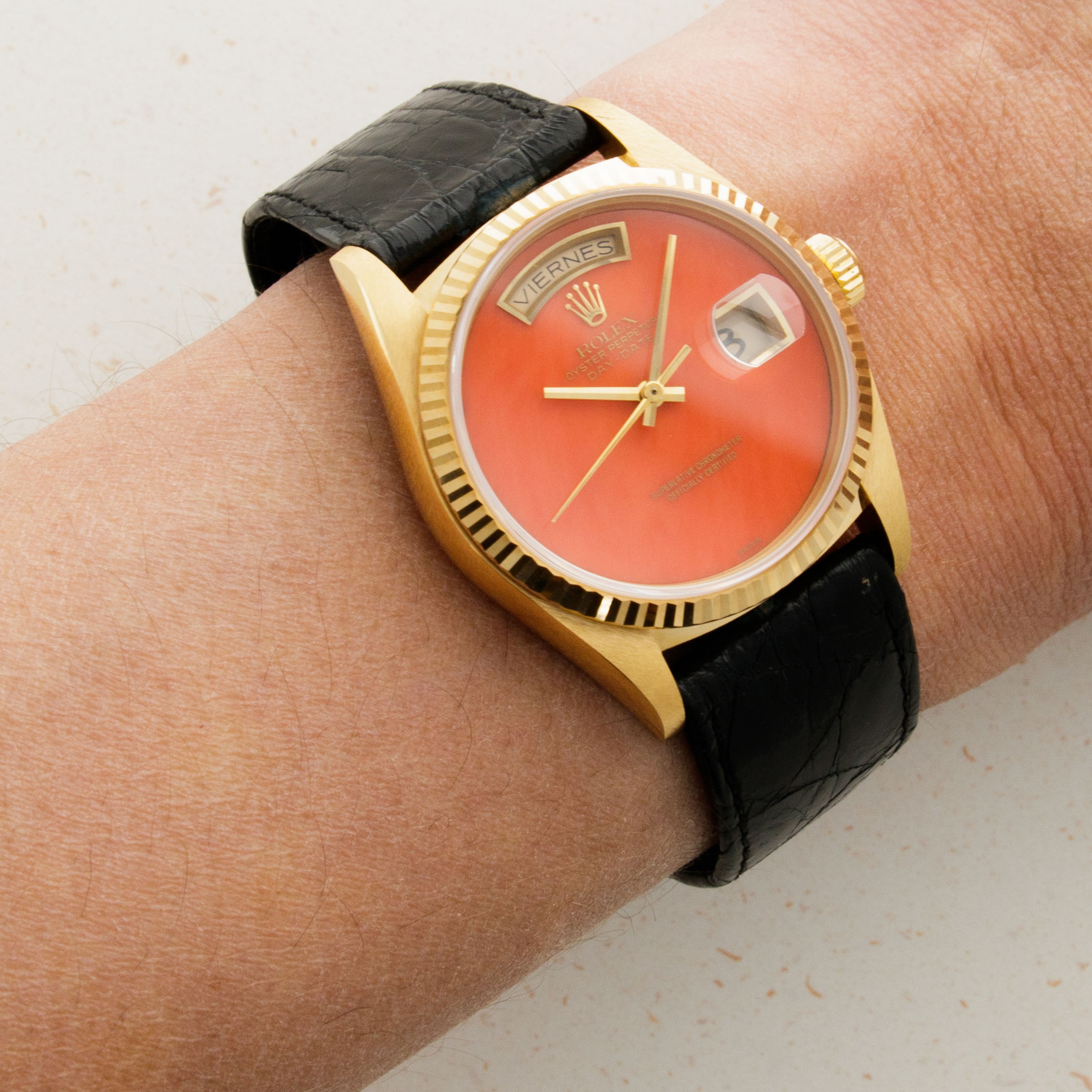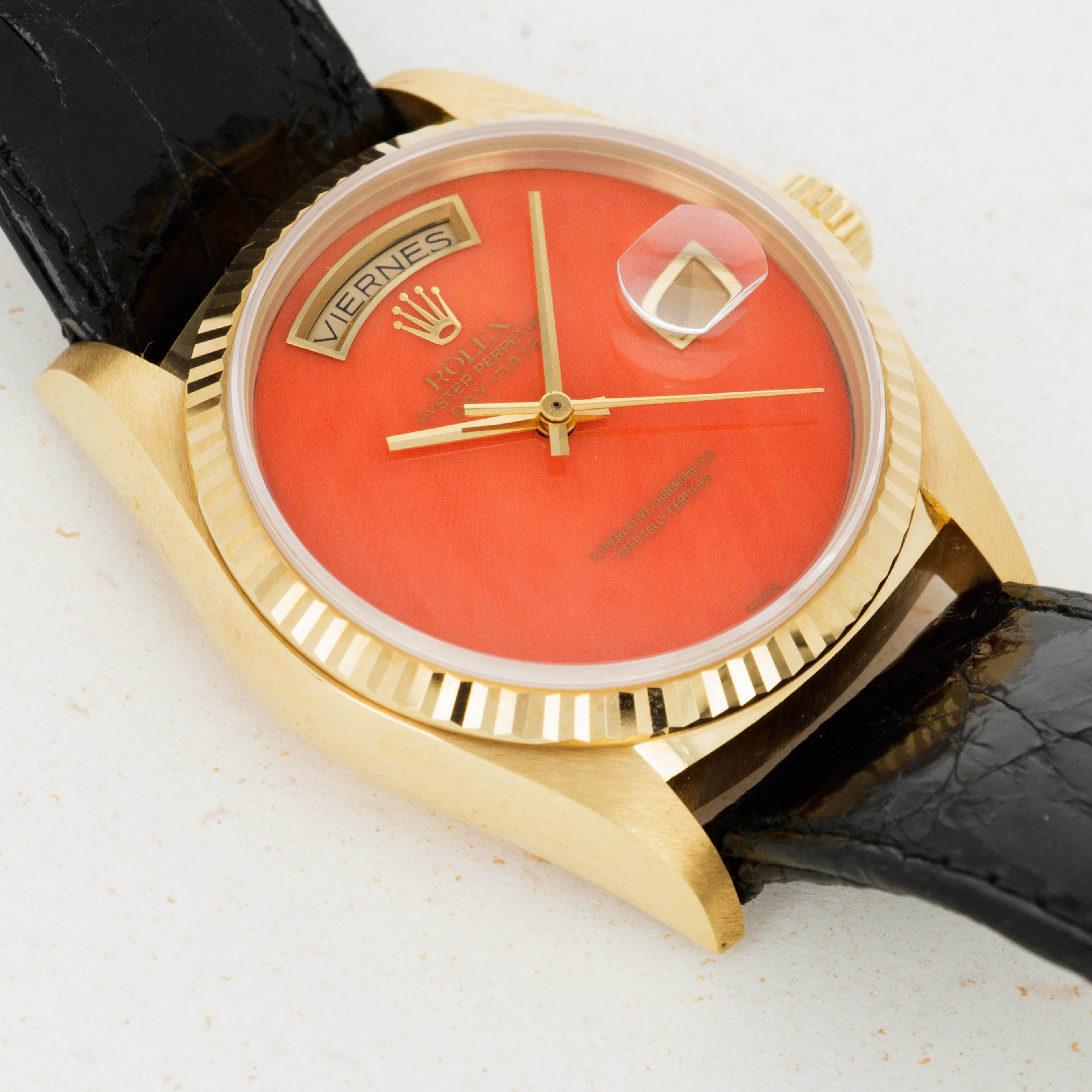 Nicknamed the "Gulda" after Austrian pianist Friederich Gulda who was often spotted wearing his coral Day-Date, this is a legendary and exceptionally rare watch that Rolex collectors dream of getting the chance to own. This particuar watch is the perfect confluence of beauty, rarity, condition and desirability.