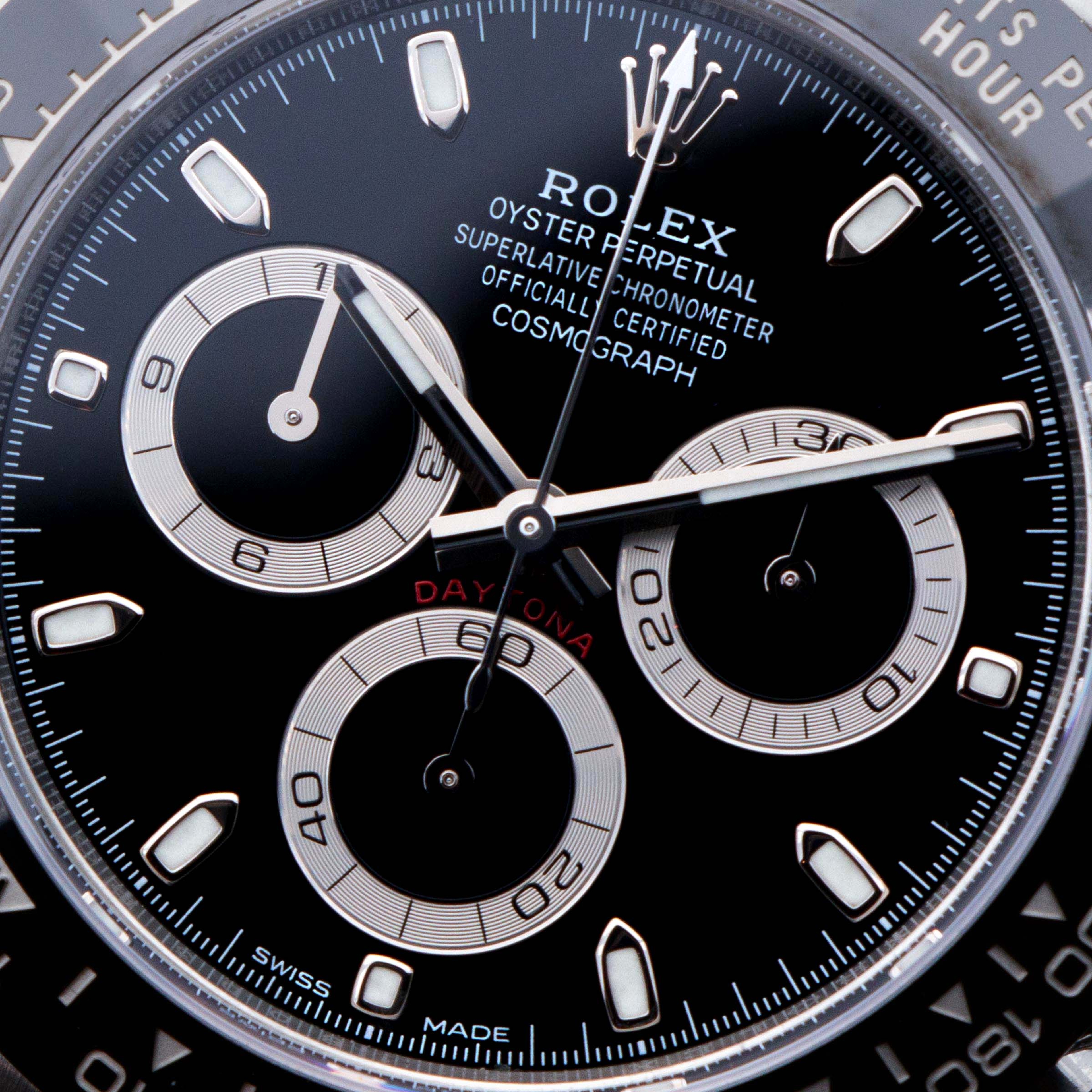 Amongst some of the most recognisable dials in watchmaking, this Daytona sports a jet black dial with silver subdial chapter rings that combine to match its black Cerachrom bezel and stainless steel construction.