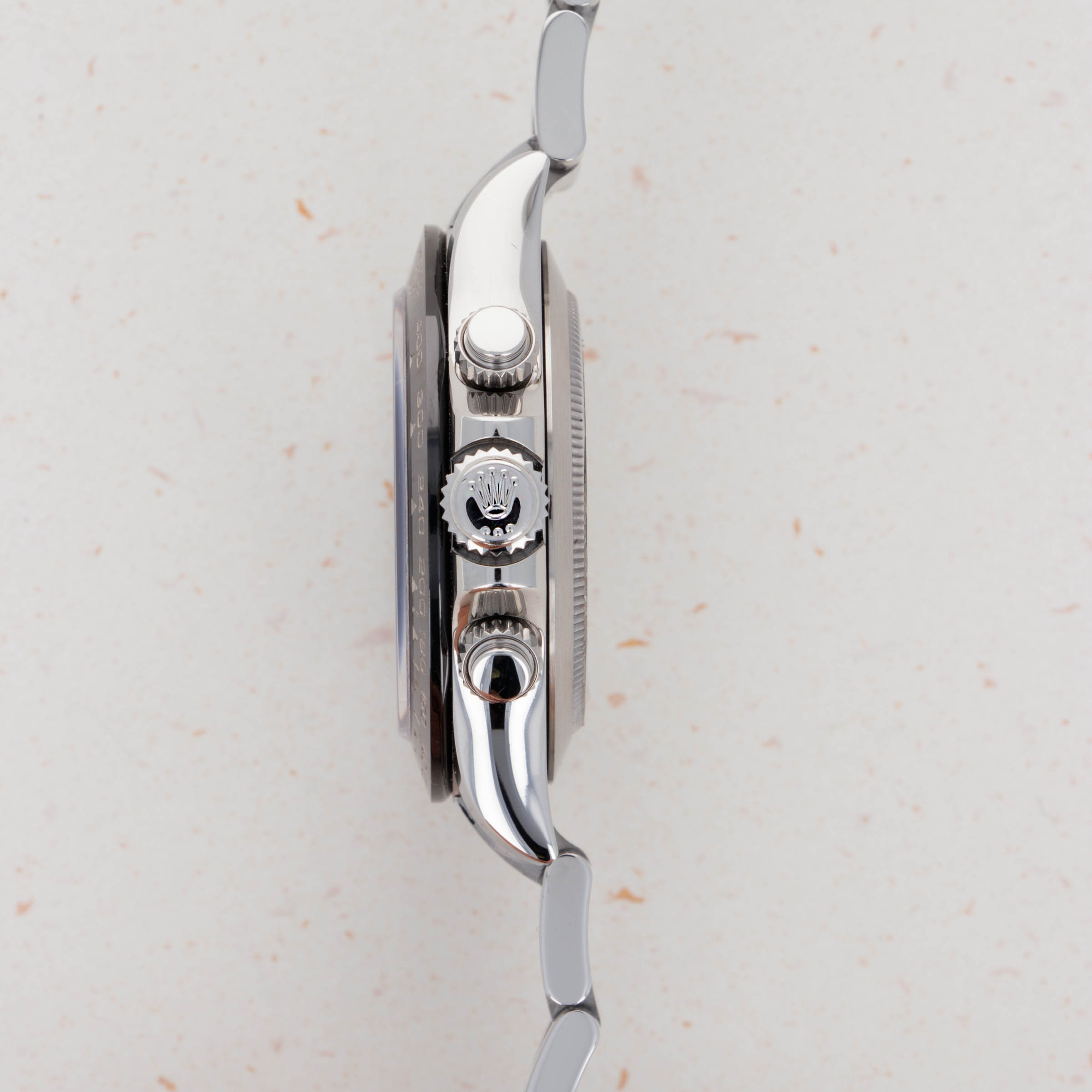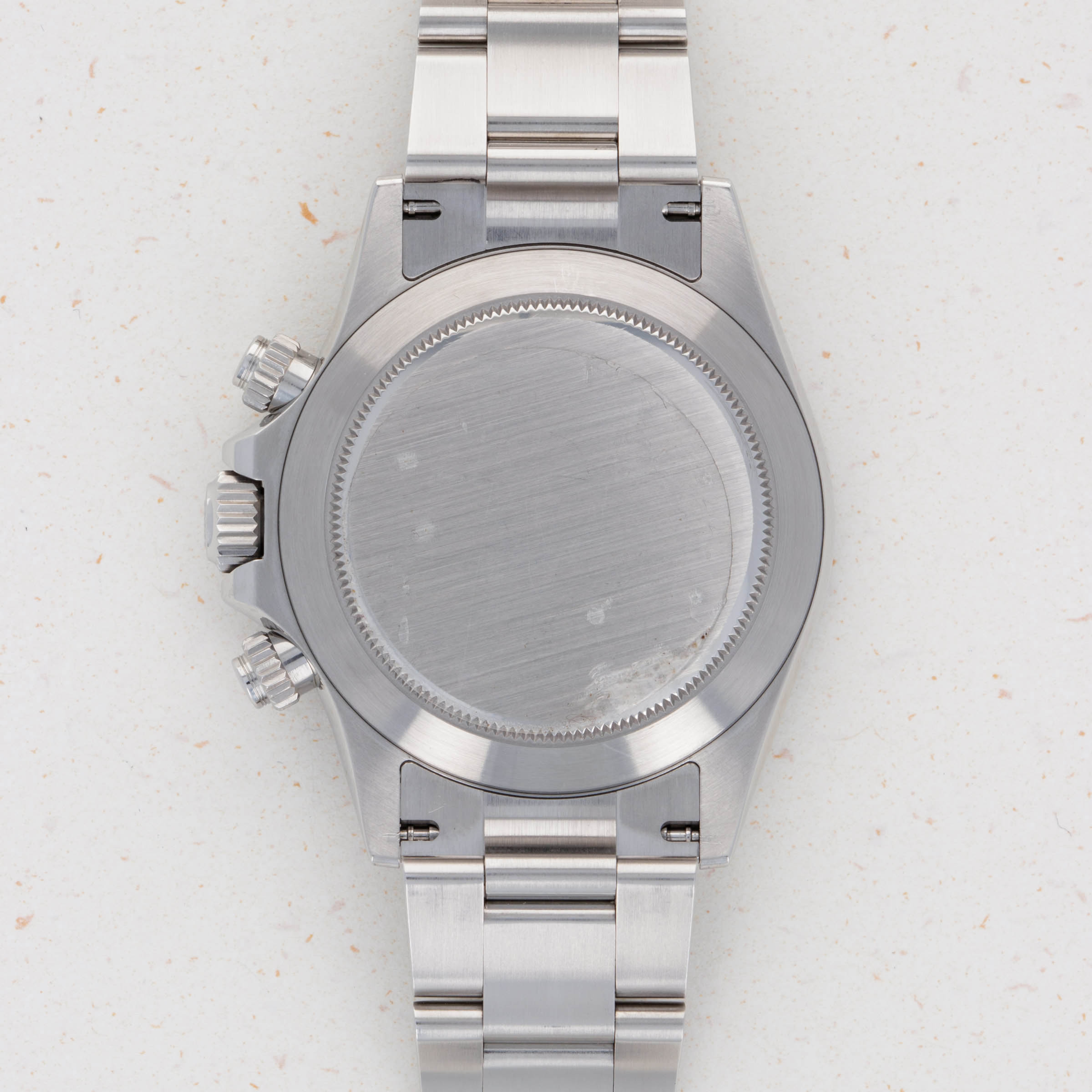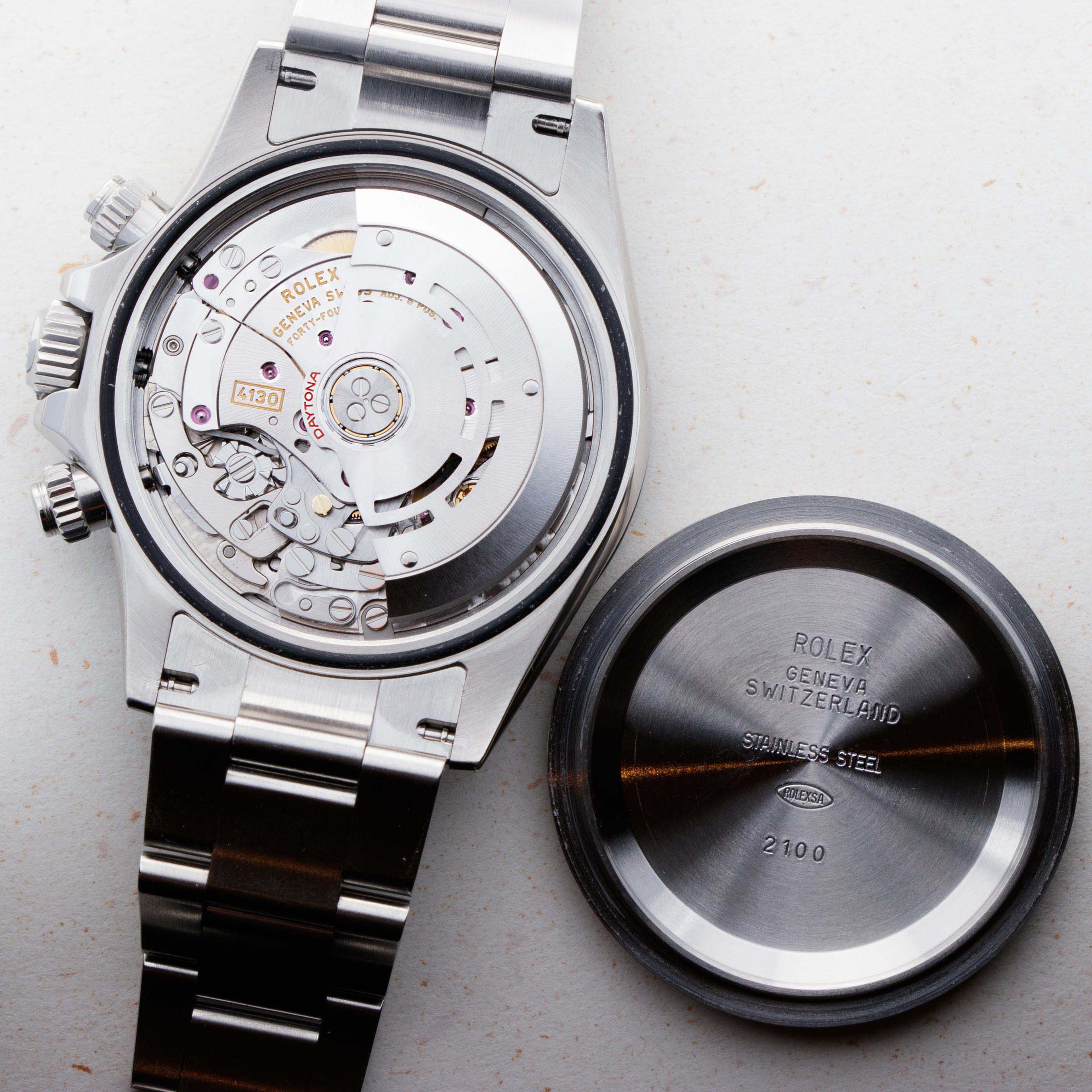 Released in 2000 as a brand new generation of Daytona, Rolex made several subtle changes to the previous “Zenith” Daytona. To begin with, the dial layout had changed slightly, with the running seconds subdial moving from 9 o'clock to 6' clock. Additionally, the subdials were no longer in line with the center of the dial. Instead, they moved up slightly above the middle of the dial (running from 9 to 3 o'clock). Additionally, Rolex gave the new Daytona broader indices to accommodate more lume, longer lugs, and a mirror finish on the case flanks to differentiate the latest generation even further. But, without doubt, the latest generation’s most significant upgrade was Rolex’s new (at the time) in-house automatic cal. 4130 chronograph movement. Designed to be ruthlessly efficient, it has just 201 parts - a 20% decrease on the previous movement, the cal. 4030, making for an even more reliable movement requiring even less servicing. Additionally, with more space free to accommodate a larger mainspring, Rolex increased the cal. 4030's power reserve from 50 to 72 hours in the cal. 4130. All in all, even for a 20+ year old movement, the cal. 4130 is incredible even by today’s standards and fitting for the Daytona’s legendary legacy.