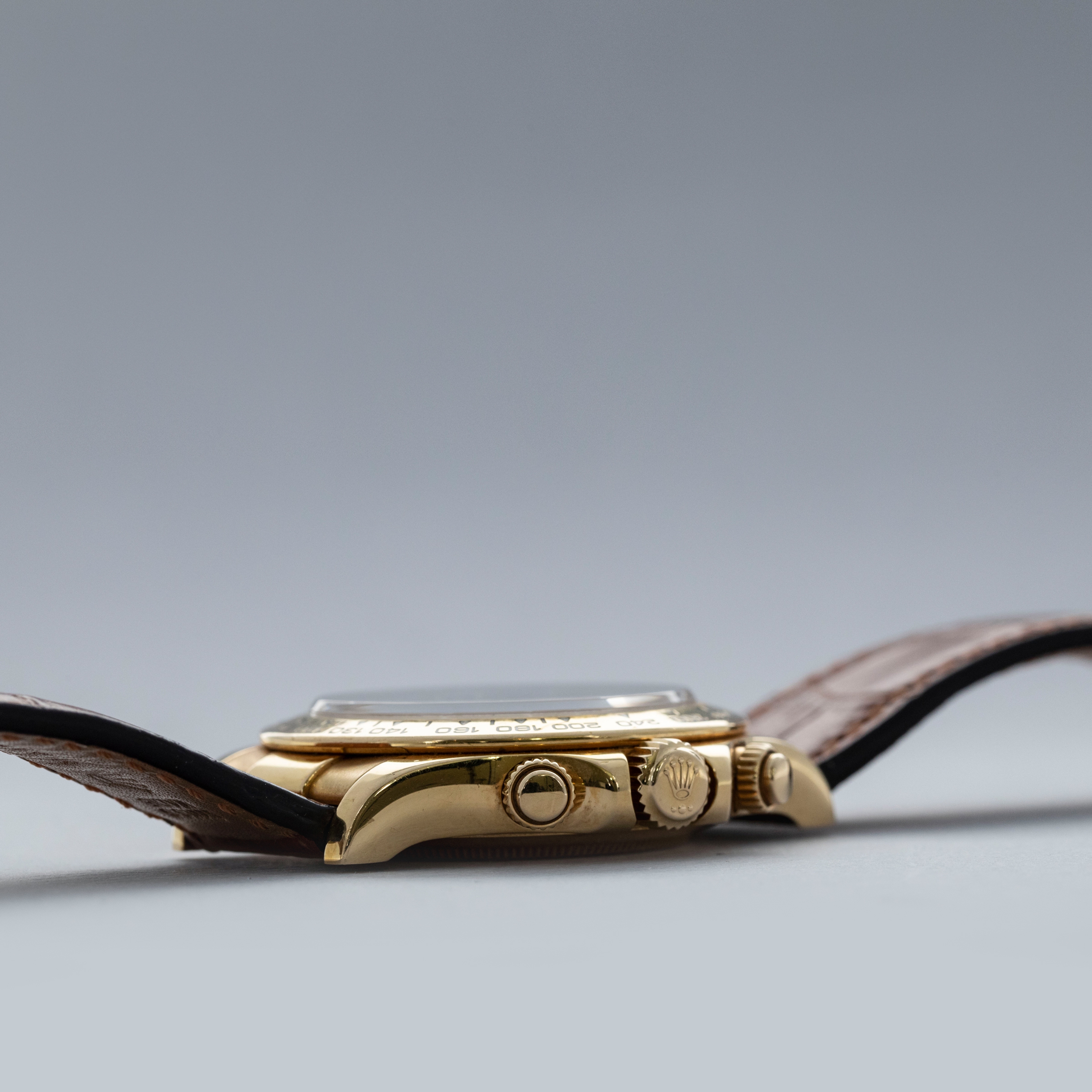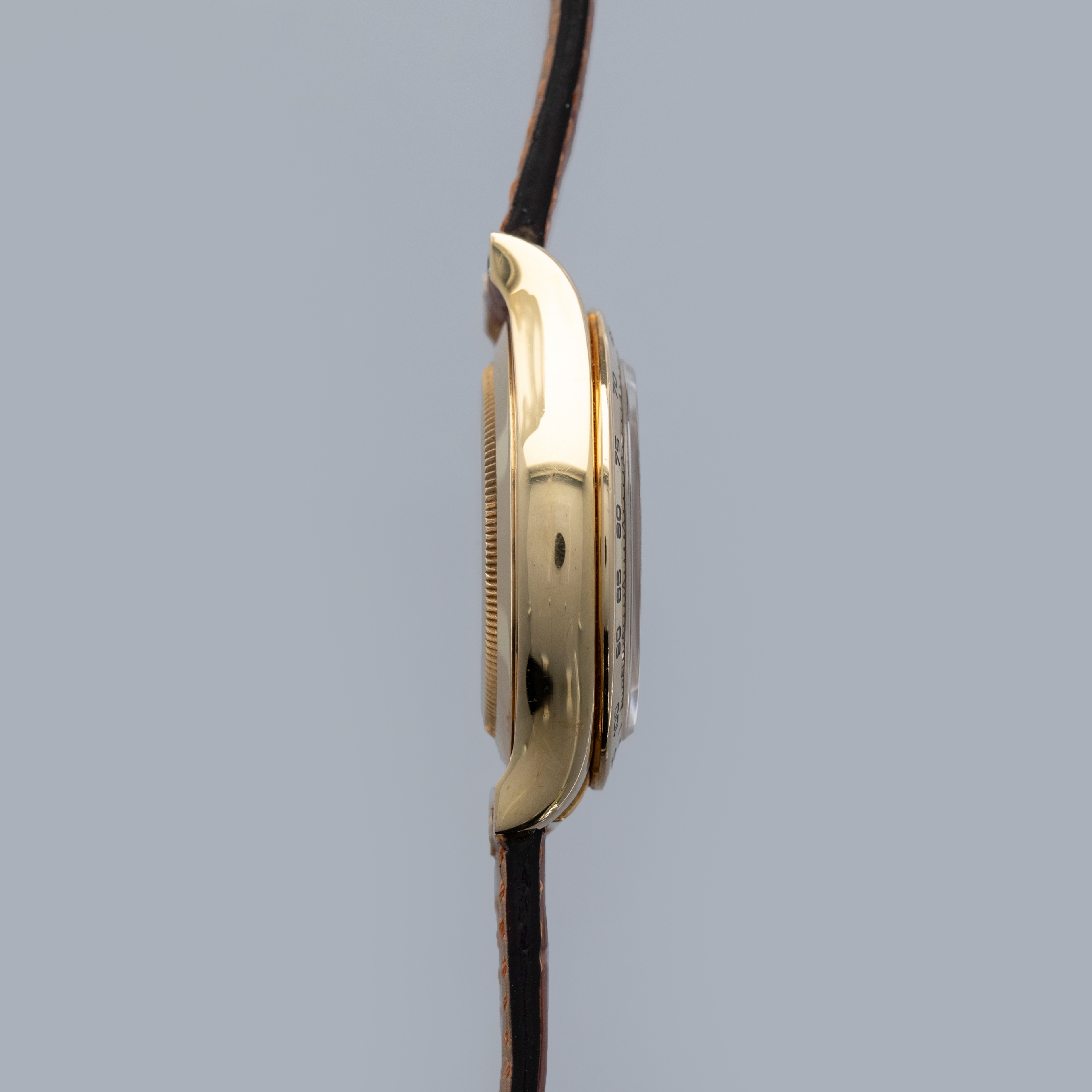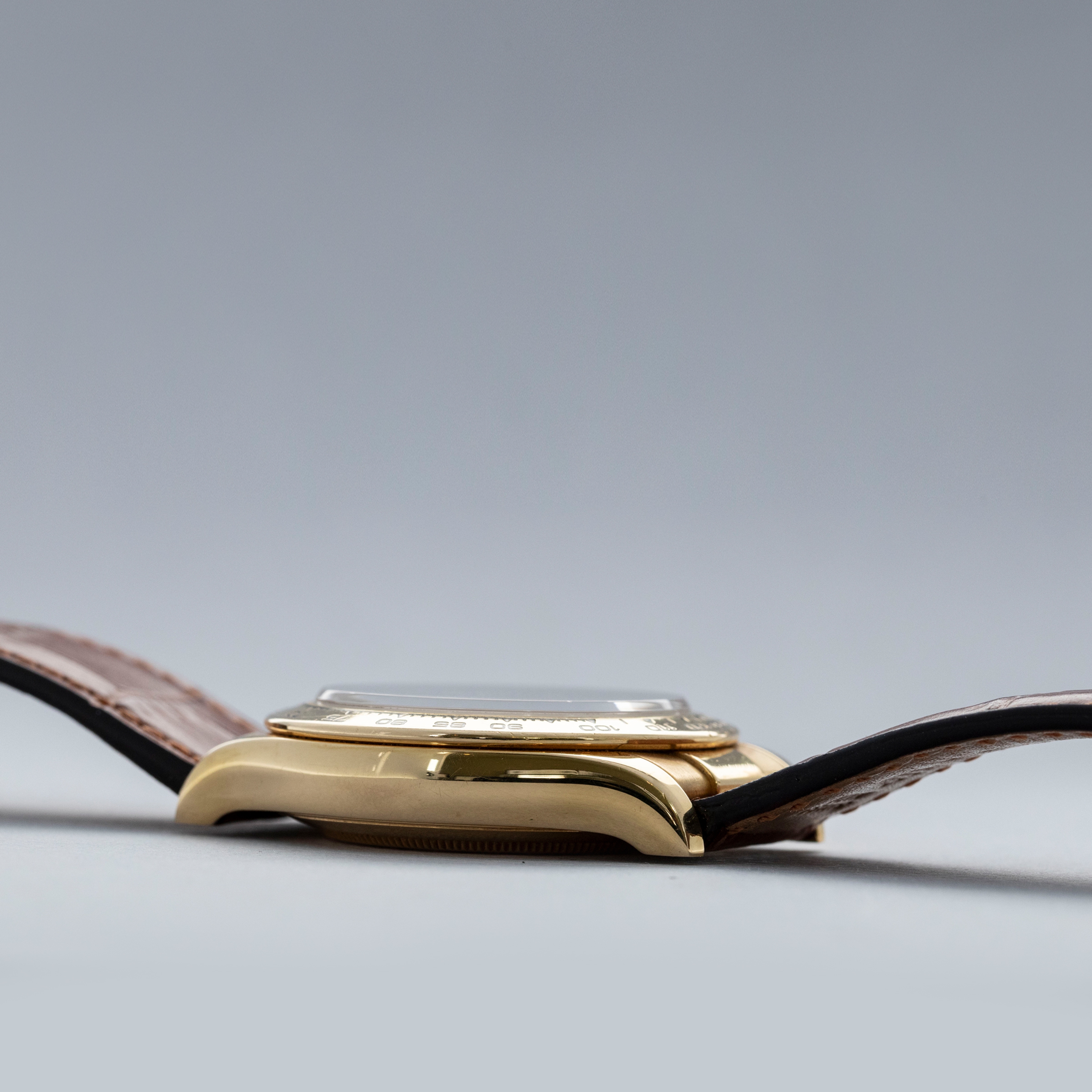 Released in 2000 as a brand new generation of Daytona, the ref. 1165XX featured much of the same unchanged design that the previous “Zenith” Daytona had, except for several relatively minor details. To begin with, the dial layout had changed slightly, so the running seconds subdial went from 9 o'clock to 6' clock, and the subdials were no longer in line with the center of the dial. Instead, they moved up slightly above the middle of the dial (running from 9 to 3 o'clock). Additionally, Rolex gave the new Daytona broader indices to accommodate more lume, longer lugs, and a mirror finish on the case flanks to differentiate the latest generation even further. But, without doubt, the latest generation’s most significant upgrade was Rolex’s new (at the time) in-house automatic cal. 4130 chronograph movement. Designed to be ruthlessly efficient, it has just 201 parts - a 20% decrease on the previous movement, the cal. 4030, making for an even more reliable movement requiring even less servicing. Additionally, with more space free to accommodate a larger mainspring, Rolex increased the cal. 4030's power reserve from 50 to 72 hours in the cal. 4130. All in all, even for a 20+ year old movement, the cal. 4130 is incredible even by today’s standards and fitting for the Daytona’s legendary legacy. This example is a P serial, making it one of the very first examples of the 4130 caliber Rolexes. Offered here we have the ref. 116518, an 18kt yellow gold variant of the Daytona with a gorgeous blue dial. Presented on a leather strap with an 18kt yellow gold Rolex deployant buckle, this variant takes the Daytona’s sporty aesthetic and refines it so as to create a new identity for the Daytona that makes it more classical in its execution.