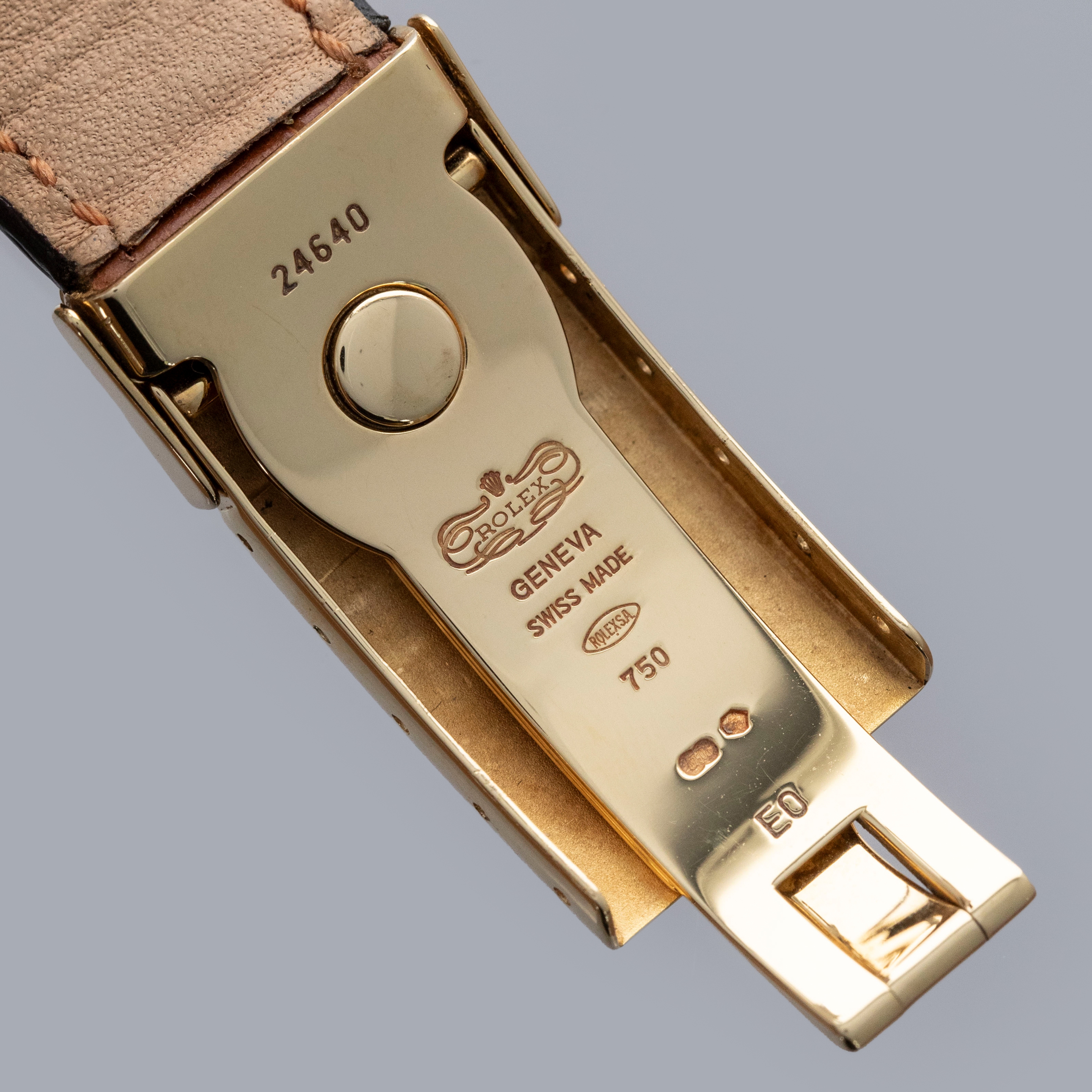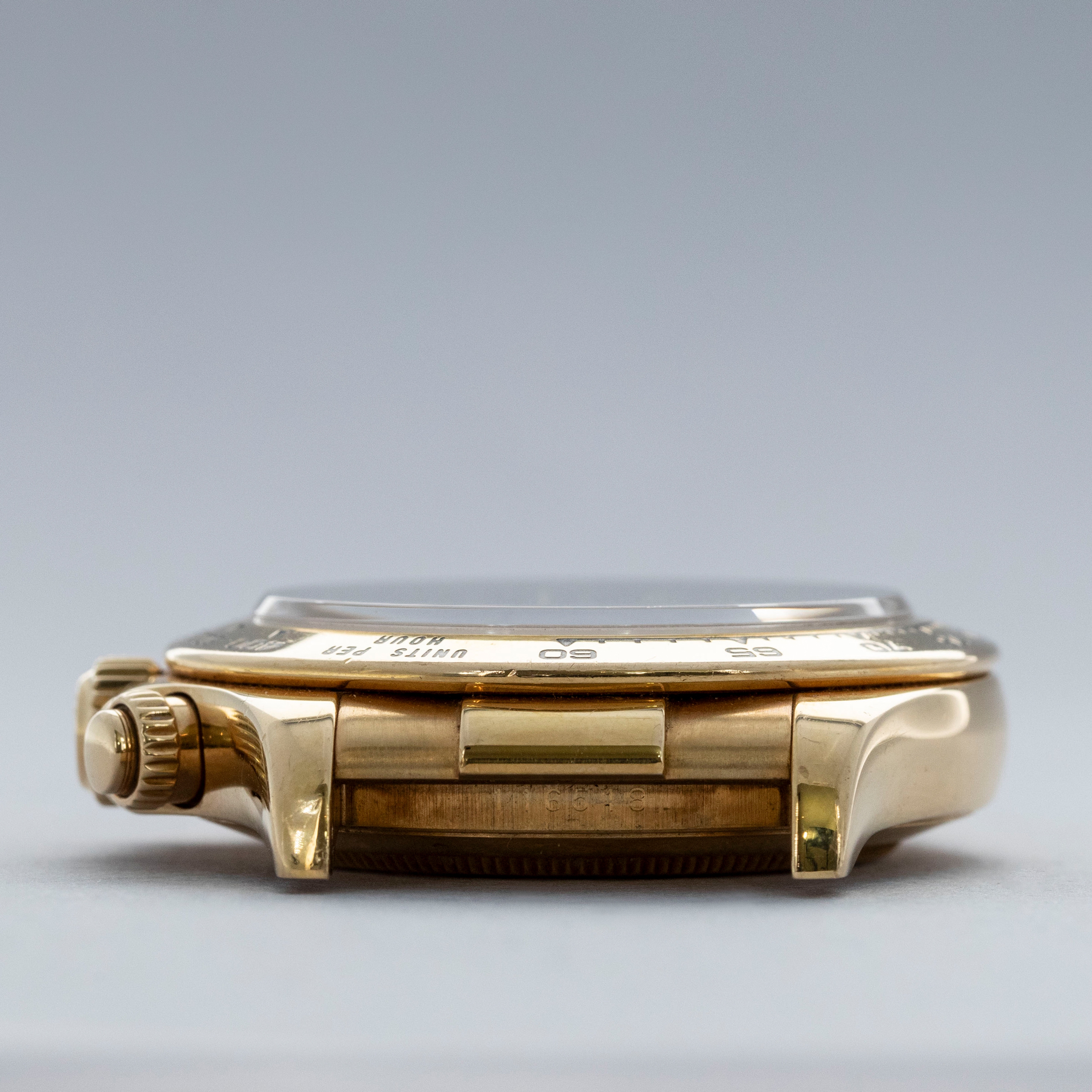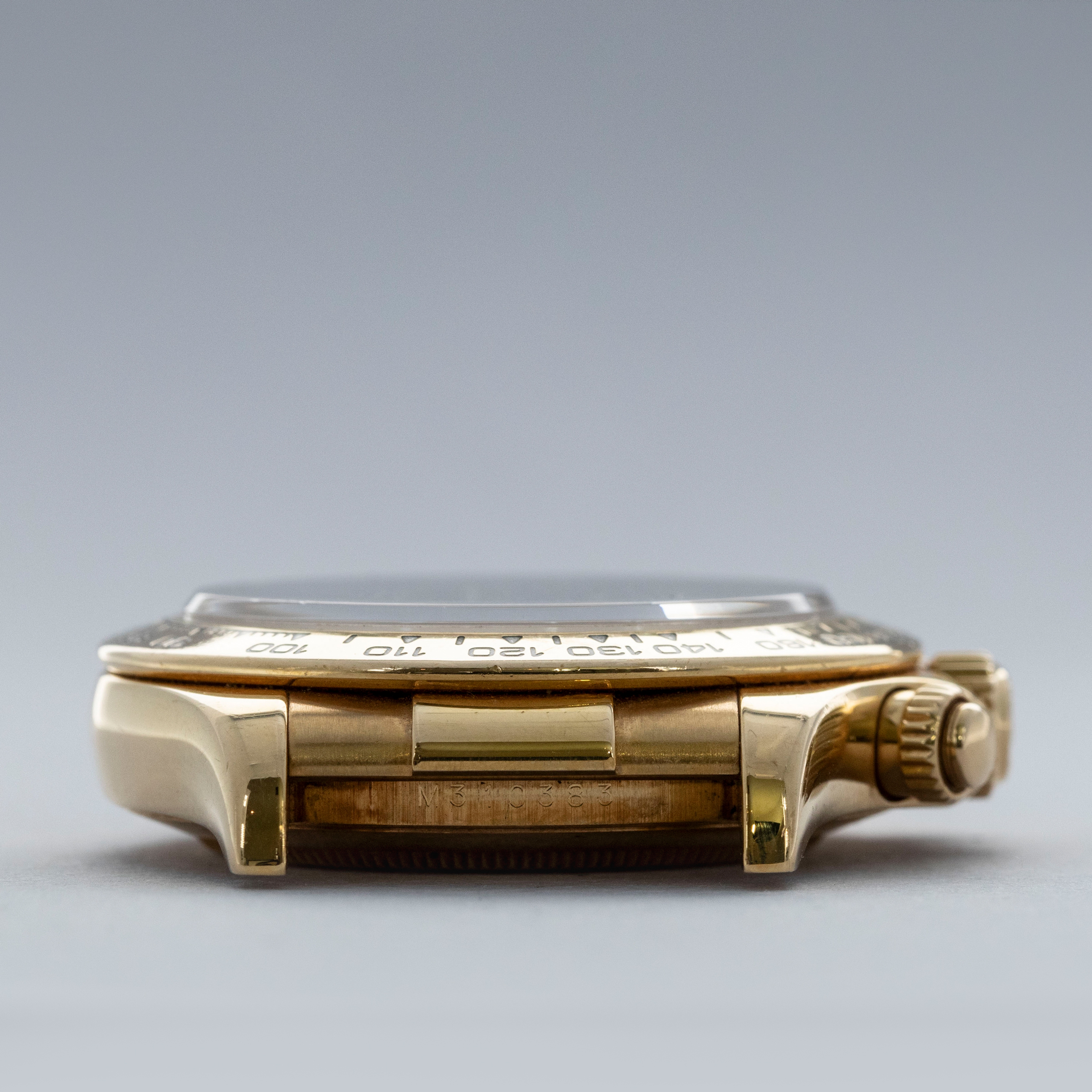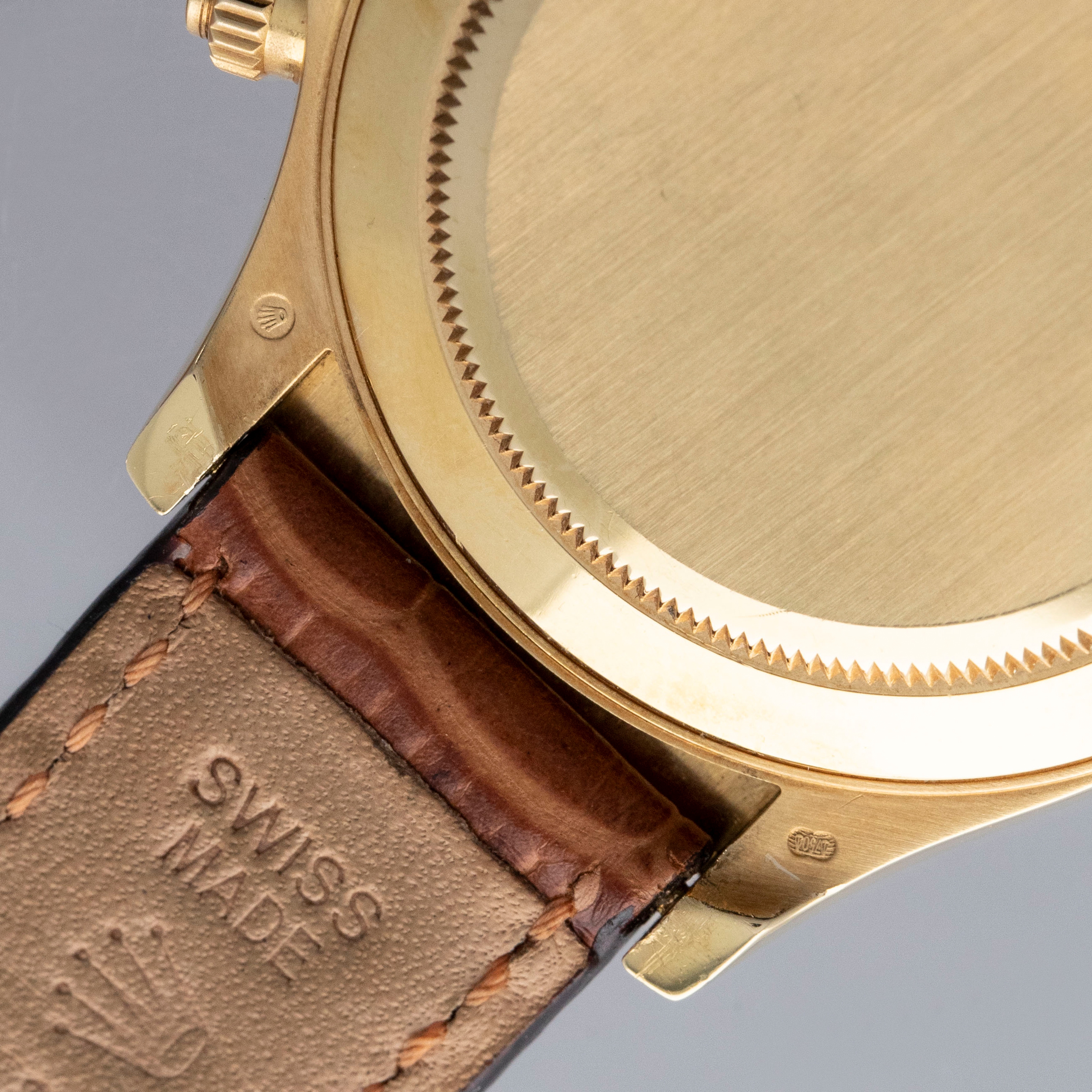 Released in 2000 as a brand new generation of Daytona, the ref. 1165XX featured much of the same unchanged design that the previous “Zenith” Daytona had, except for several relatively minor details. To begin with, the dial layout had changed slightly, so the running seconds subdial went from 9 o'clock to 6' clock, and the subdials were no longer in line with the center of the dial. Instead, they moved up slightly above the middle of the dial (running from 9 to 3 o'clock). Additionally, Rolex gave the new Daytona broader indices to accommodate more lume, longer lugs, and a mirror finish on the case flanks to differentiate the latest generation even further. But, without doubt, the latest generation’s most significant upgrade was Rolex’s new (at the time) in-house automatic cal. 4130 chronograph movement. Designed to be ruthlessly efficient, it has just 201 parts - a 20% decrease on the previous movement, the cal. 4030, making for an even more reliable movement requiring even less servicing. Additionally, with more space free to accommodate a larger mainspring, Rolex increased the cal. 4030's power reserve from 50 to 72 hours in the cal. 4130. All in all, even for a 20+ year old movement, the cal. 4130 is incredible even by today’s standards and fitting for the Daytona’s legendary legacy. This example is a P serial, making it one of the very first examples of the 4130 caliber Rolexes. Offered here we have the ref. 116518, an 18kt yellow gold variant of the Daytona with a gorgeous blue dial. Presented on a leather strap with an 18kt yellow gold Rolex deployant buckle, this variant takes the Daytona’s sporty aesthetic and refines it so as to create a new identity for the Daytona that makes it more classical in its execution.