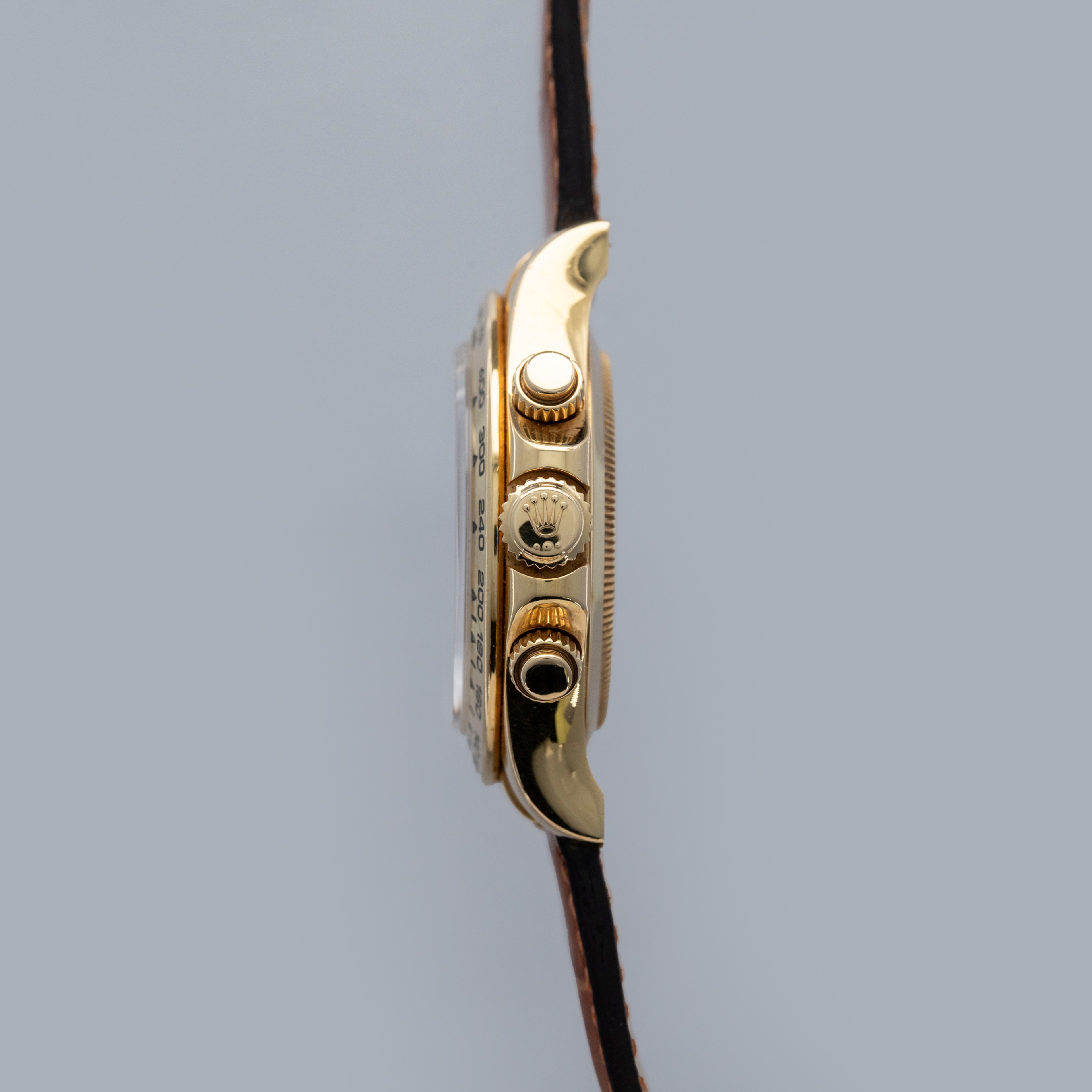 Made of 18kt yellow gold and offered on a leather strap, this ref 116518 variant adds a dressier elegance to the Daytona's design than we typically see when it is paired with its typical Oyster bracelet.