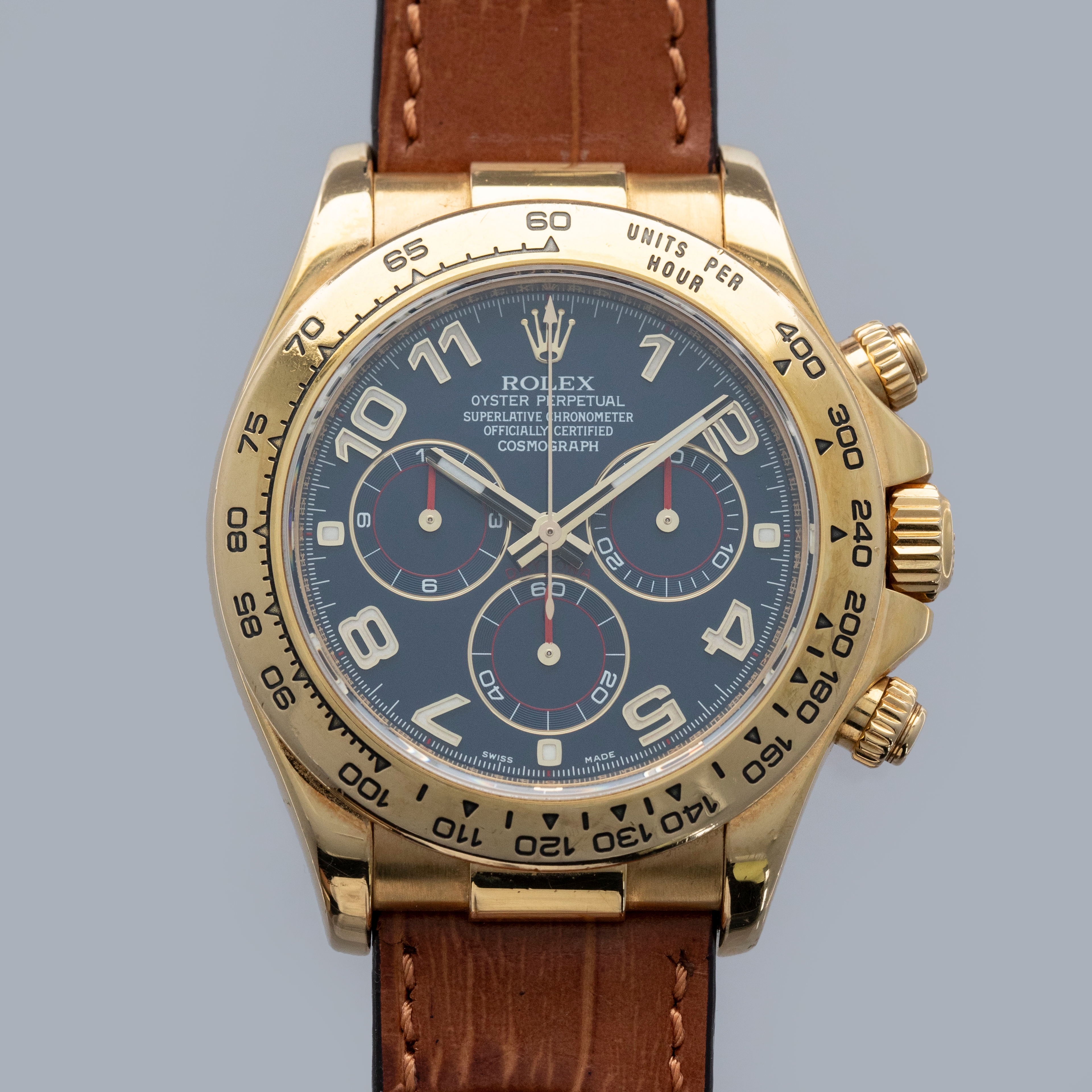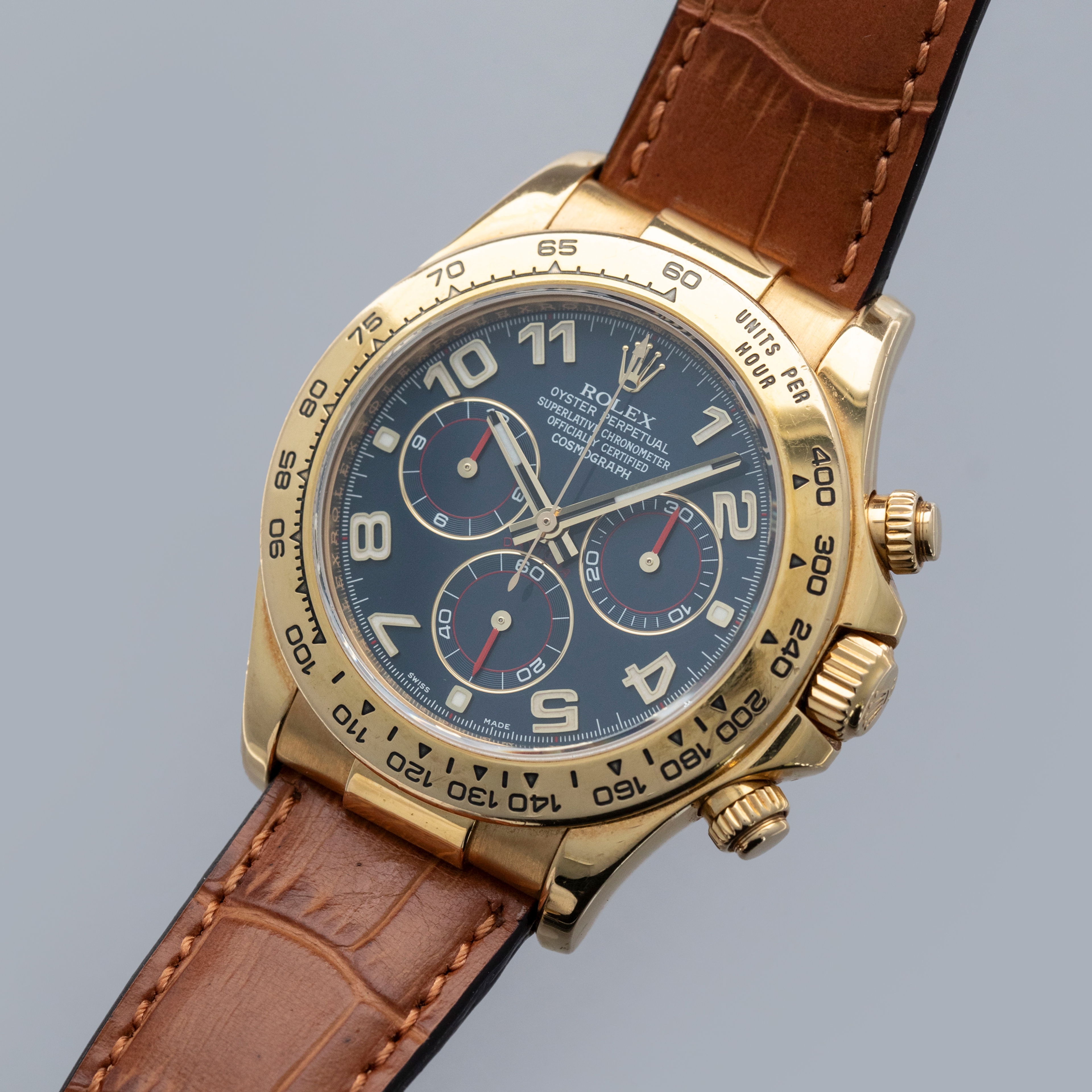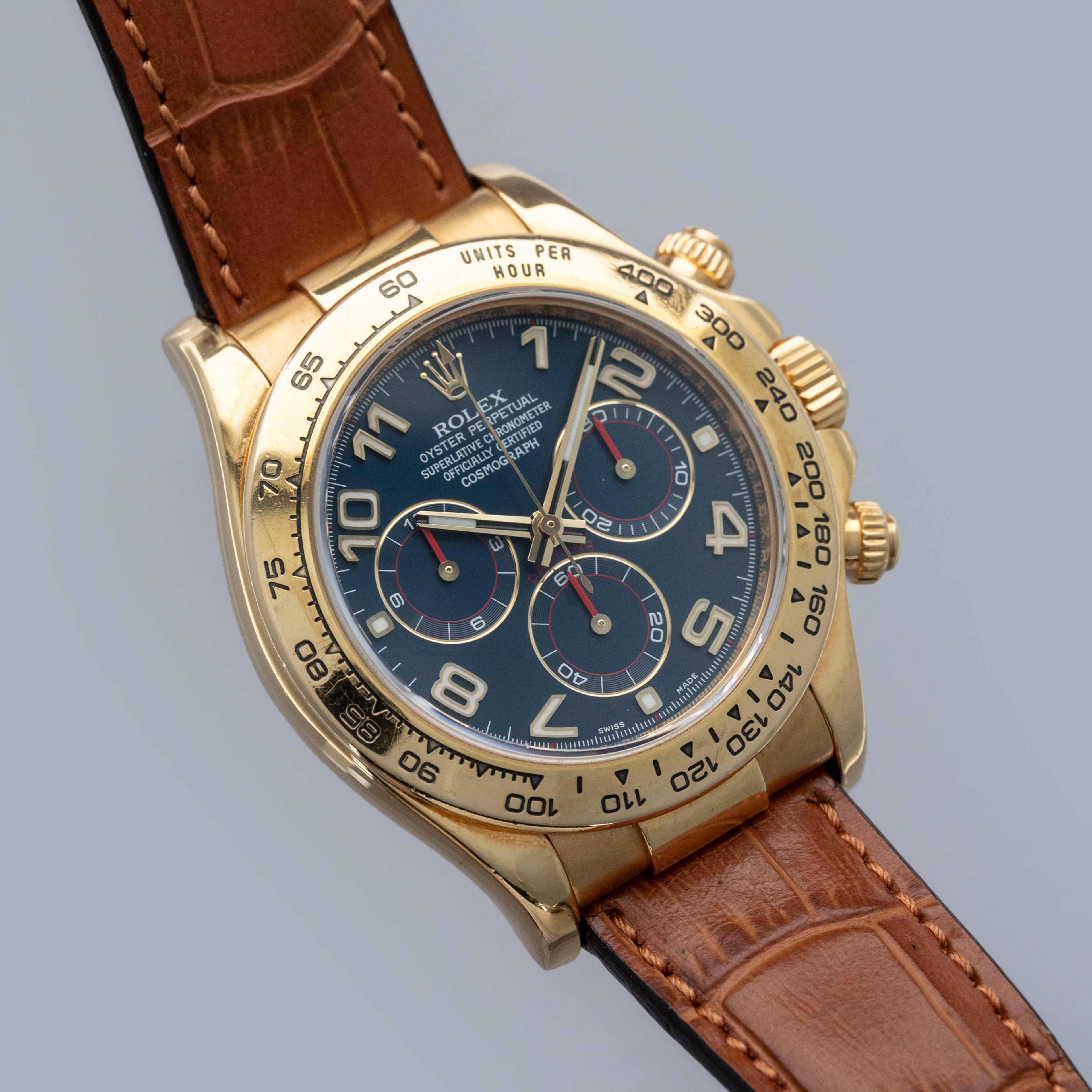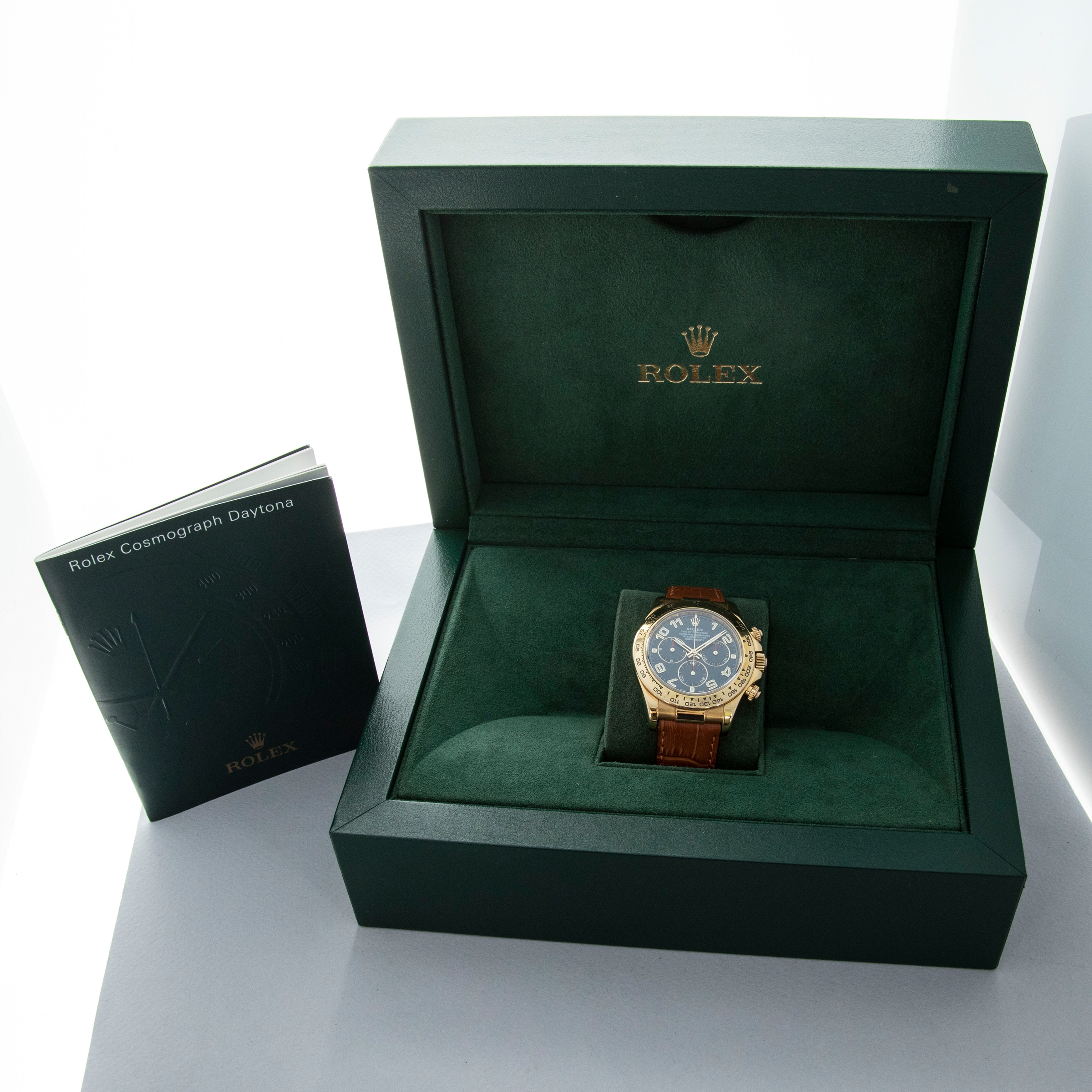 The watch is overall in very good condition. The yellow gold case has some scratches and light nicks, with a clean case back showing light signs of wear. The hallmarks are generally well defined, though there is some wear to the Rolex coronet hallmark. The bezel has some nicks around the edges and some of the enamel has worn away in the tachymeter scale. The blue dial and hands are in excellent condition. The watch is fitted with a brown Rolex alligator strap and a yellow gold deployant clasp in very good condition. It is accompanied by a period correct Daytona booklet and a later Rolex box.