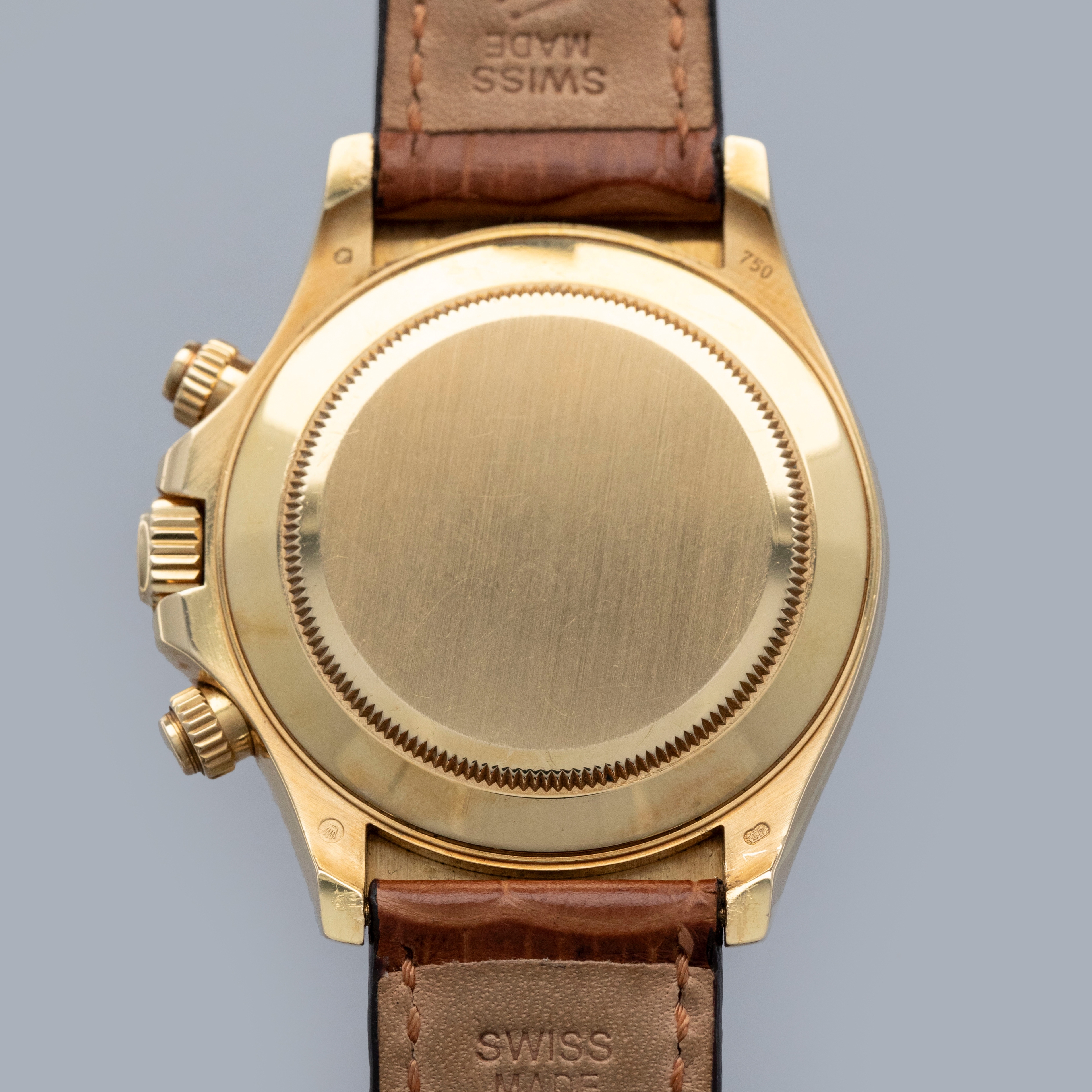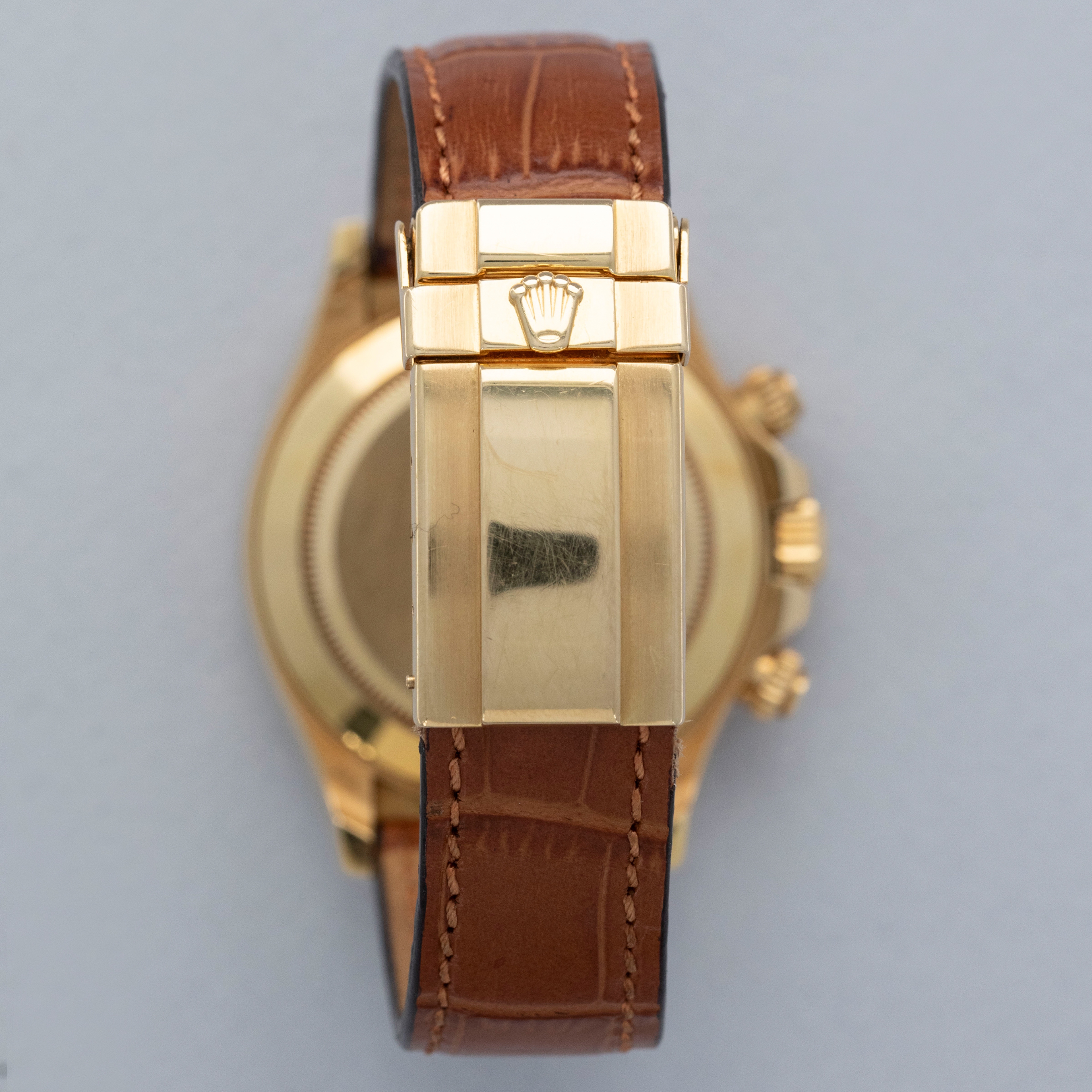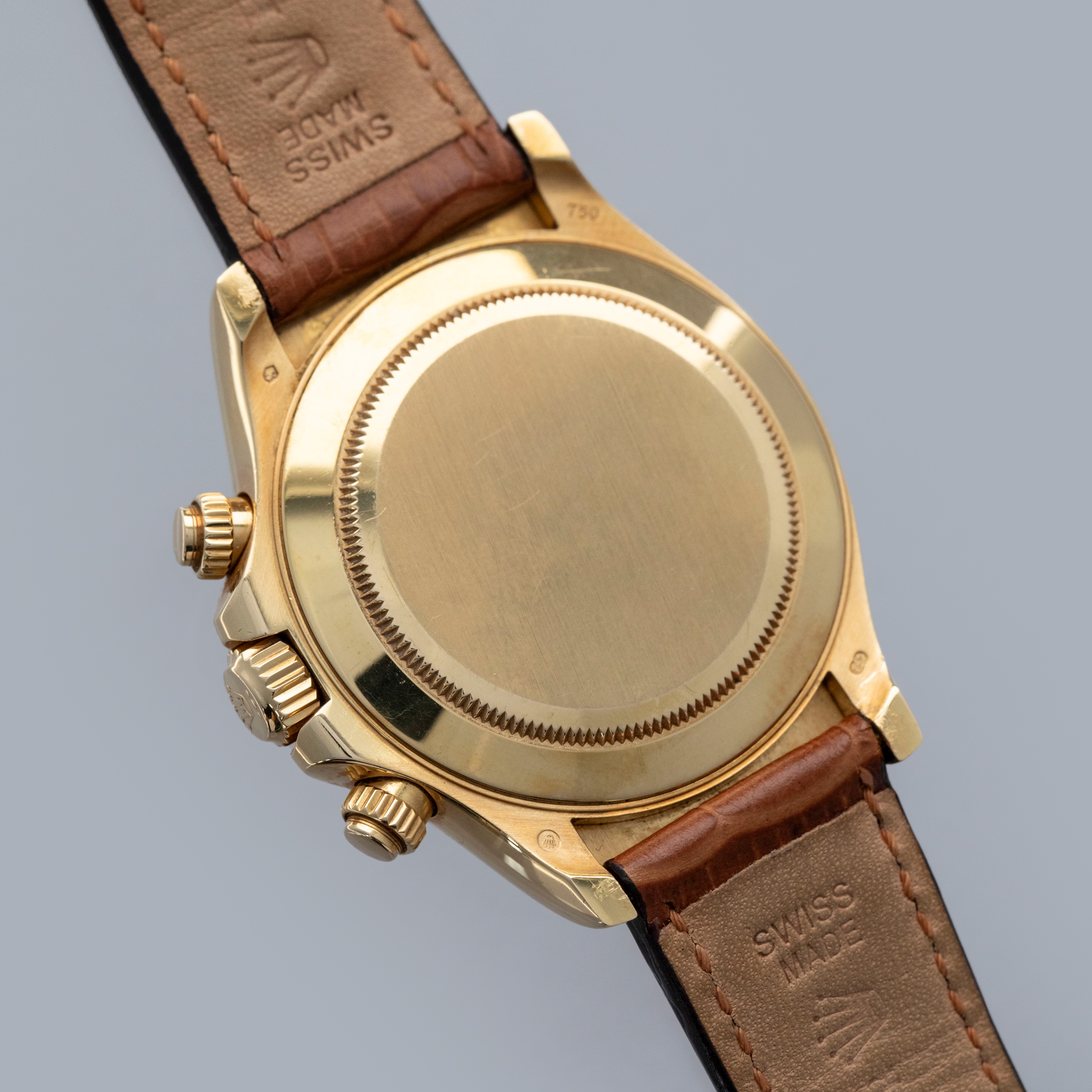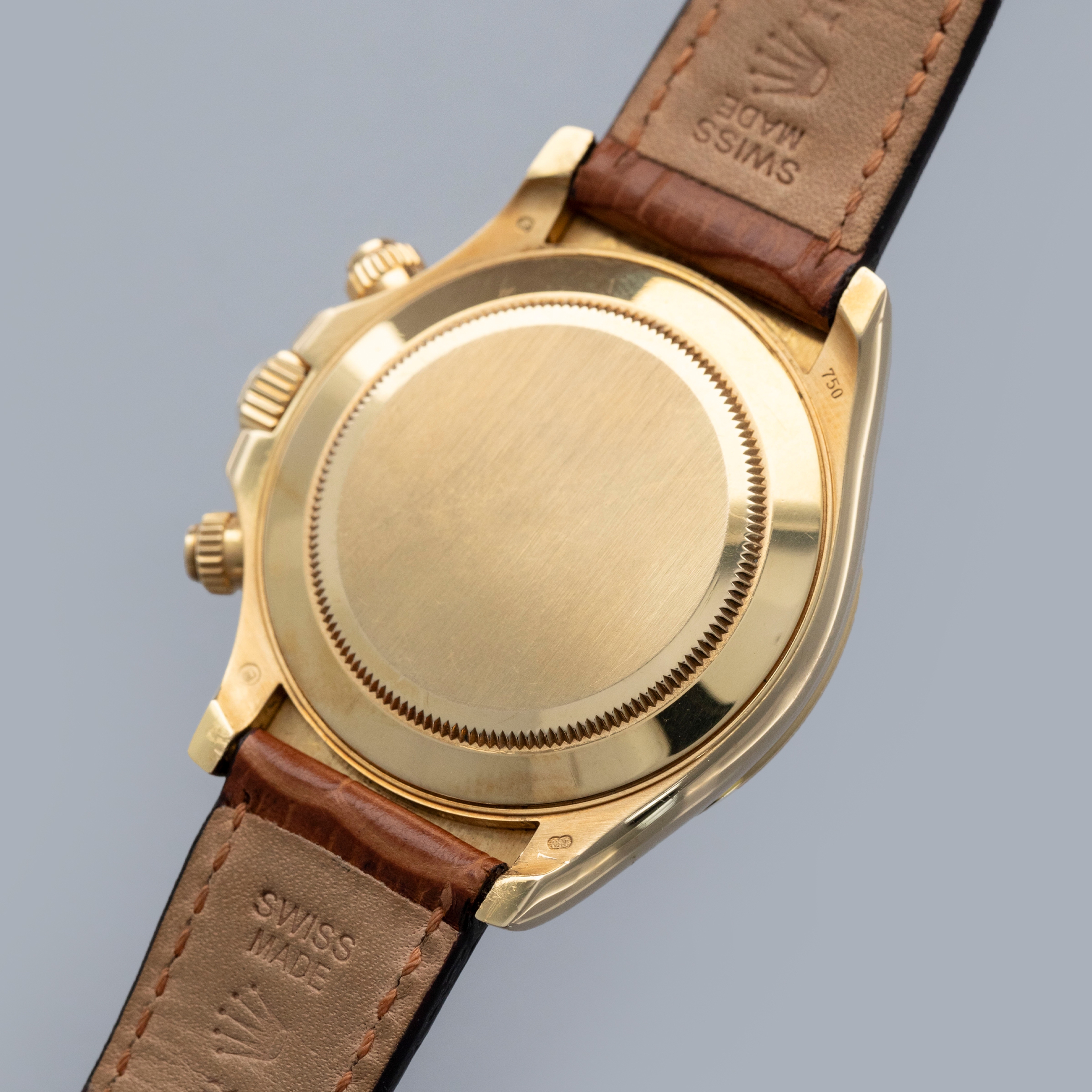 The watch is overall in very good condition. The yellow gold case has some scratches and light nicks, with a clean case back showing light signs of wear. The hallmarks are generally well defined, though there is some wear to the Rolex coronet hallmark. The bezel has some nicks around the edges and some of the enamel has worn away in the tachymeter scale. The blue dial and hands are in excellent condition. The watch is fitted with a brown Rolex alligator strap and a yellow gold deployant clasp in very good condition. It is accompanied by a period correct Daytona booklet and a later Rolex box.