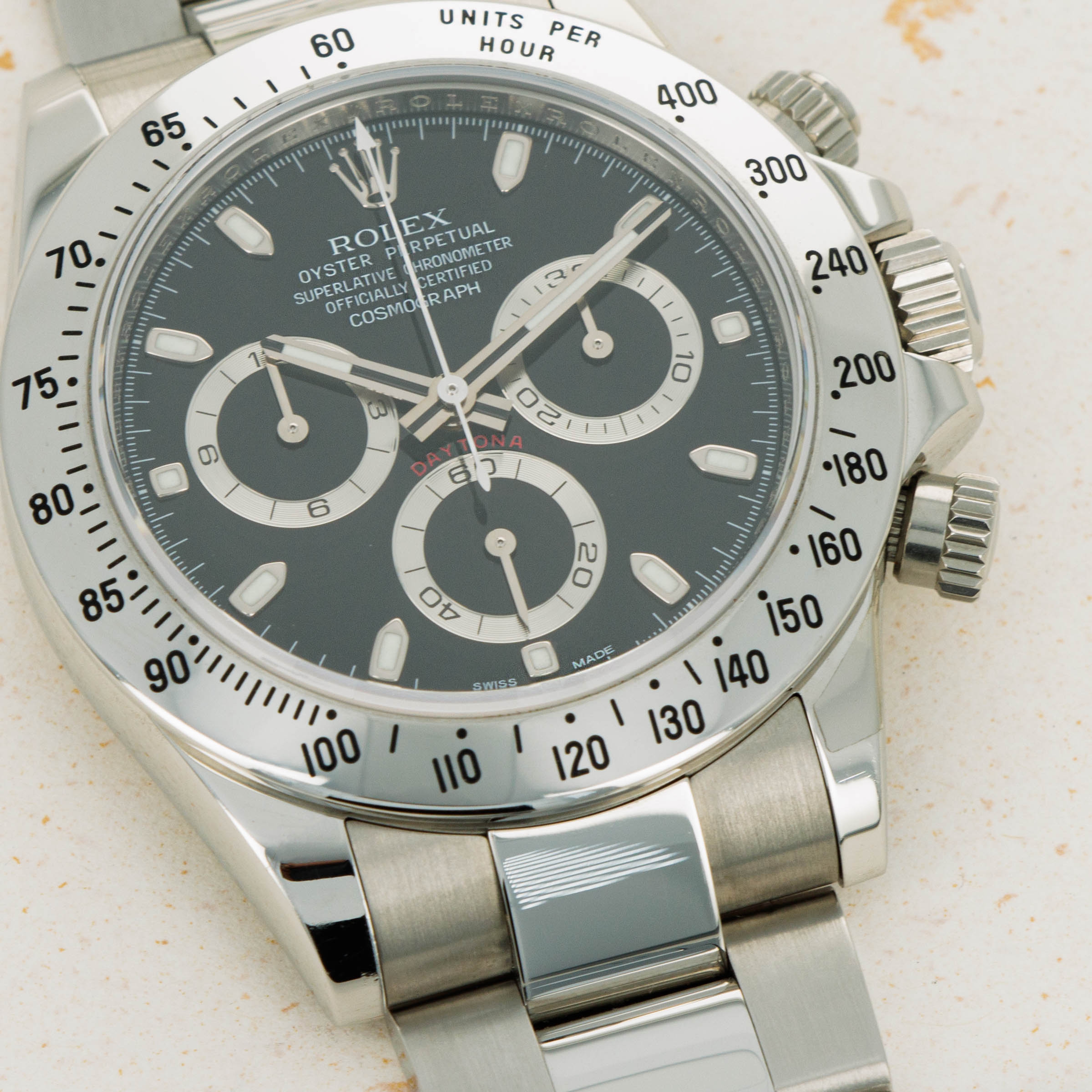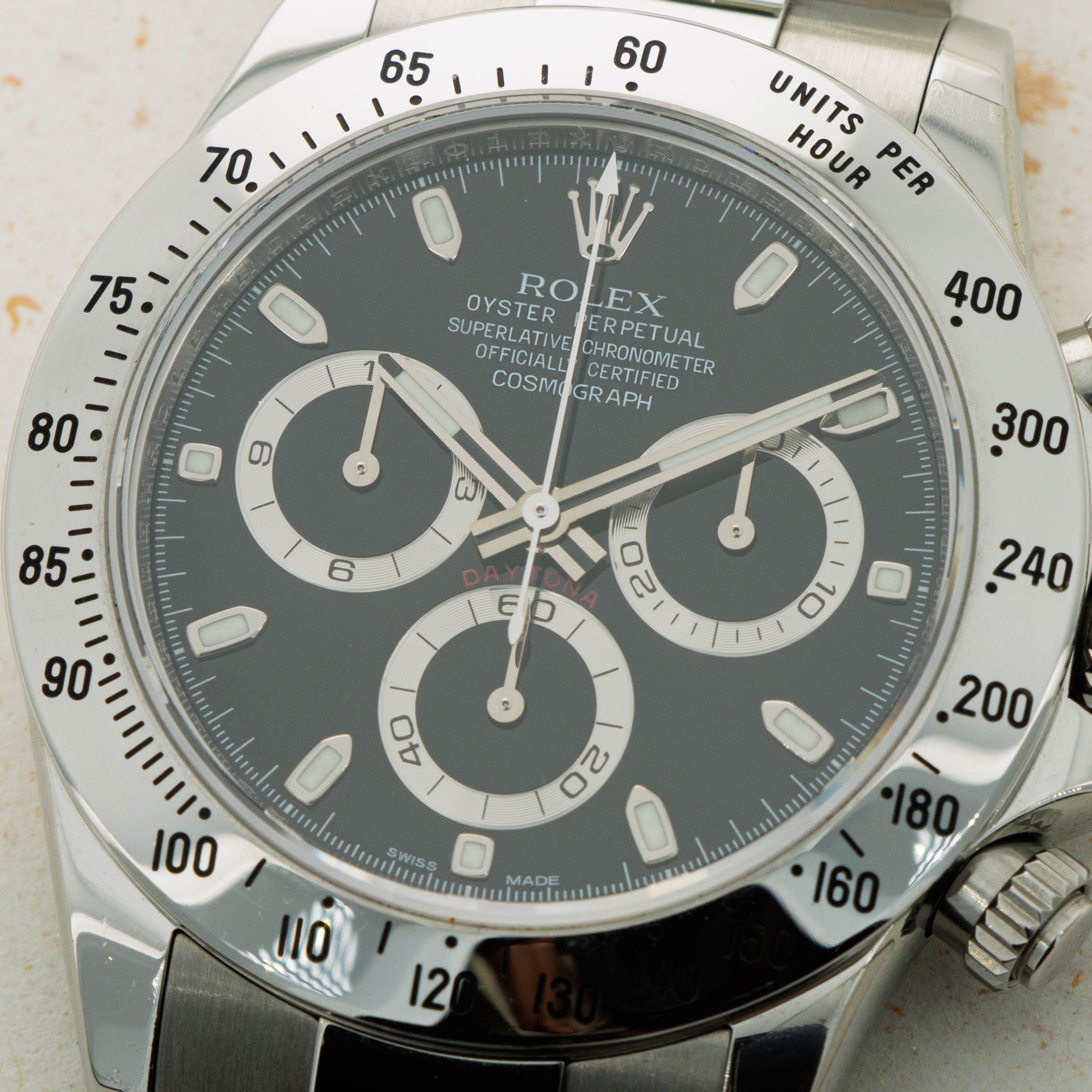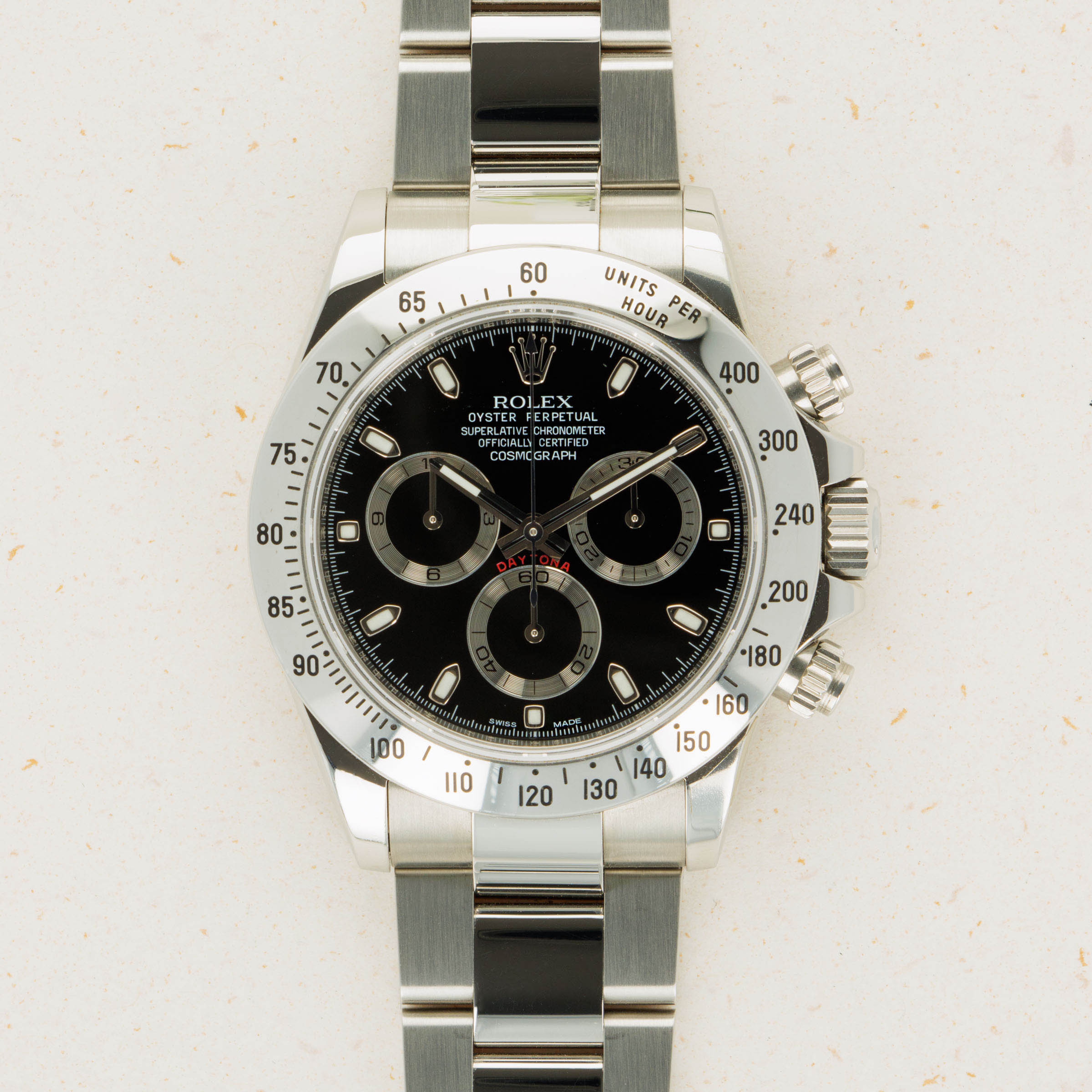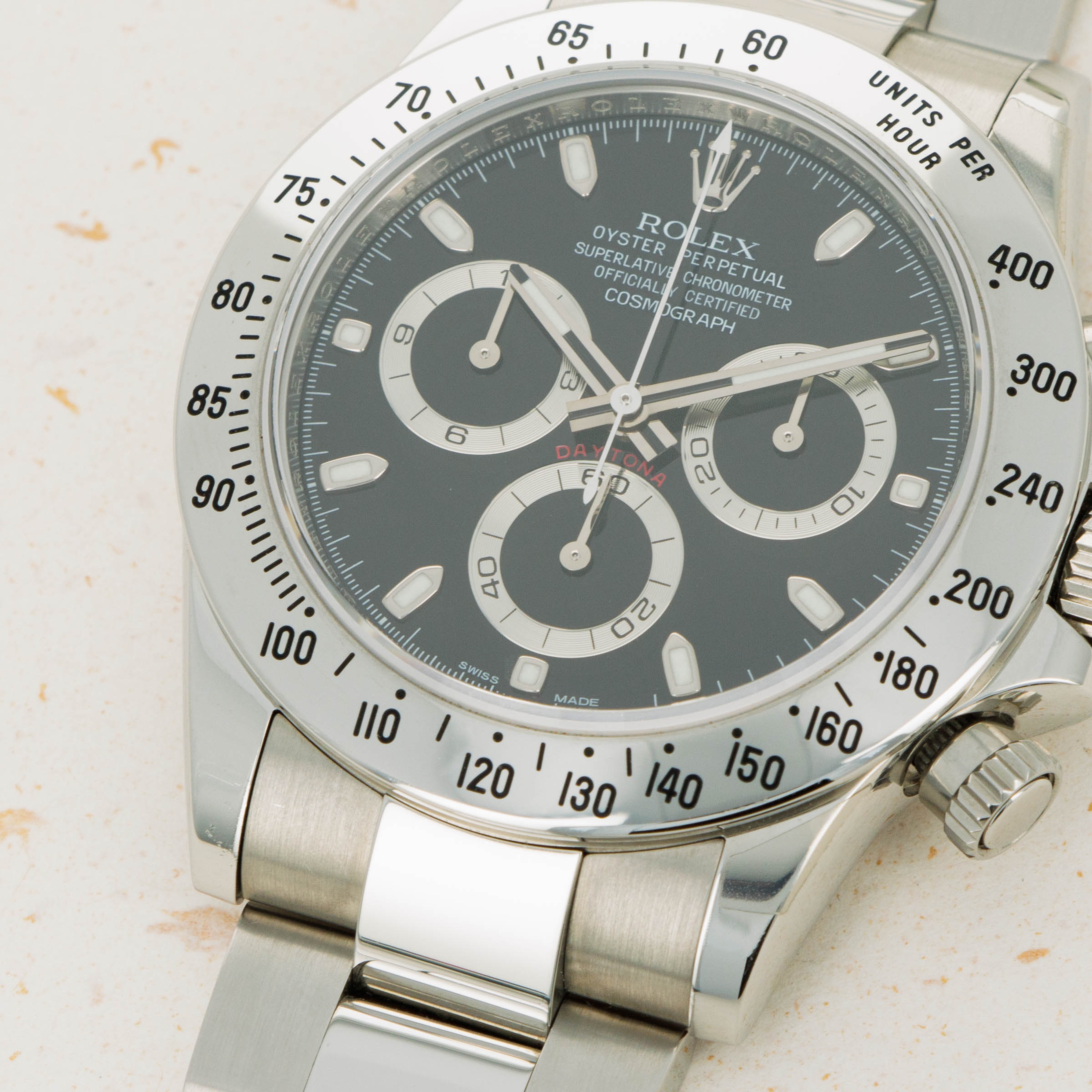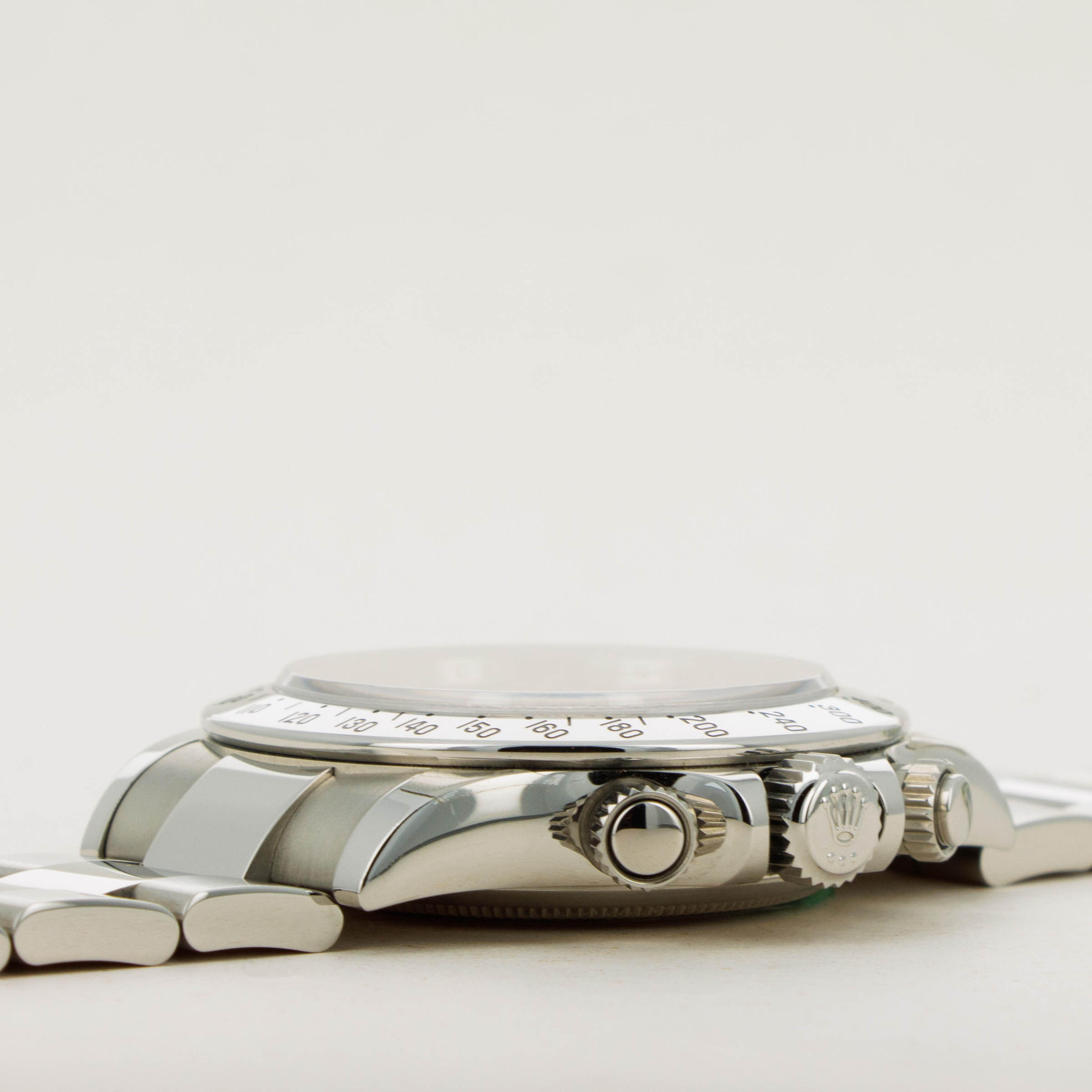 Featuring one of the most recognizable dials in all of watchmaking, the ref. 116520 sports silver subdials and 18kt white gold applied indices and hands which sit atop its black dial and reflect the aesthetic of its famed stainless steel construction.
