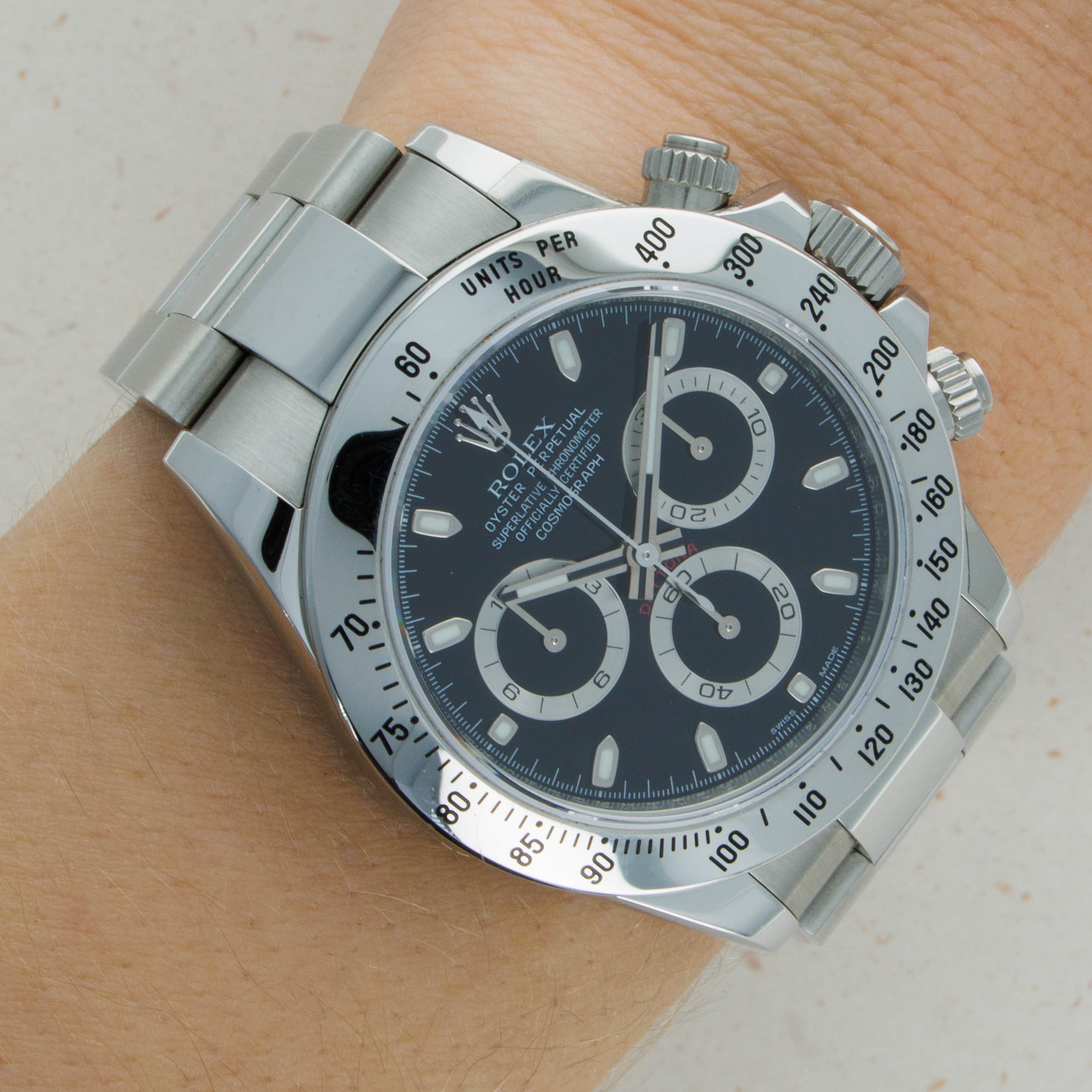 Measuring 40mm in diameter, the Daytona wears on the wrist with a comfortable familiarity that enables almost anyone to easily pull it off.