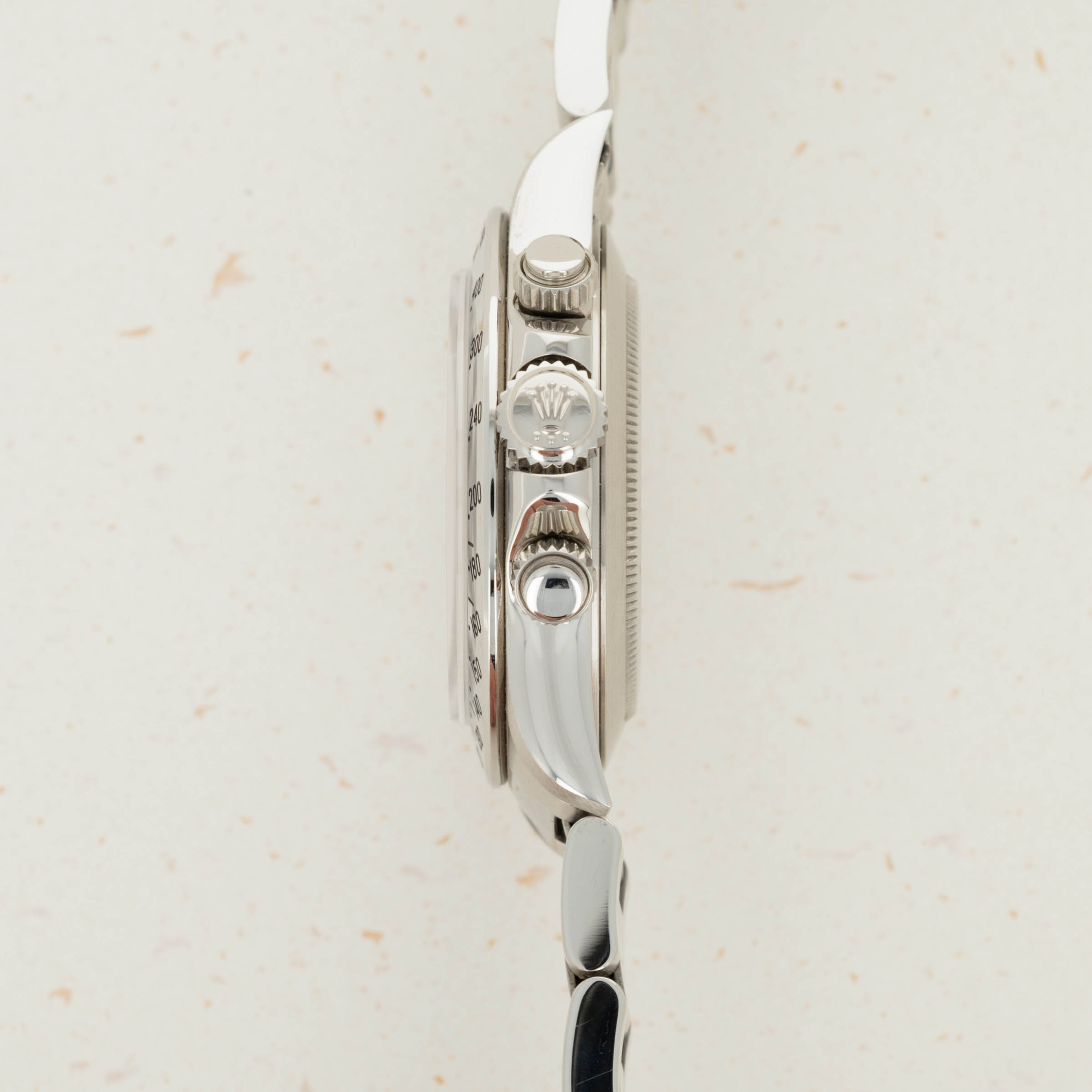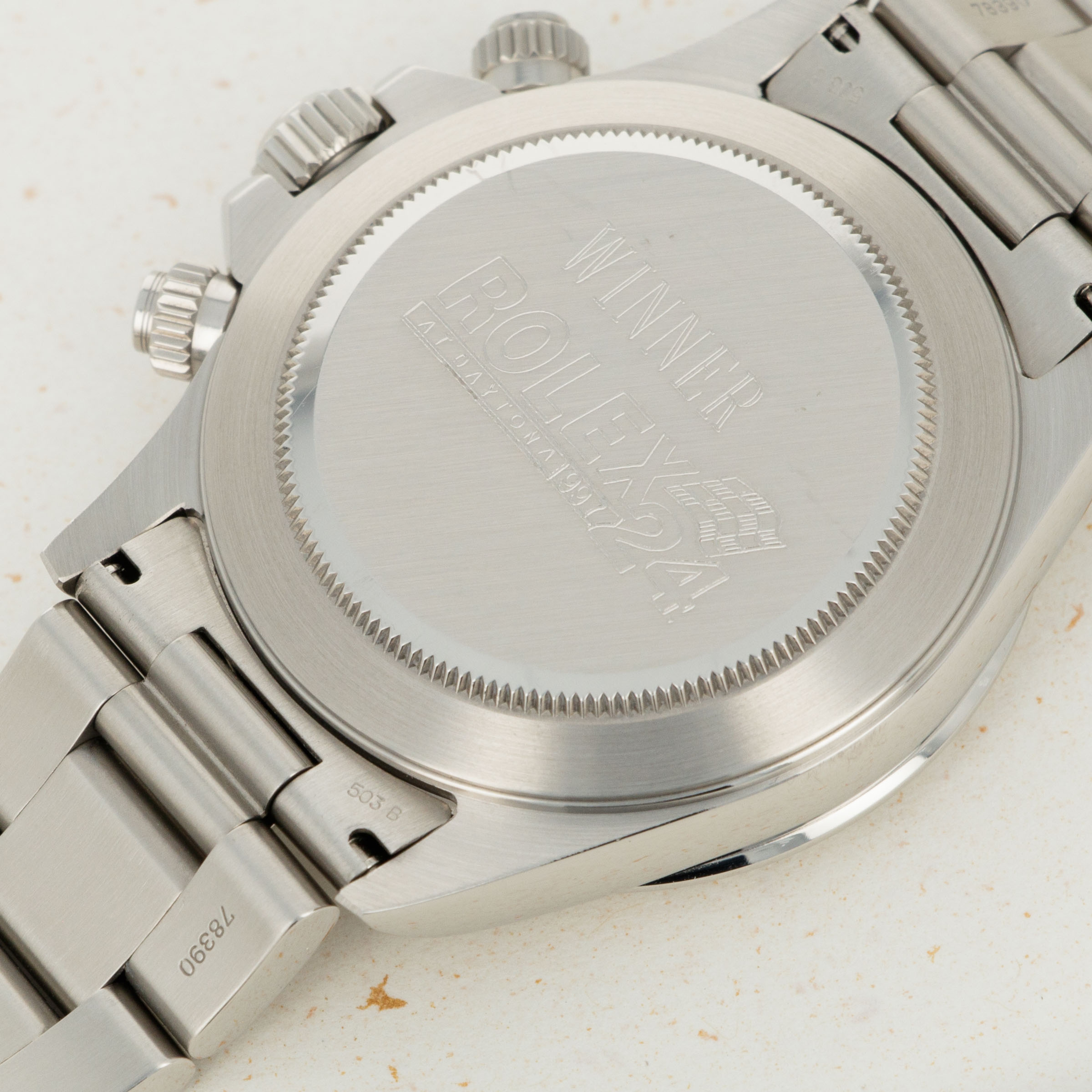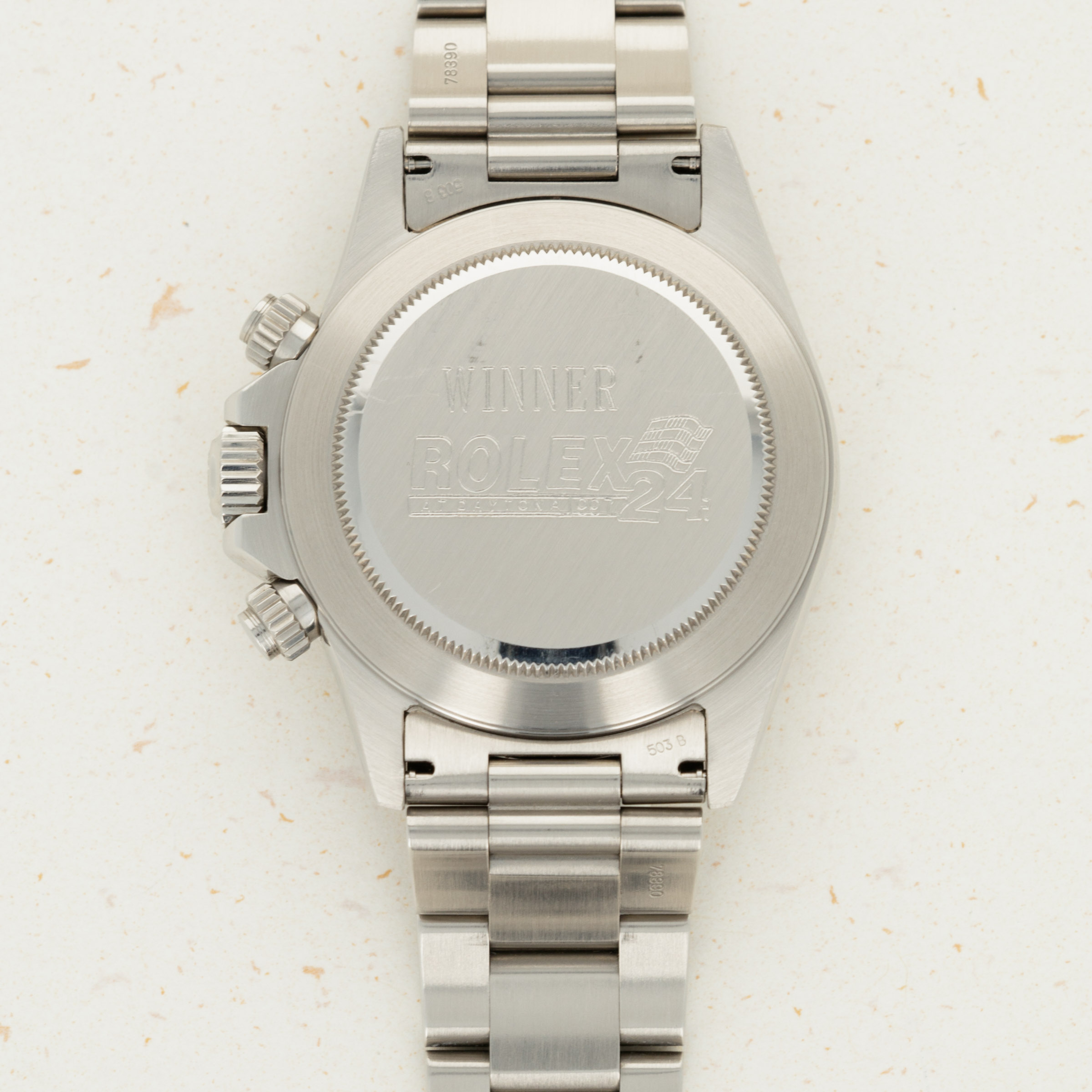 An incredibly important Daytona featuring a tangible link to the very racetrack that the Daytona is named after, the 24 Hours at Daytona winner's watches are some of the most highly-coveted Rolex timepieces on the planet. Drivers have often commented that the reason they participate in the 24 Hours Daytona race is to "Win the damned watch." Here is your opportunity to get the trophy without entering the race! While any "Winner Daytona" is a prize in its own right, most examples that come up for sale are either from class winners, or team members. It is very rare to be able to acquire one that was from an overall winner, such as this example from John Schneider.