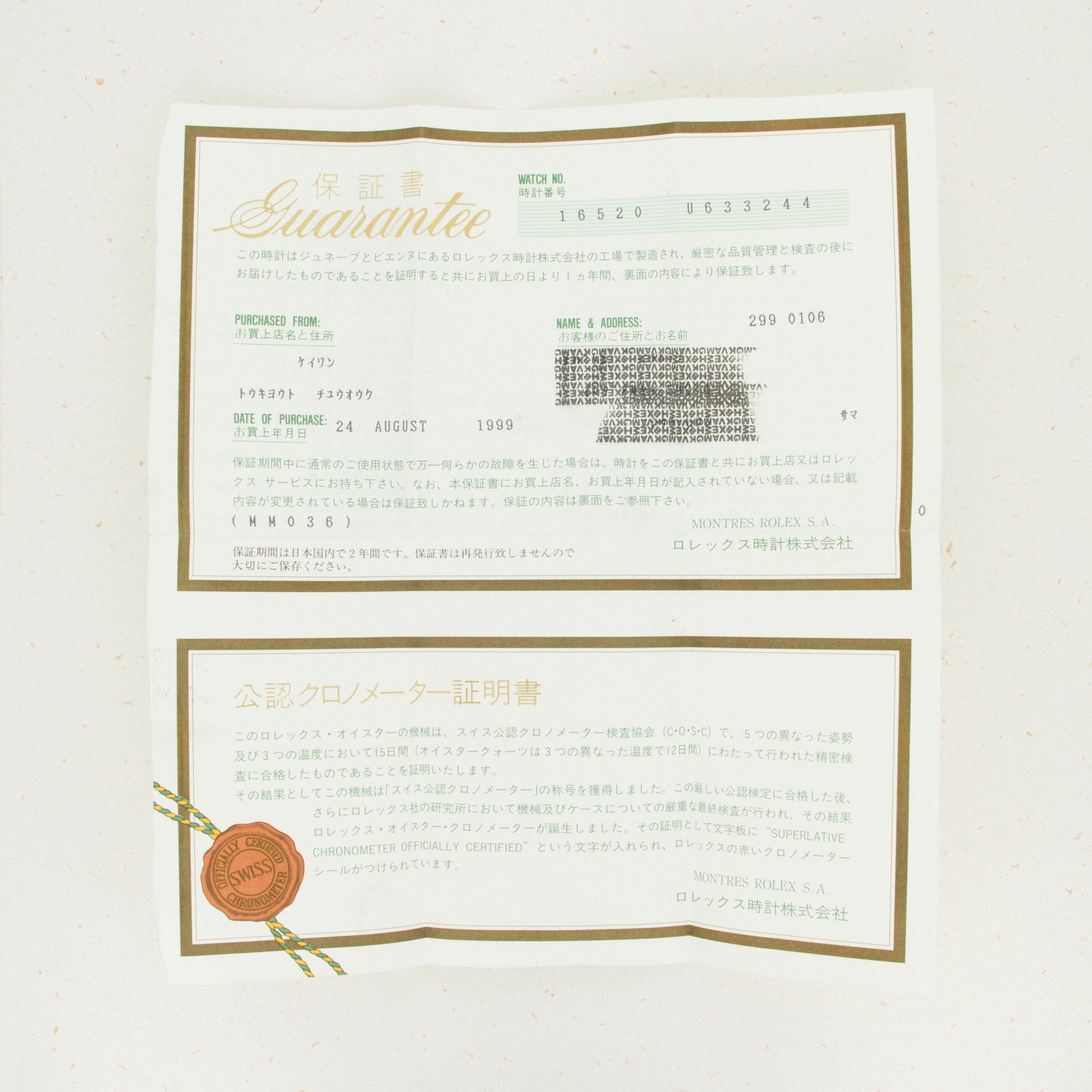 Watch is in overall excellent condition. The case and surface of the watch show light wear, comesurate with use. The enameling of the bezel is intact and there are no significant dings or scratches. Dial is flawless. The bracelet has 13 links total, including one extra on the side. There is little stretch, as well as typical surface wear. Watch comes with orginal Japanese guarantee papers.