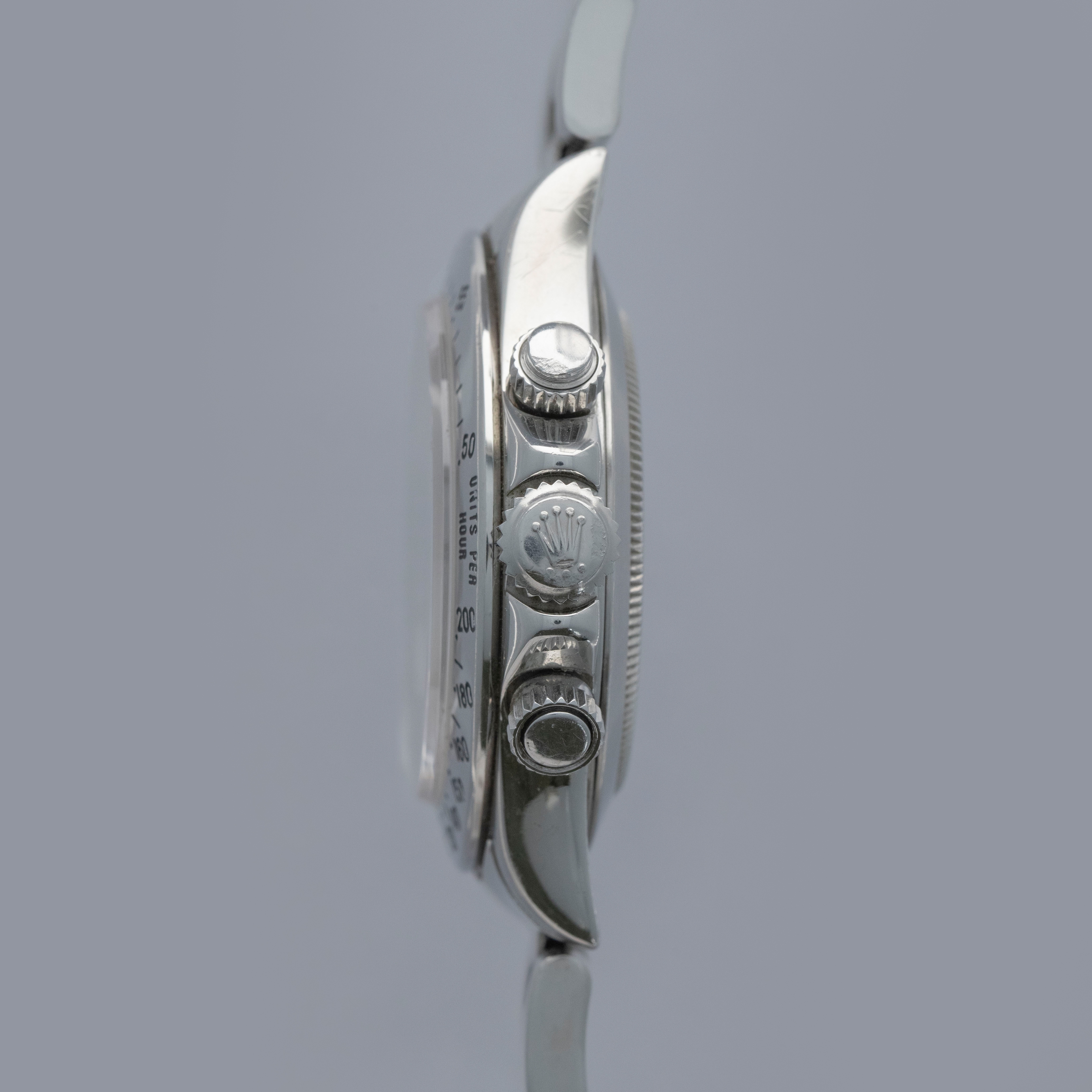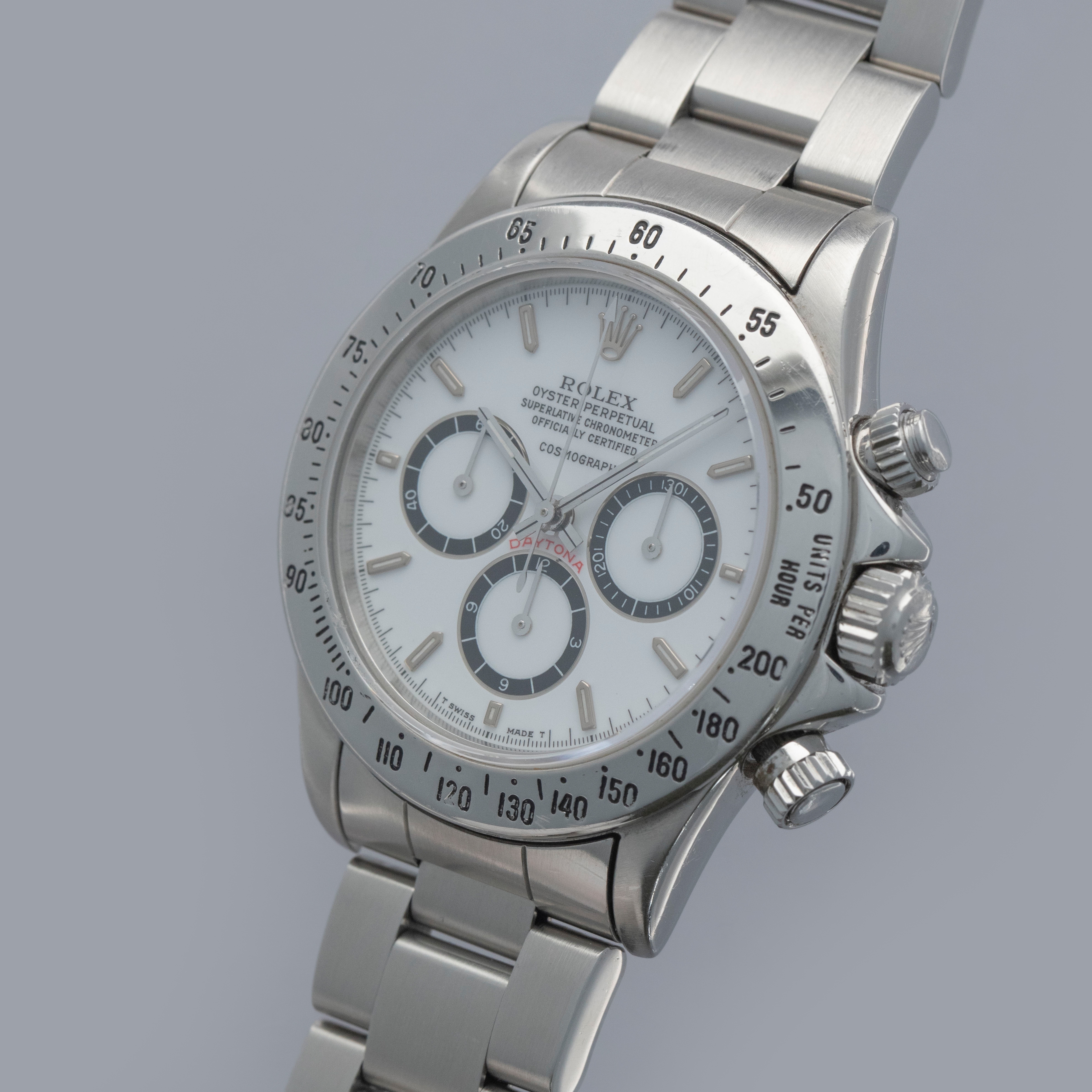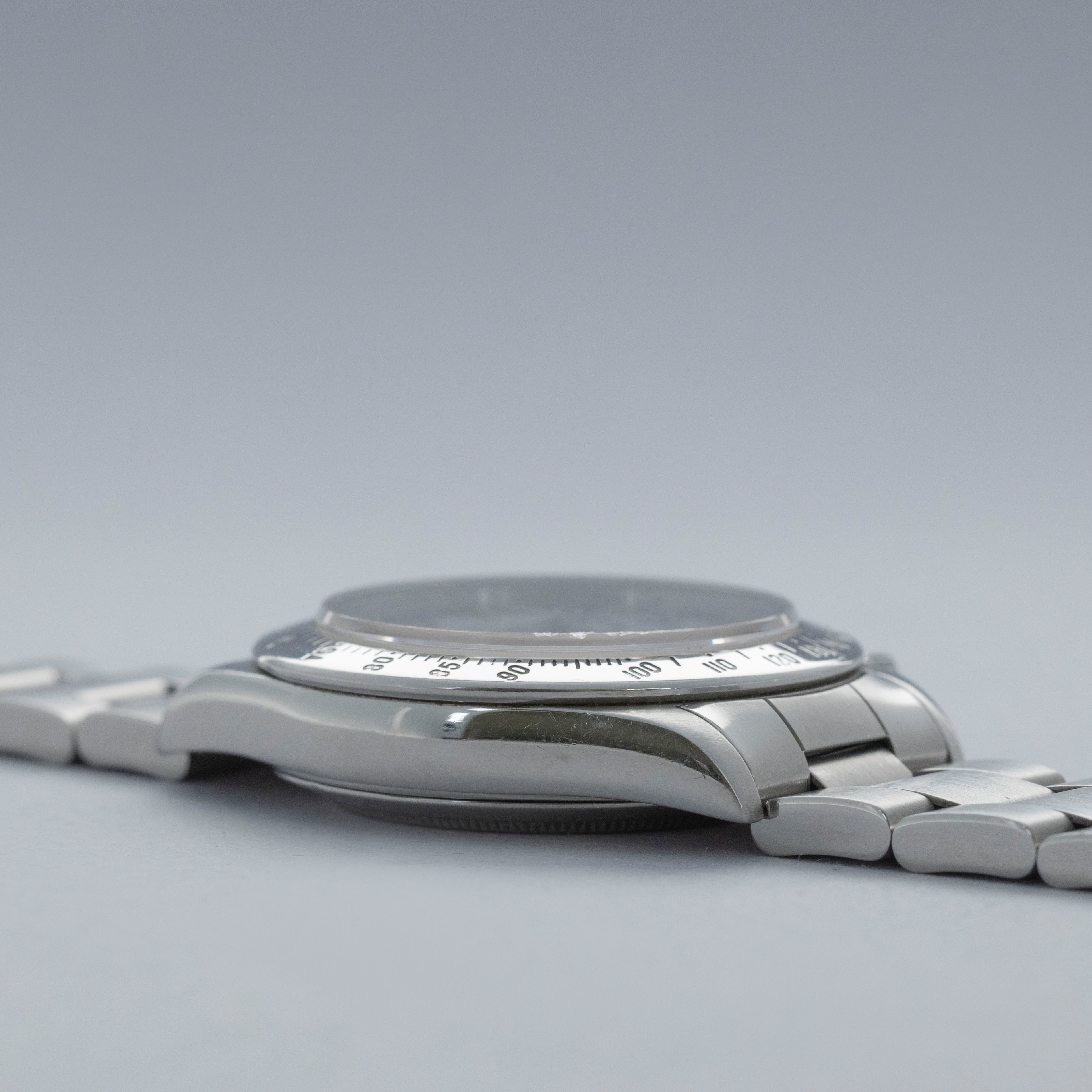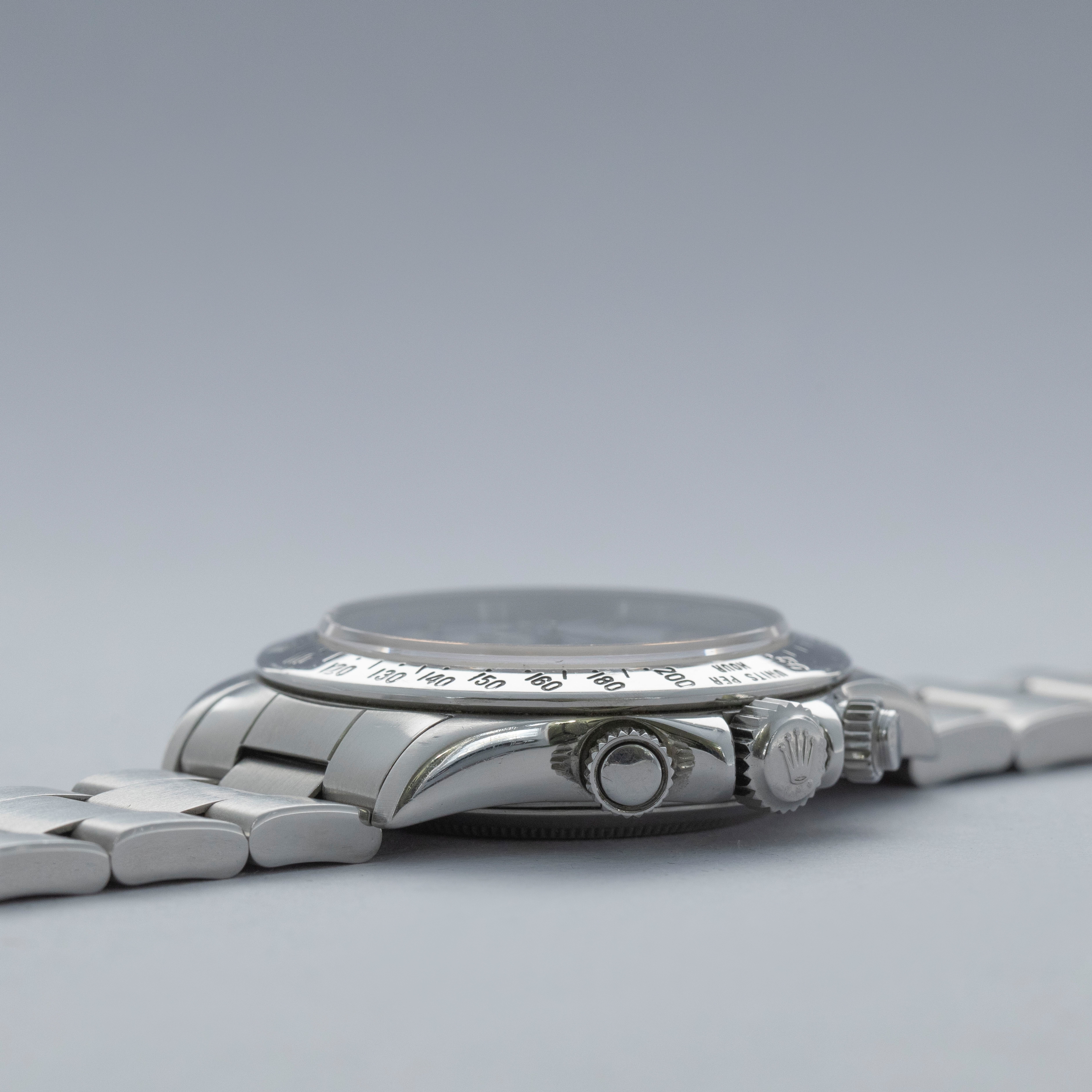 Watch is in overall excellent condition. The steel case shows surface scratches and some small nicks, whilst the case back has light surface marks. The “200” unit bezel shows signs of polishing, with some loss of black enamel to parts of the tachymeter scale. There is some surface damage visible to the upper pusher. The Mk1 so-called floating "porcelain" dial remains near mint and the hands have some light scratches. It is fitted with the original 78360 all-brushed Oyster bracelet showing light surface marks and light play between the links. The bracelet is fitted with 12 links, 2 of which are removable, and fits approximately a 7½” wrist.