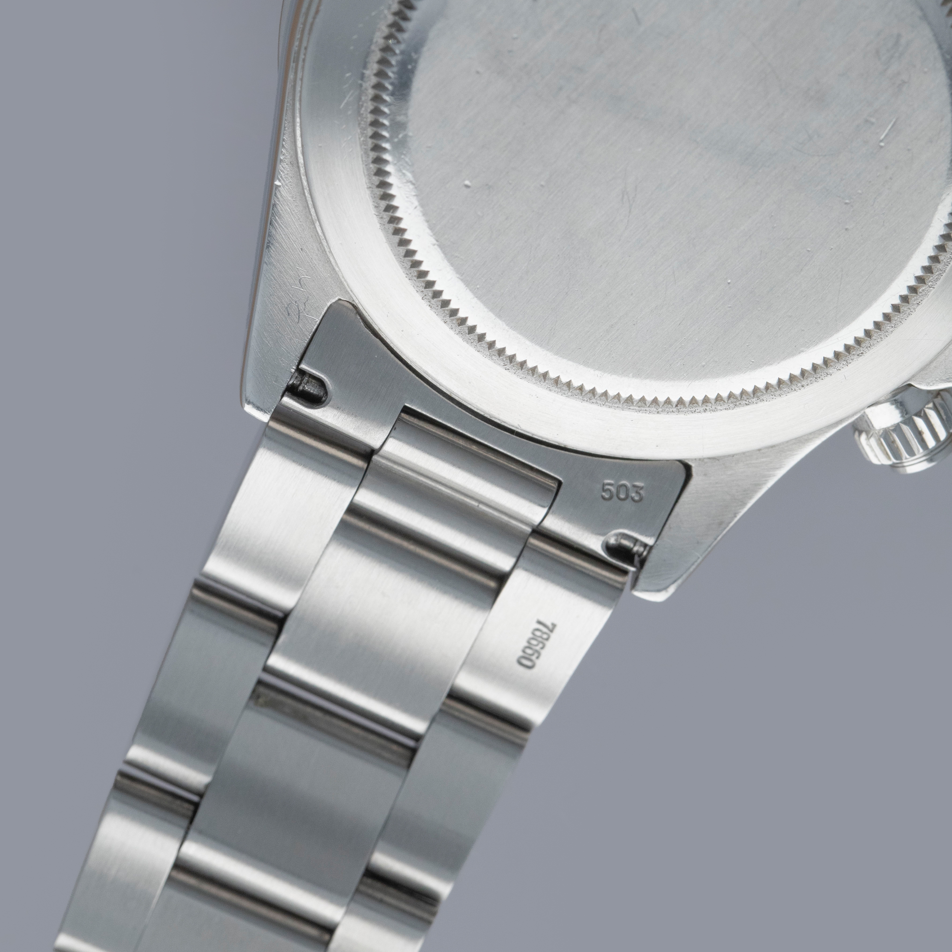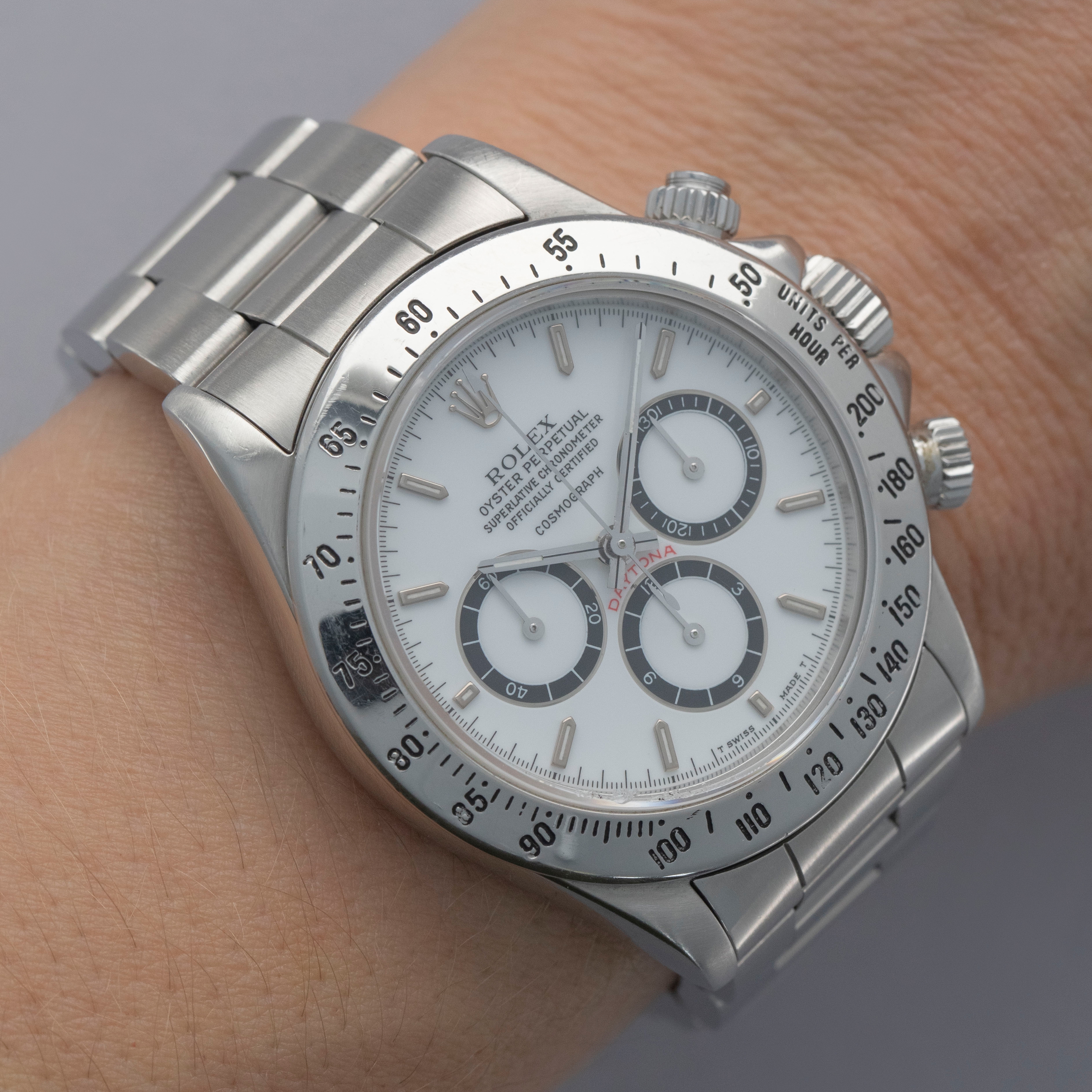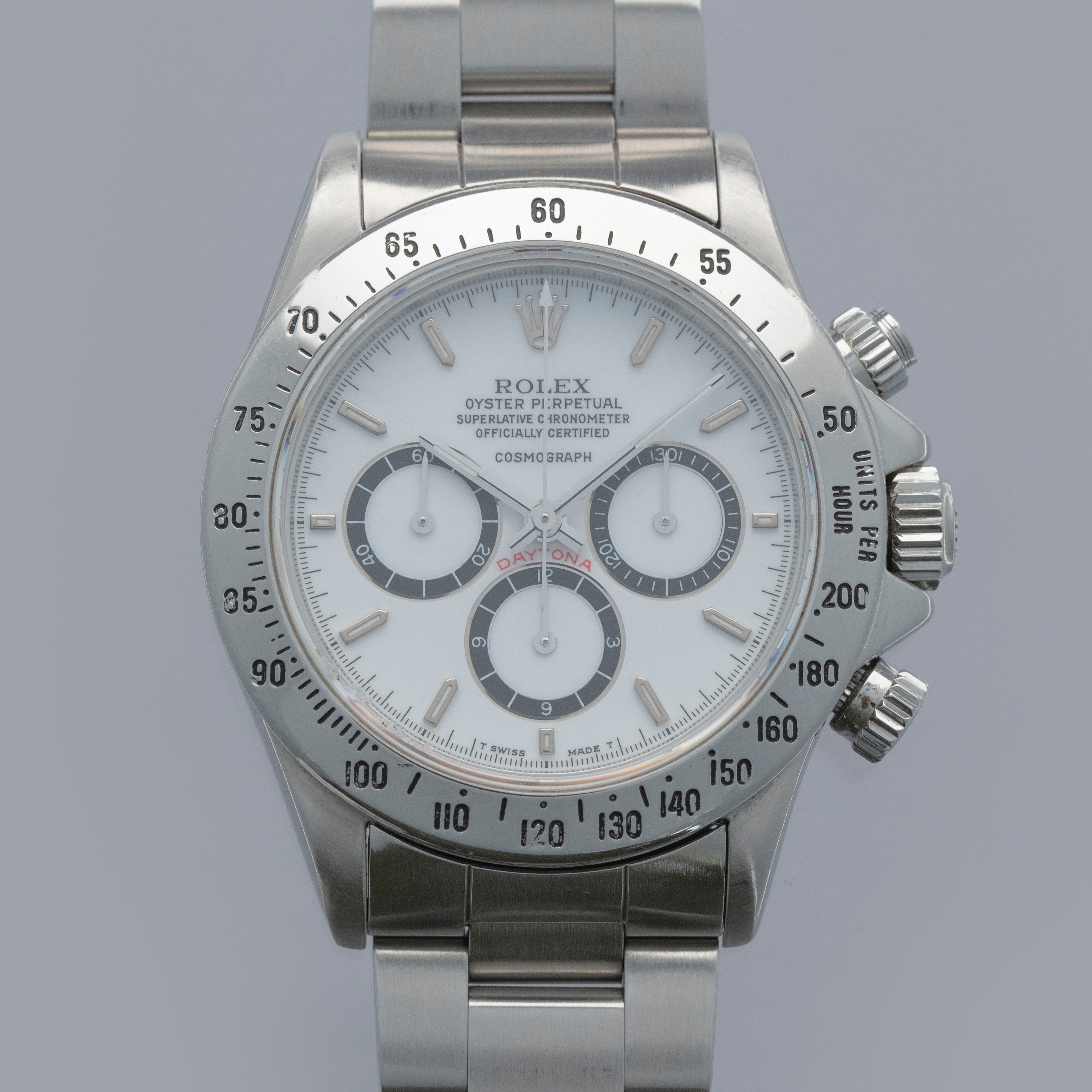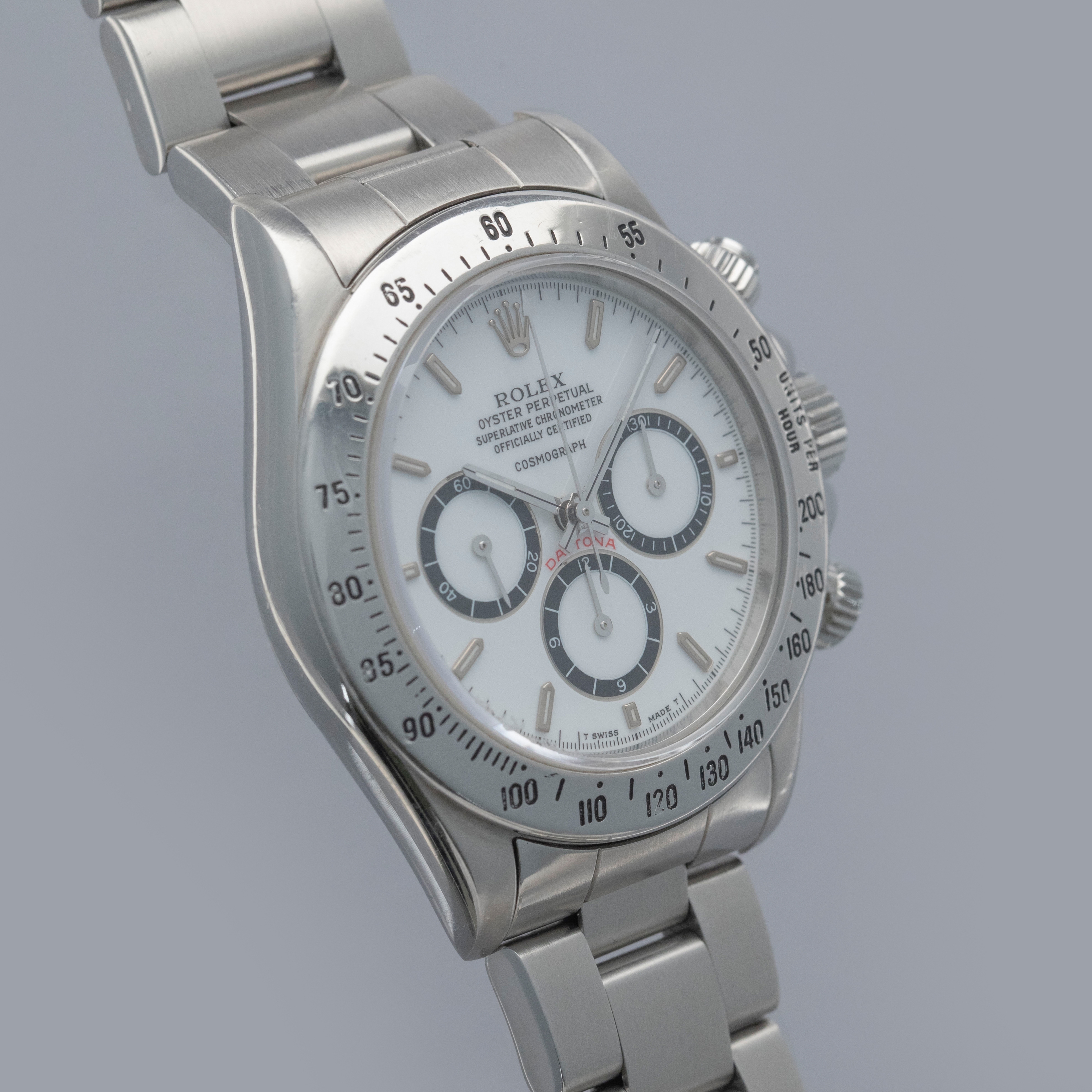 Watch is in overall excellent condition. The steel case shows surface scratches and some small nicks, whilst the case back has light surface marks. The “200” unit bezel shows signs of polishing, with some loss of black enamel to parts of the tachymeter scale. There is some surface damage visible to the upper pusher. The Mk1 so-called floating "porcelain" dial remains near mint and the hands have some light scratches. It is fitted with the original 78360 all-brushed Oyster bracelet showing light surface marks and light play between the links. The bracelet is fitted with 12 links, 2 of which are removable, and fits approximately a 7½” wrist.