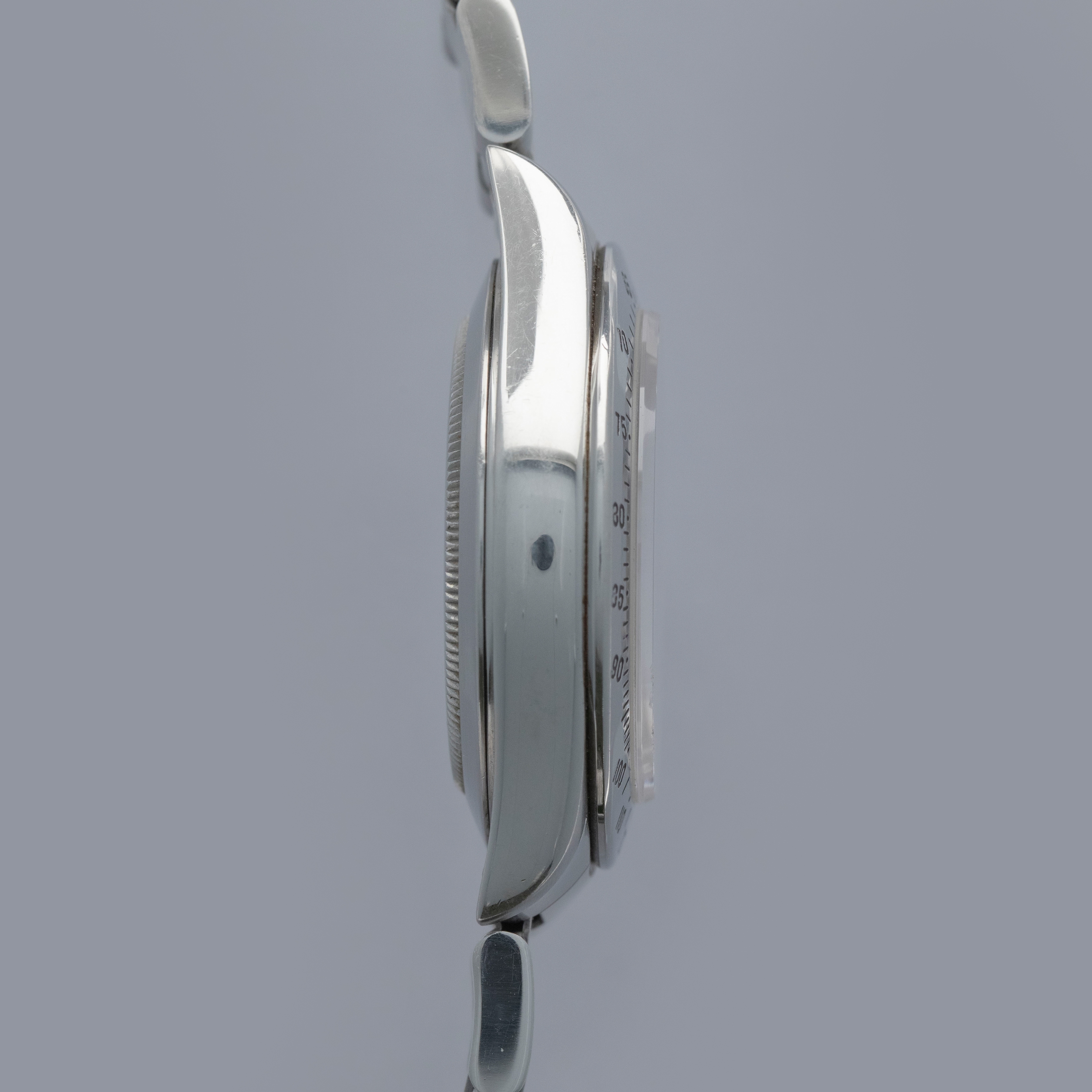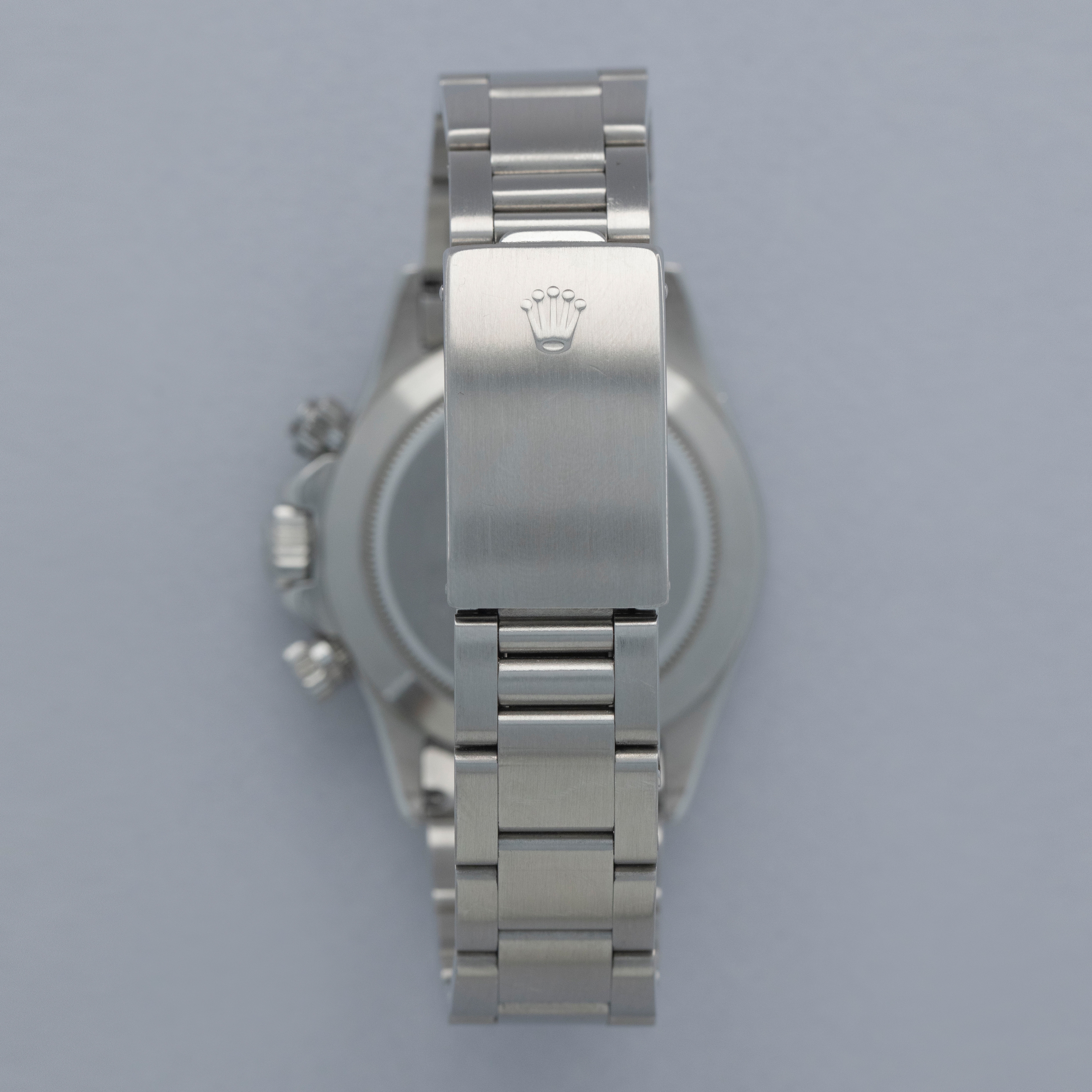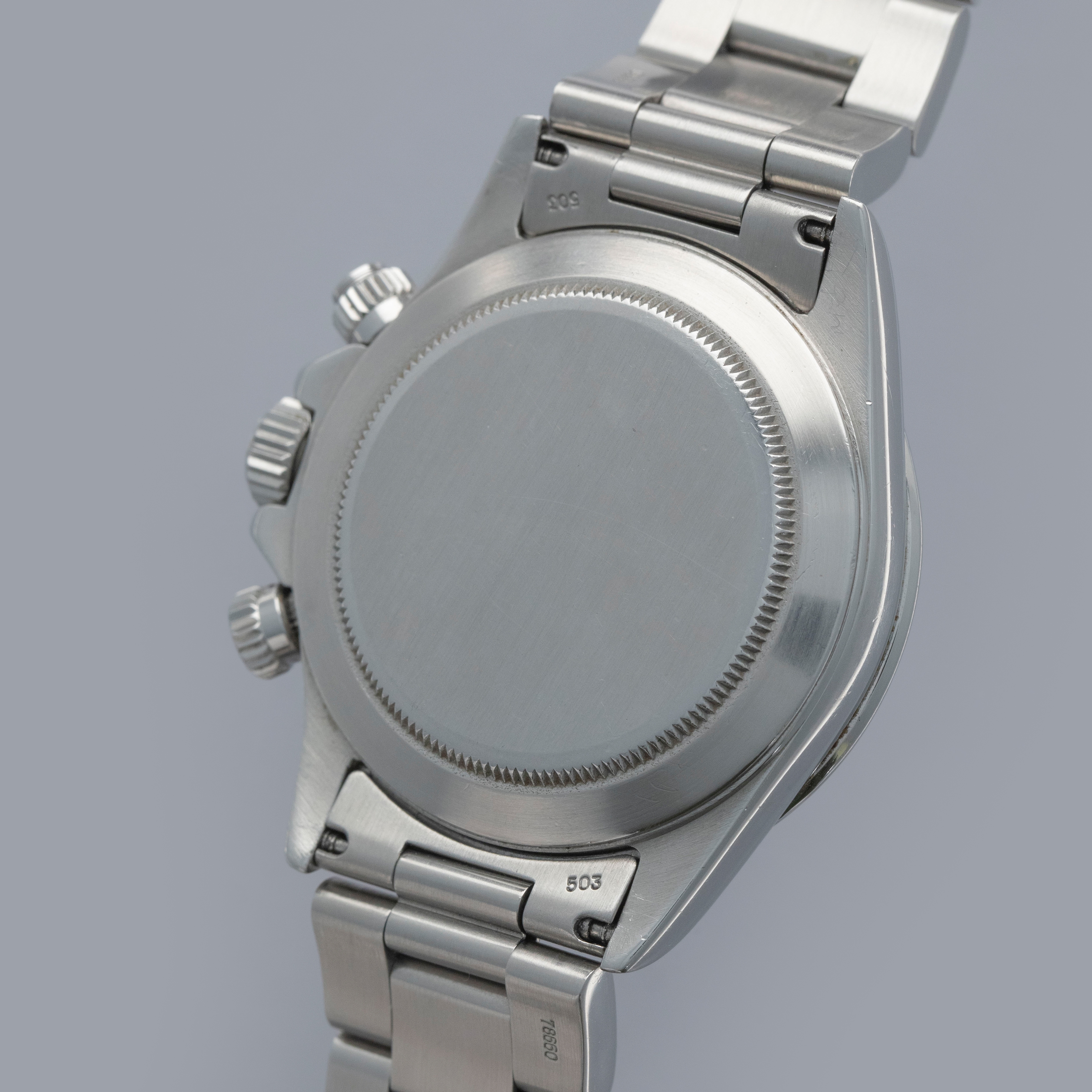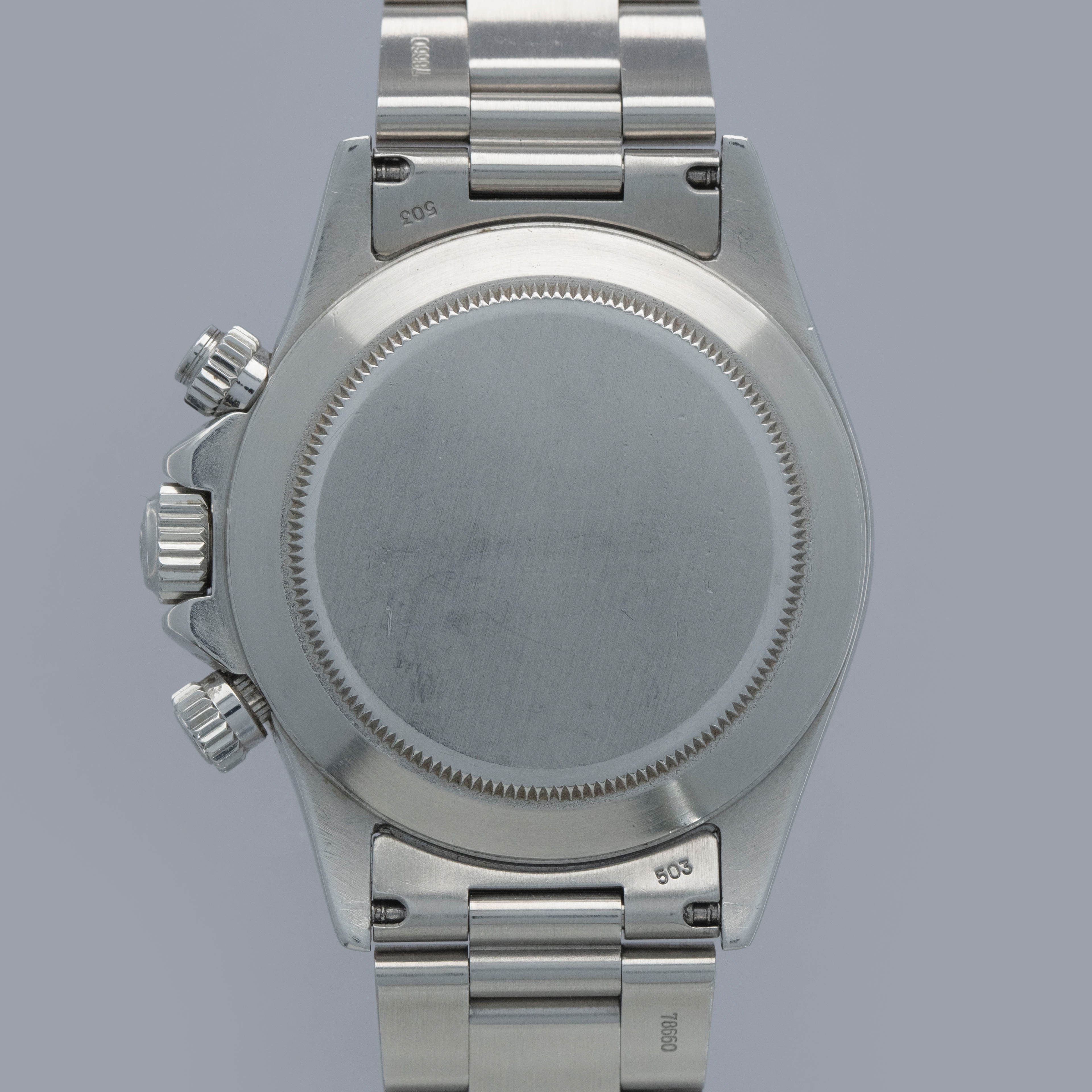 Watch is in overall excellent condition. The steel case shows surface scratches and some small nicks, whilst the case back has light surface marks. The “200” unit bezel shows signs of polishing, with some loss of black enamel to parts of the tachymeter scale. There is some surface damage visible to the upper pusher. The Mk1 so-called floating "porcelain" dial remains near mint and the hands have some light scratches. It is fitted with the original 78360 all-brushed Oyster bracelet showing light surface marks and light play between the links. The bracelet is fitted with 12 links, 2 of which are removable, and fits approximately a 7½” wrist.