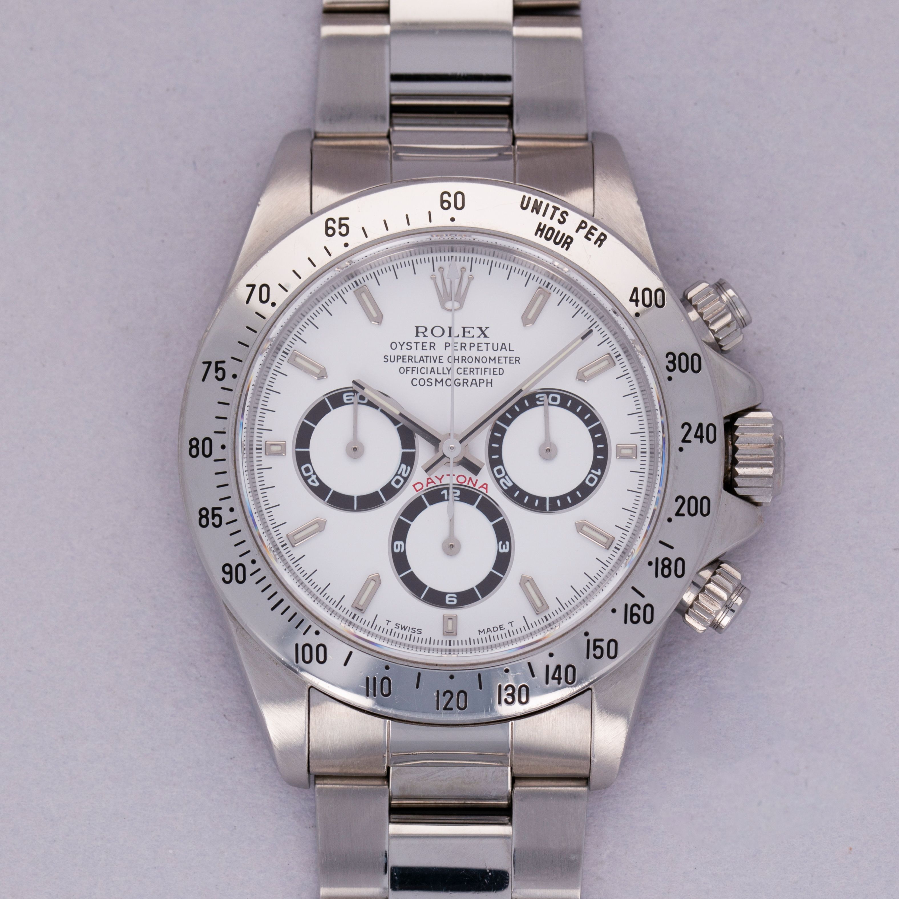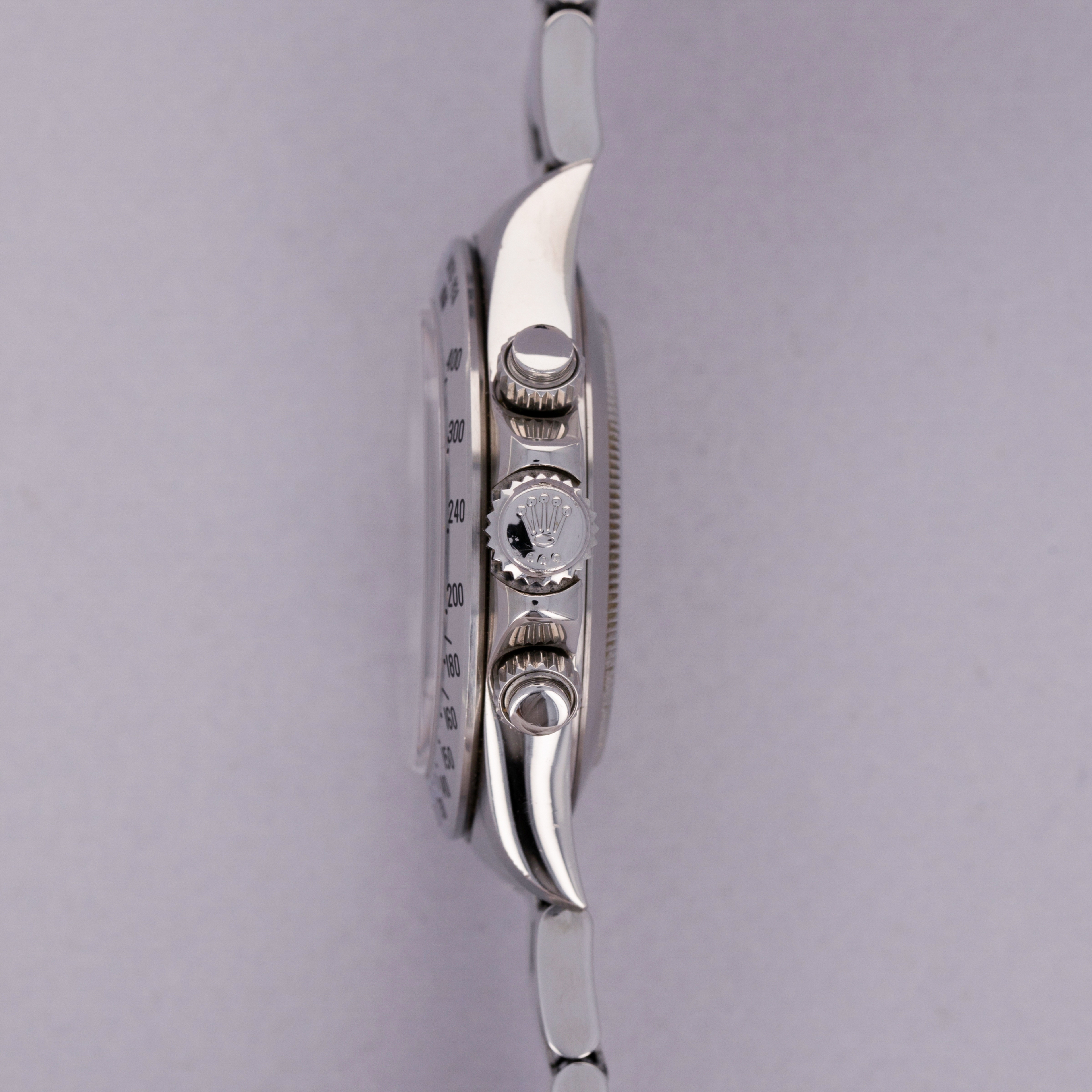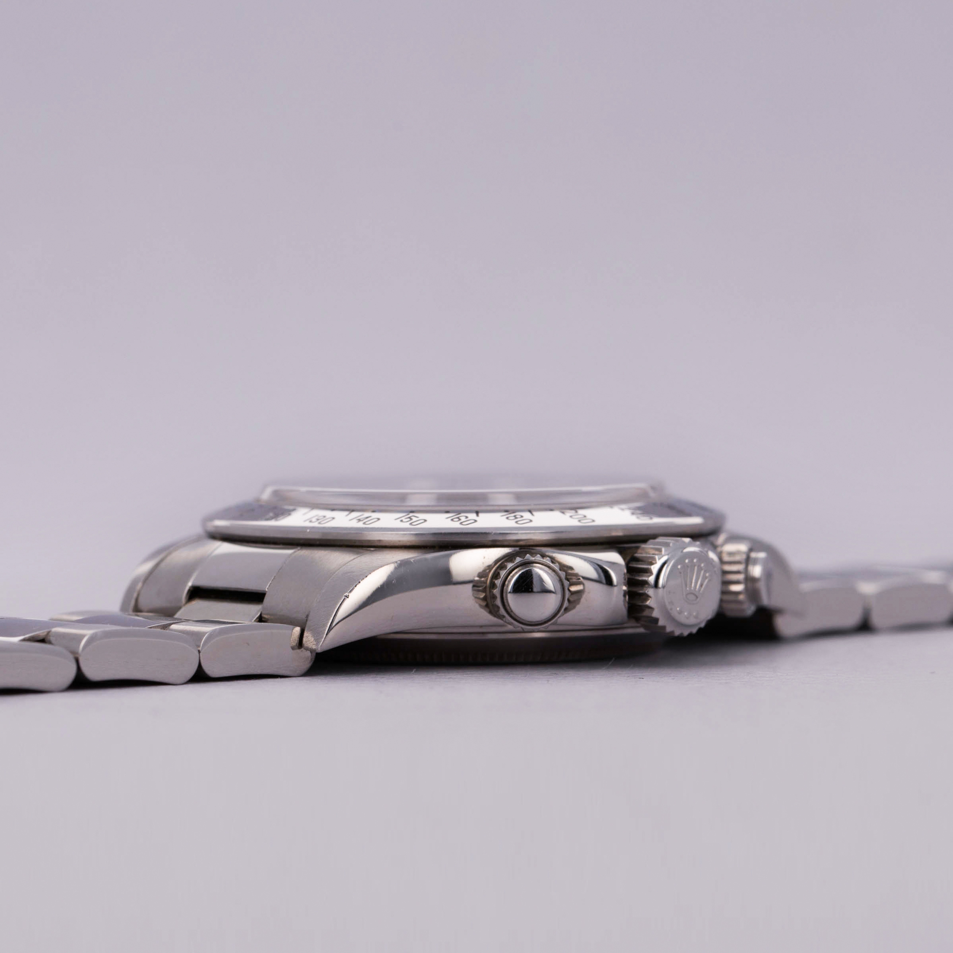 Offered with the Daytona's most sought-after dial, this example's pristine white dial is in truly stunning condition with perfect luminescent material, graphics and a pristine tachymeter bezel to match.