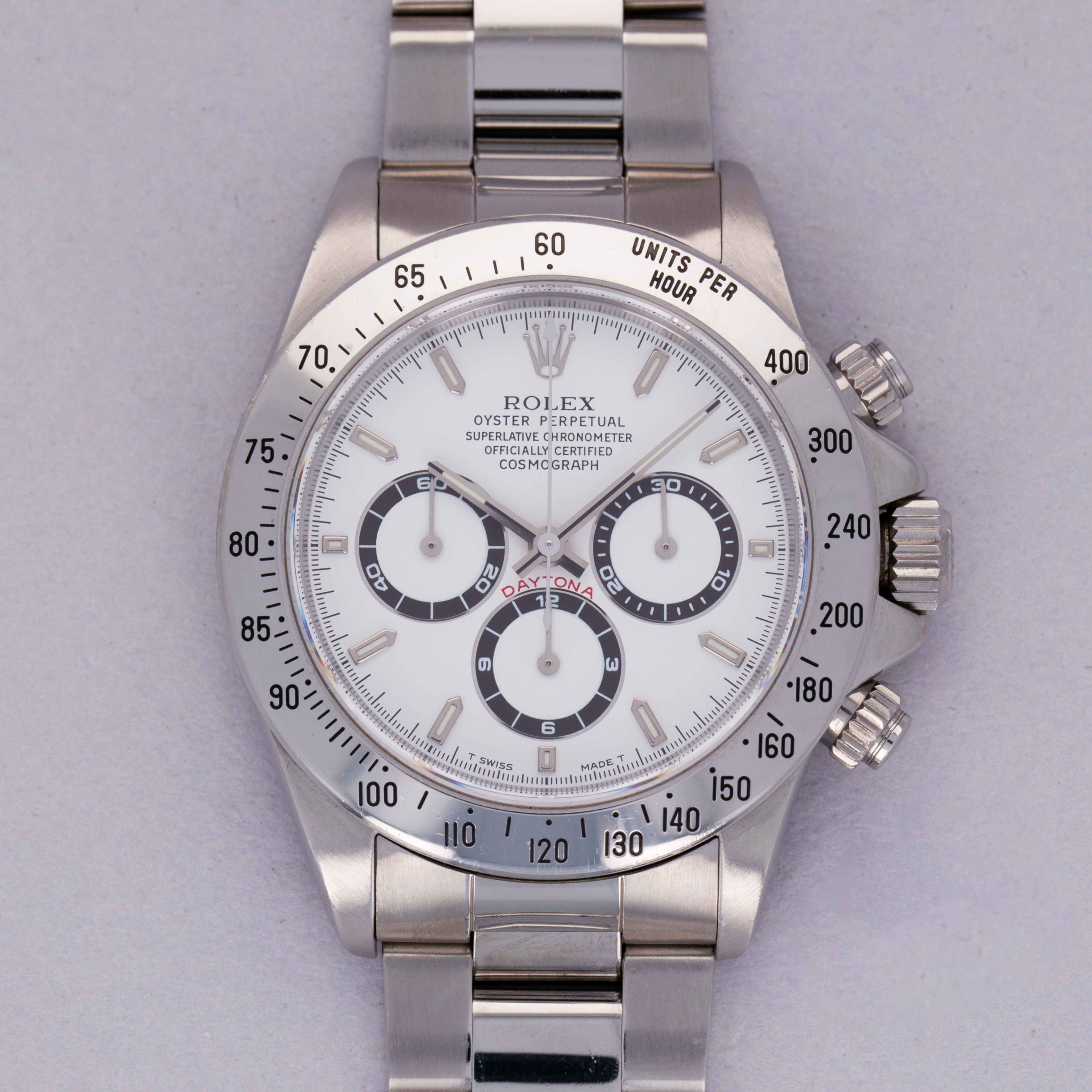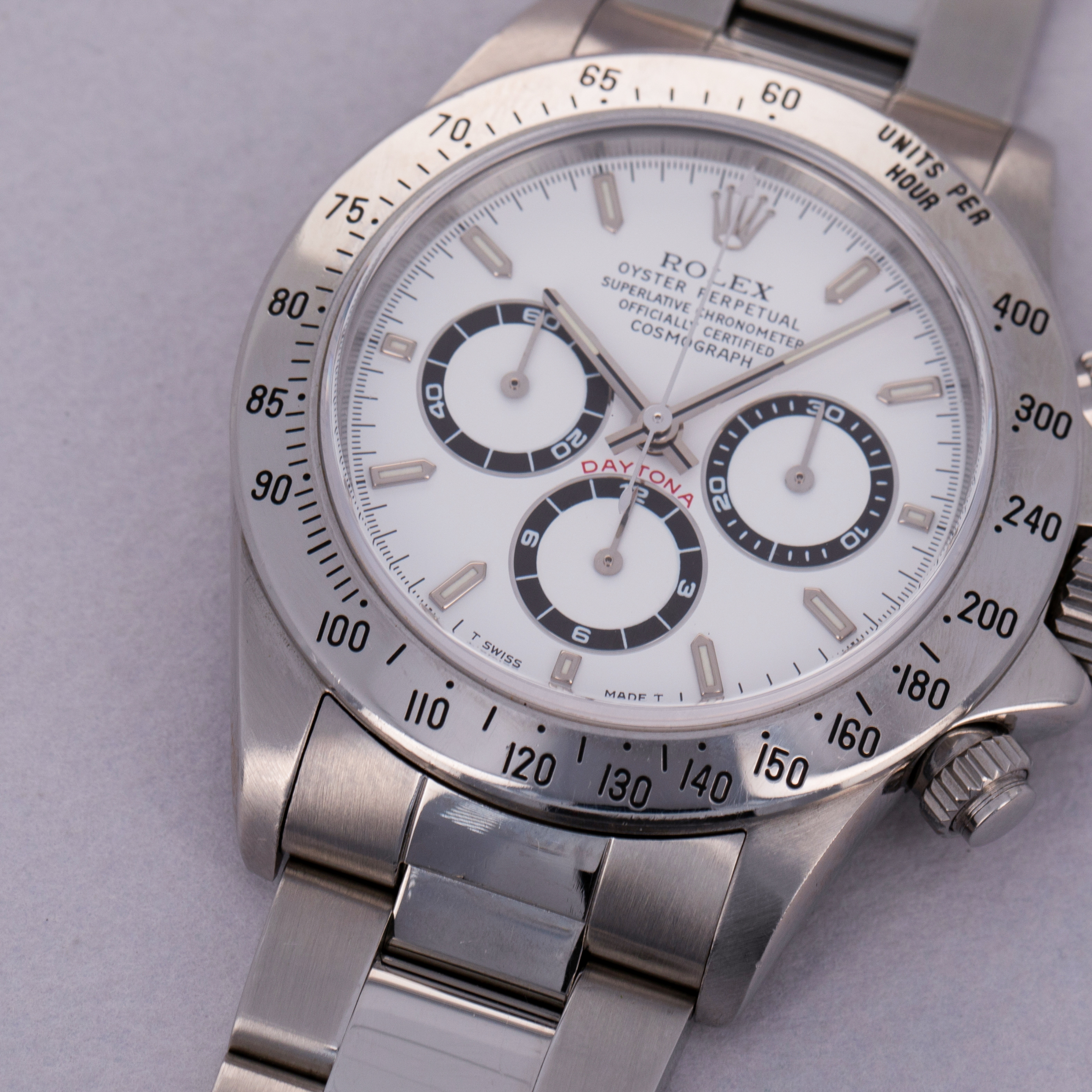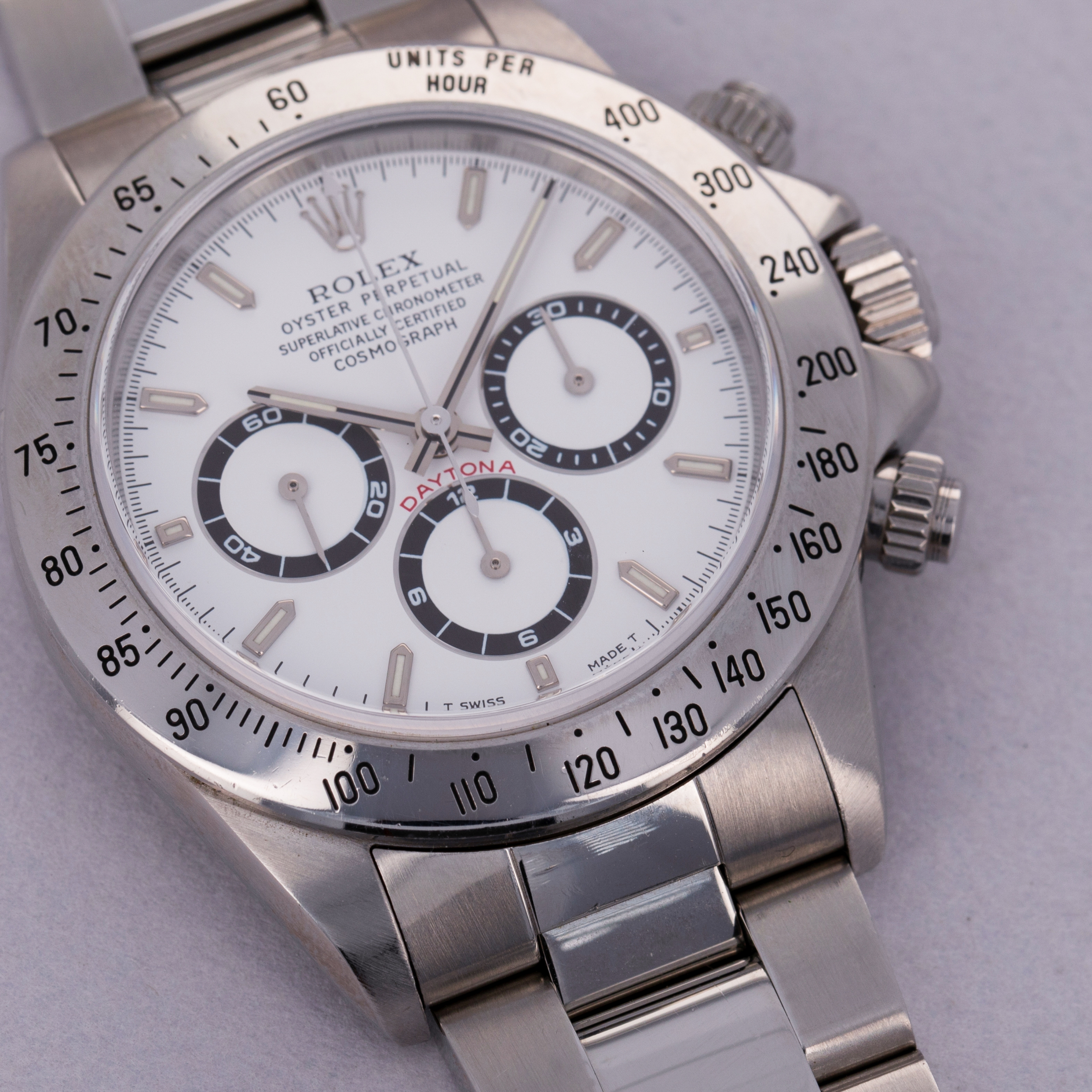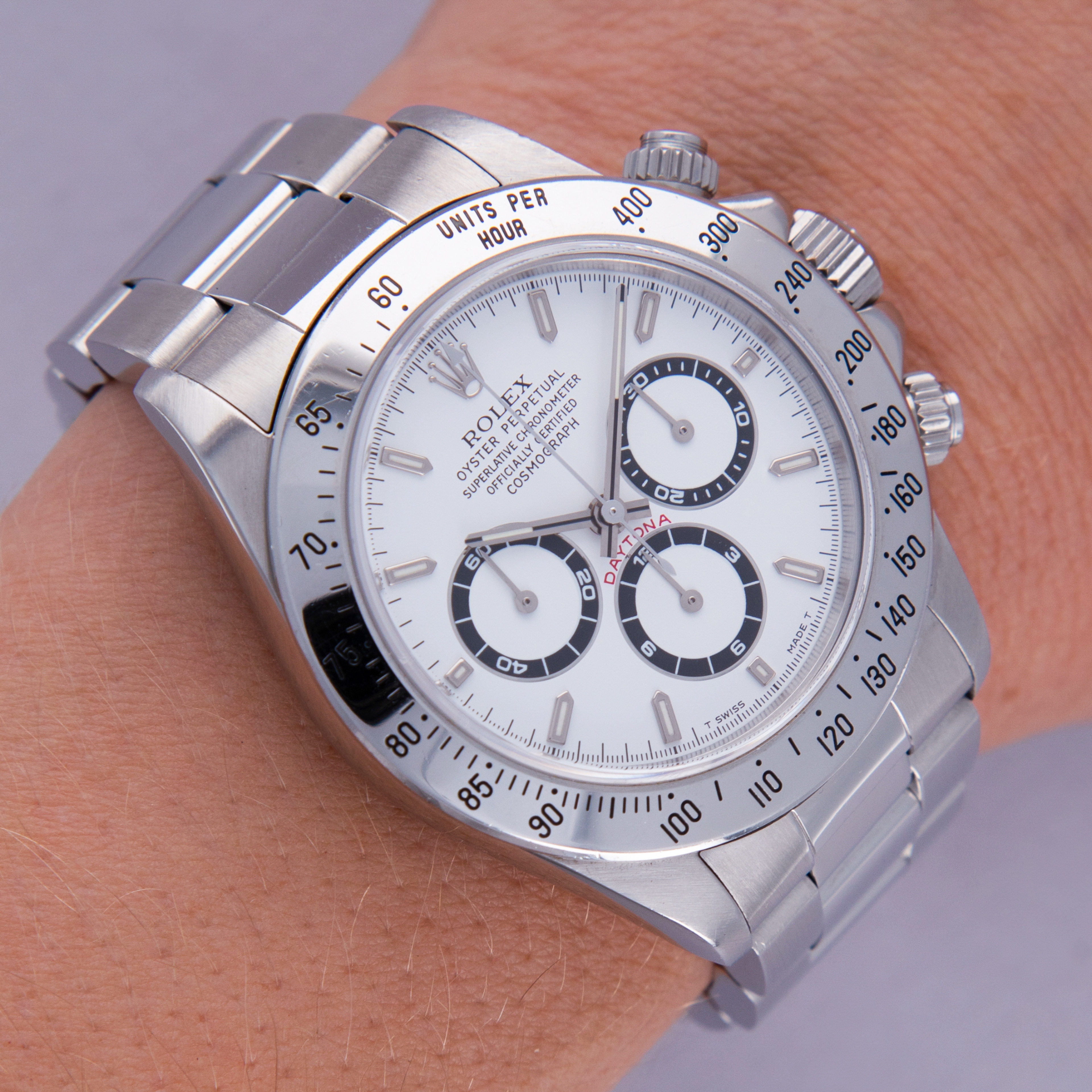 Offered with the Daytona's most sought-after dial, this example's pristine white dial is in truly stunning condition with perfect luminescent material, graphics and a pristine tachymeter bezel to match.