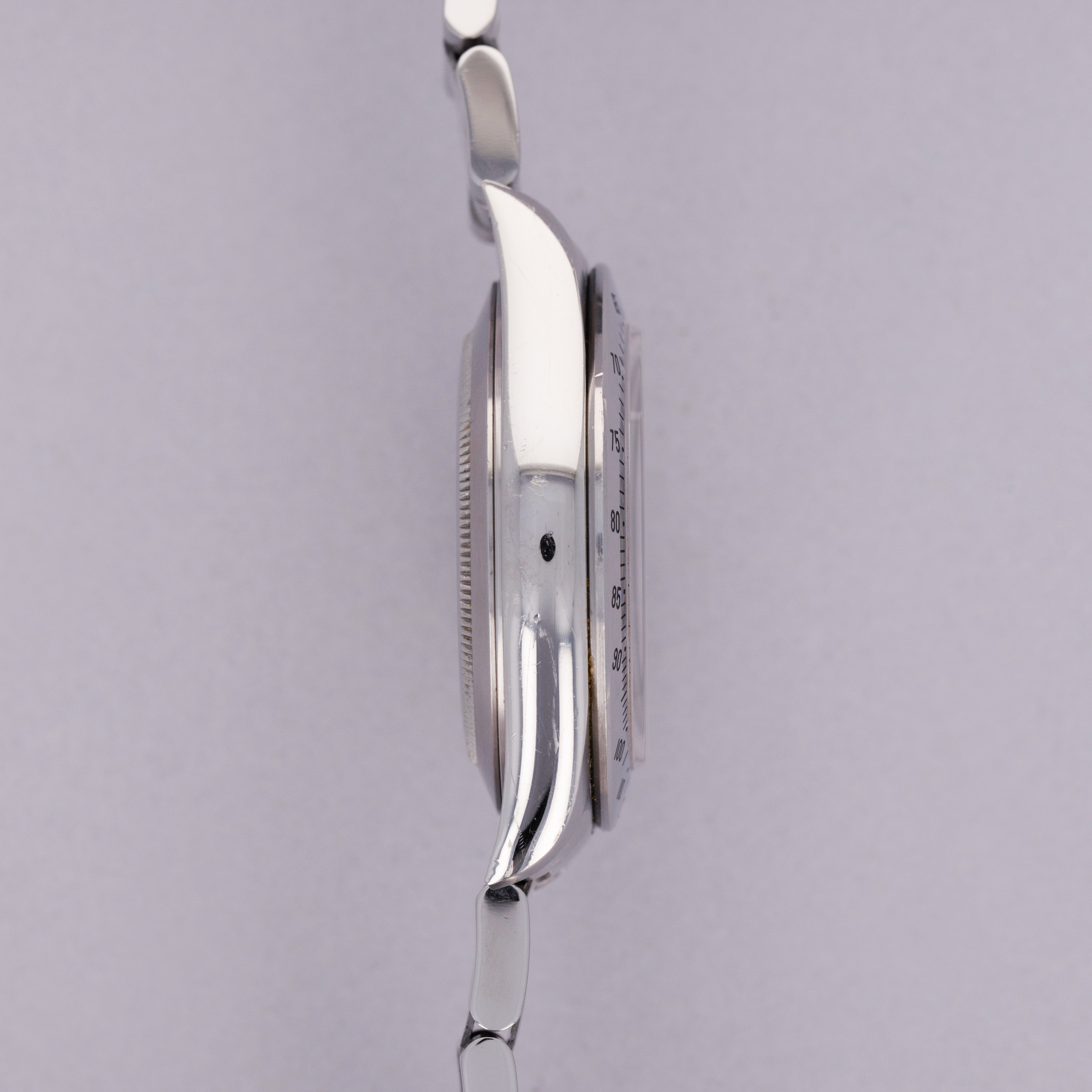 Watch is in excellent overall condition. The case shows previous signs of polishing and light wear evident. Bezel has a few small scratches and retains all of the black enameling in the numbers. The dial is in near-mint condition with little to no signs of wear. The bracelet has 12 links total, and some minor suface marks and light stretch.