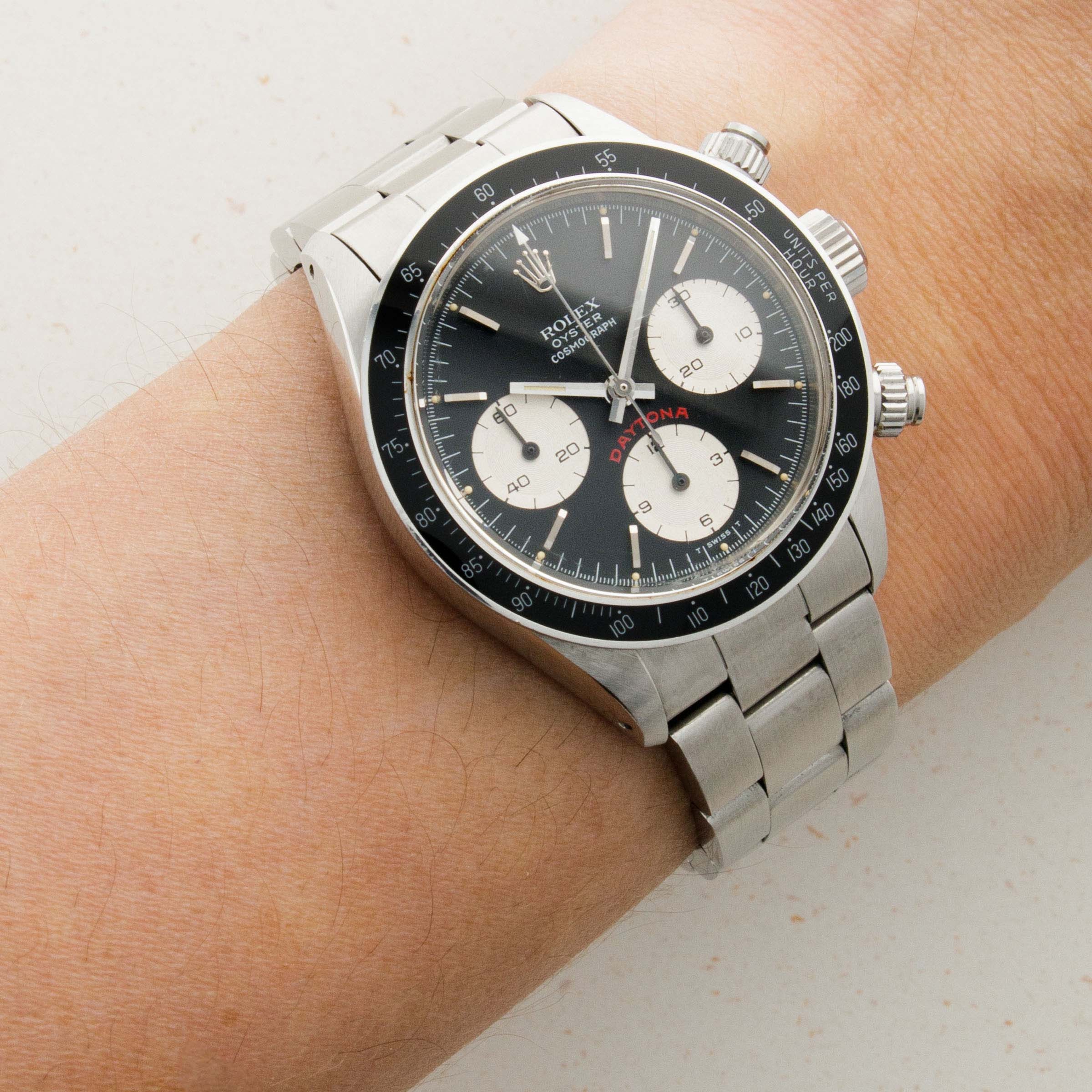 Forming the foundation of its sporty looks, the Daytona ref. 6263 features a black acrylic bezel insert and screw-down chronograph pushers that significantly modernizes its aesthetic. Considering its black bezel, it is not hard to see how Rolex's modern design department was inspired to release the current Cerachrom-clad Daytona that debuted in 2016.