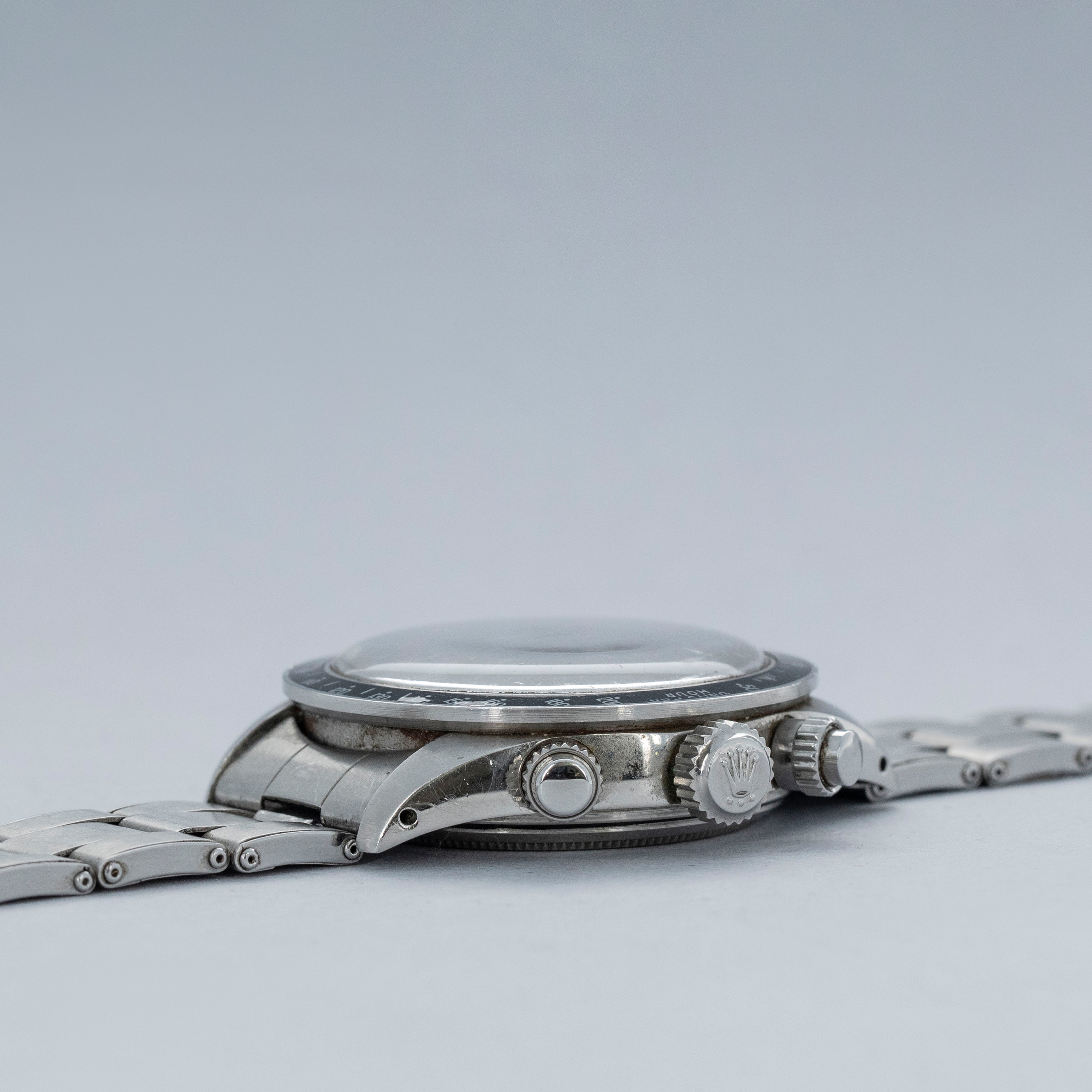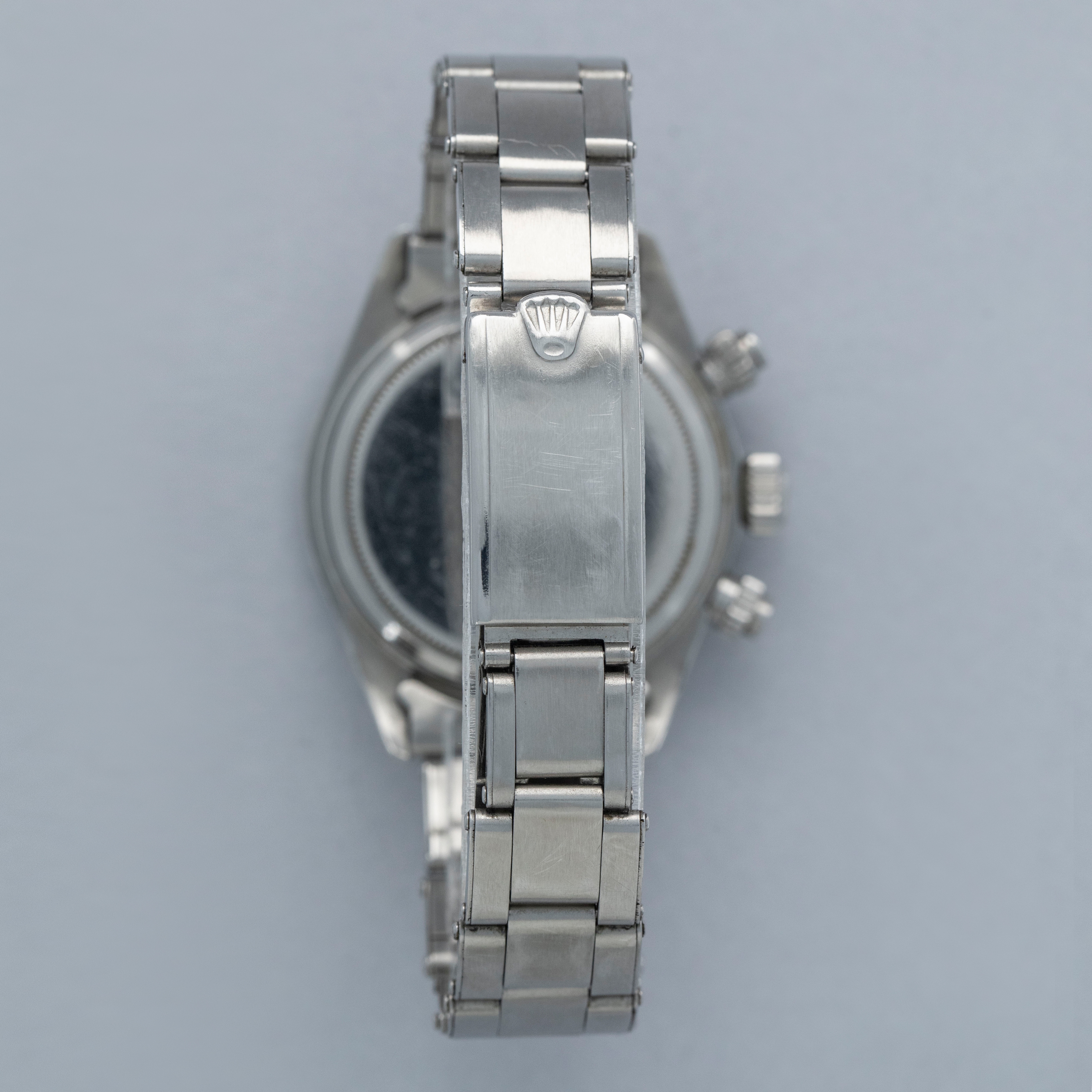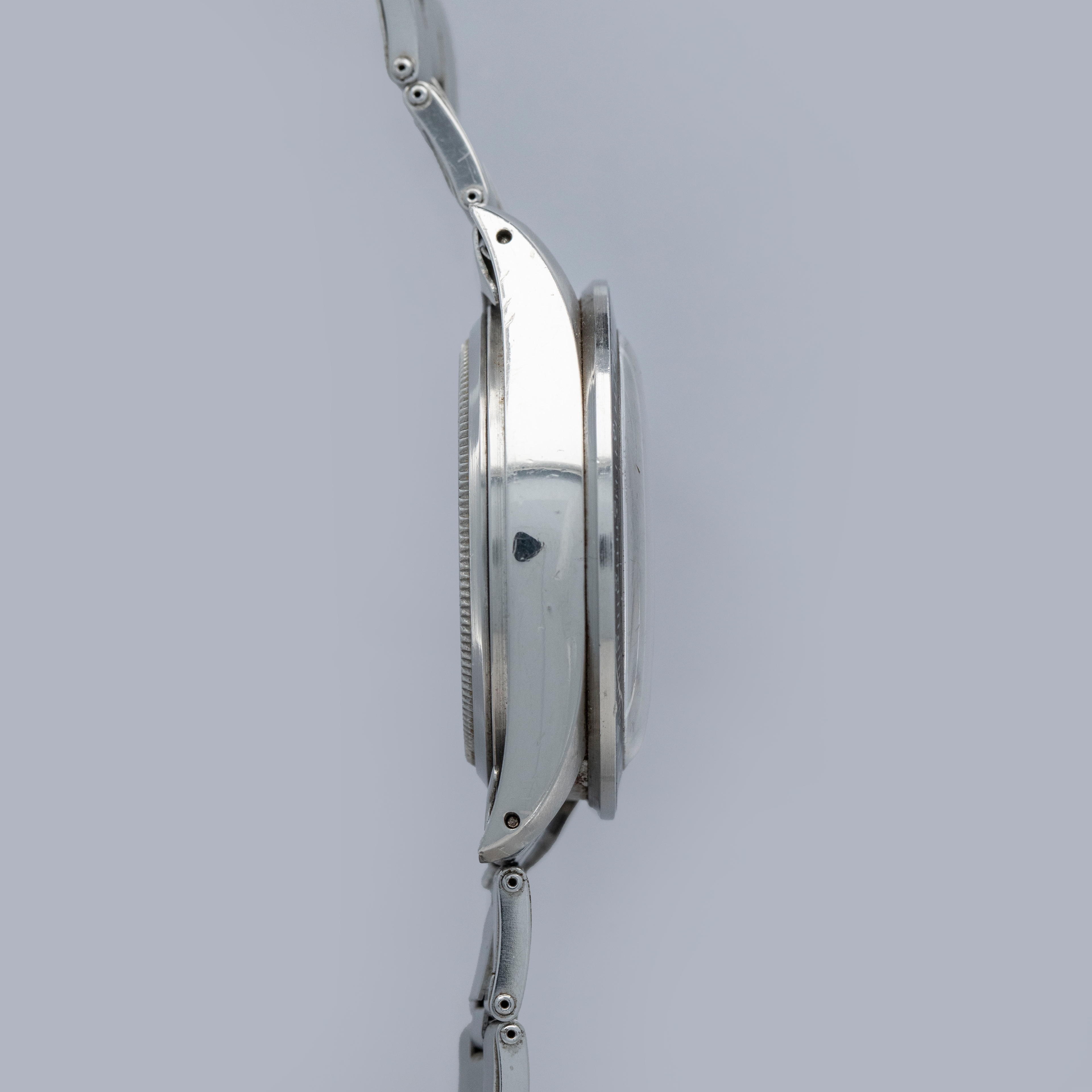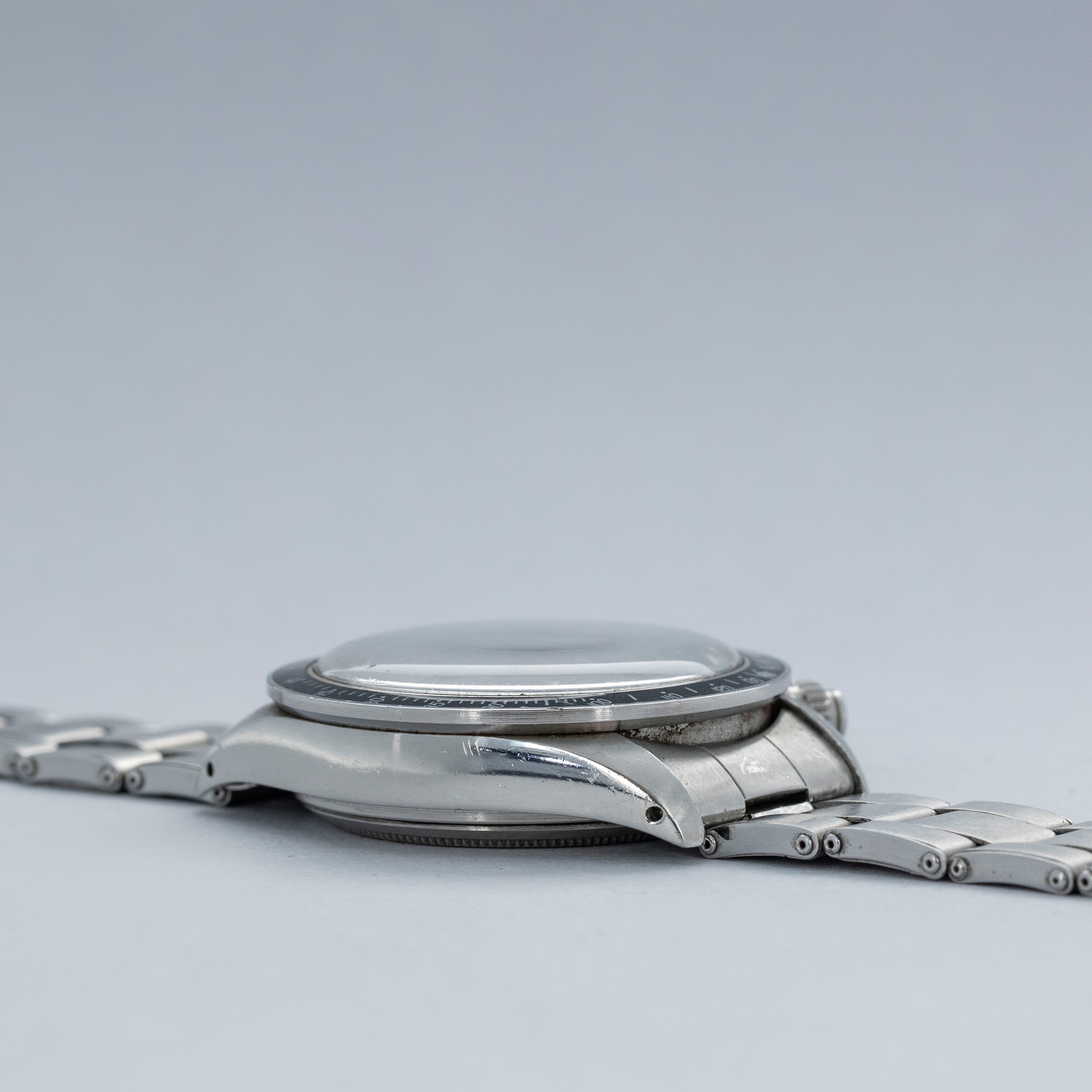 The watch is in overall excellent condition. The steel case is well defined, with some light scratches across the surface, as expected of a watch of this vintage. There are three more noticeable nicks on the back edge of the upper left lug, and the case back has light scratches. The bezel is excellent, with some light marks and minor delamination in a couple of places. The lower (reset) pusher is a later service replacement. The black Sigma dial is near mint, with excellent lume plots that are fully intact. The hands are clean, with some discoloration in the lume. The watch is fitted with a steel rivet link Oyster bracelet with light surface marks and light play between the links. The bracelet currently fits a 7 1/2” wrist, and is fitted with 12 links.